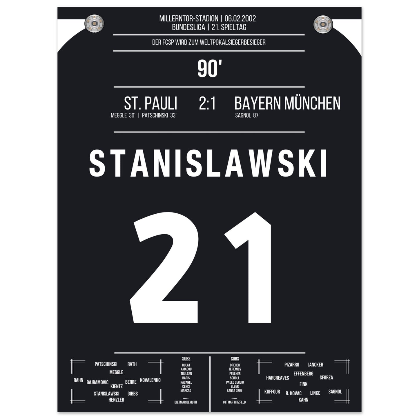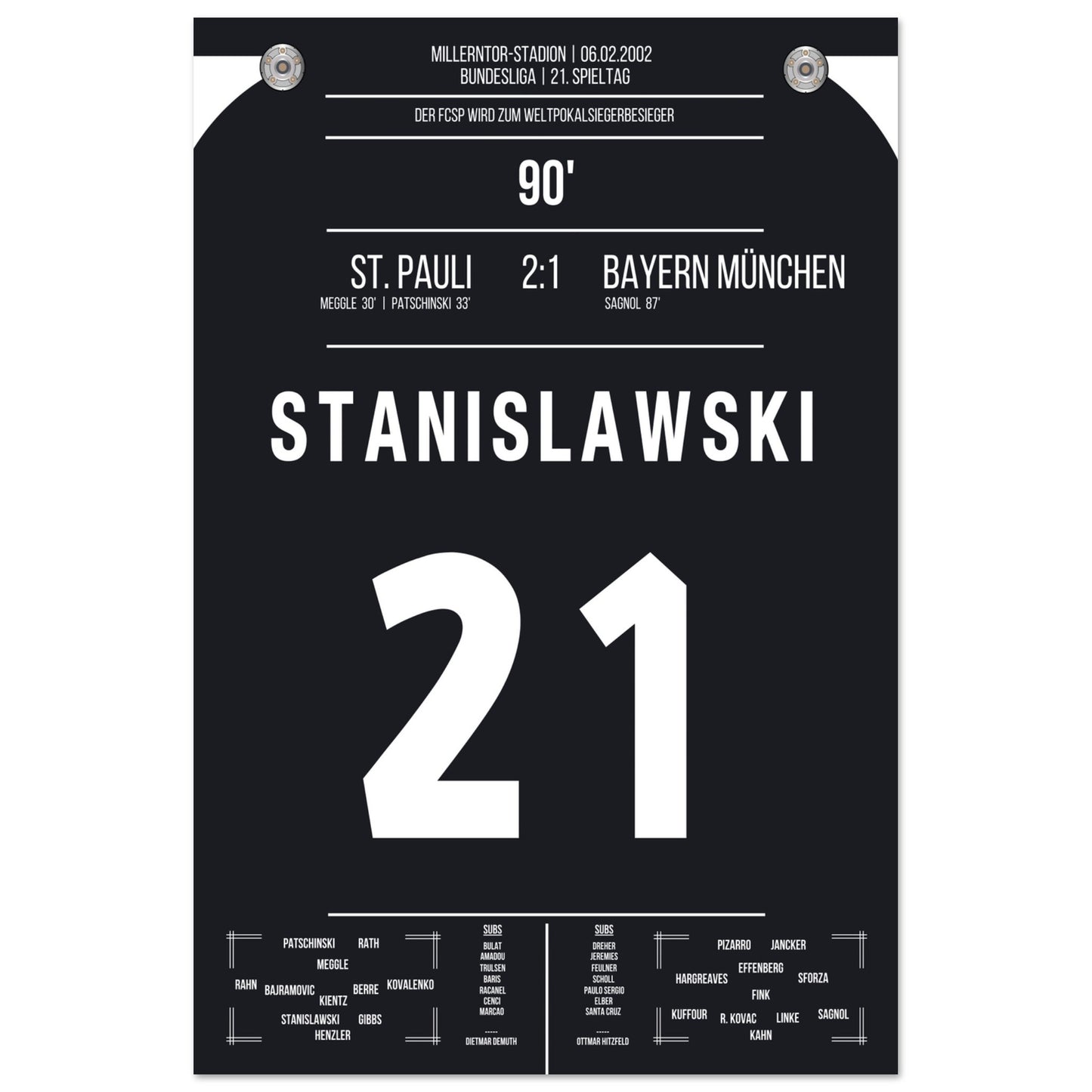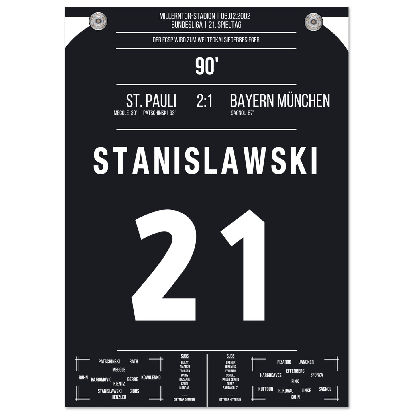 6. Februar 2002 – St. Pauli vs. Bayern 2:1: Sensation am Millerntor! Der Außenseiter bezwingt den frischgebackenen Weltpokalsieger aus München mit 2:1 – ein Sieg, der als "Weltpokalsiegerbesieger" in die Fußballfolklore eingeht. Unser Poster verewigt diesen legendären St. Pauli-Triumph in Braun-Weiß.