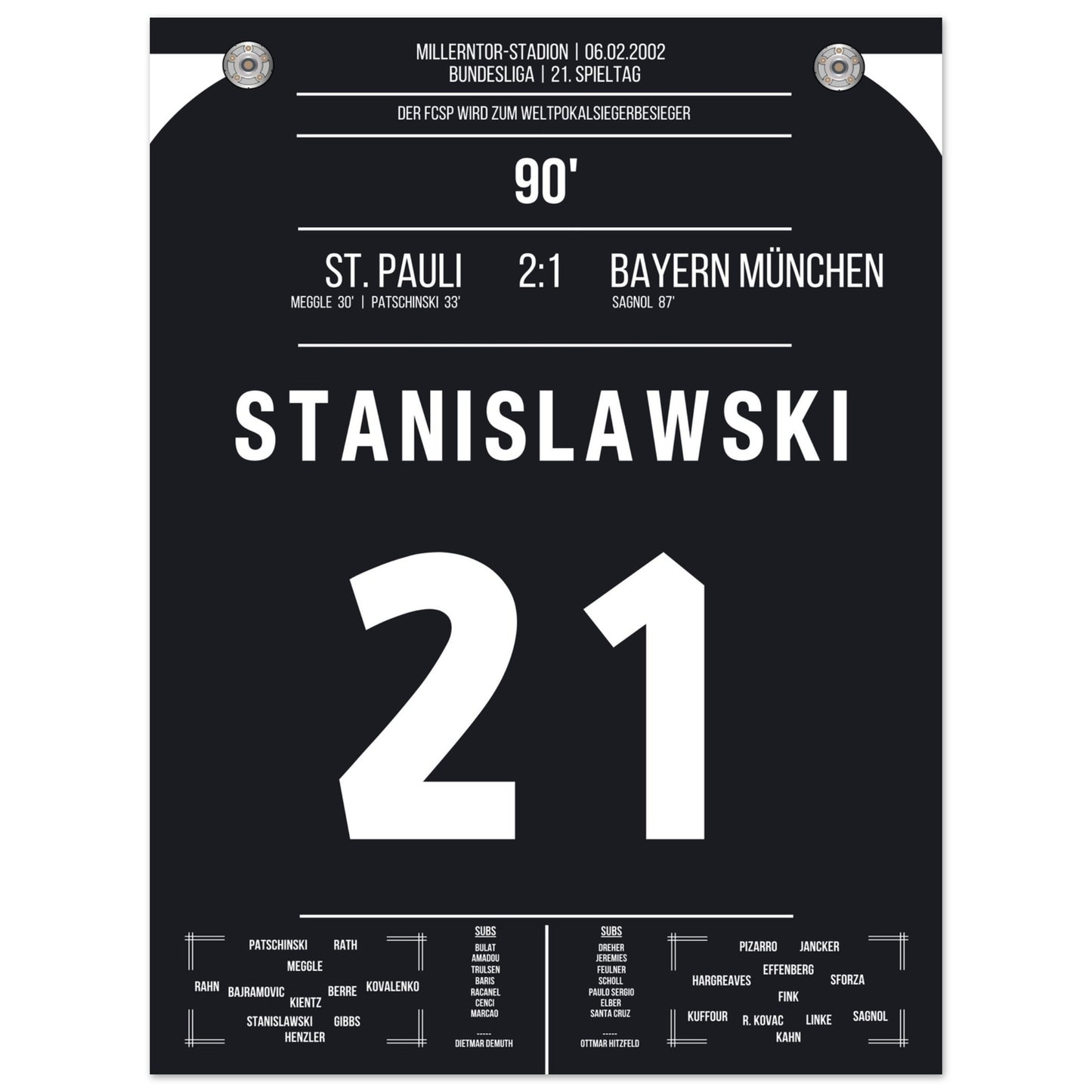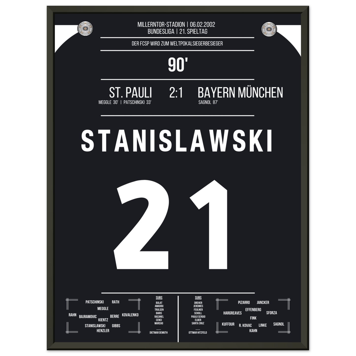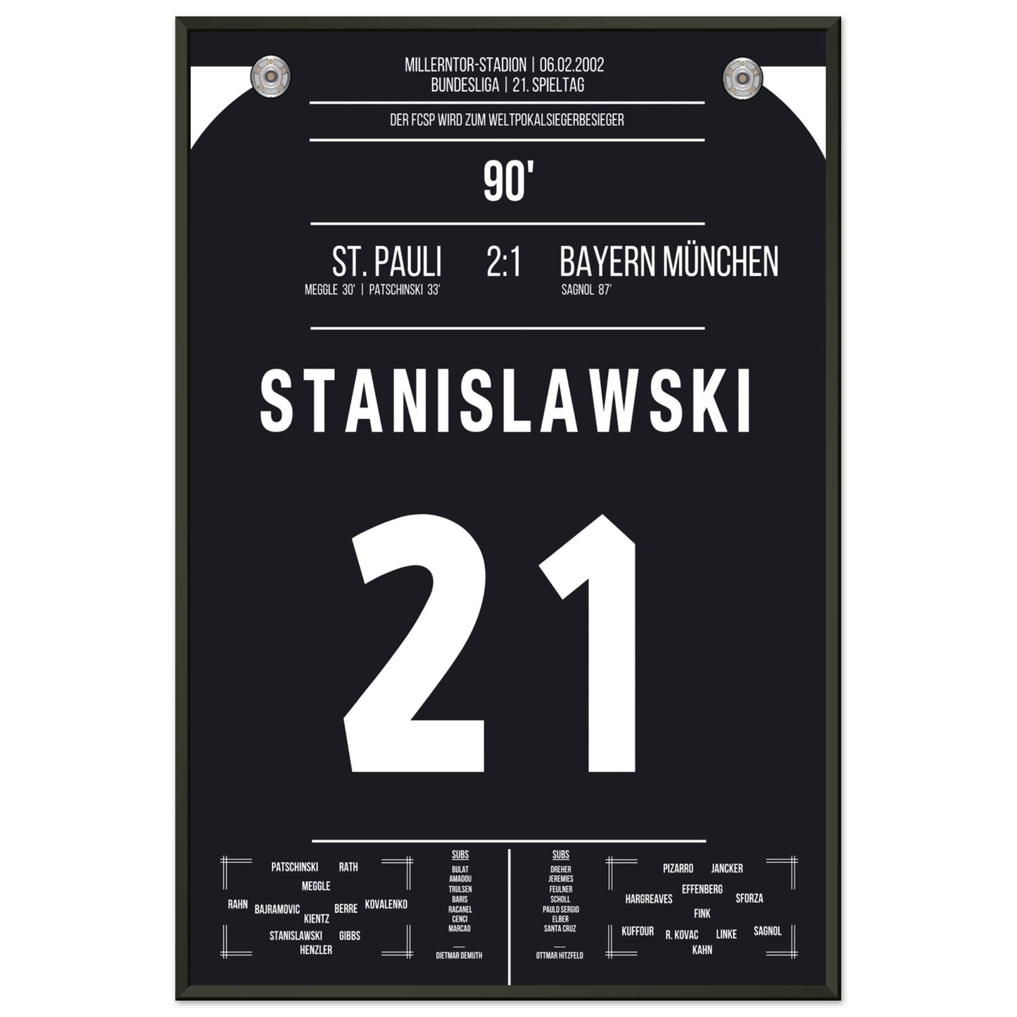 6. Februar 2002 – St. Pauli vs. Bayern 2:1: Sensation am Millerntor! Der Außenseiter bezwingt den frischgebackenen Weltpokalsieger aus München mit 2:1 – ein Sieg, der als "Weltpokalsiegerbesieger" in die Fußballfolklore eingeht. Unser Poster verewigt diesen legendären St. Pauli-Triumph in Braun-Weiß.