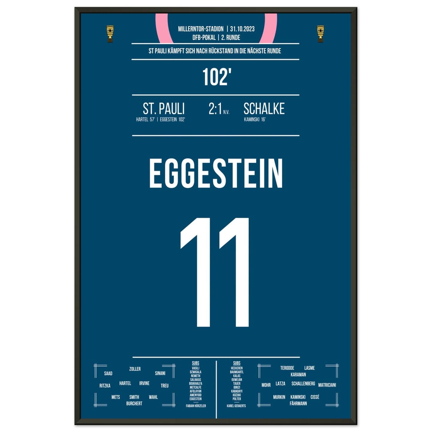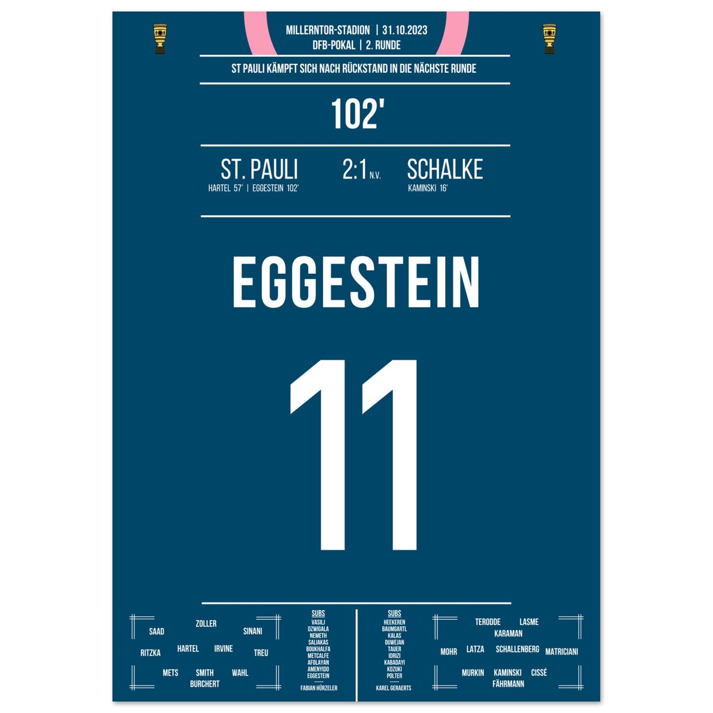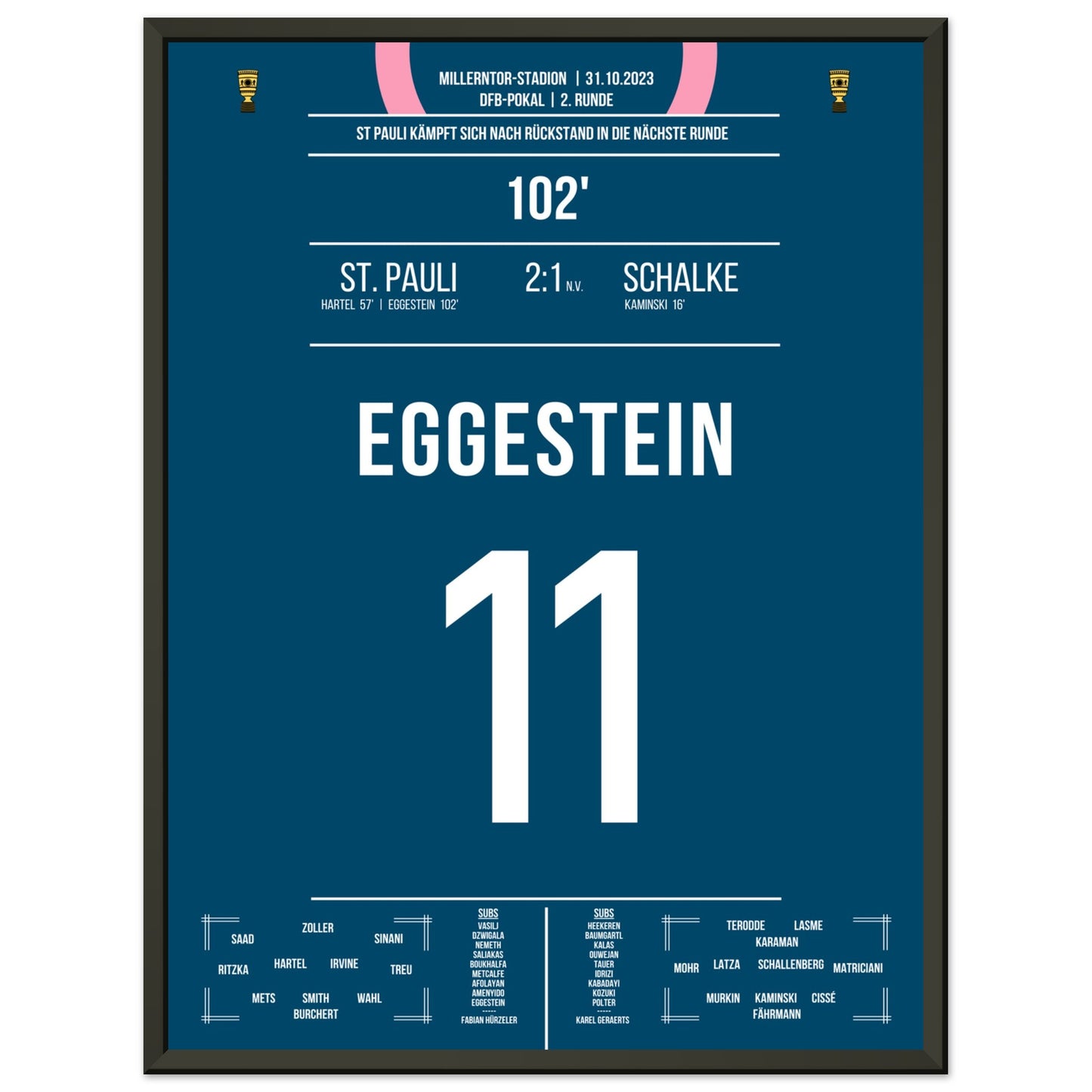 31. Oktober 2023 – St. Pauli vs. Schalke 2:1 n.V.: In der 102. Minute der Verlängerung trifft Johannes Eggestein und schießt St. Pauli ins Pokal-Achtelfinale. Ein Drama unter Flutlicht – und ein Held im Pauli-Trikot. Unser Poster verewigt diesen packenden Pokalmoment am Millerntor.