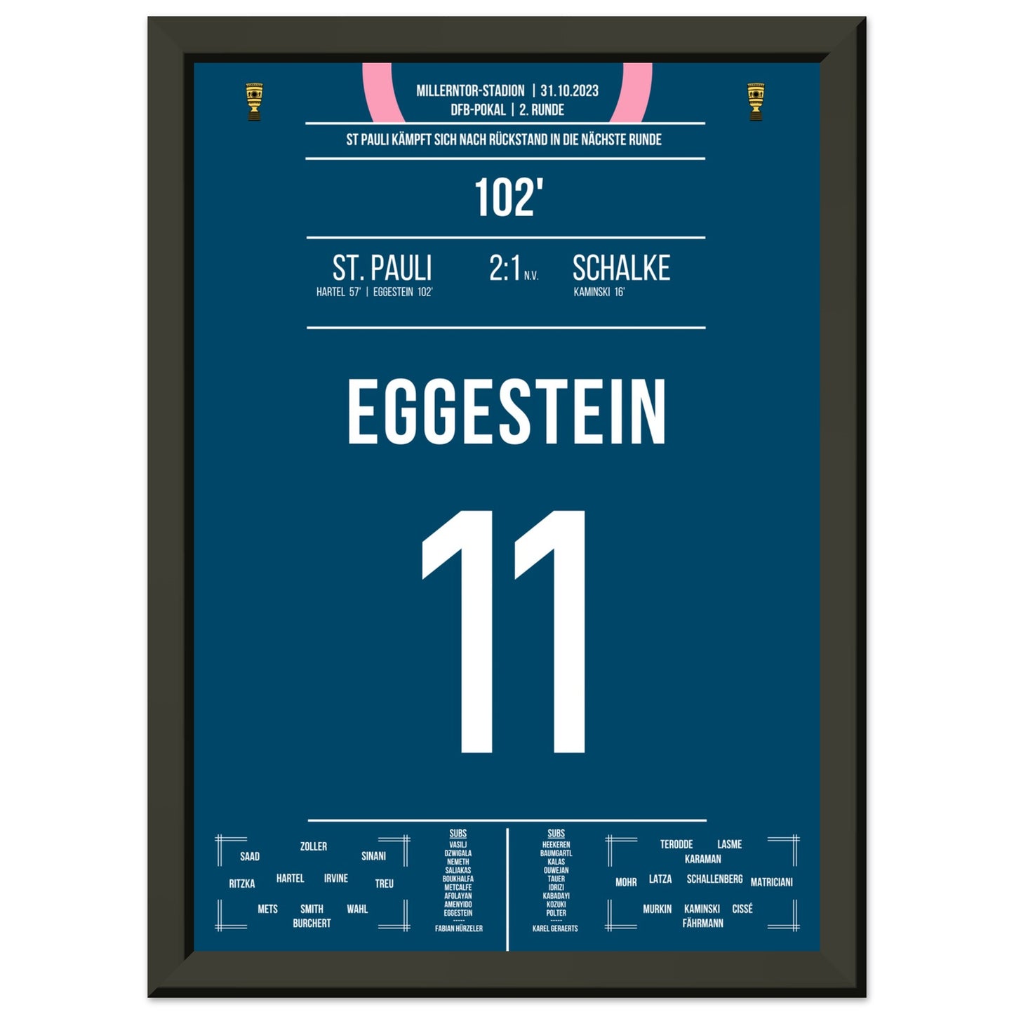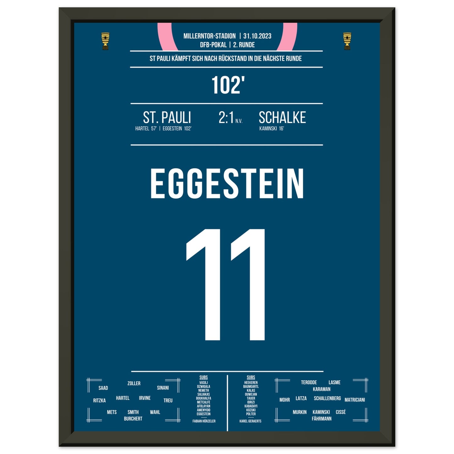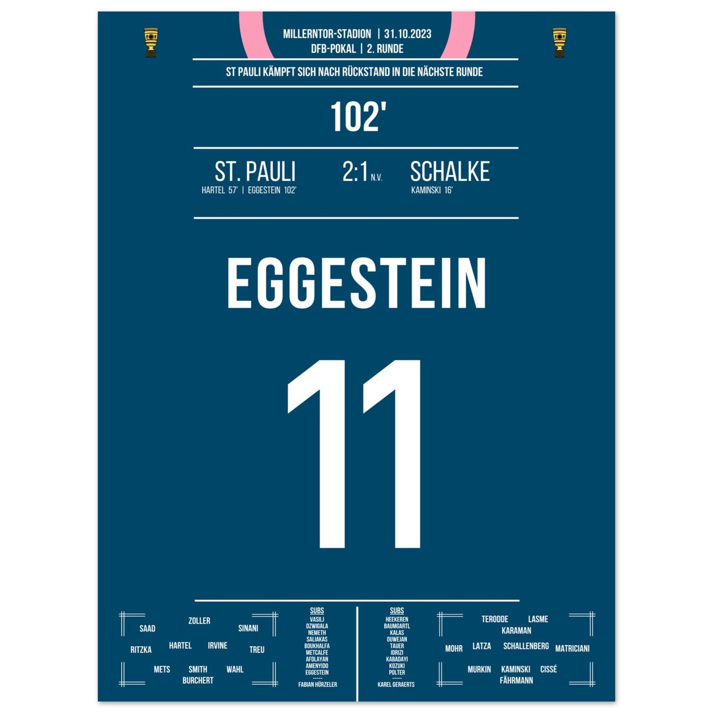 31. Oktober 2023 – St. Pauli vs. Schalke 2:1 n.V.: In der 102. Minute der Verlängerung trifft Johannes Eggestein und schießt St. Pauli ins Pokal-Achtelfinale. Ein Drama unter Flutlicht – und ein Held im Pauli-Trikot. Unser Poster verewigt diesen packenden Pokalmoment am Millerntor.