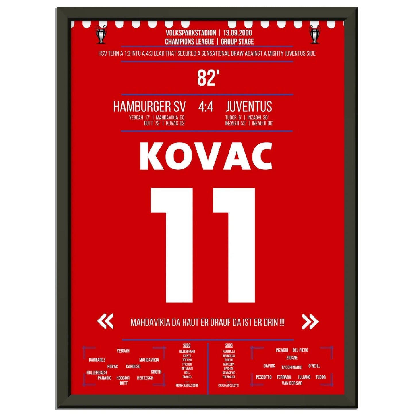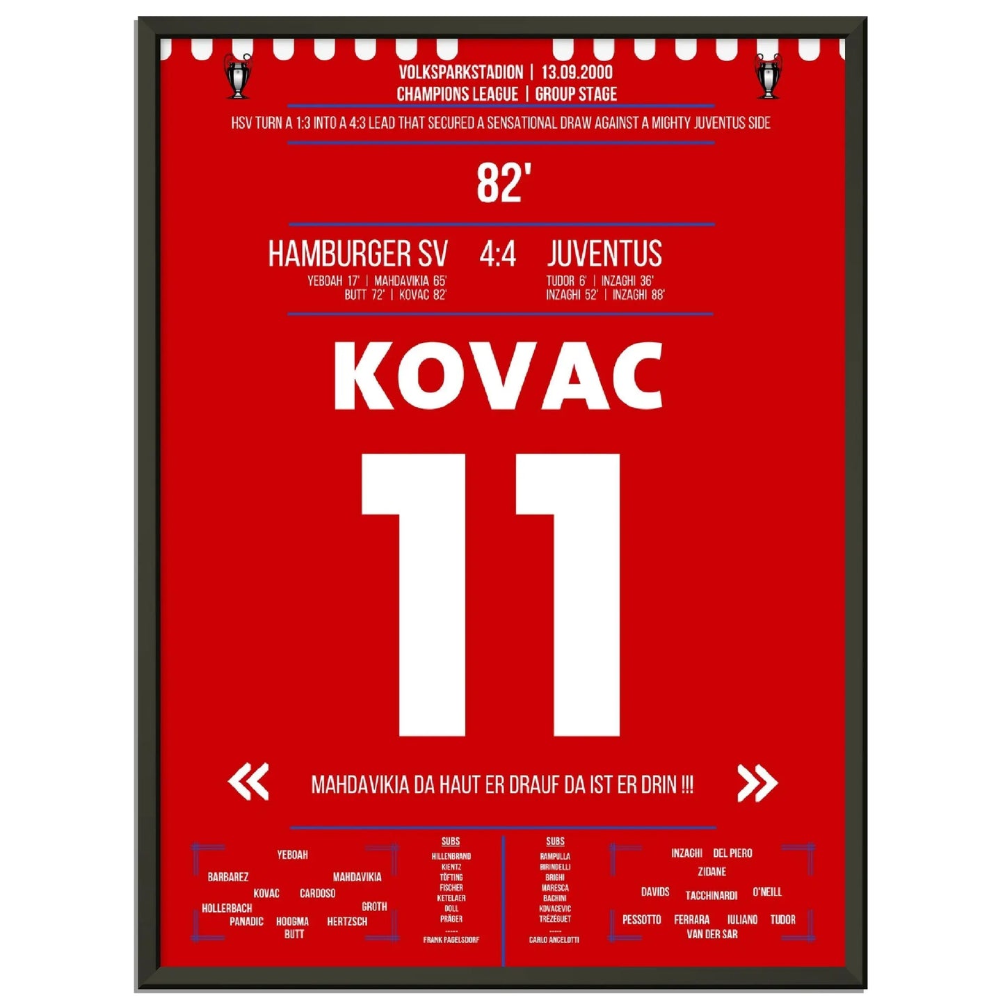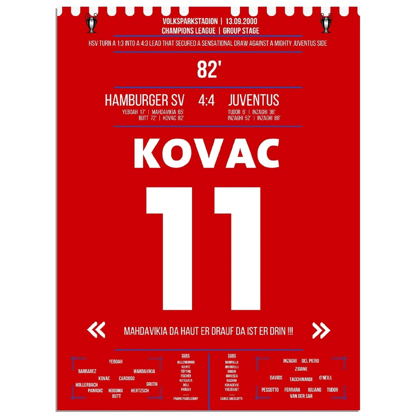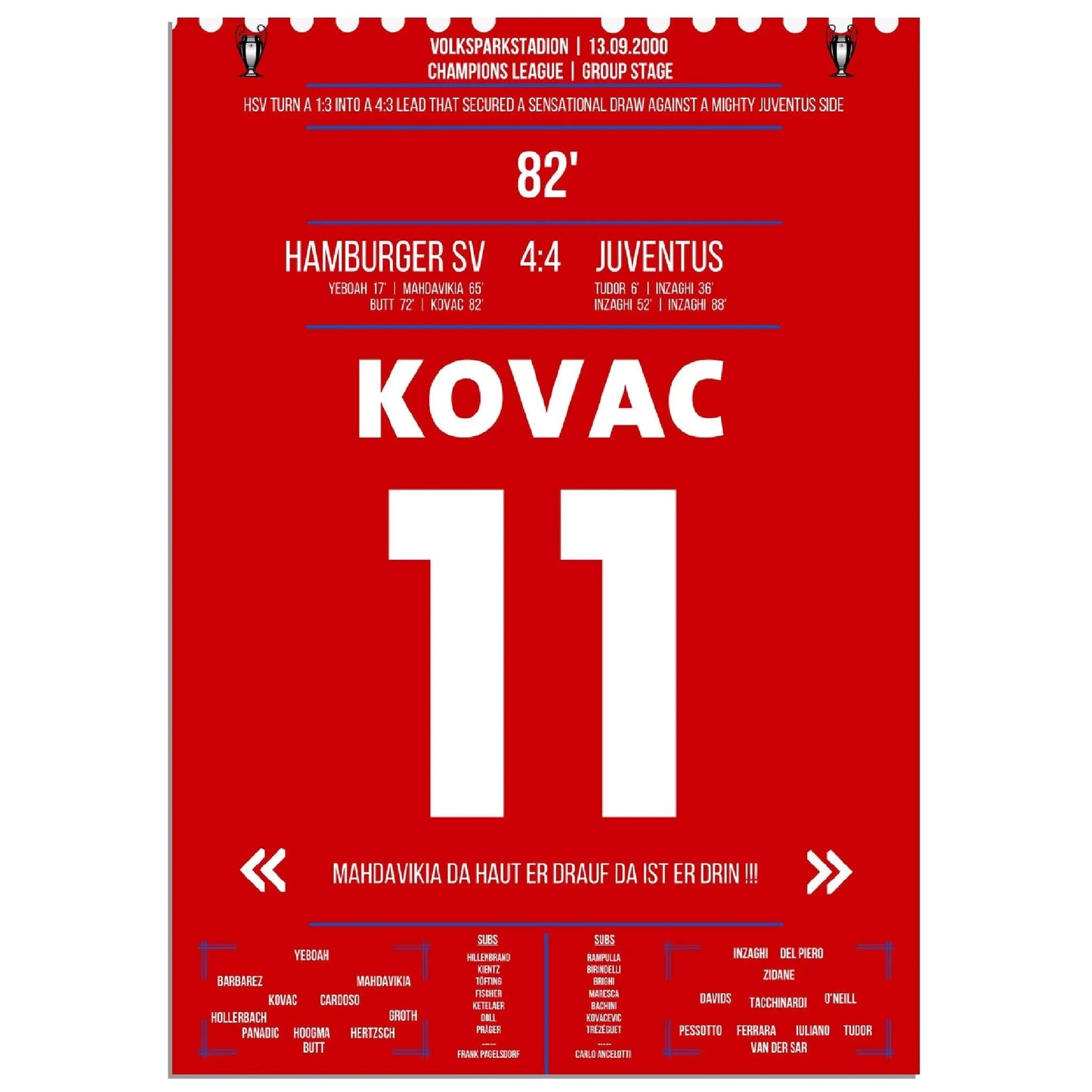 13. September 2000 – Hamburg vs. J. Turin 4:4: In einem wilden CL-Duell trifft Niko Kovač in der 82. Minute  – Hamburg trotzt dem italienischen Giganten in einem denkwürdigen Europapokalabend. Unser Poster hält diesen magischen Moment voller Kampfgeist und Leidenschaft fest.