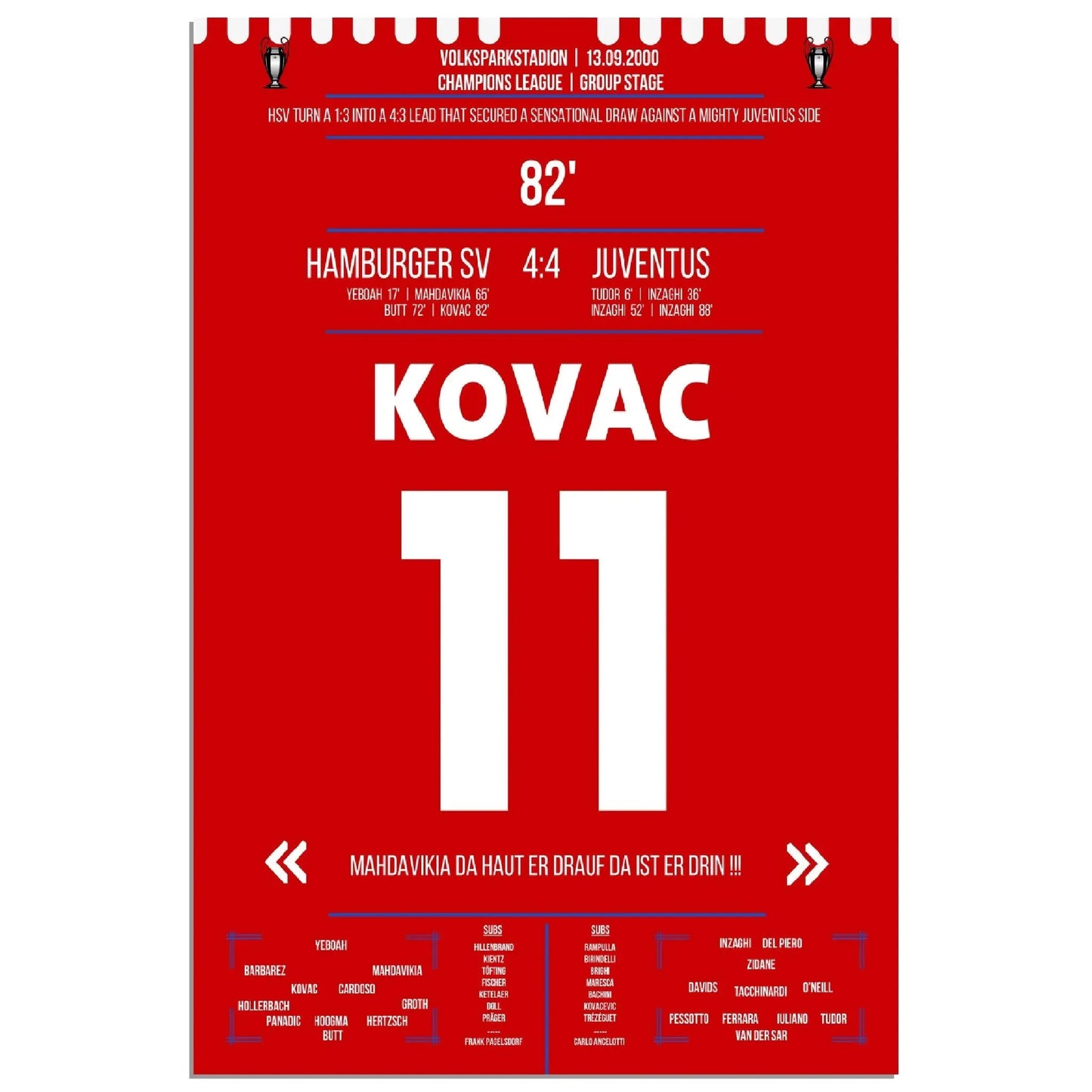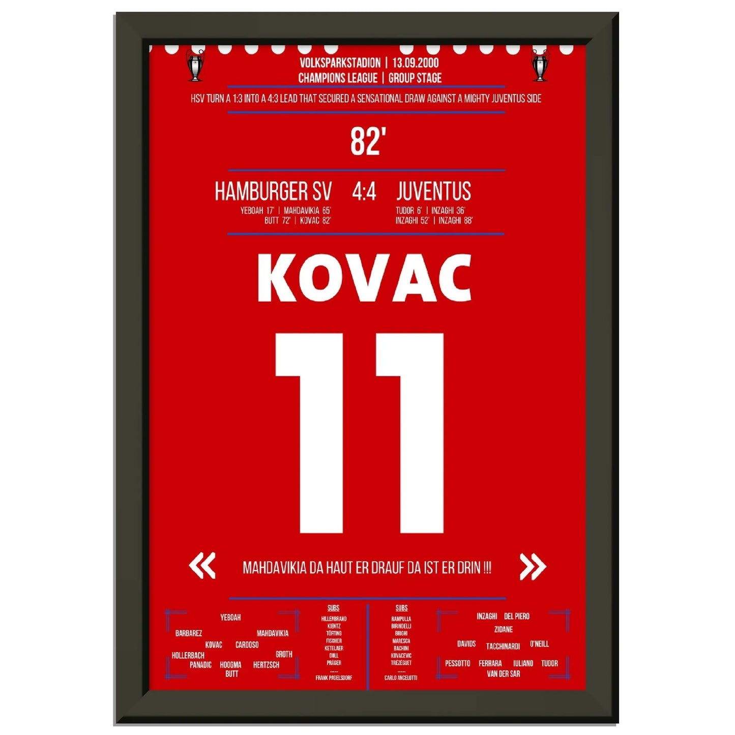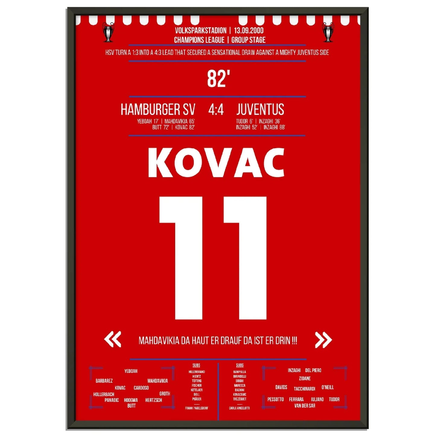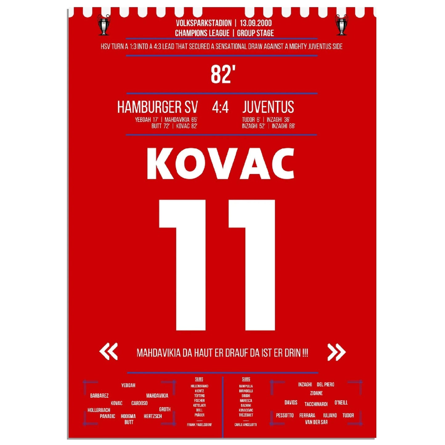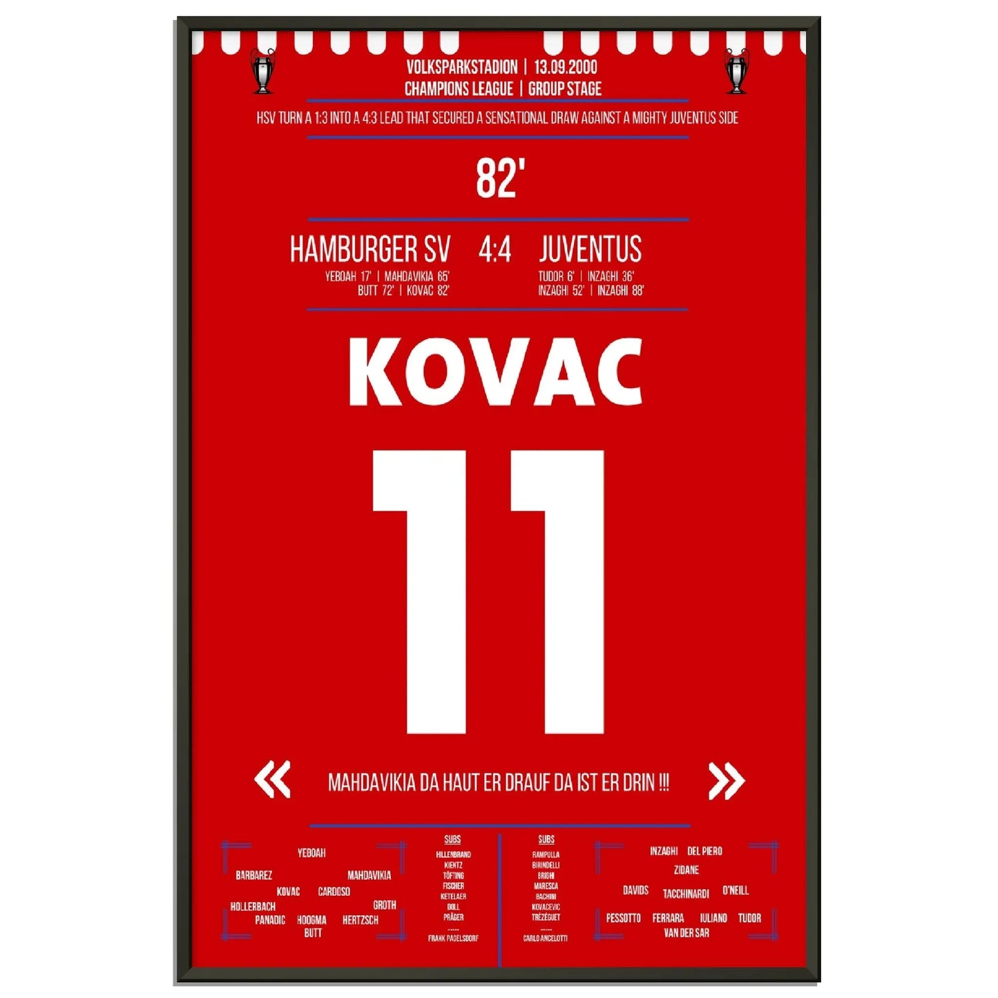 13. September 2000 – Hamburg vs. J. Turin 4:4: In einem wilden CL-Duell trifft Niko Kovač in der 82. Minute  – Hamburg trotzt dem italienischen Giganten in einem denkwürdigen Europapokalabend. Unser Poster hält diesen magischen Moment voller Kampfgeist und Leidenschaft fest.