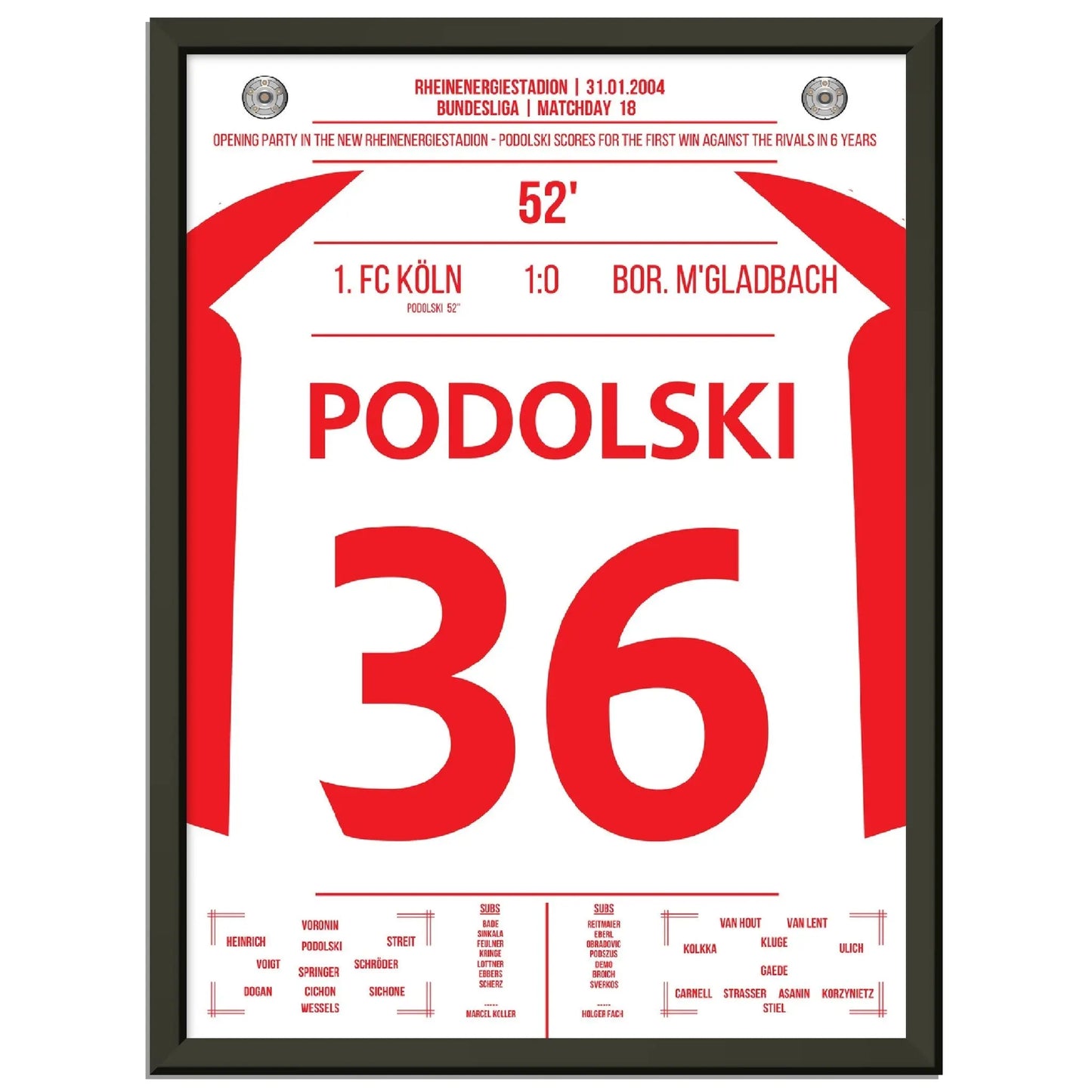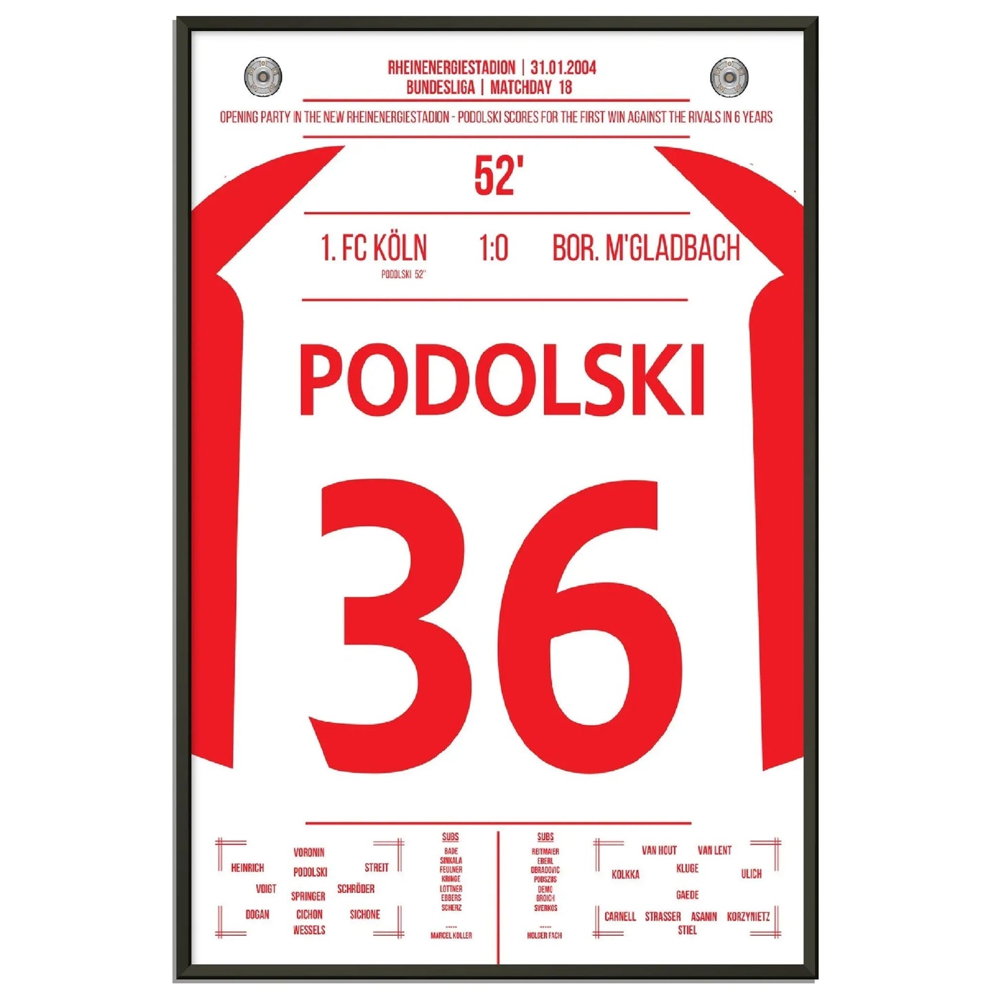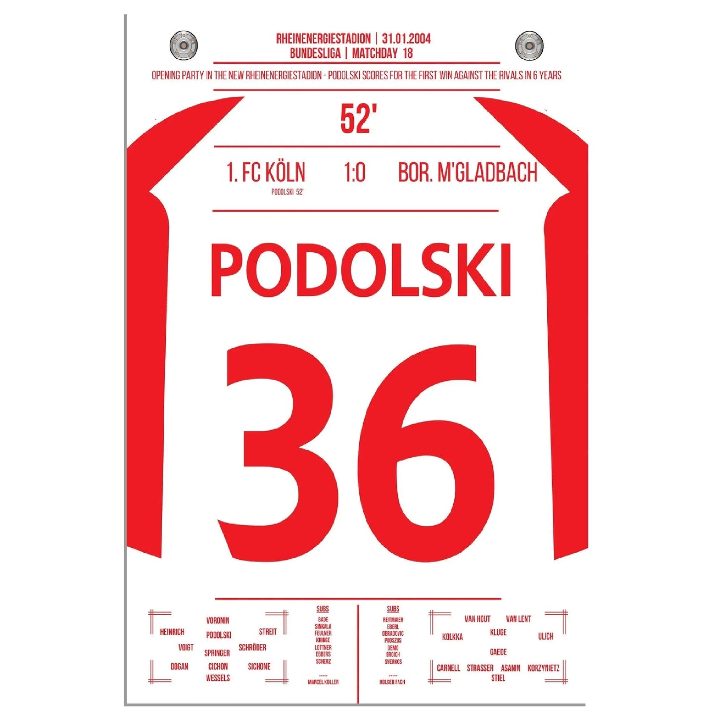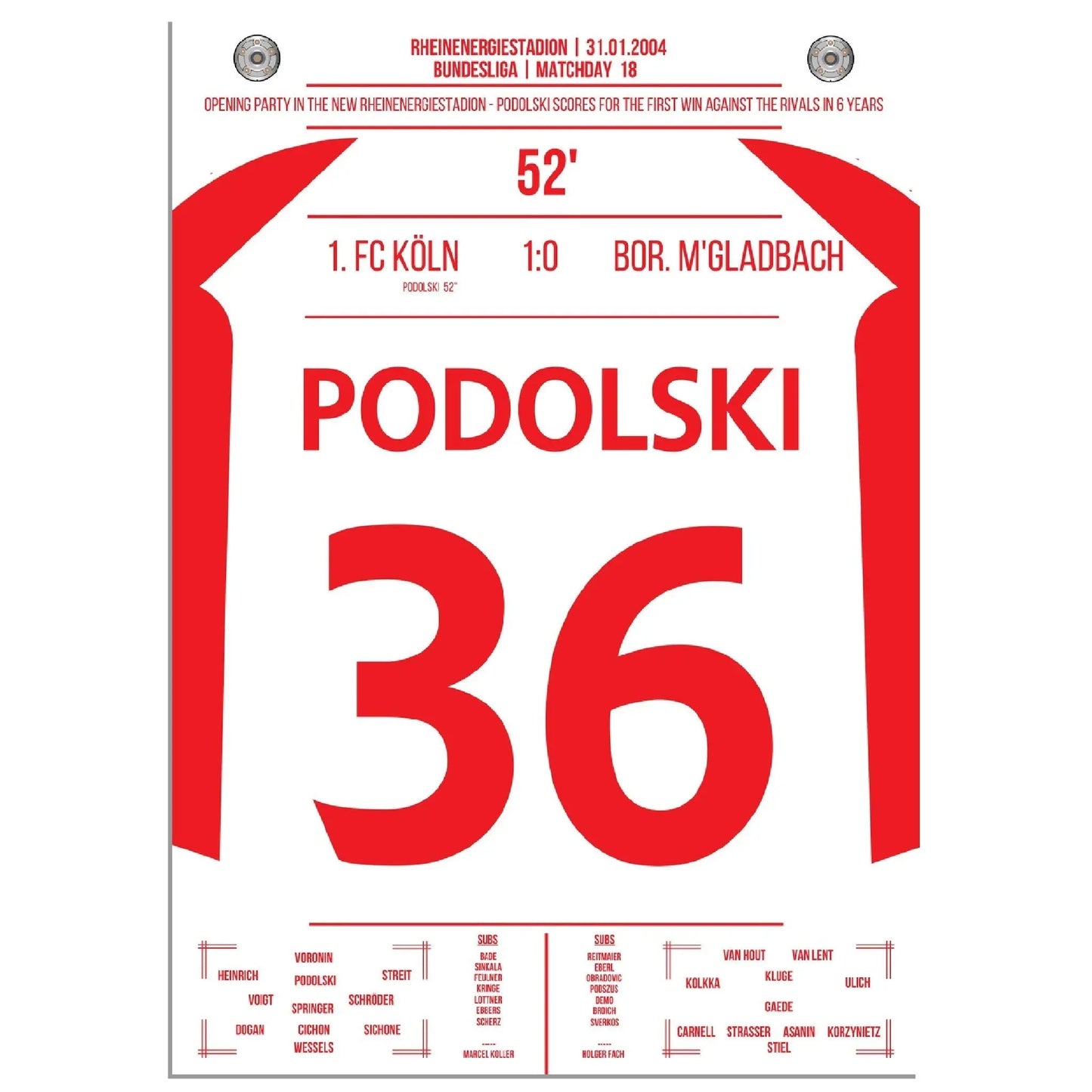 31. Januar 2004 – Köln vs. Mönchengladbach 1:0: In der 52. Minute trifft der junge Lukas Podolski im Derby zum einzigen Tor des Spiels und lässt das Müngersdorfer Stadion beben. Ein Vollspannkracher und der Beginn einer Legende. Unser Poster hält diesen besonderen Podolski-Moment in Rot-Weiß fest.