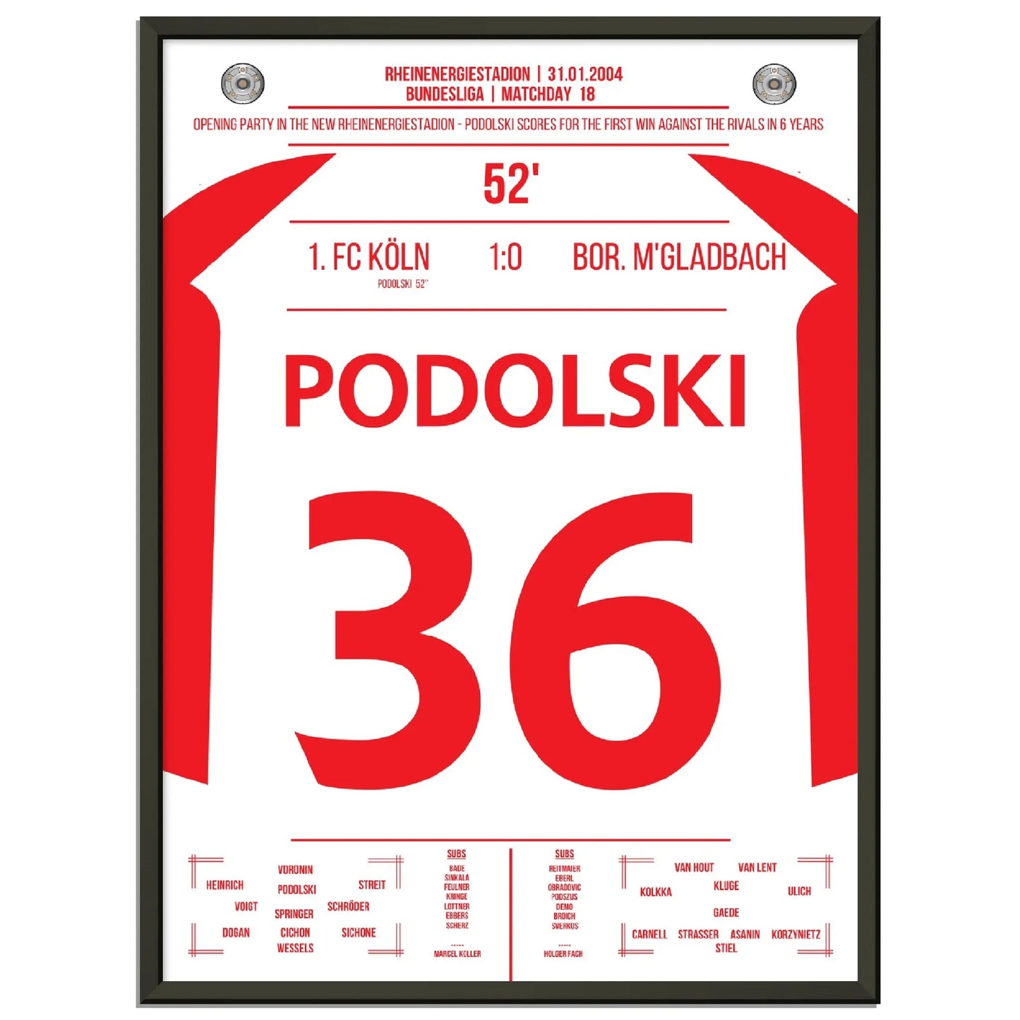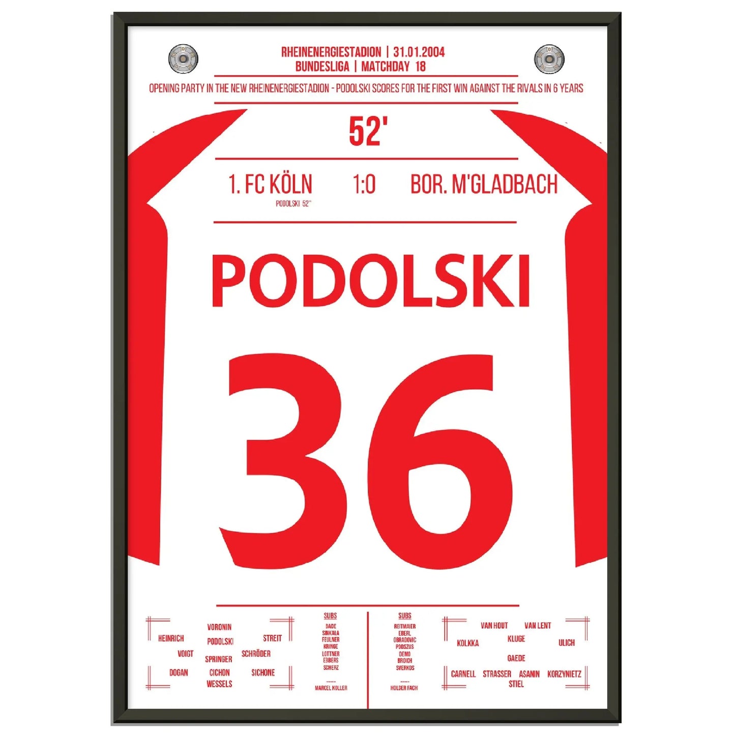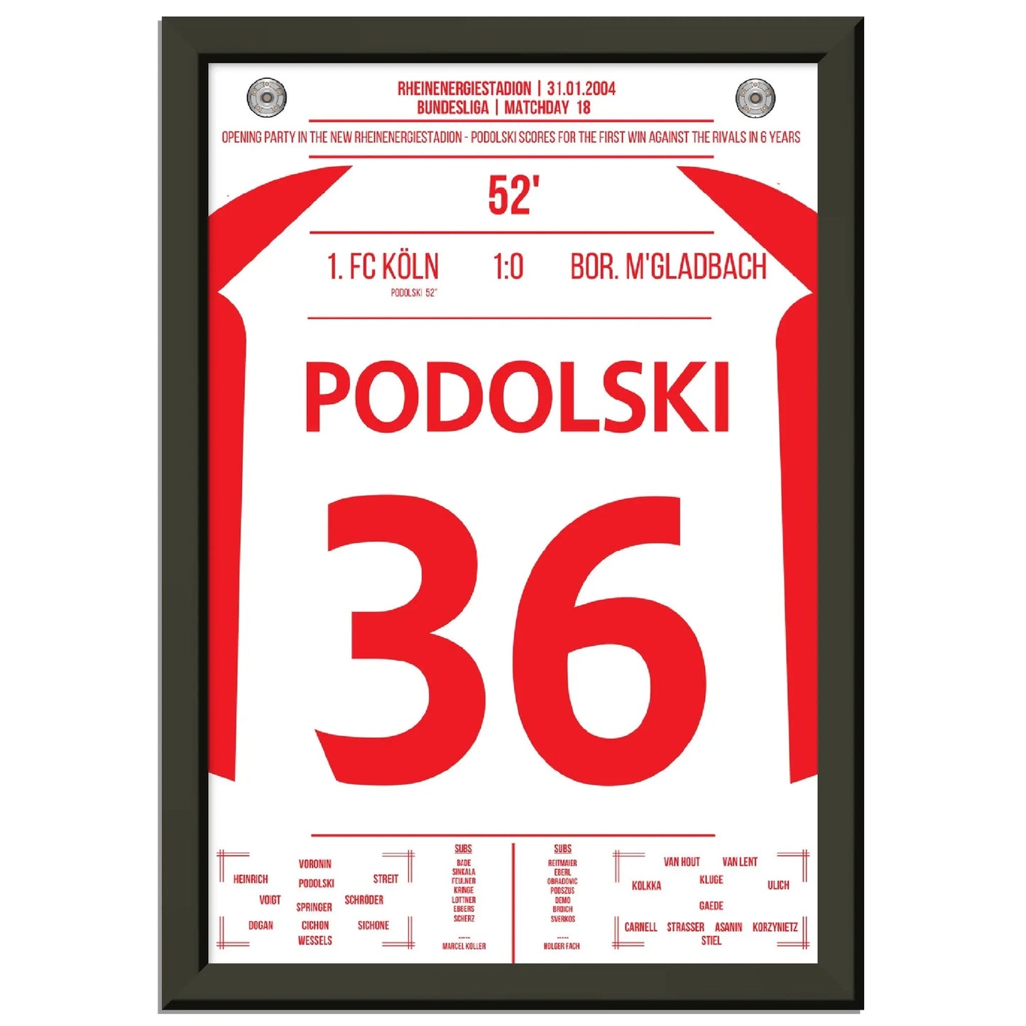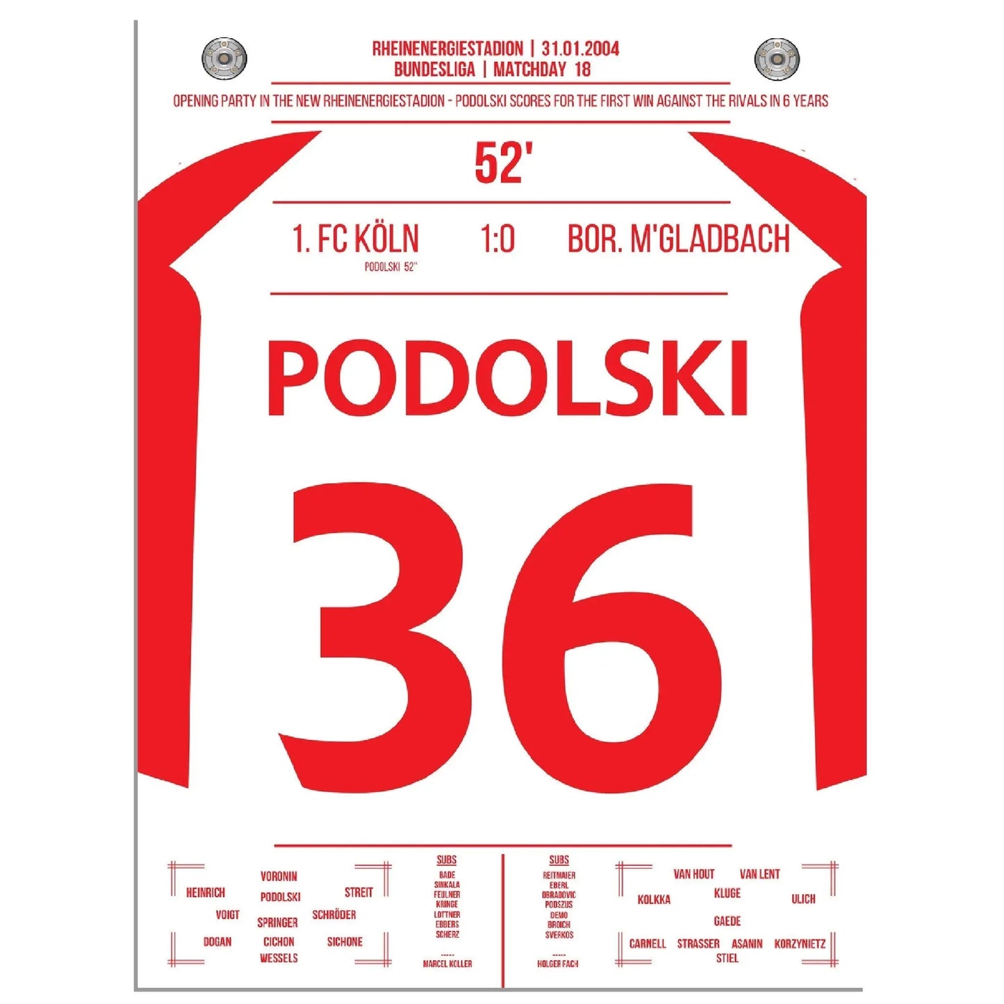 31. Januar 2004 – Köln vs. Mönchengladbach 1:0: In der 52. Minute trifft der junge Lukas Podolski im Derby zum einzigen Tor des Spiels und lässt das Müngersdorfer Stadion beben. Ein Vollspannkracher und der Beginn einer Legende. Unser Poster hält diesen besonderen Podolski-Moment in Rot-Weiß fest.