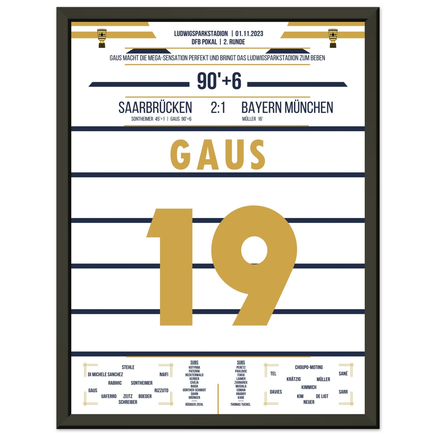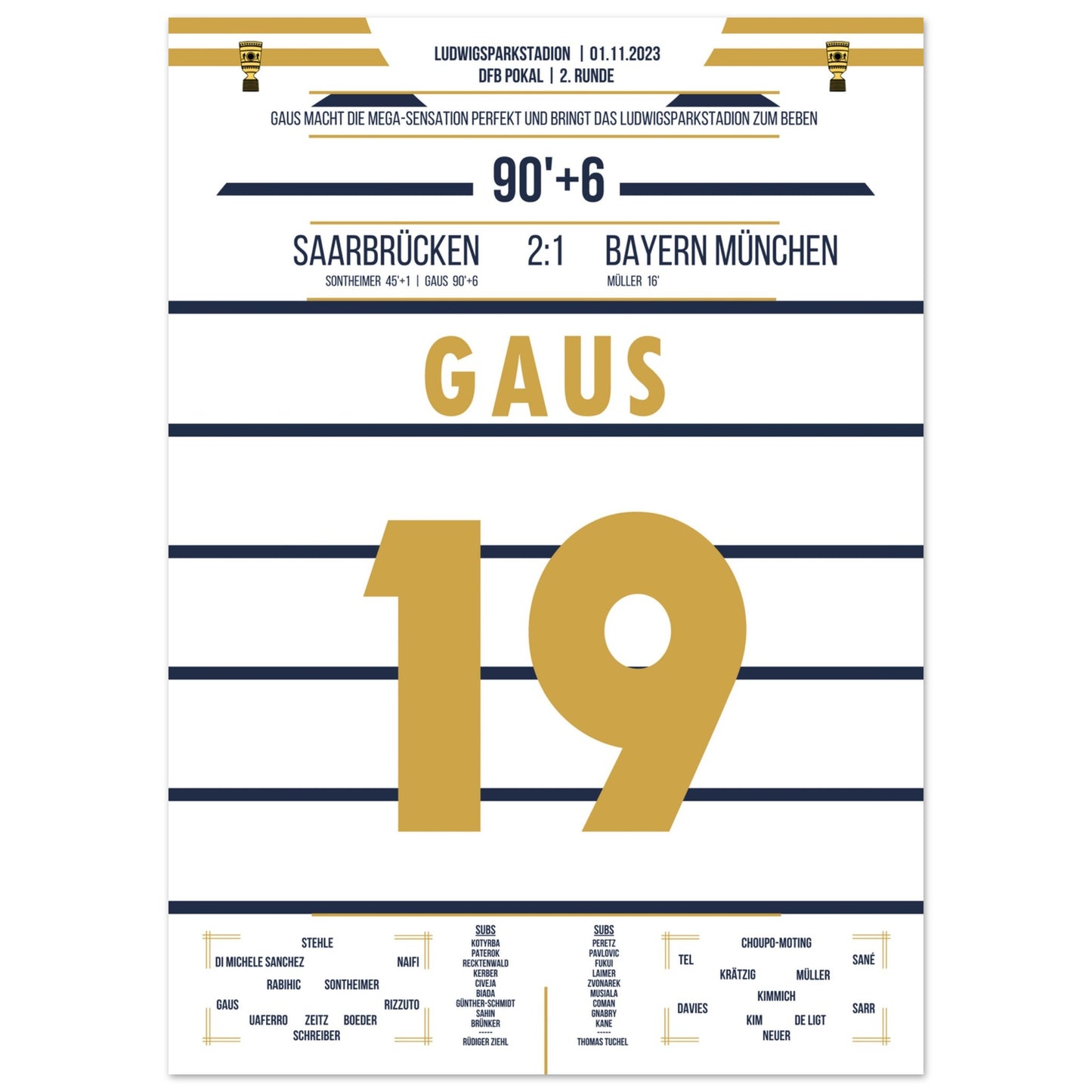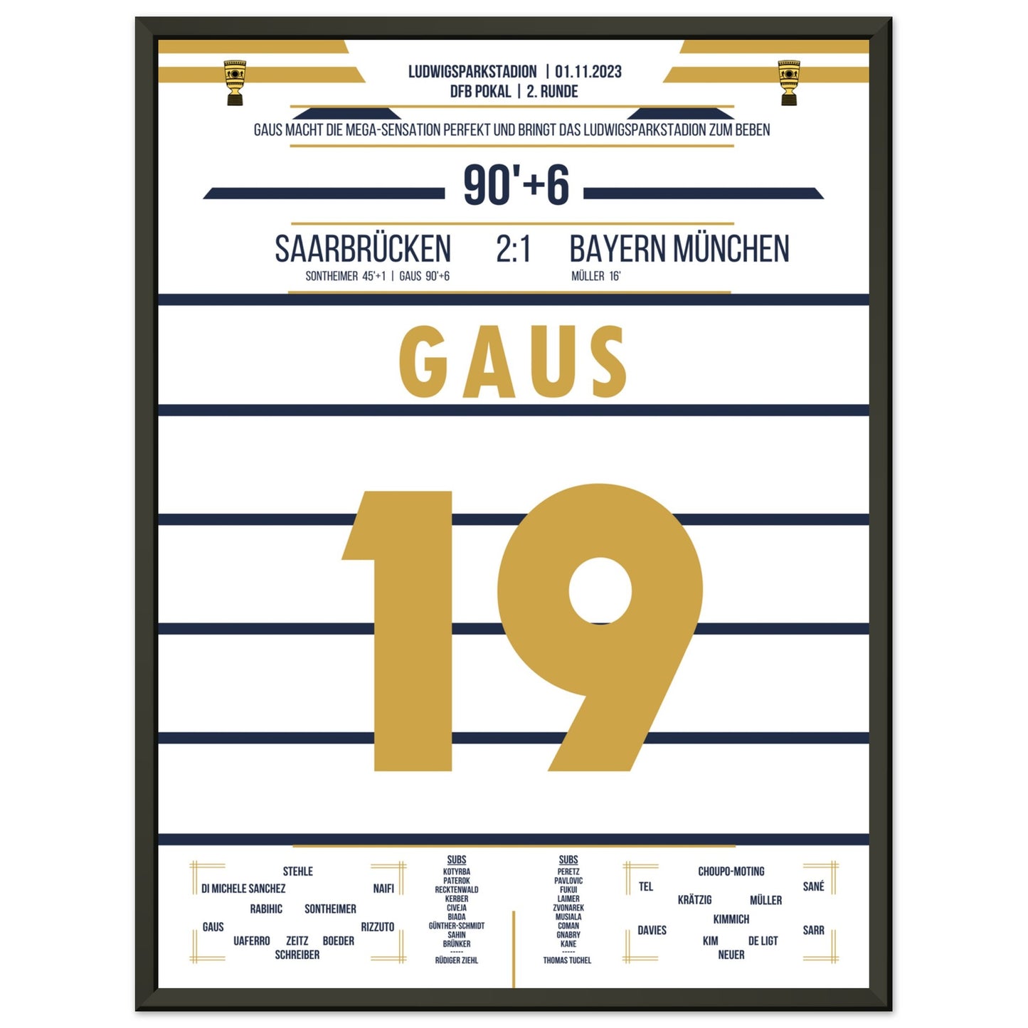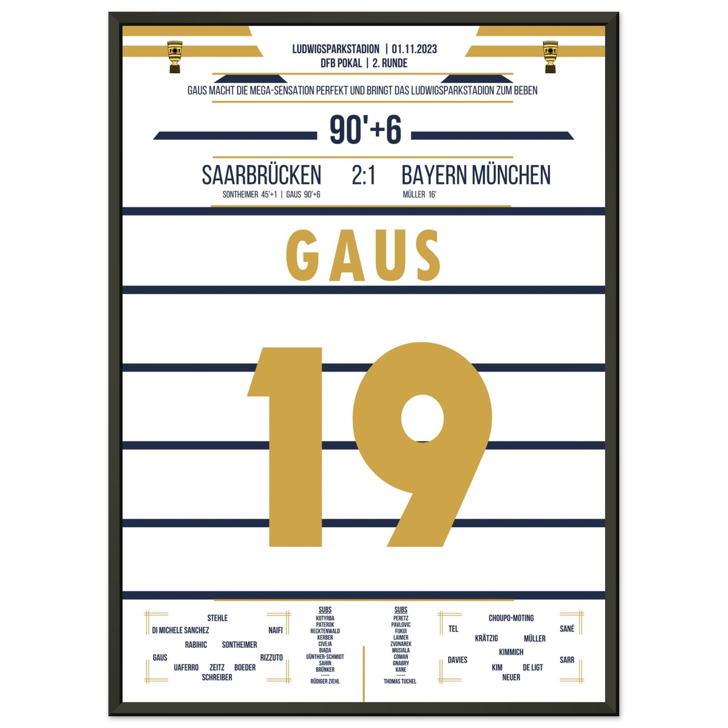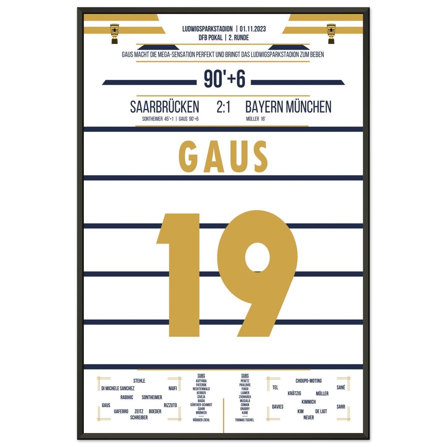 1. November 2023 – Saarbrücken vs. München 2:1: In der 90.+6 Minute trifft Marcel Gaus ins Glück und schießt den Saarbrücken sensationell ins Achtelfinale des Pokals. Der Ludwigspark tobt – ein unvergesslicher Abend für die Fußballgeschichte. Unser Poster hält diesen magischen Pokalmoment für immer fest.