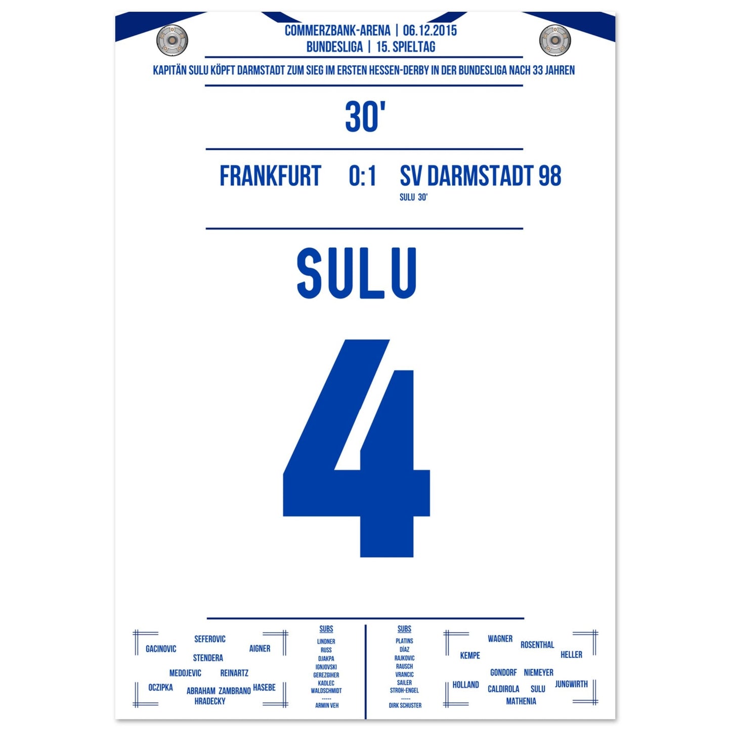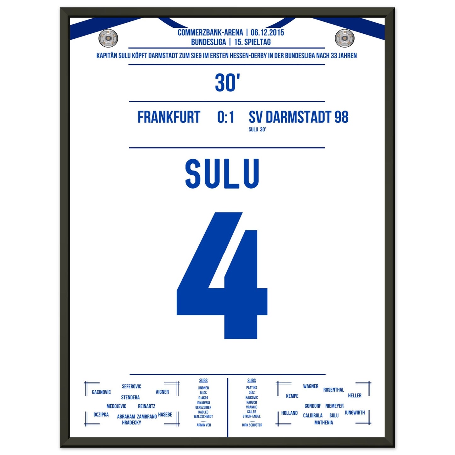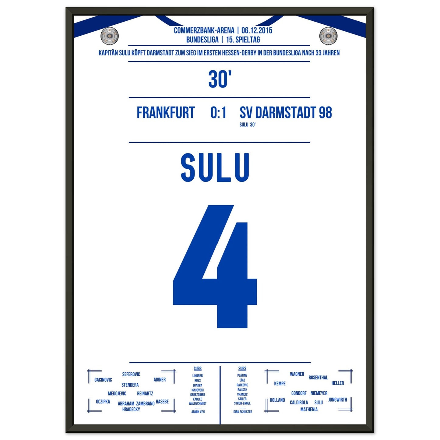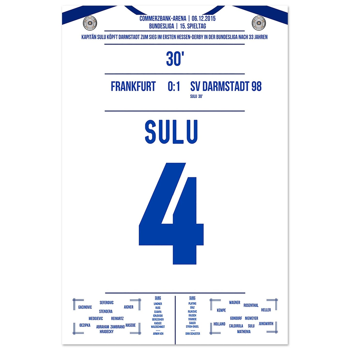 8. November 2015 – Frankfurt vs. Darmstadt - 0:1: Kapitän Aytaç Sulu köpft das Siegtor im hessischen Derby und sichert damit einen historischen Auswärtssieg im Stadtwald. Der erste Lilien-Erfolg in Frankfurt seit über drei Jahrzehnten. Unser Poster bringt diesen besonderen Derby-Moment zu dir nach Hause.