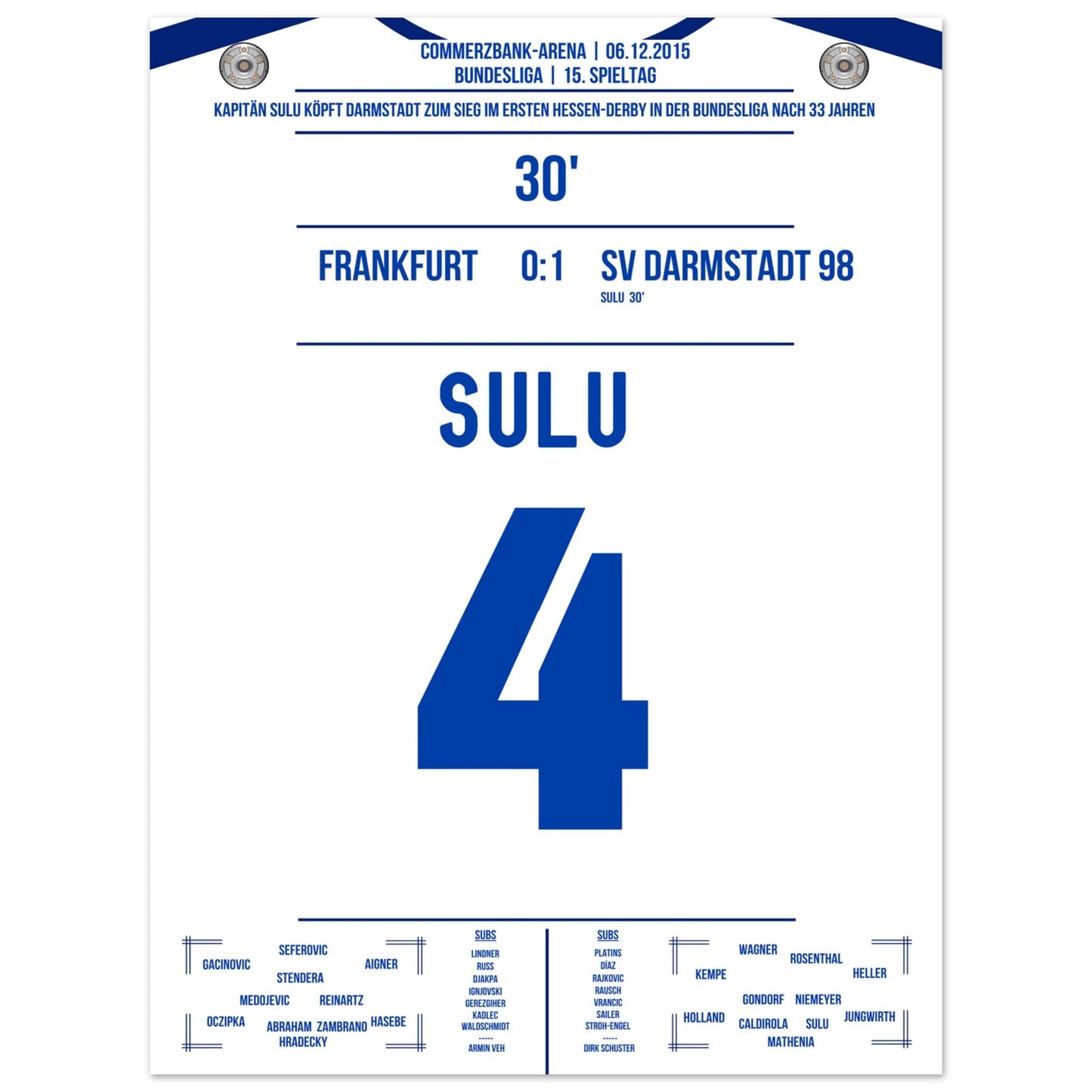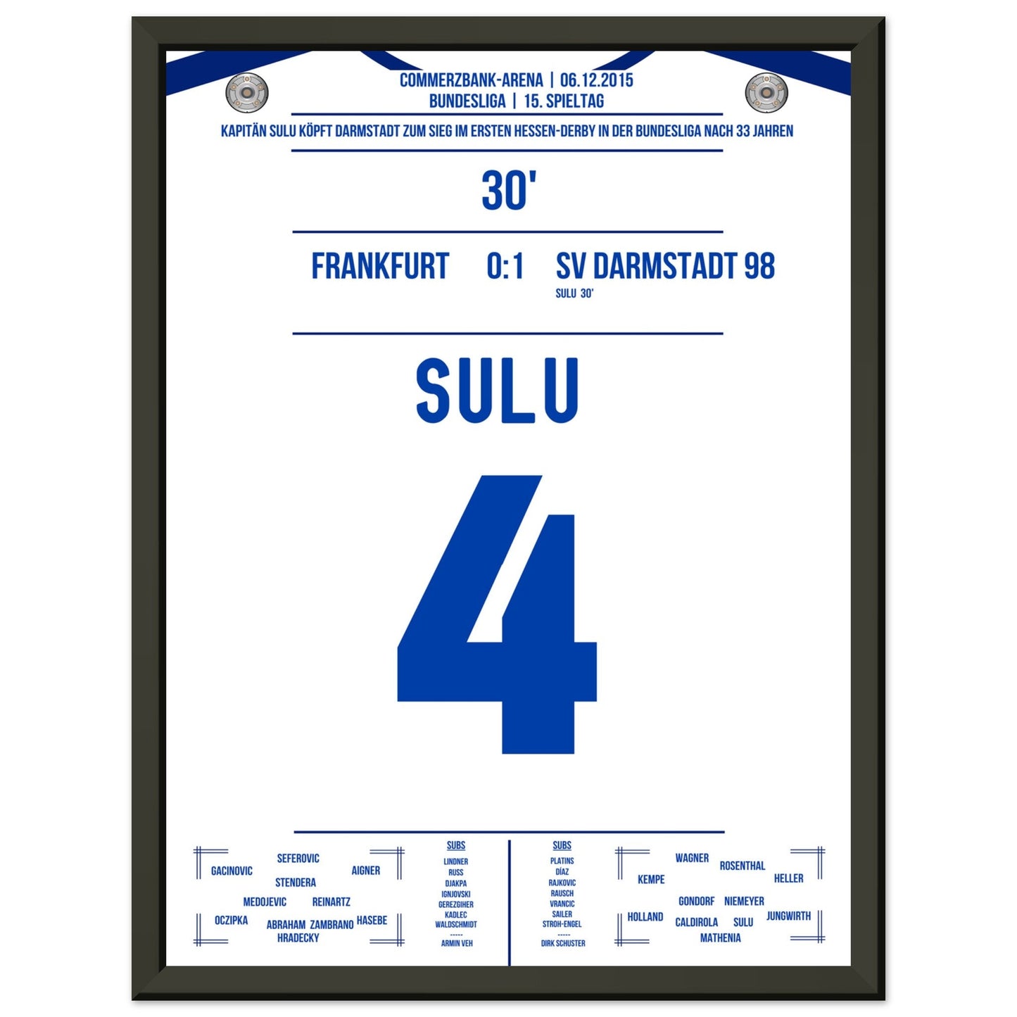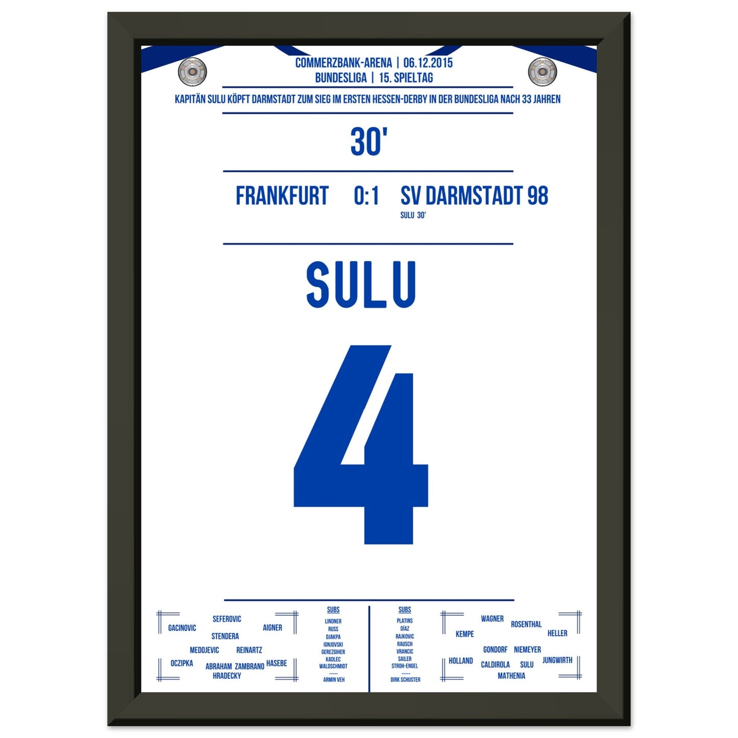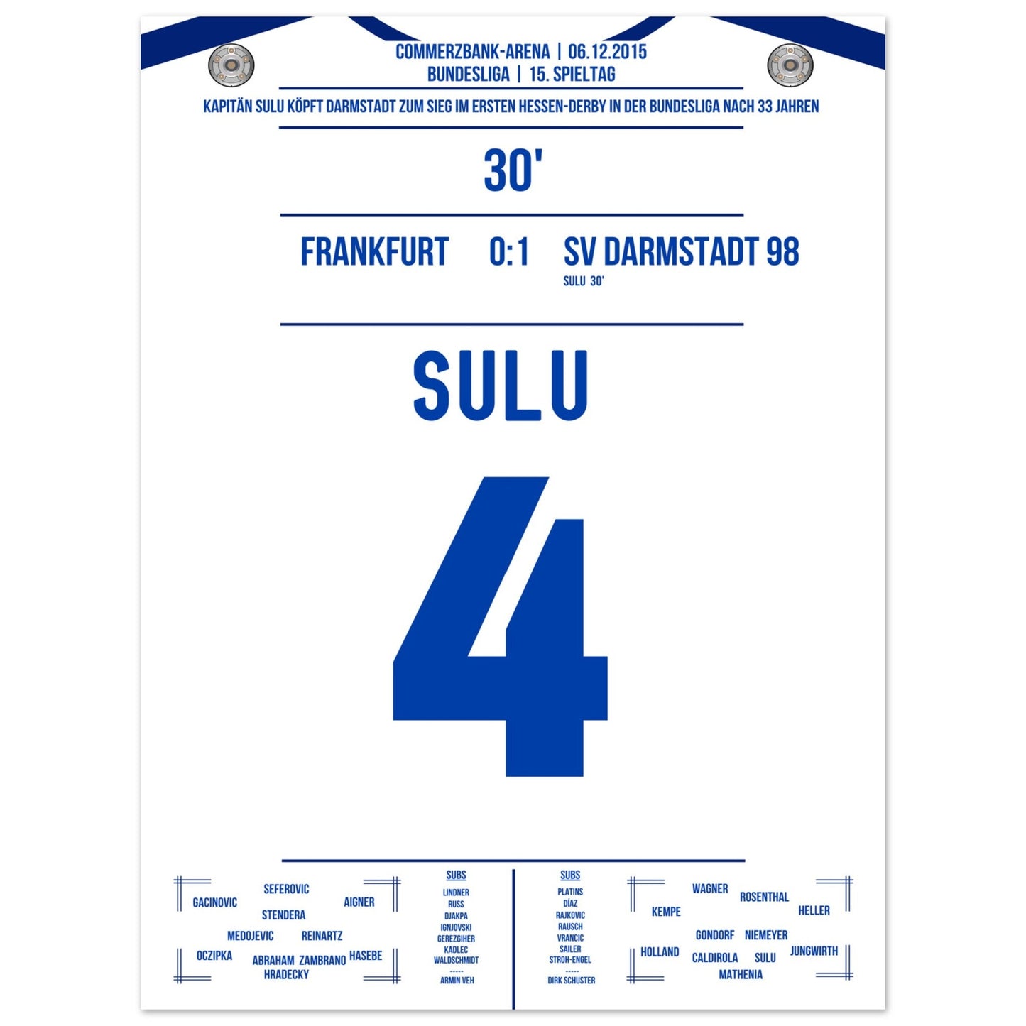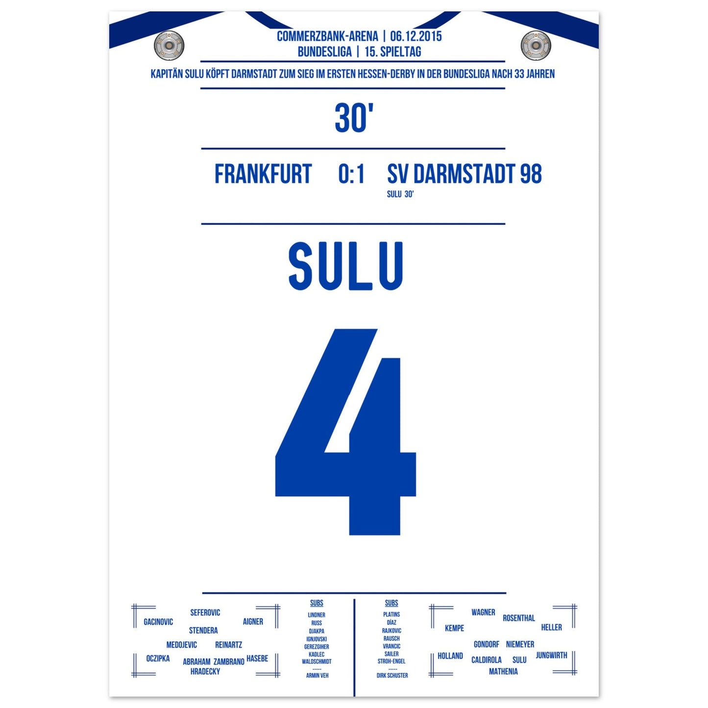 8. November 2015 – Frankfurt vs. Darmstadt - 0:1: Kapitän Aytaç Sulu köpft das Siegtor im hessischen Derby und sichert damit einen historischen Auswärtssieg im Stadtwald. Der erste Lilien-Erfolg in Frankfurt seit über drei Jahrzehnten. Unser Poster bringt diesen besonderen Derby-Moment zu dir nach Hause.