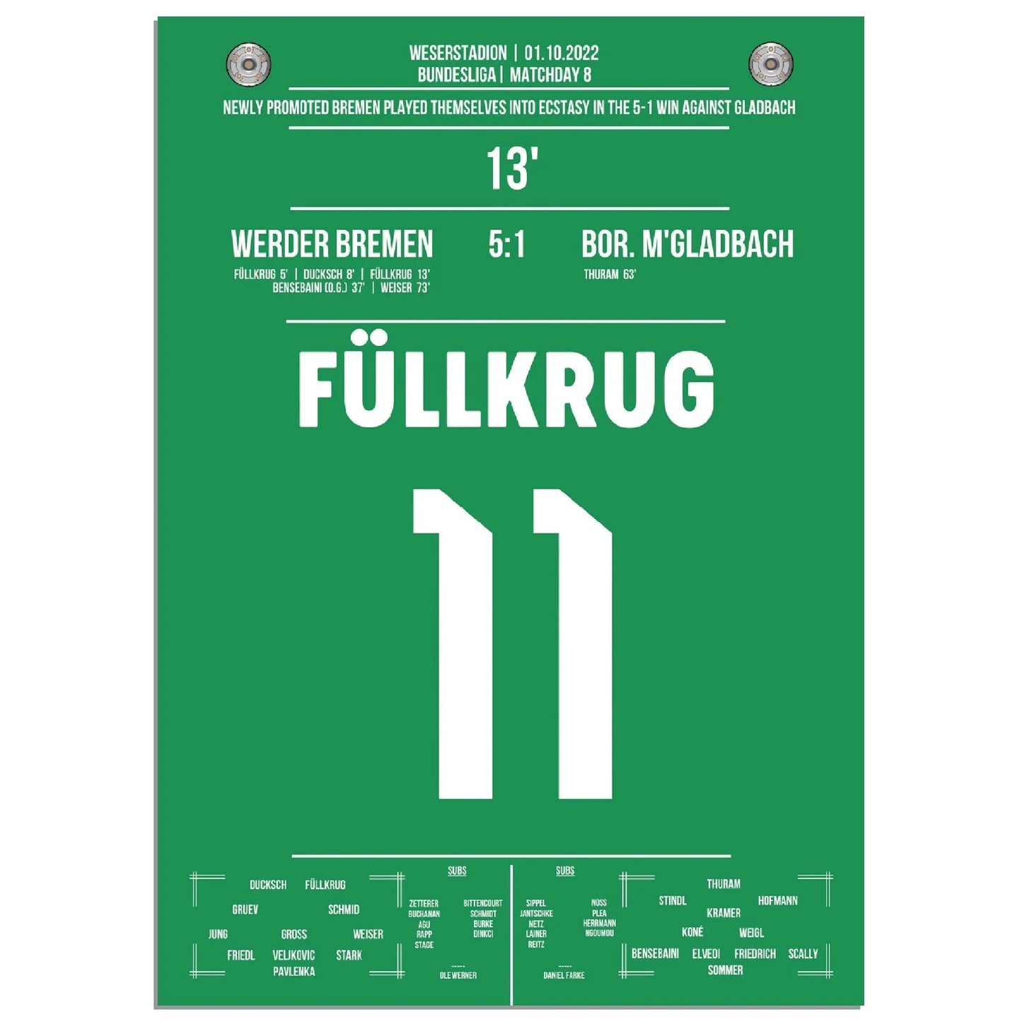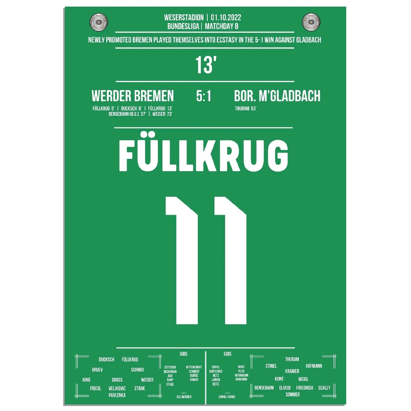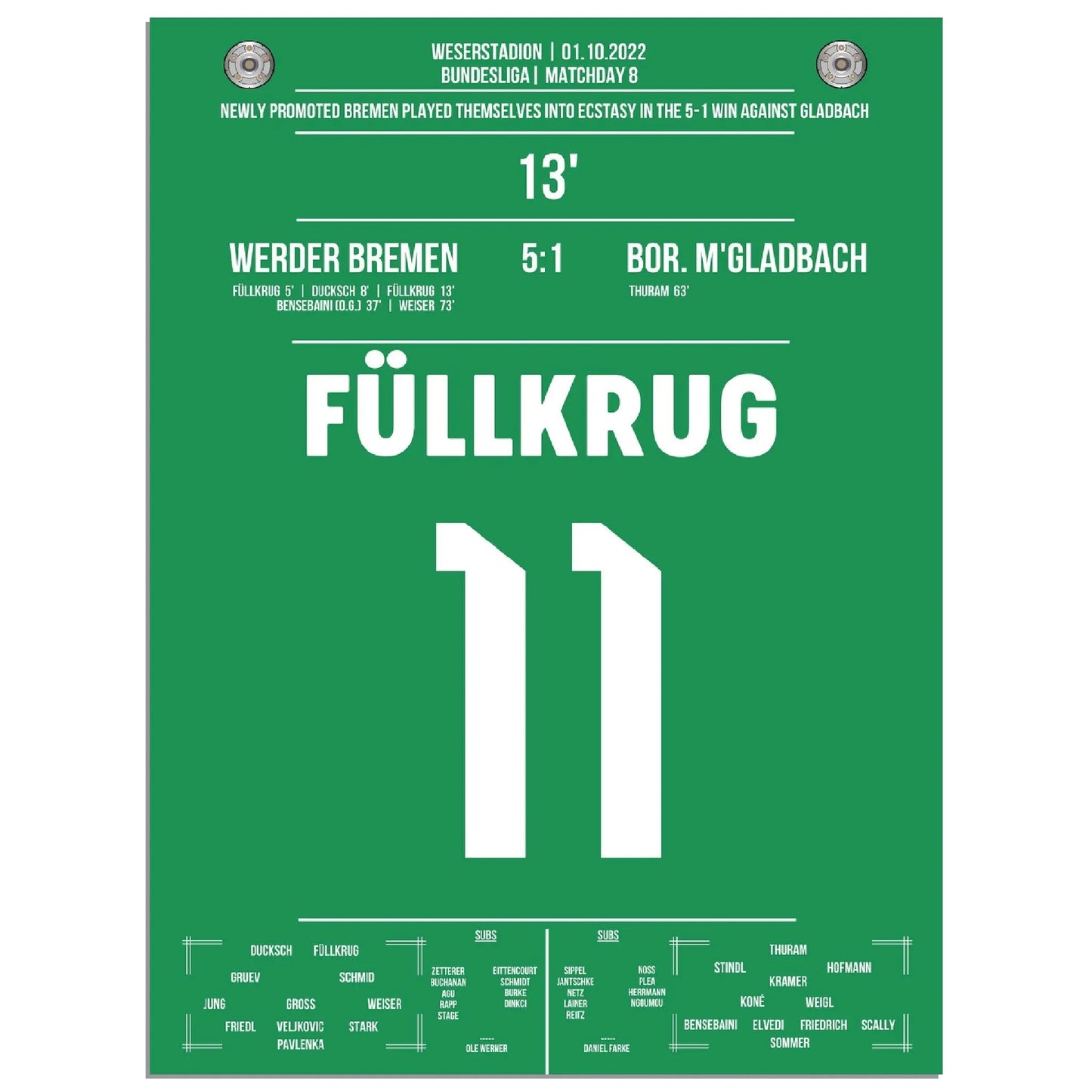 Füllkrug erzielt in der 13. Minute sein zweites Tor und komplettiert damit seinen Doppelpack. Mit diesen Treffern führt er Bremen zu einem souveränen Sieg – ein unvergesslicher Auftritt!