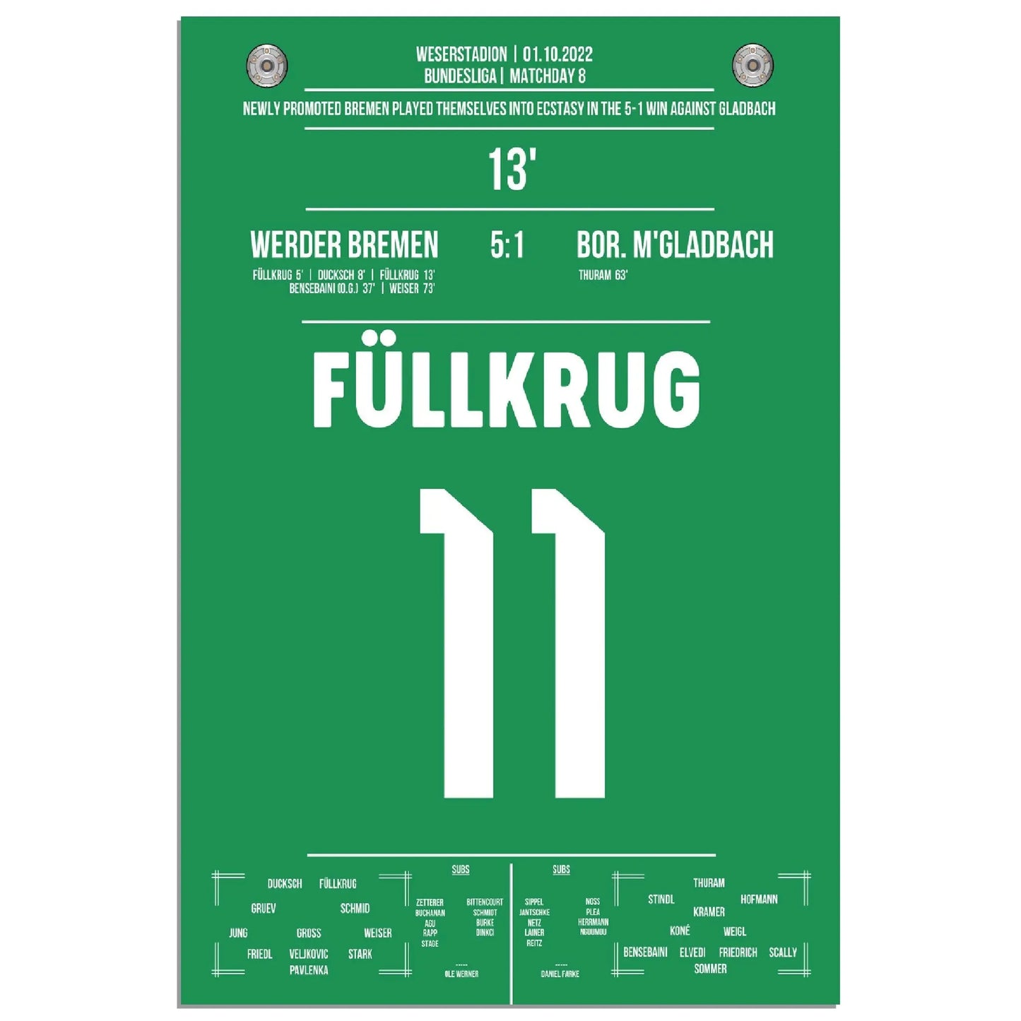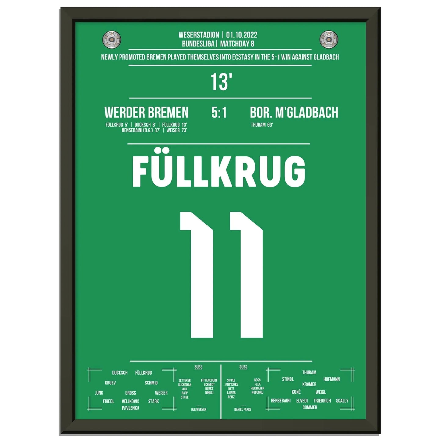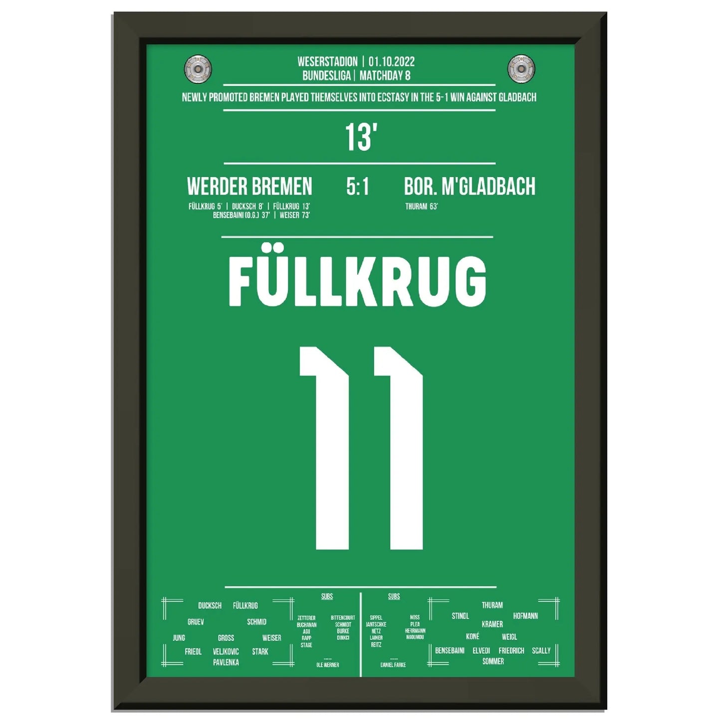 Füllkrug erzielt in der 13. Minute sein zweites Tor und komplettiert damit seinen Doppelpack. Mit diesen Treffern führt er Bremen zu einem souveränen Sieg – ein unvergesslicher Auftritt!