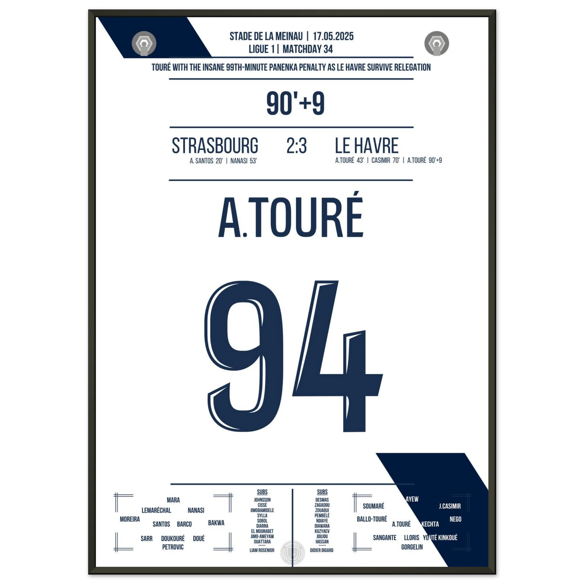 17. Mai 2025 – Strasbourg vs. Le Havre 2:3: In einem atemberaubenden Abstiegskrimi sorgt Touré in der 99. Minute für den Schockmoment im Stade de la Meinau. Sein Last-Minute Elfmeter im Panenka-Stil sichert Le Havre den Klassenerhalt – und schreibt sich in die Geschichtsbücher ein. Unser Poster fängt diesen dramatischen Schlusspunkt in voller Emotion ein.