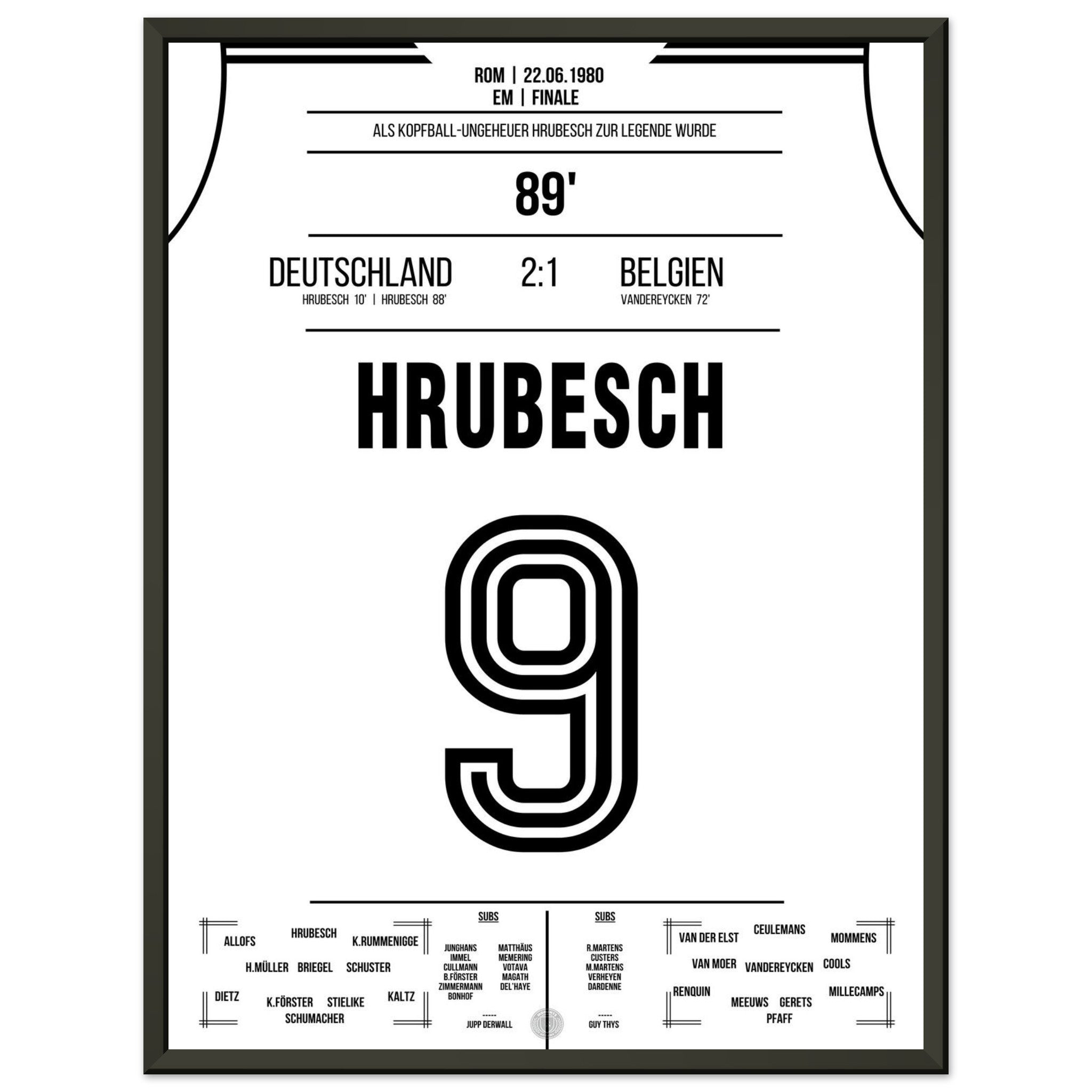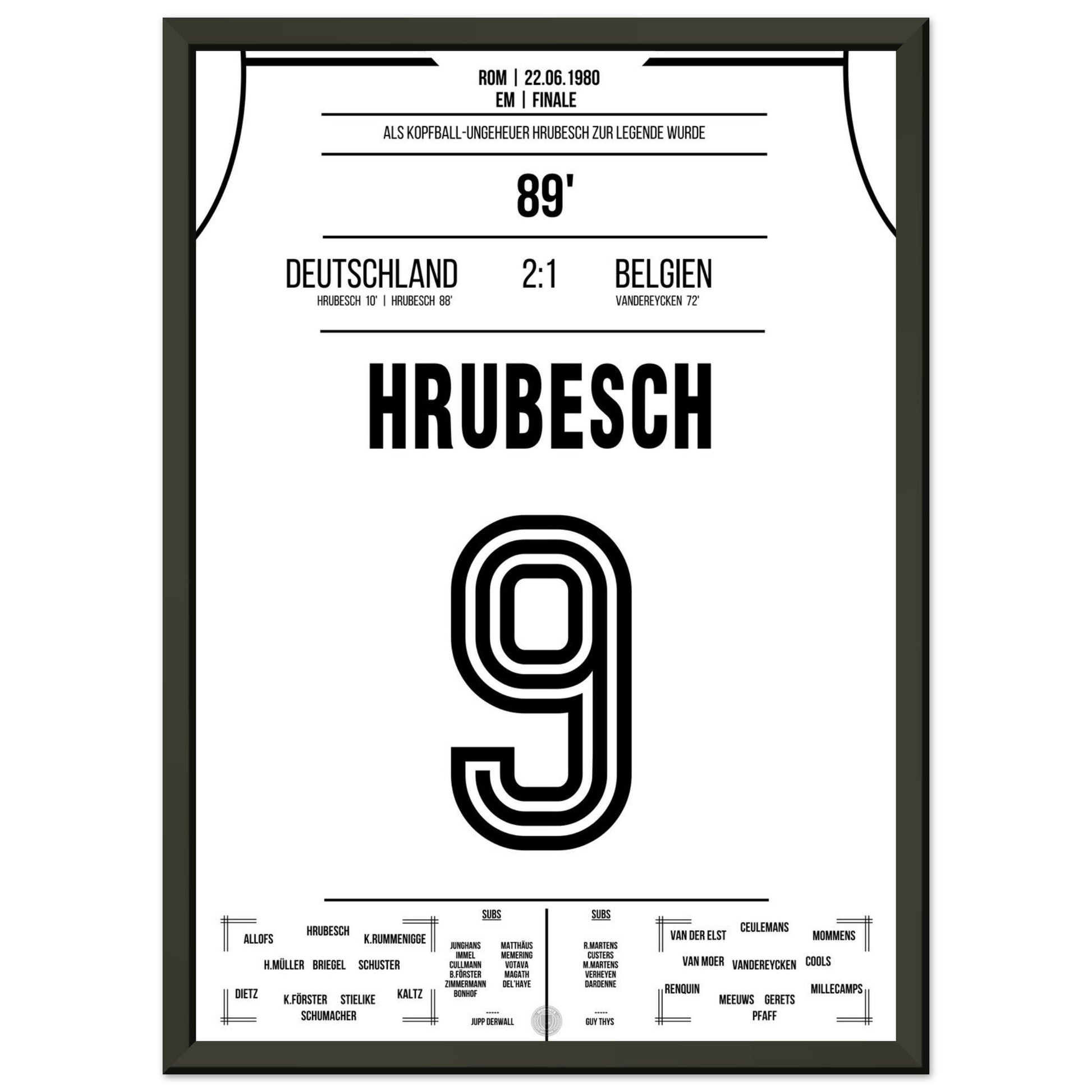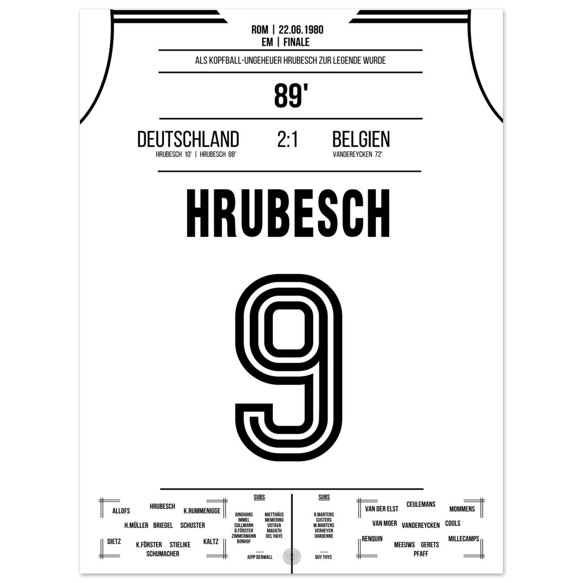 22. Juni 1980 – Deutschland vs. Belgien 2:1: Horst Hrubesch wird im EM-Finale zum Matchwinner – mit zwei Toren, darunter der entscheidende Kopfballtreffer in der 88. Minute, sichert er Deutschland den Titel. Unser Poster fängt diesen goldenen Moment des „Kopfball-Ungeheuers“ für die Ewigkeit ein.