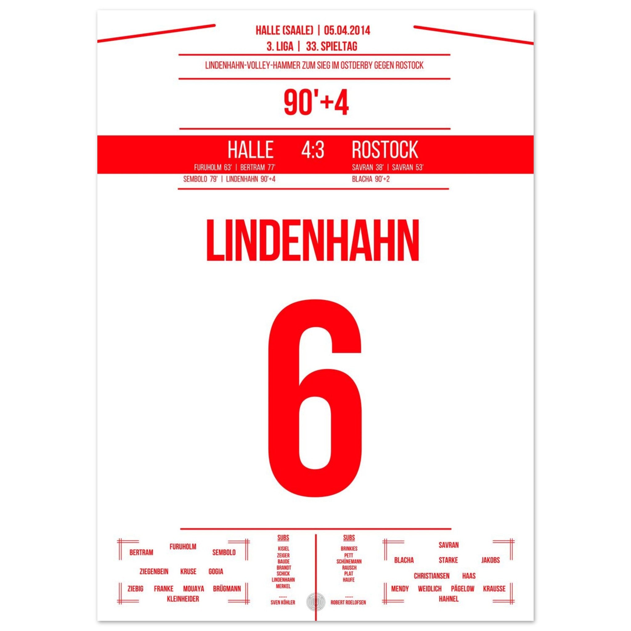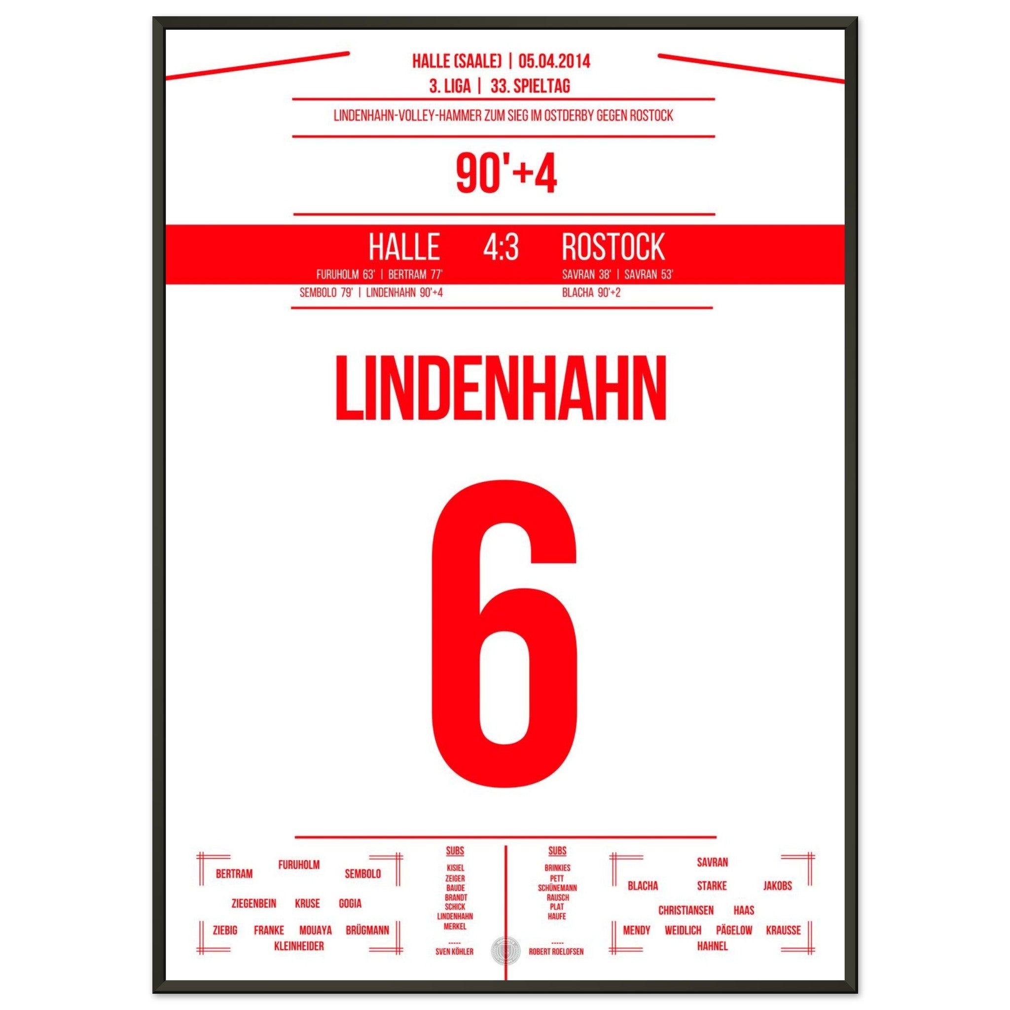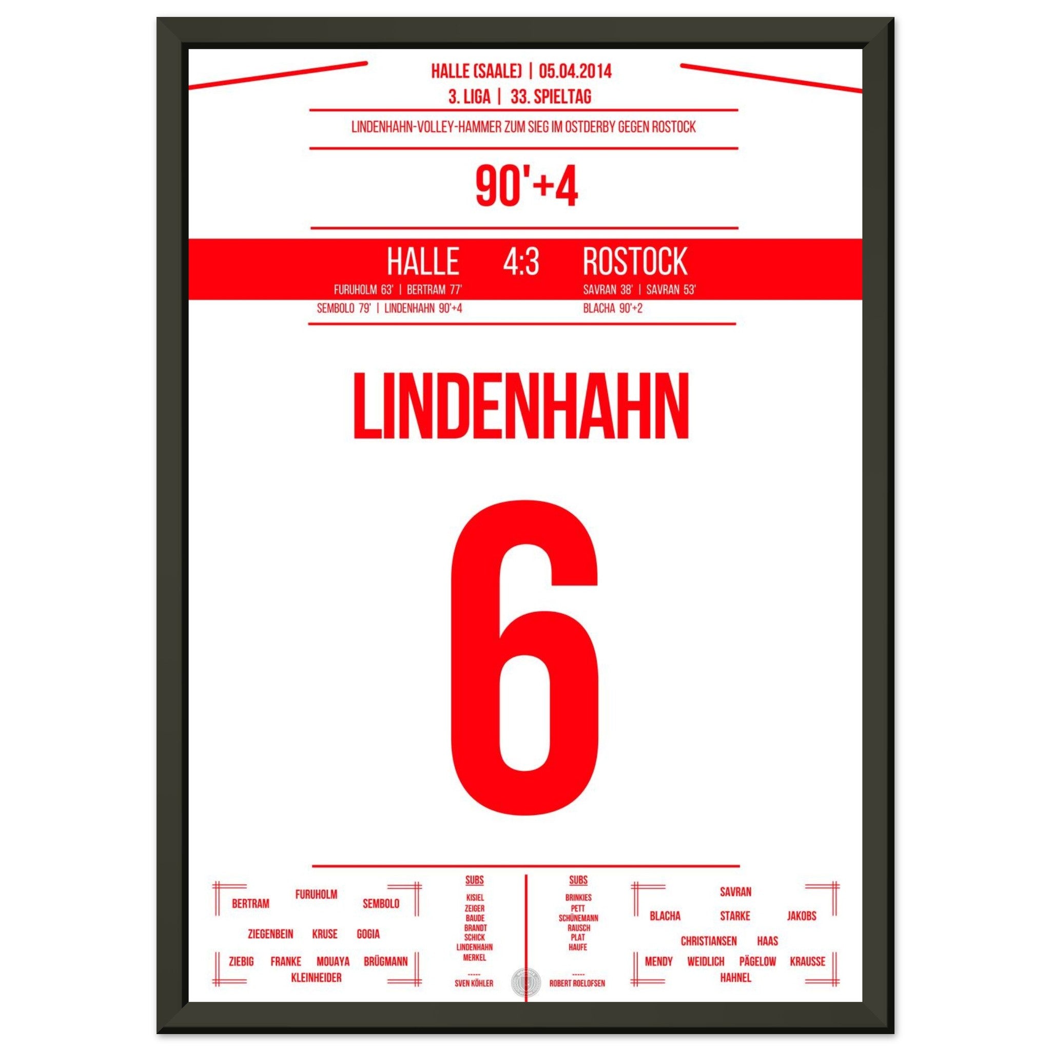 05. April 2014 – Halle vs. Rostock 4:3: In der 94. Minute trifft Toni Lindenhahn per Traumtor und sichert Halle am 33. Spieltag den Sieg im Ostderby in der 3. Liga. Ein emotionaler Gänsehautmoment, der das Stadion explodieren lässt. Unser Poster fängt diesen Treffer für alle Zeiten ein.