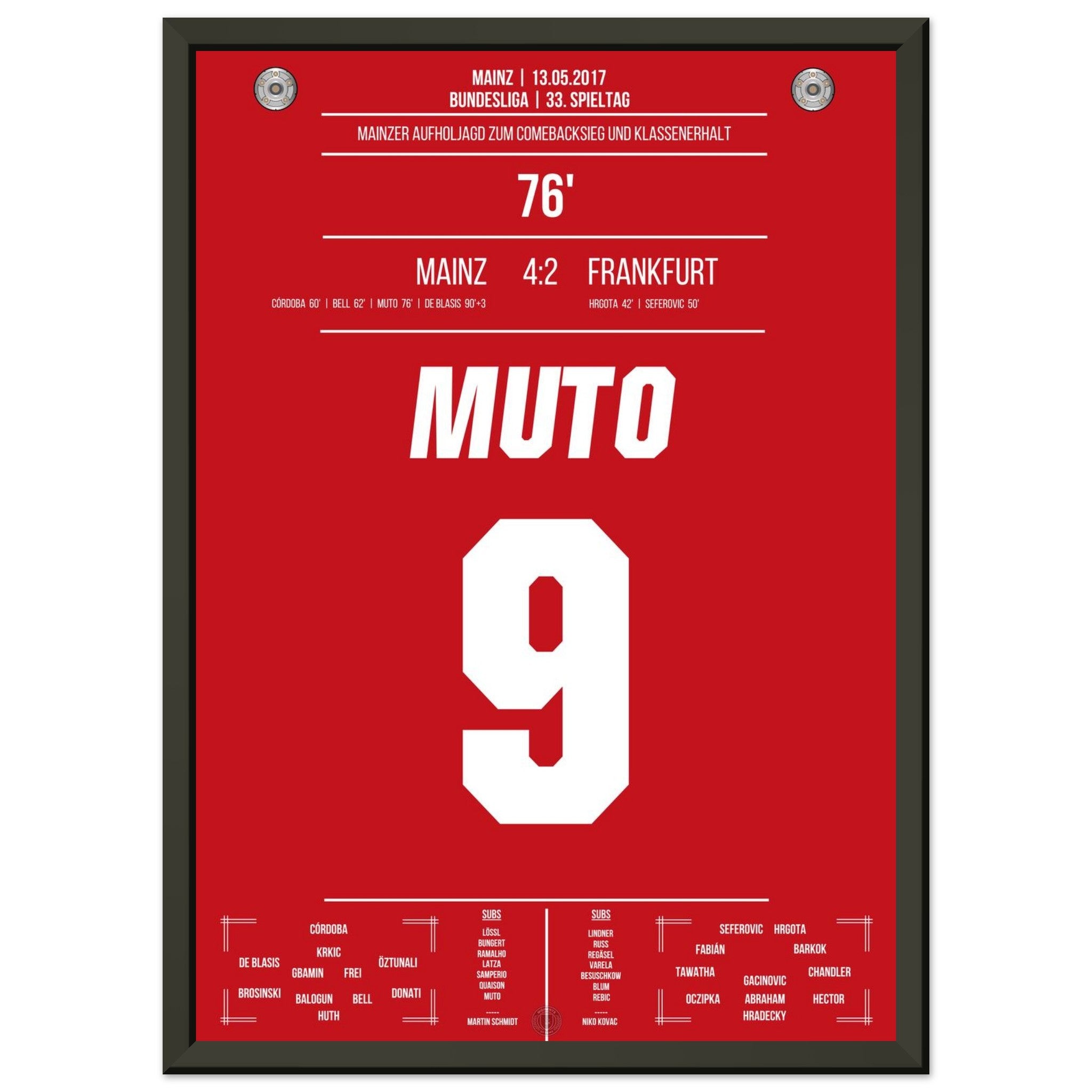 13. Mai 2017 – Mainz vs. Frankfurt 4:2: Nach einem 0:2-Rückstand dreht Mainz das Spiel im Abstiegskampf mit unbändigem Willen – und Muto trifft in der 76. Minute zum 3:2 und bringt das Stadion zum Beben. Sein Tor krönt die emotionale Aufholjagd und bringt Mainz auf Klassenerhaltskurs. Unser Poster hält diesen entscheidenden Moment voller Leidenschaft fest.
