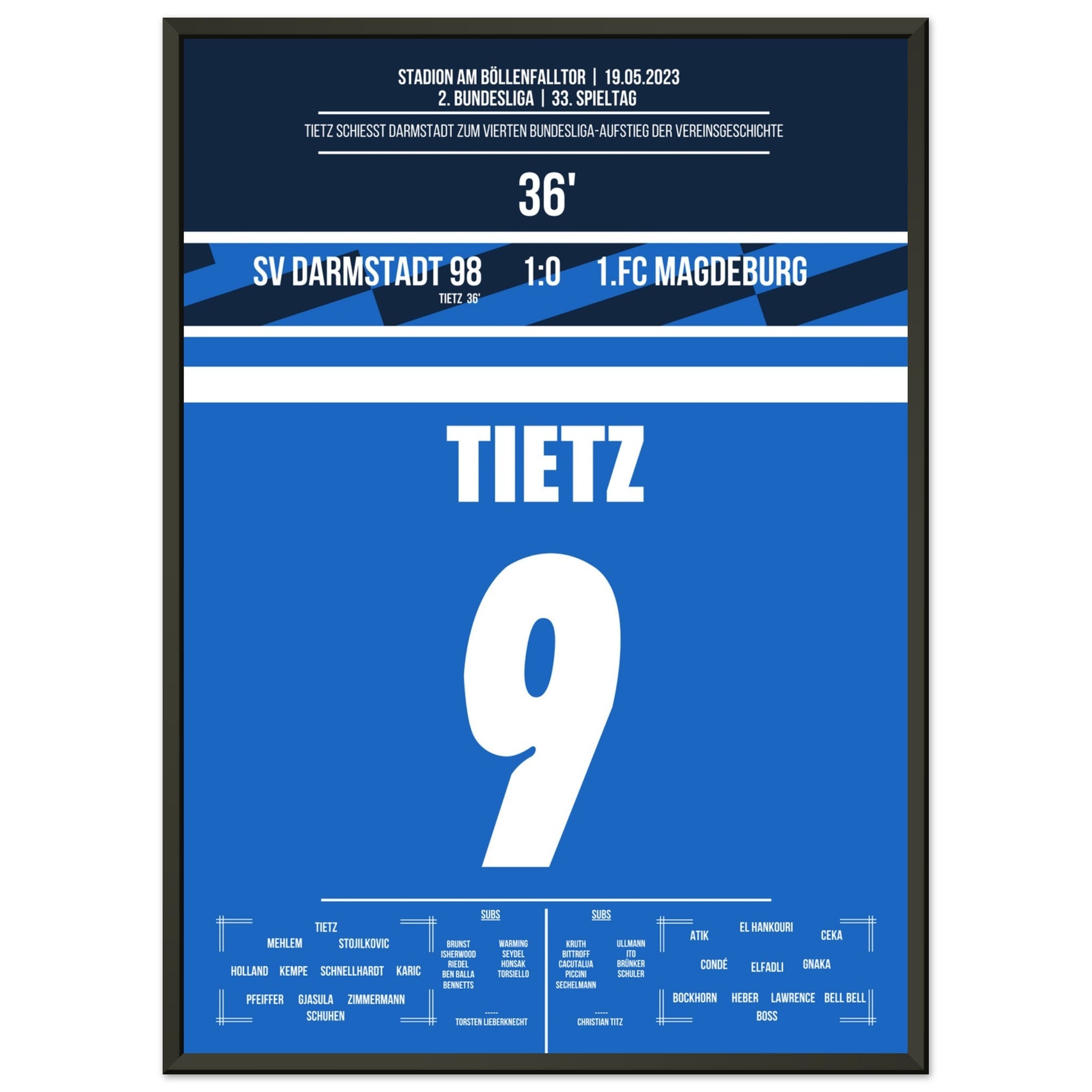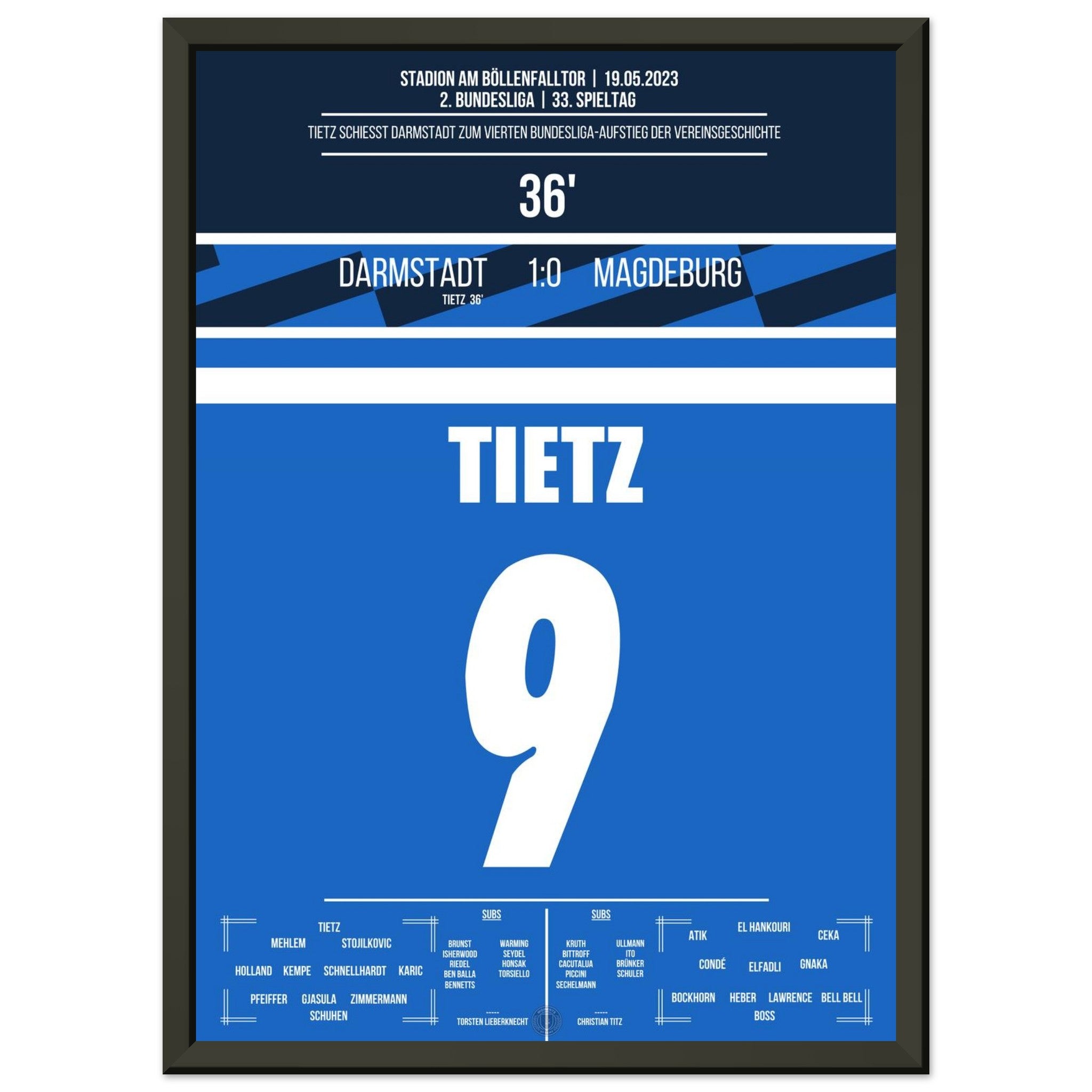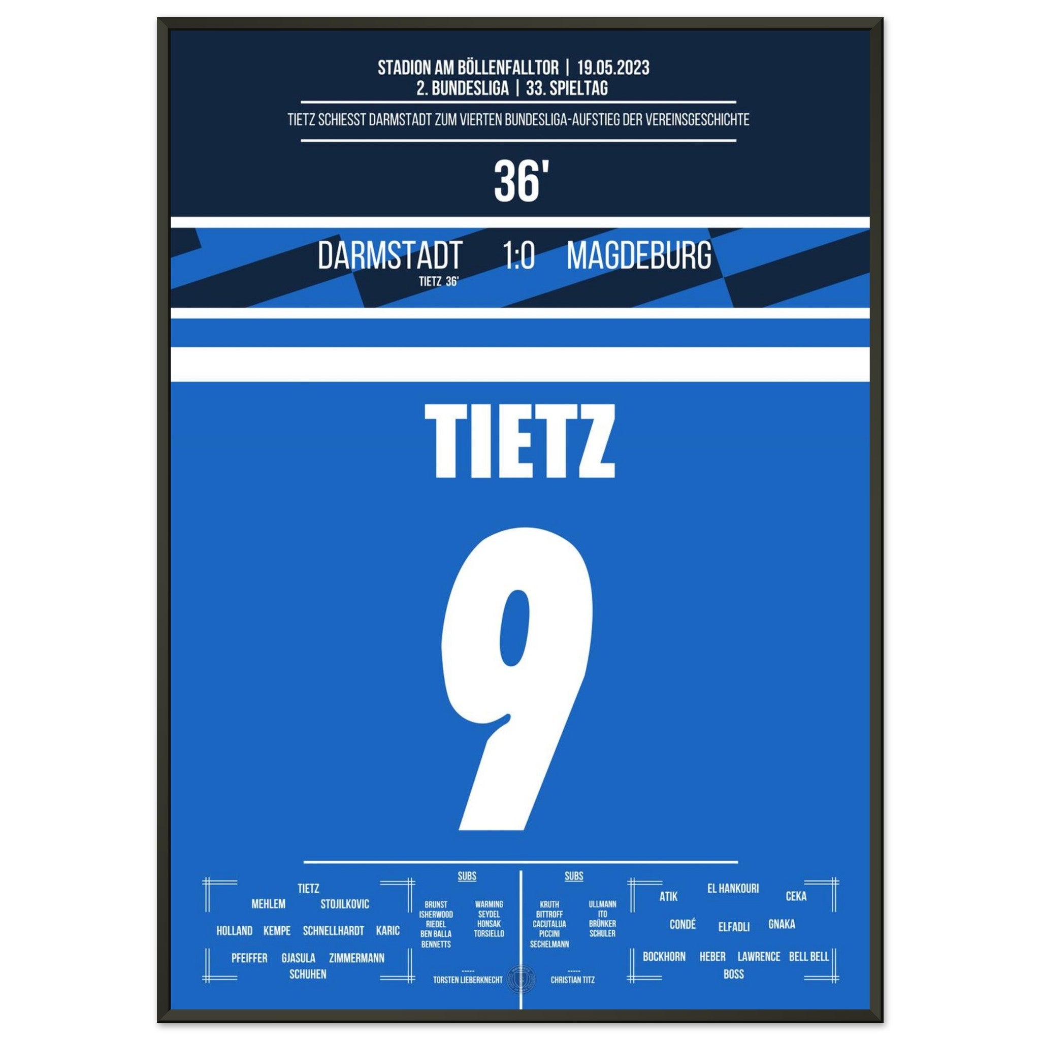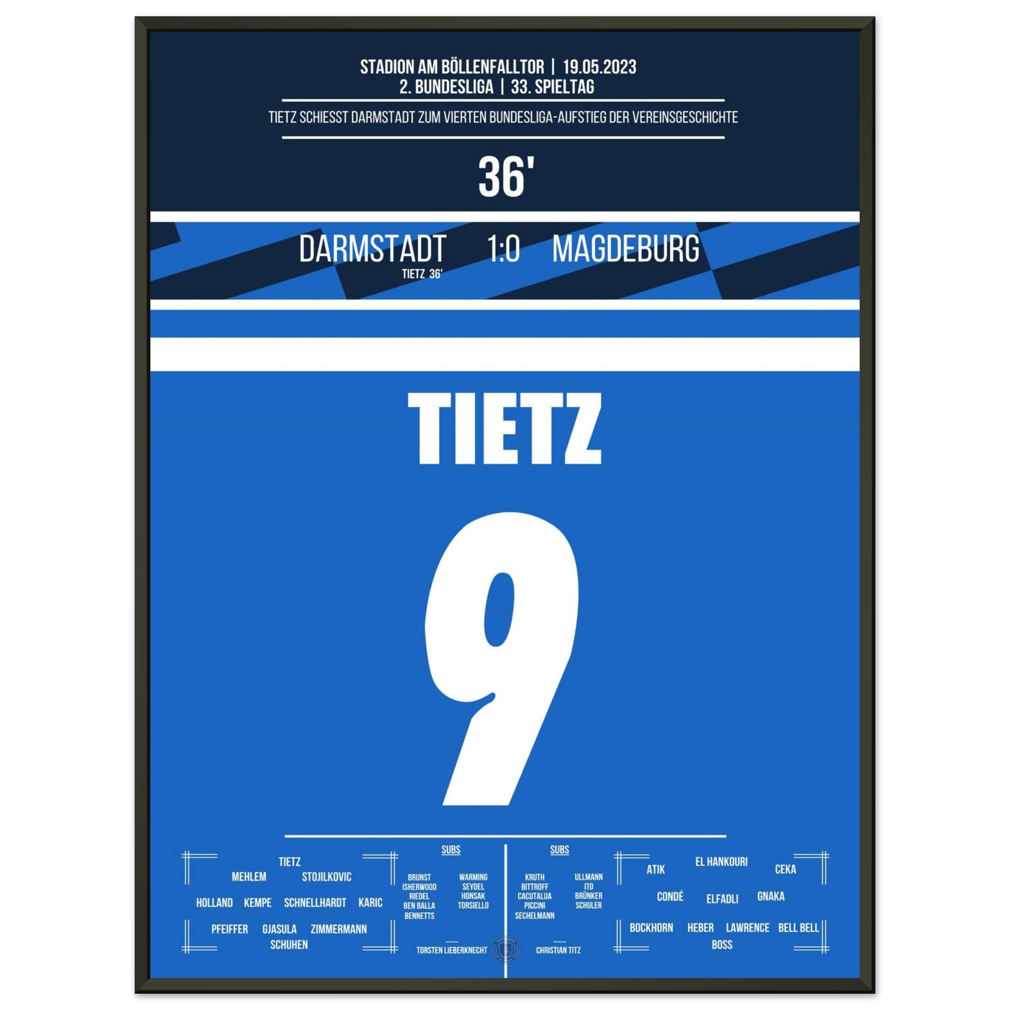 28. Mai 2023 – Darmstadt vs. Magdeburg 1:0: Phillip Tietz trifft am letzten Spieltag der Saison und bringt mit seinem Tor den Aufstieg in die Bundesliga endgültig unter Dach und Fach. Ein perfekter Abschluss einer starken Saison. Unser Poster feiert diesen Aufstiegsmoment in voller Pracht.