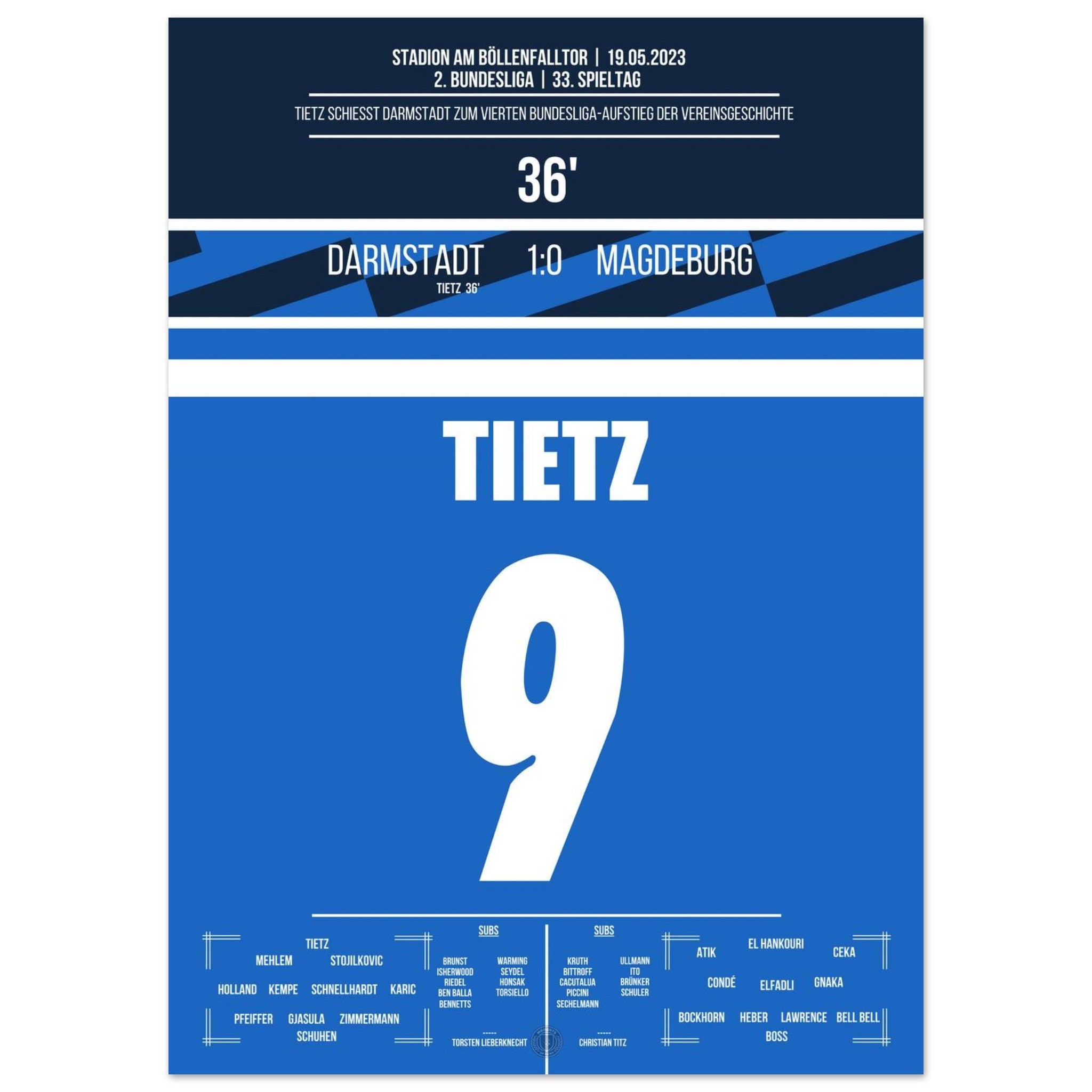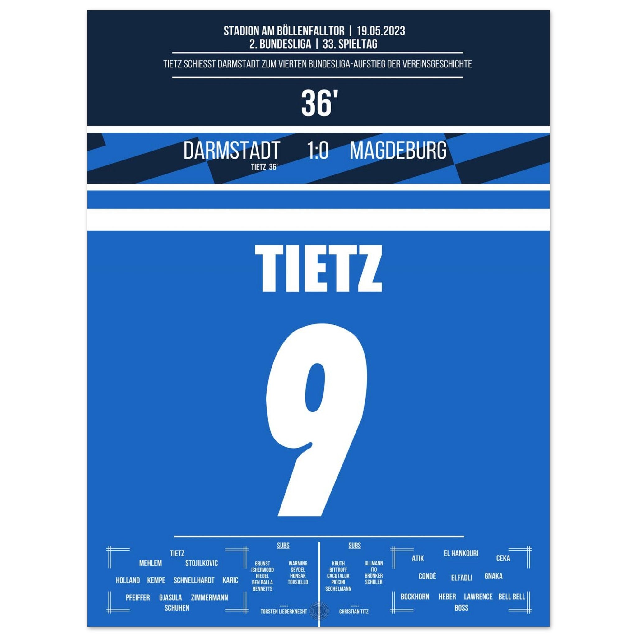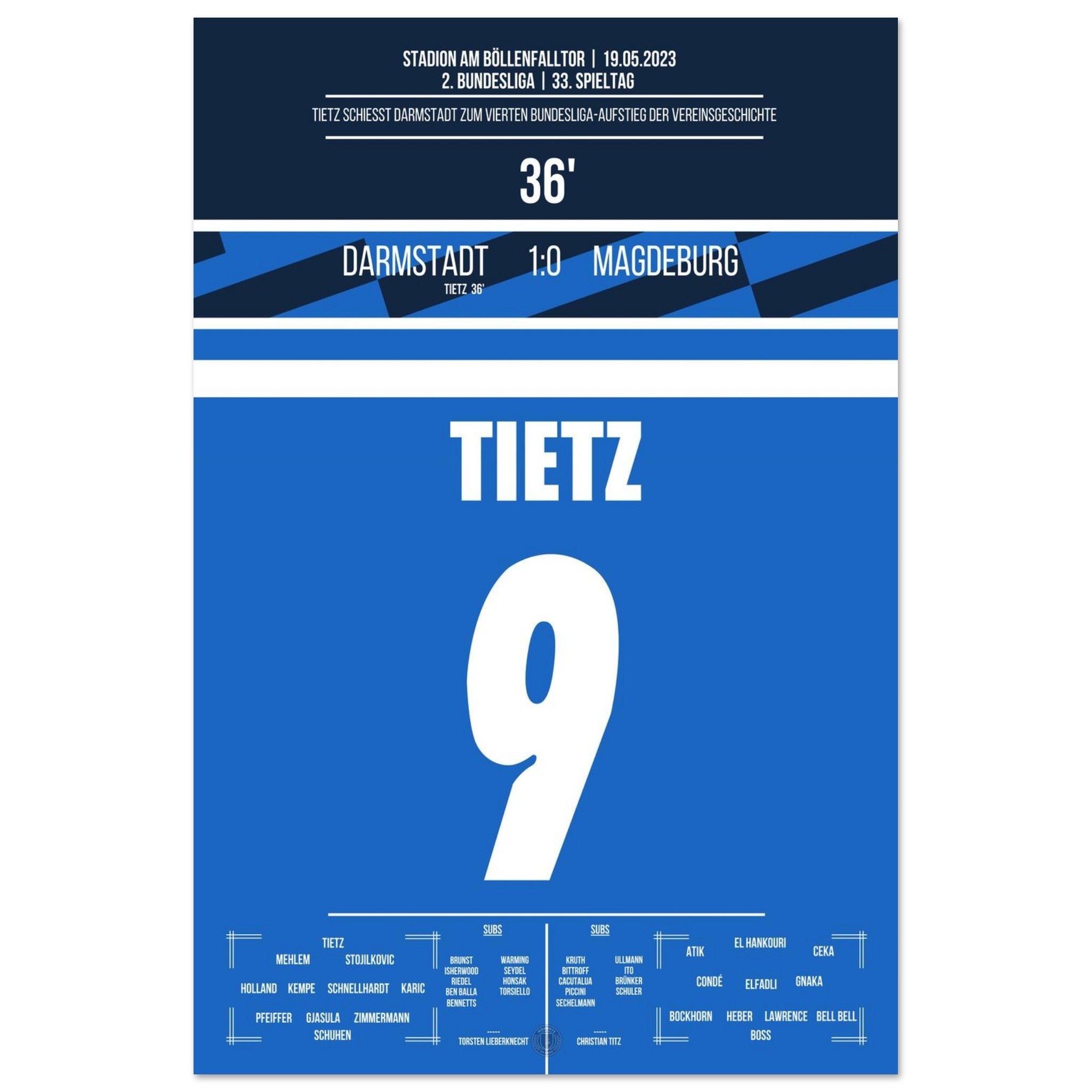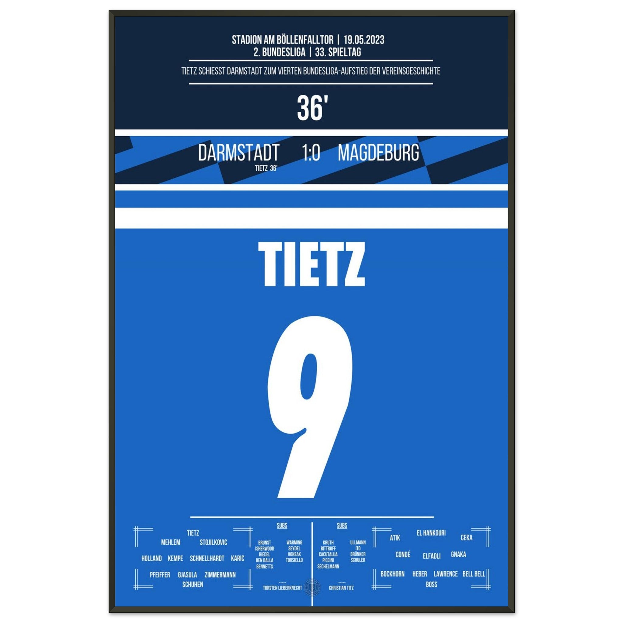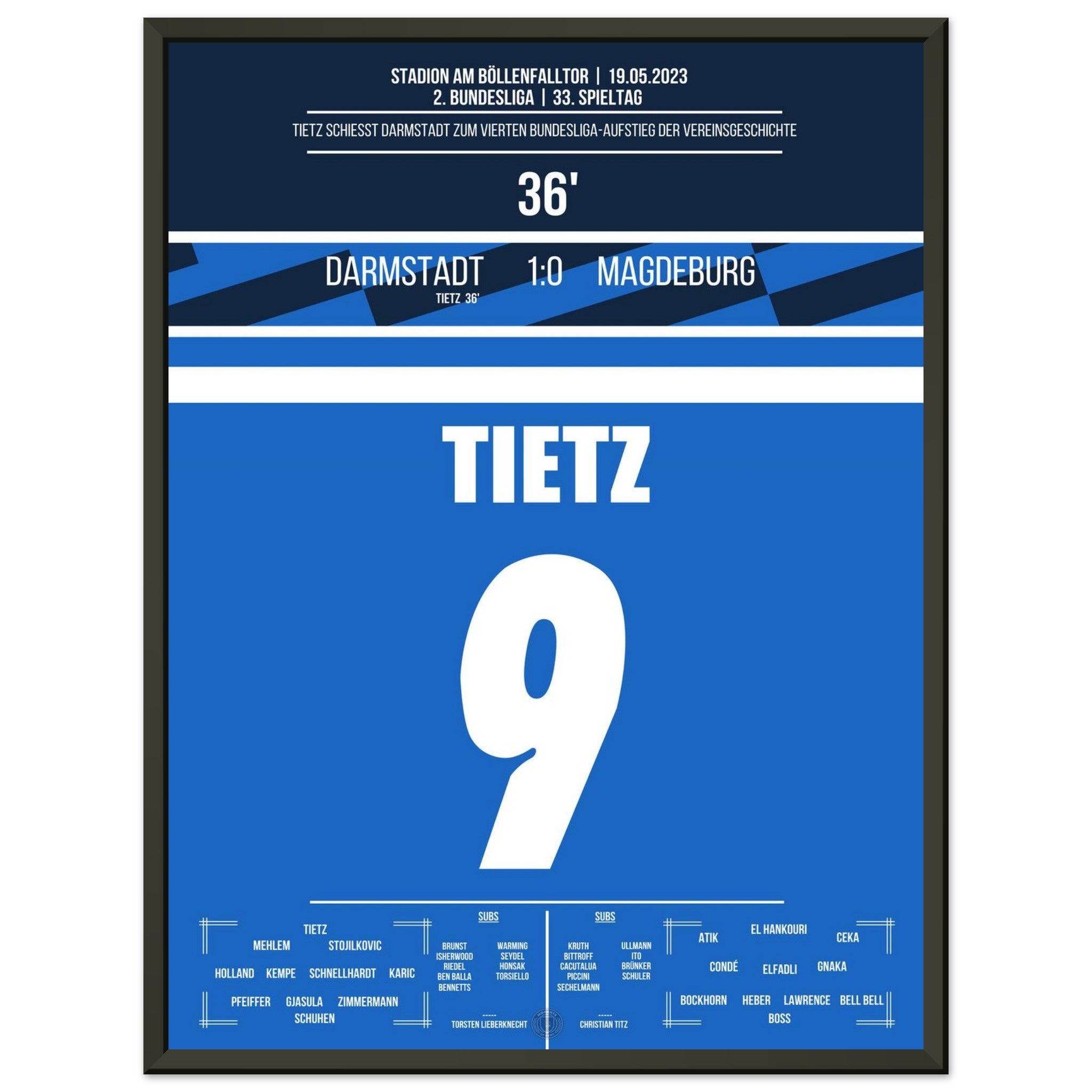 28. Mai 2023 – Darmstadt vs. Magdeburg 1:0: Phillip Tietz trifft am letzten Spieltag der Saison und bringt mit seinem Tor den Aufstieg in die Bundesliga endgültig unter Dach und Fach. Ein perfekter Abschluss einer starken Saison. Unser Poster feiert diesen Aufstiegsmoment in voller Pracht.