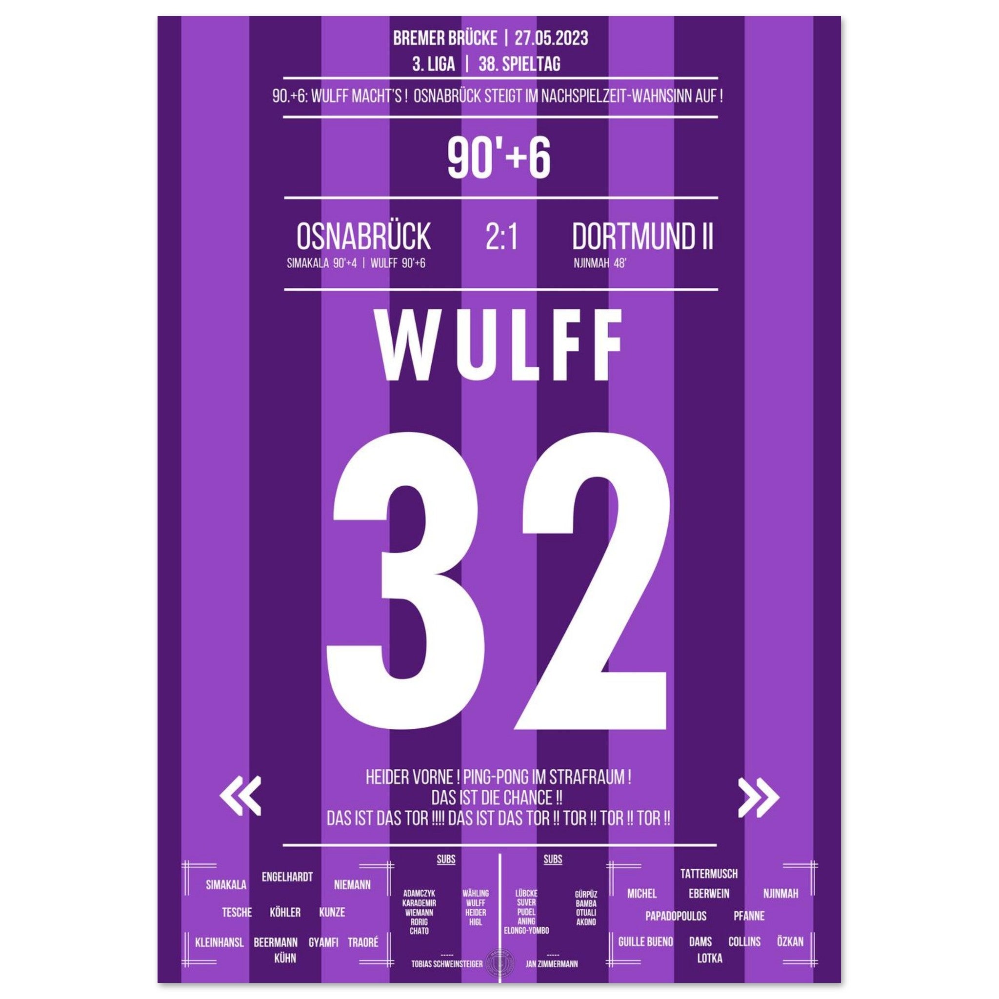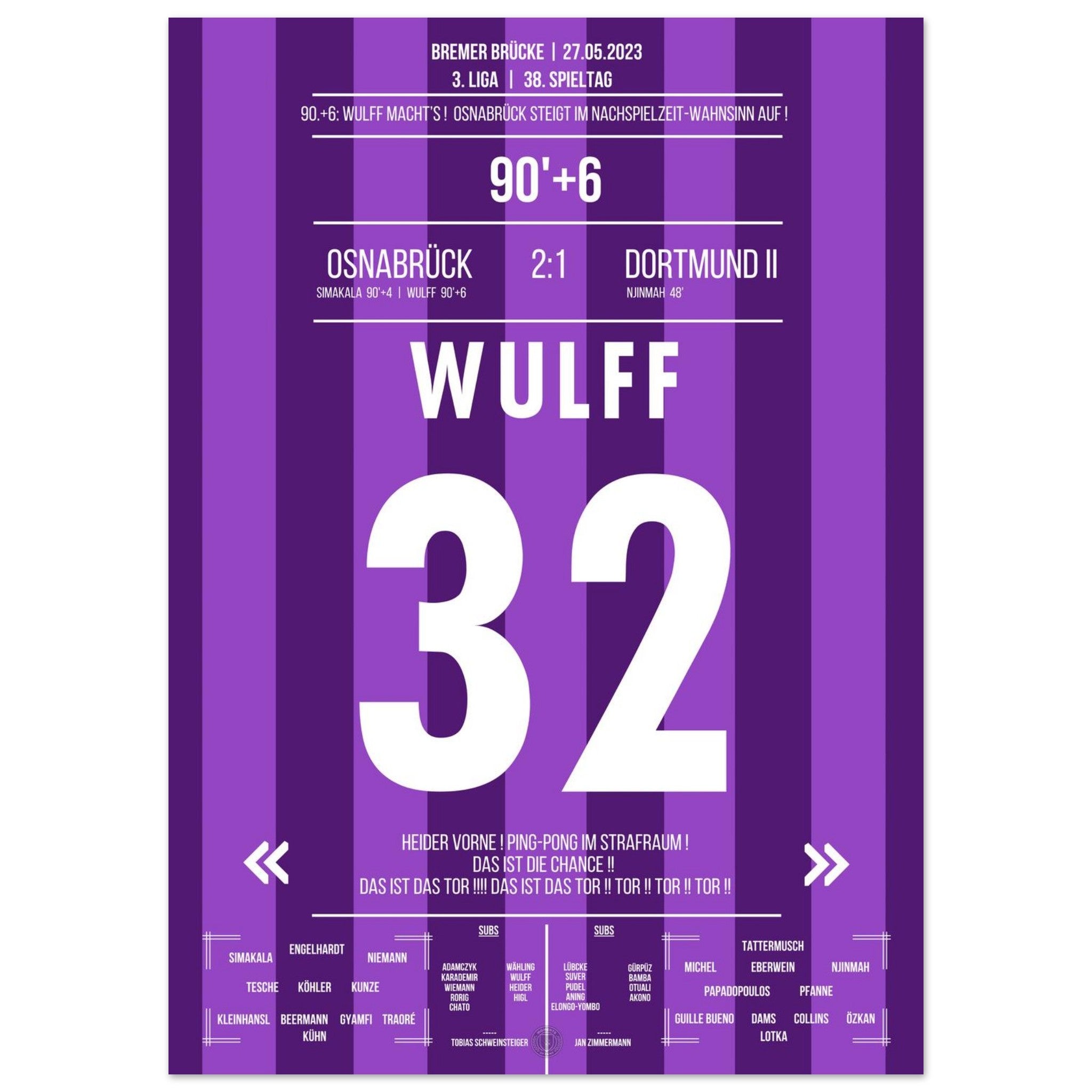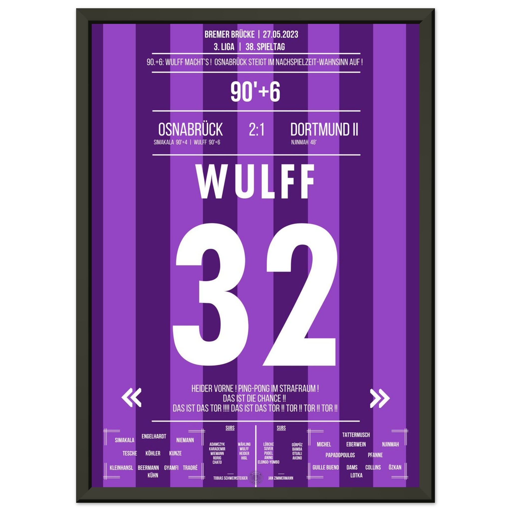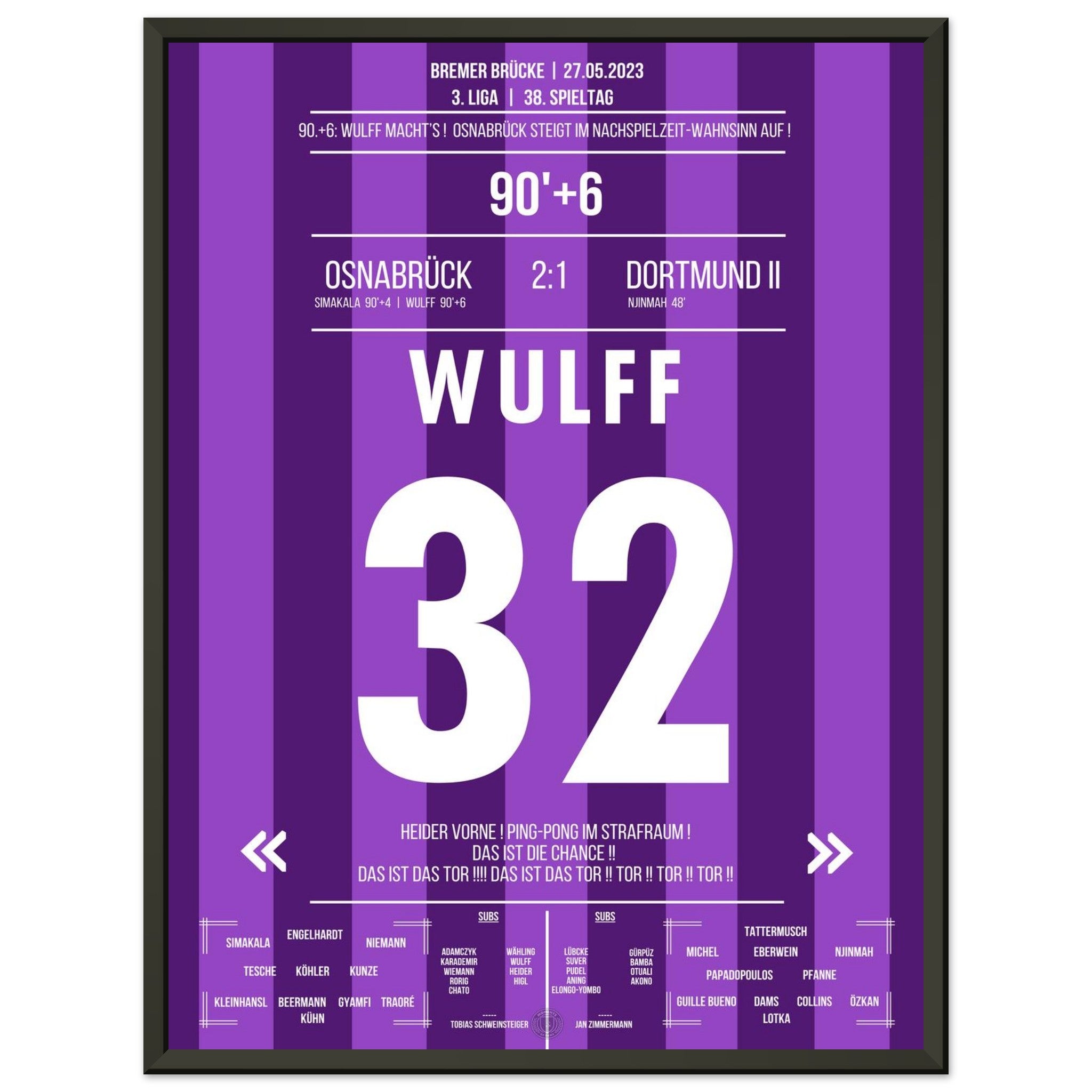 27. Mai 2023 – Osnabrück vs. Dortmund II 2:1: In einem der verrücktesten Saisonfinals der Drittliga-Geschichte dreht Osnabrück das Spiel in der Nachspielzeit – erst trifft Simakala zum Ausgleich, dann sorgt Wulff in der 96. Minute für den Aufstieg. Das Stadion an der Bremer Brücke explodiert vor Emotionen. Unser Poster fängt diesen dramatischen und historischen Fußballmoment ein.