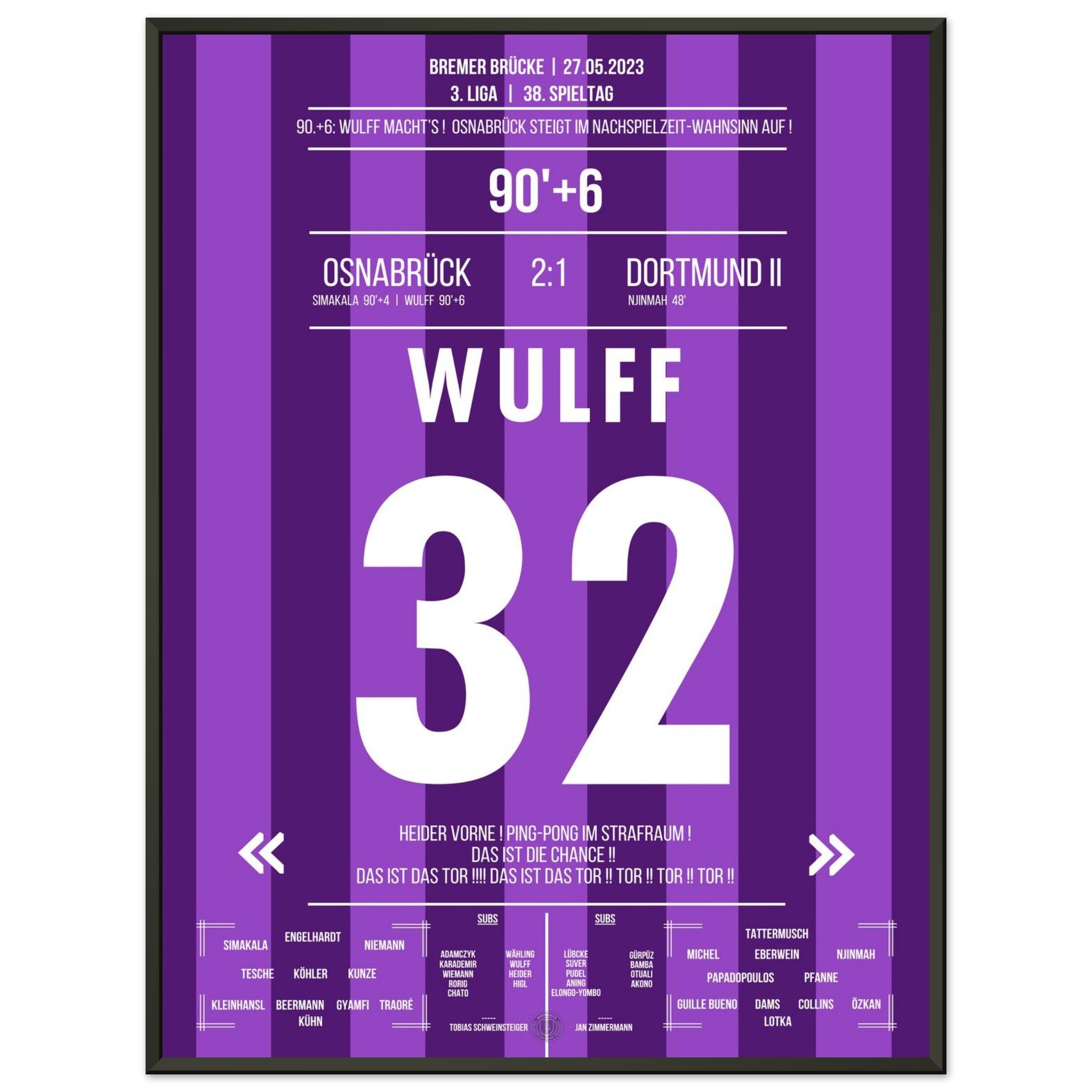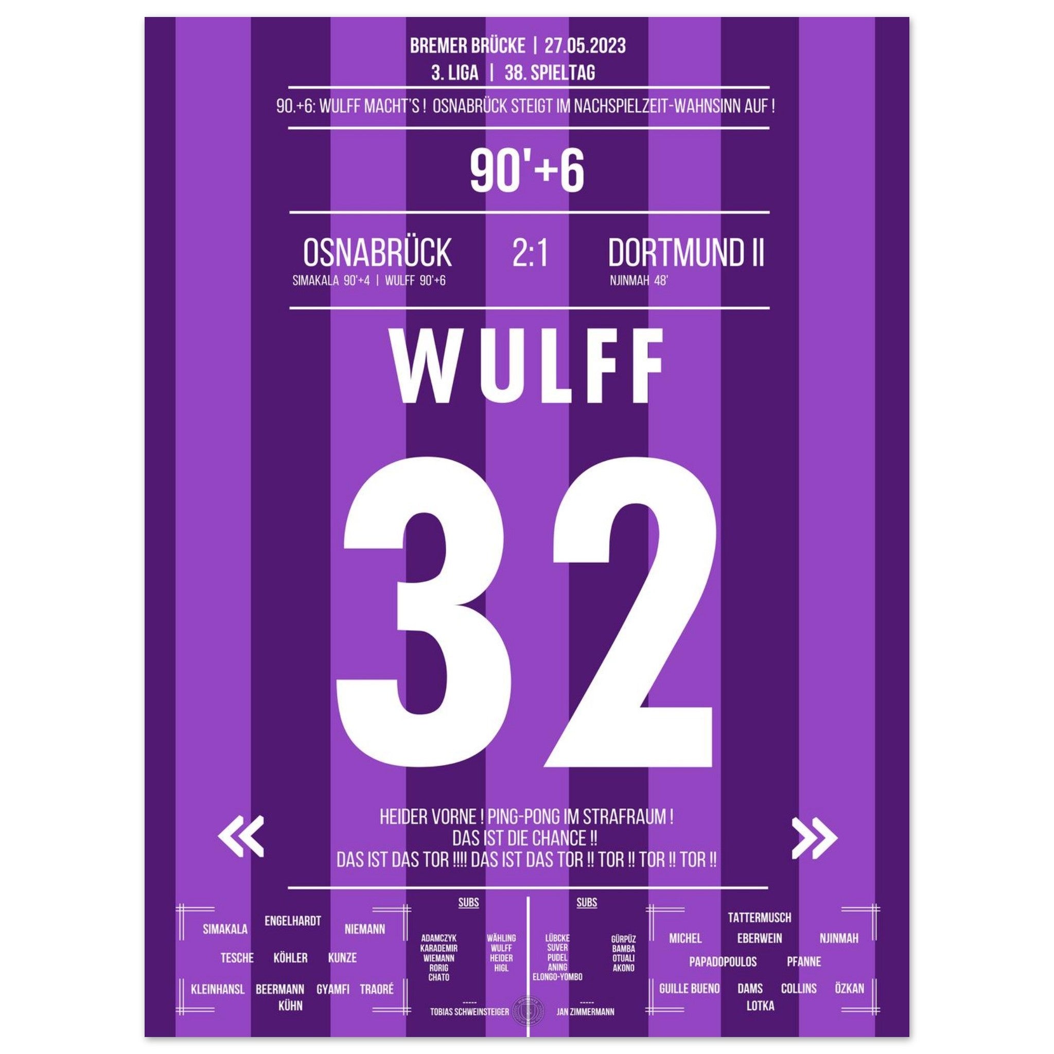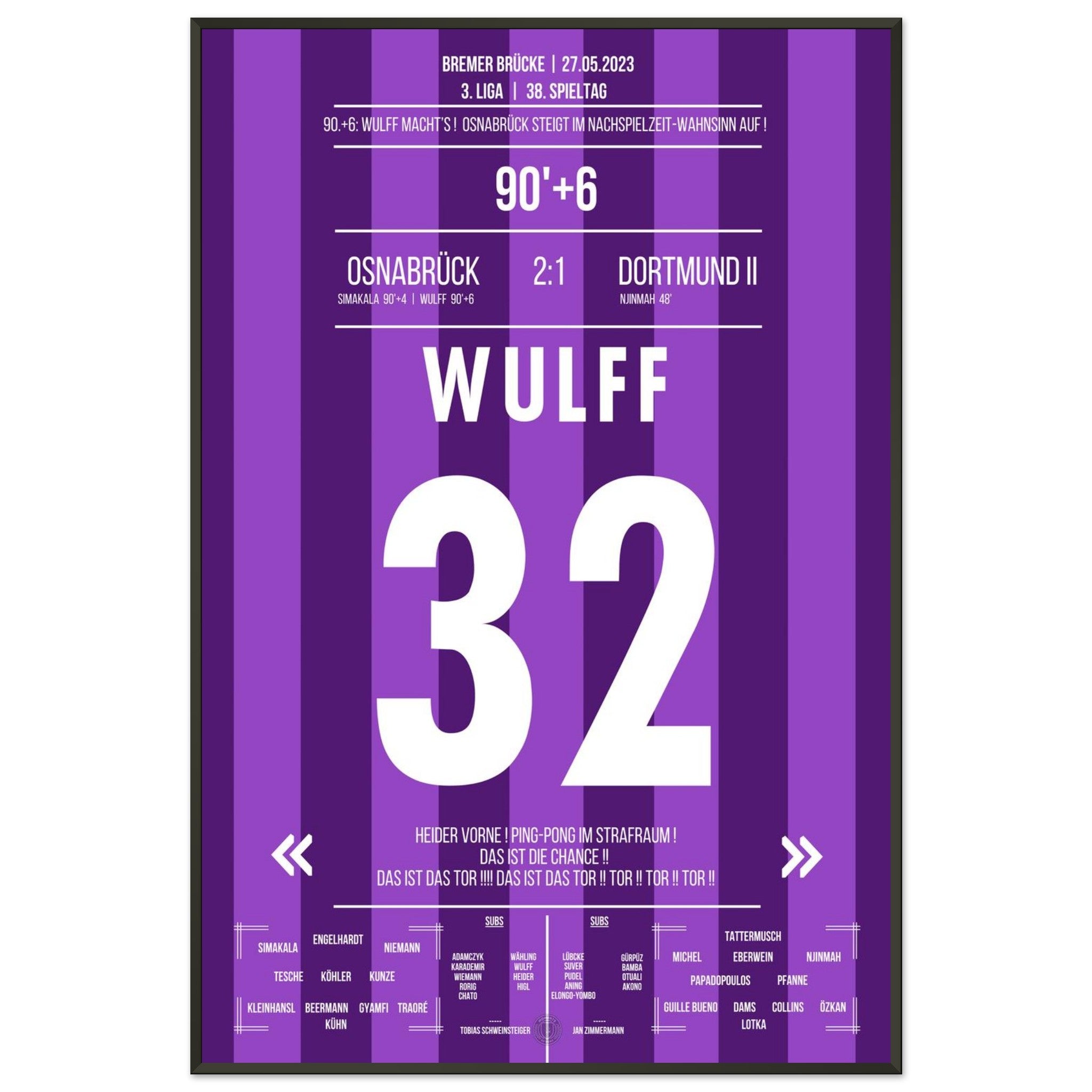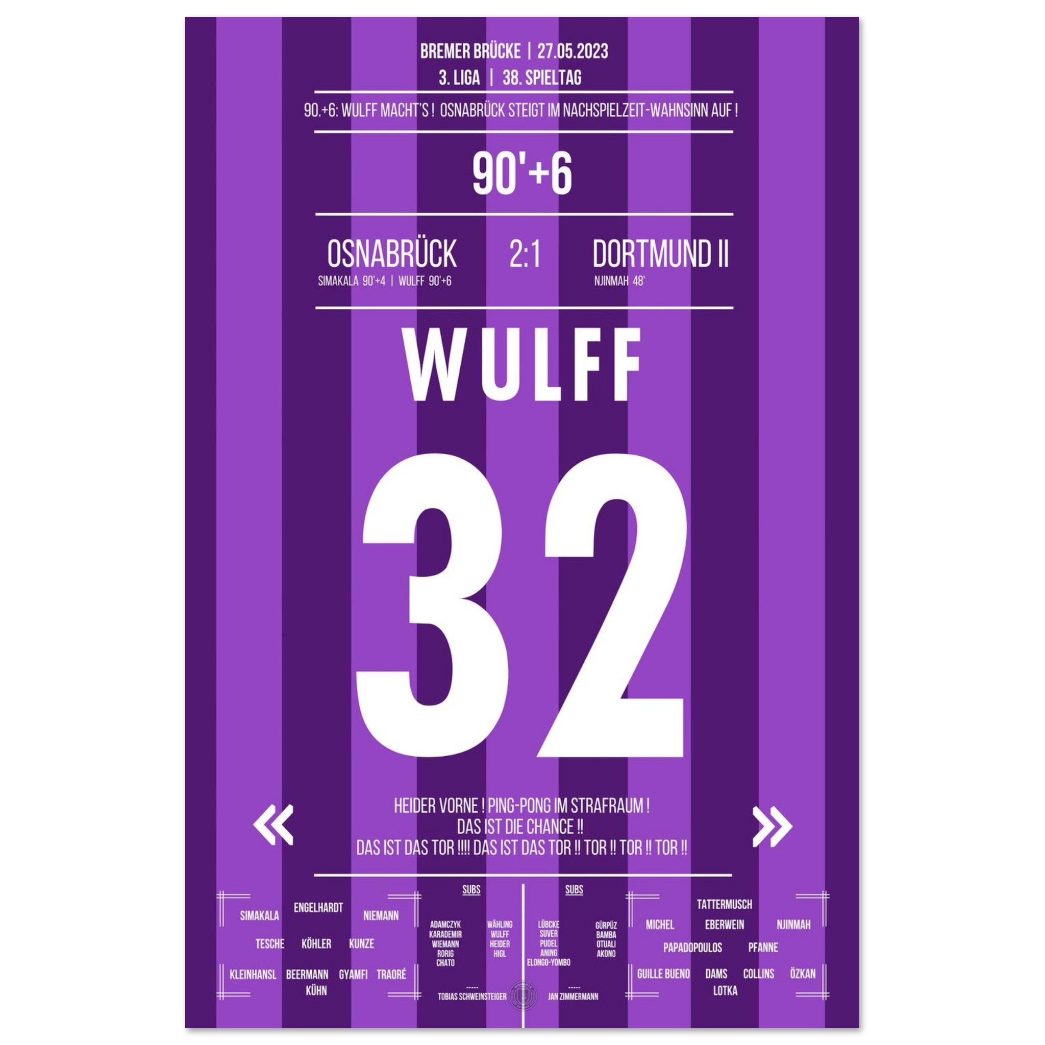 27. Mai 2023 – Osnabrück vs. Dortmund II 2:1: In einem der verrücktesten Saisonfinals der Drittliga-Geschichte dreht Osnabrück das Spiel in der Nachspielzeit – erst trifft Simakala zum Ausgleich, dann sorgt Wulff in der 96. Minute für den Aufstieg. Das Stadion an der Bremer Brücke explodiert vor Emotionen. Unser Poster fängt diesen dramatischen und historischen Fußballmoment ein.
