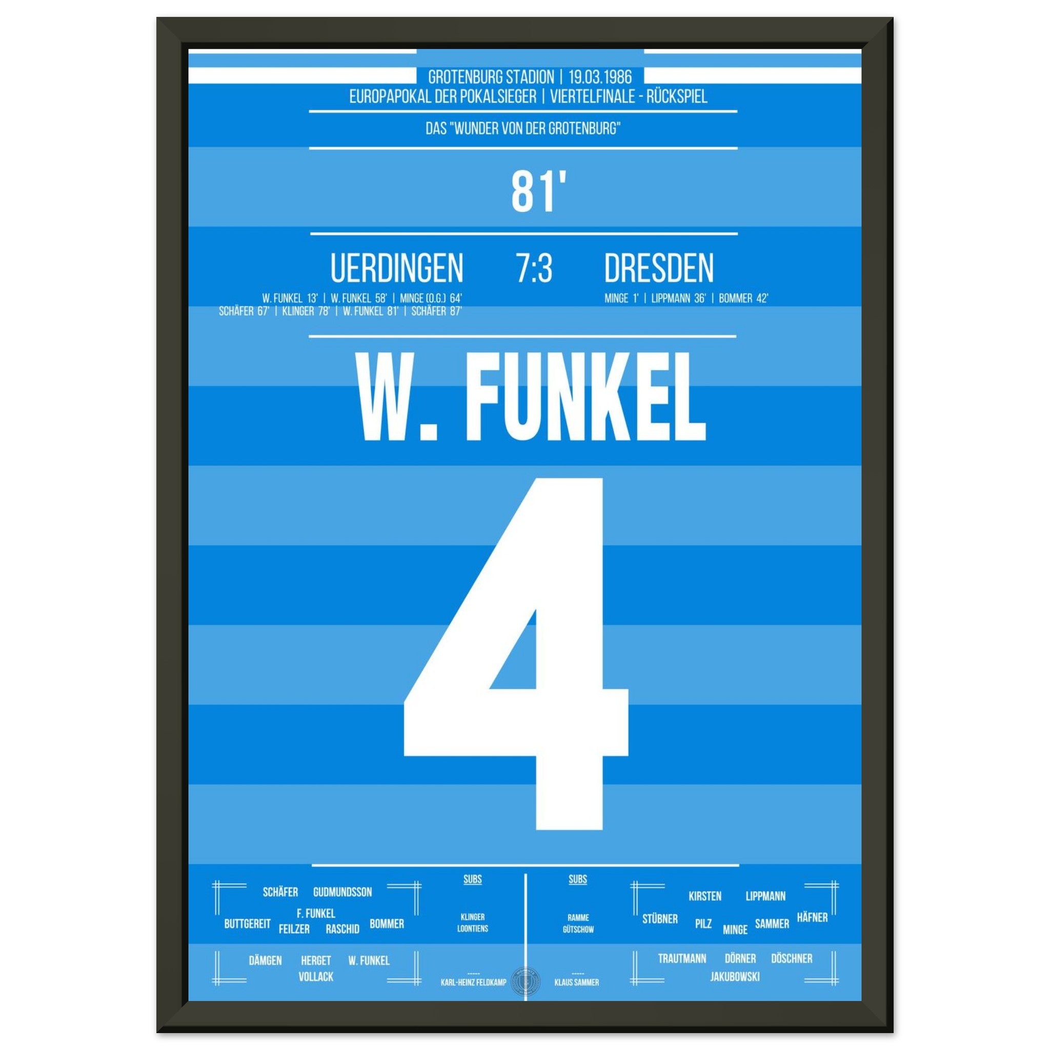 19. März 1986 – Uerdingen vs. Dresden 7:3: Zur Halbzeit scheint alles verloren – Uerdingen liegt 1:3 zurück und steht vor dem Aus im Europapokal. Doch was dann folgt, ist pure Fußballmagie: In einer legendären zweiten Hälfte schießt das Team sechs Tore und dreht das Viertelfinale gegen Dresden spektakulär. Das „Wunder von der Grotenburg“ ist geboren. Unser Poster hält dieses einmalige Kapitel Fußballgeschichte für immer fest.
