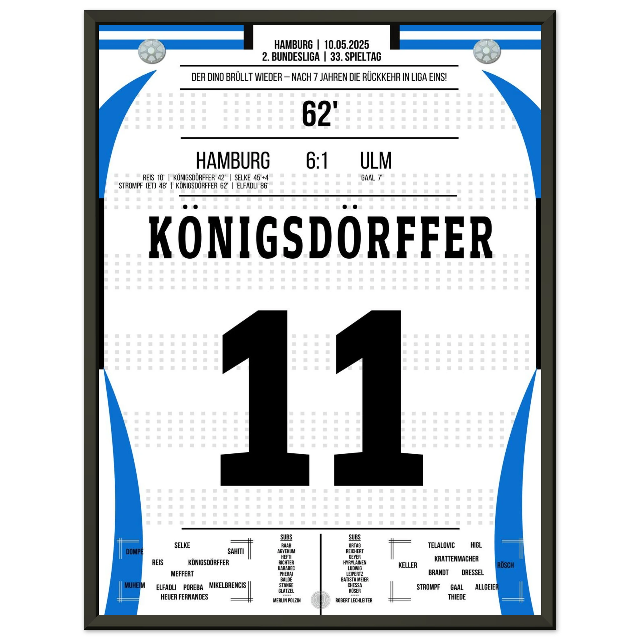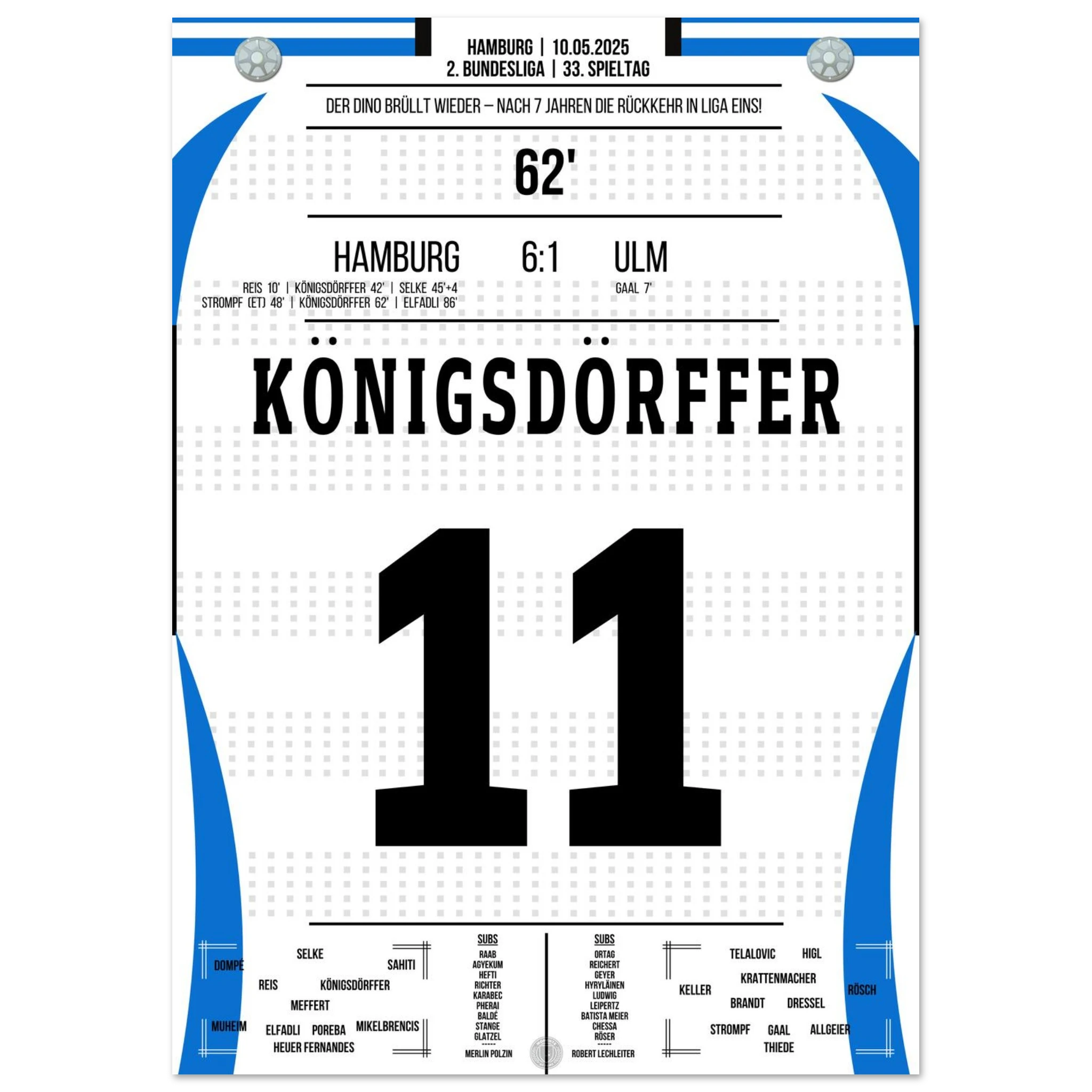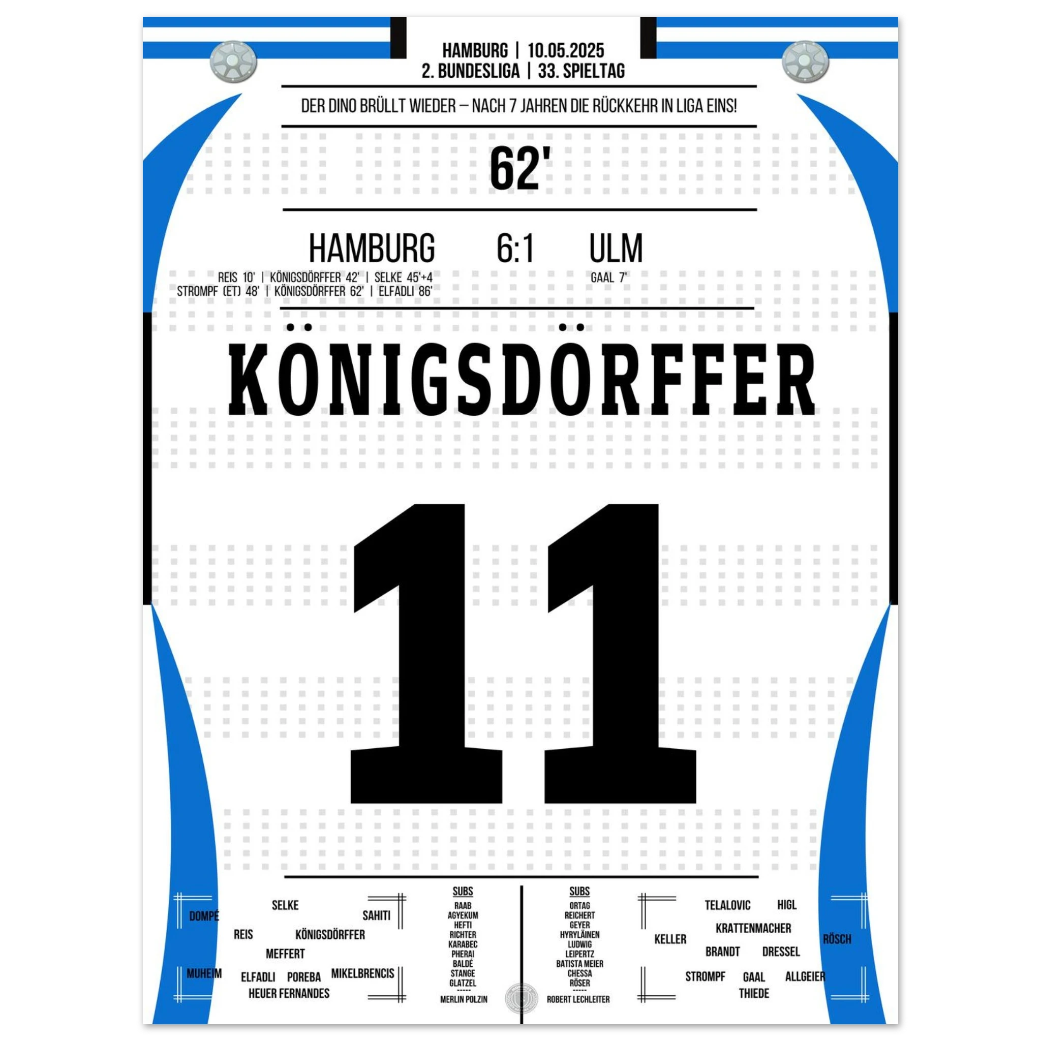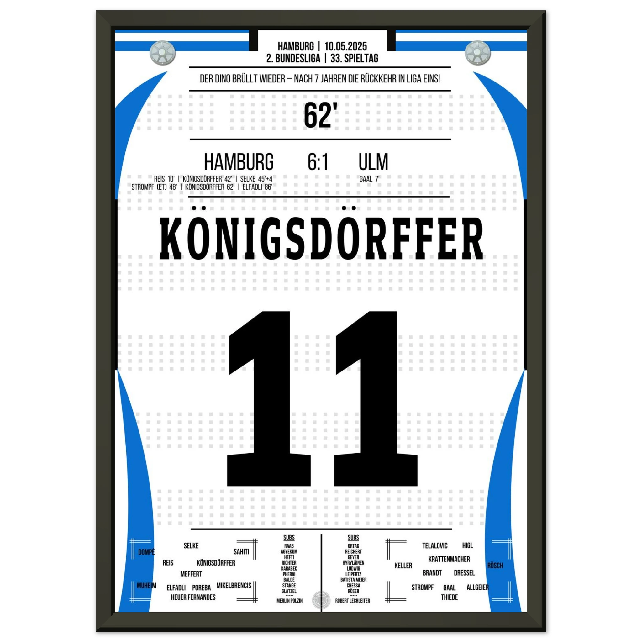 10. Mai 2025 – Hamburg vs. Ulm 6:1: Mit einem furiosen 6:1-Heimsieg und einem Treffer von Königsdörffer krönt sich Hamburg zur Rückkehr in die Bundesliga. Nach Jahren des Wartens ist der Dino zurück – unser Poster zelebriert dieses emotionale Comeback.