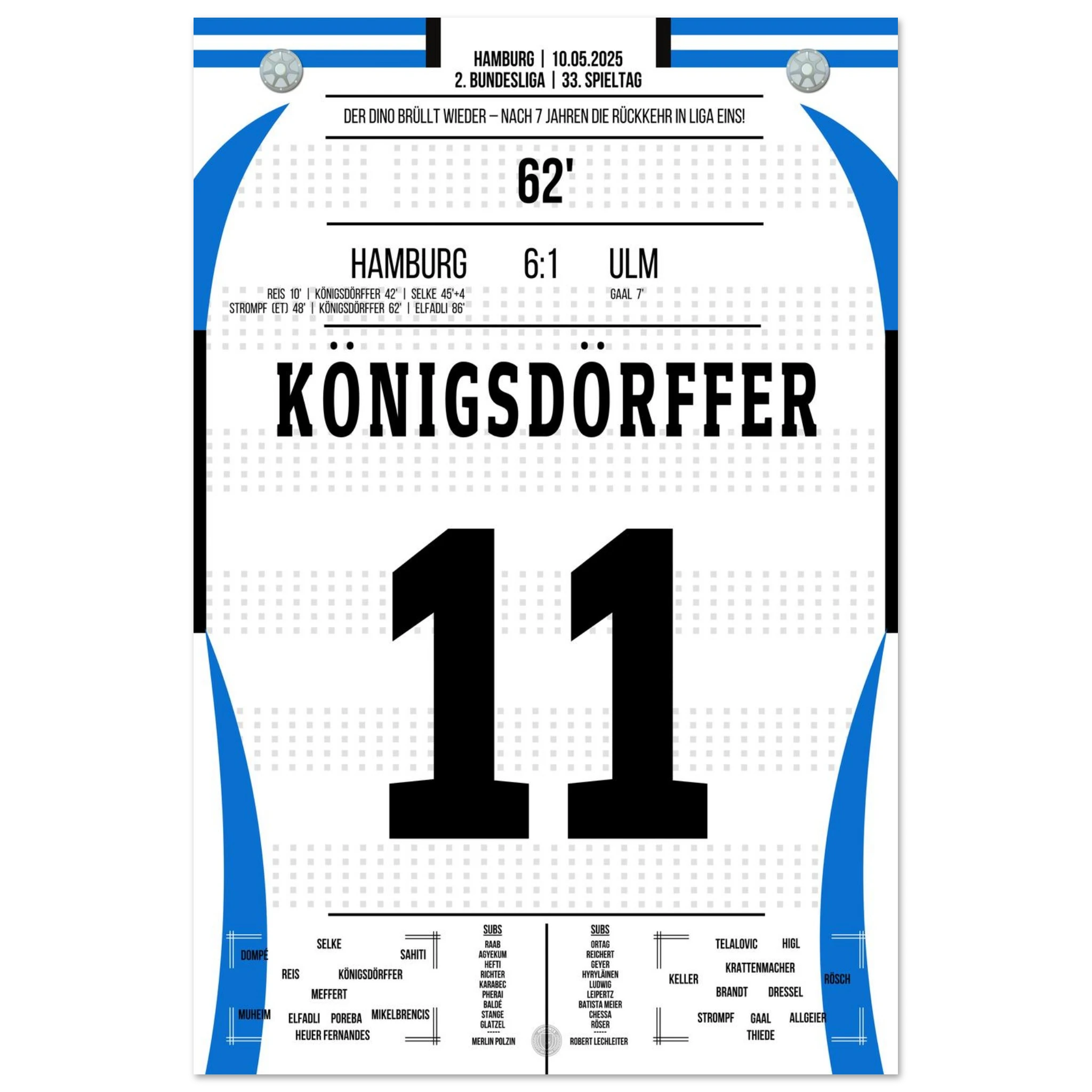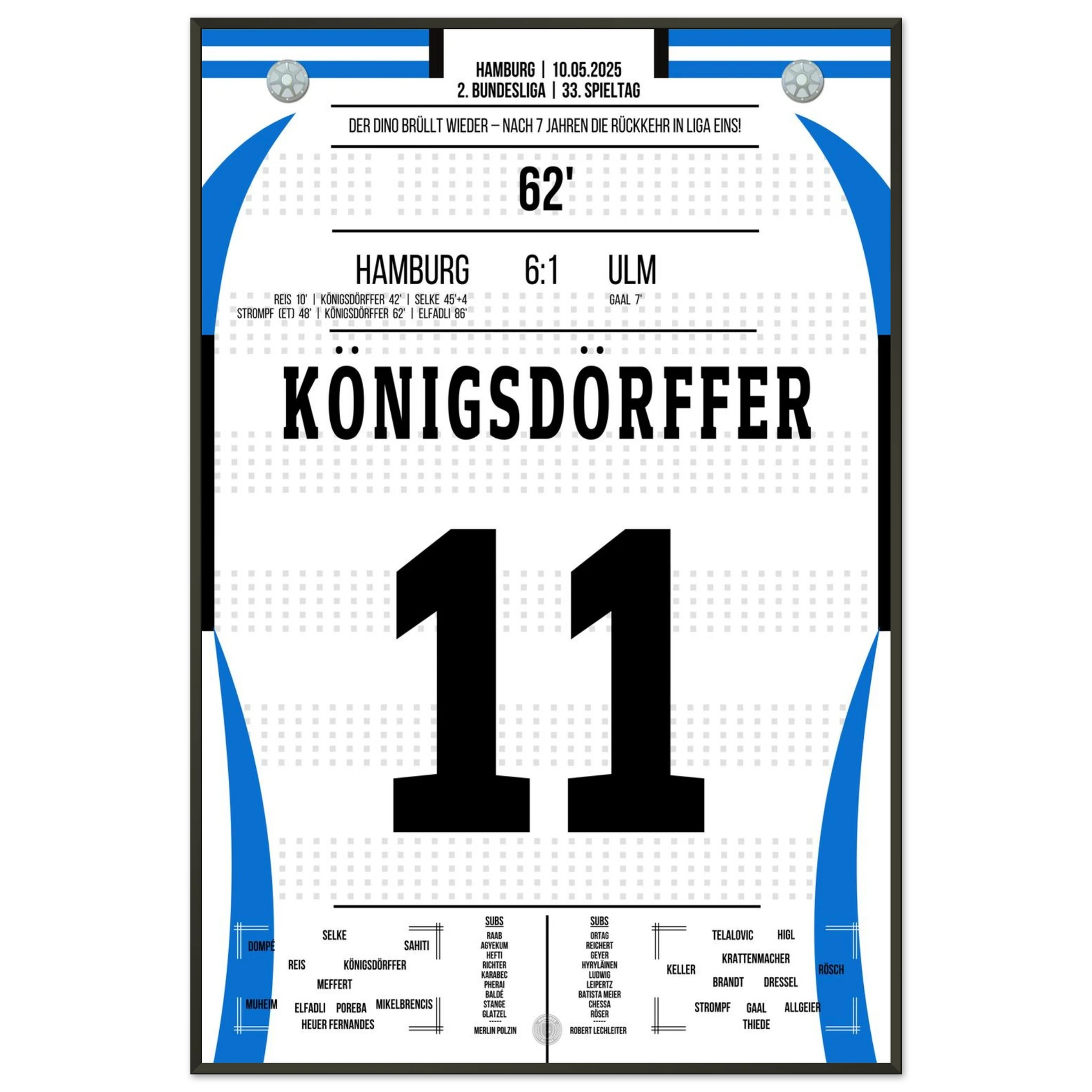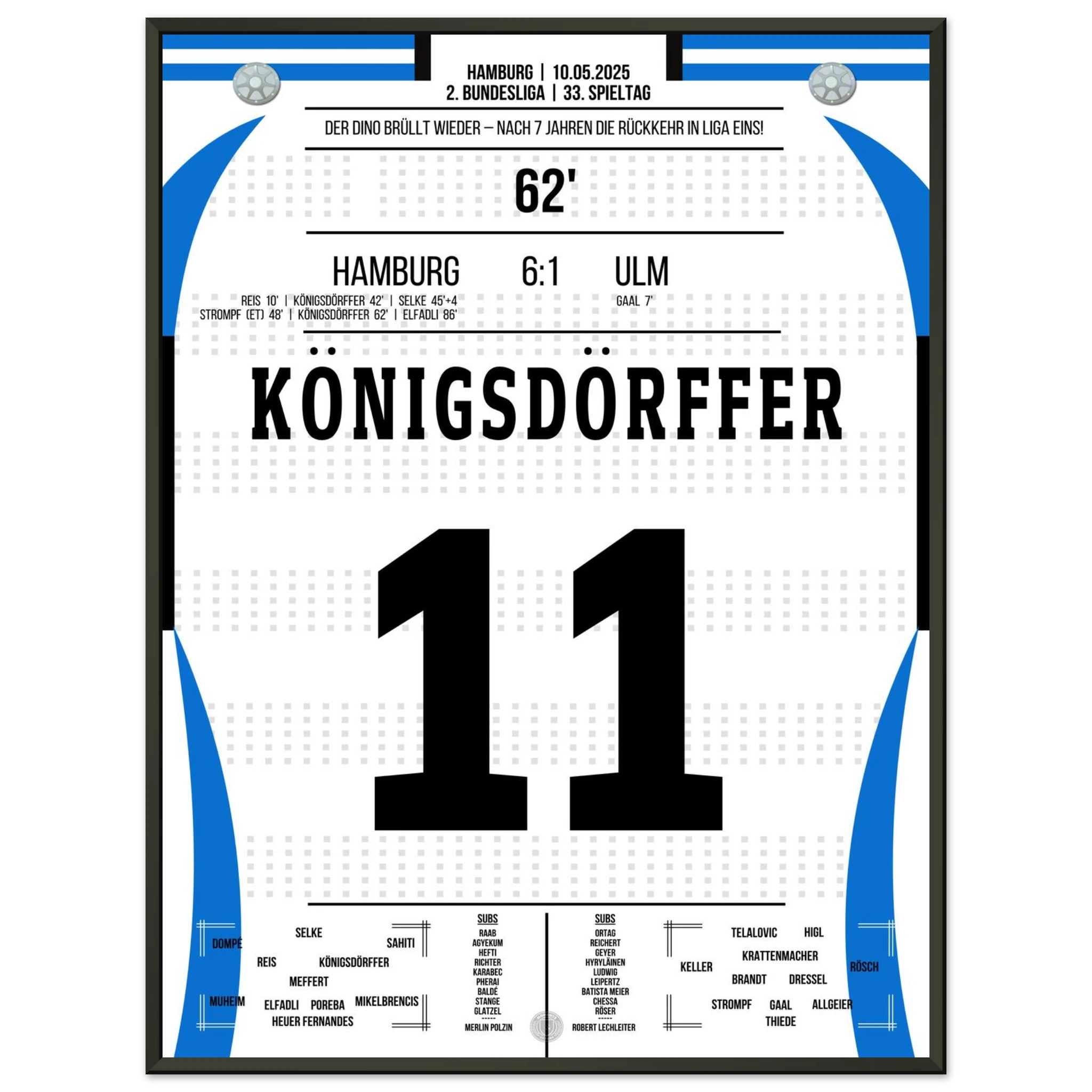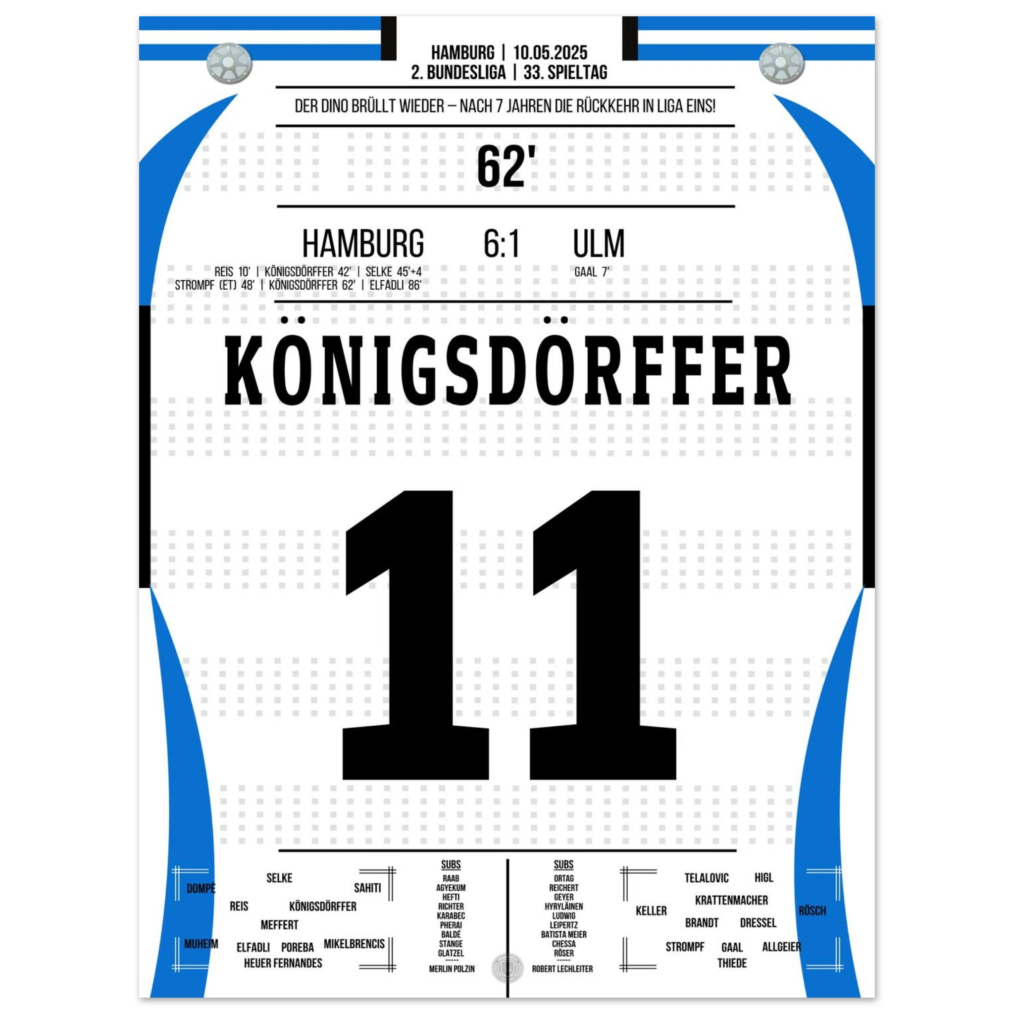 10. Mai 2025 – Hamburg vs. Ulm 6:1: Mit einem furiosen 6:1-Heimsieg und einem Treffer von Königsdörffer krönt sich Hamburg zur Rückkehr in die Bundesliga. Nach Jahren des Wartens ist der Dino zurück – unser Poster zelebriert dieses emotionale Comeback.