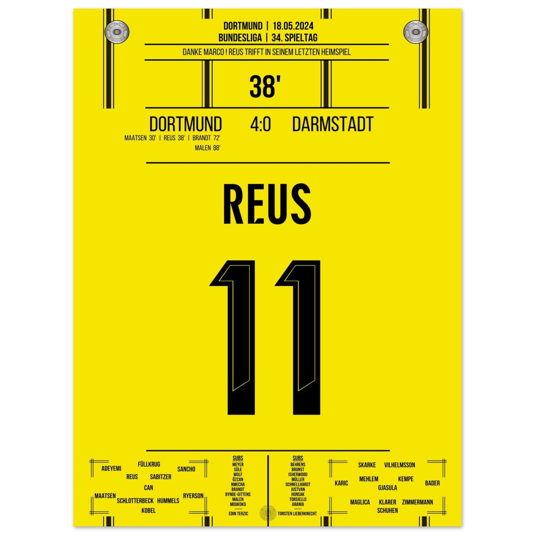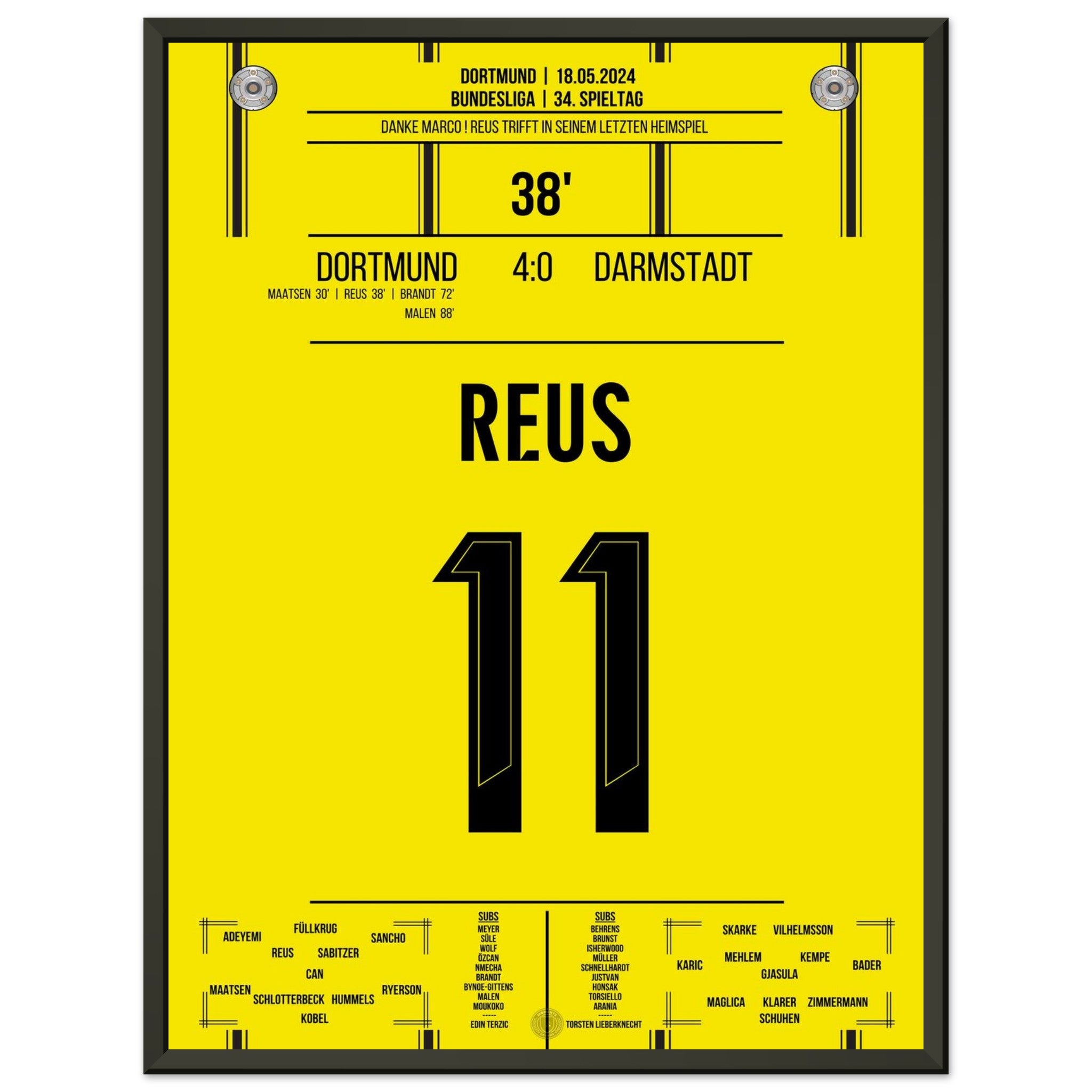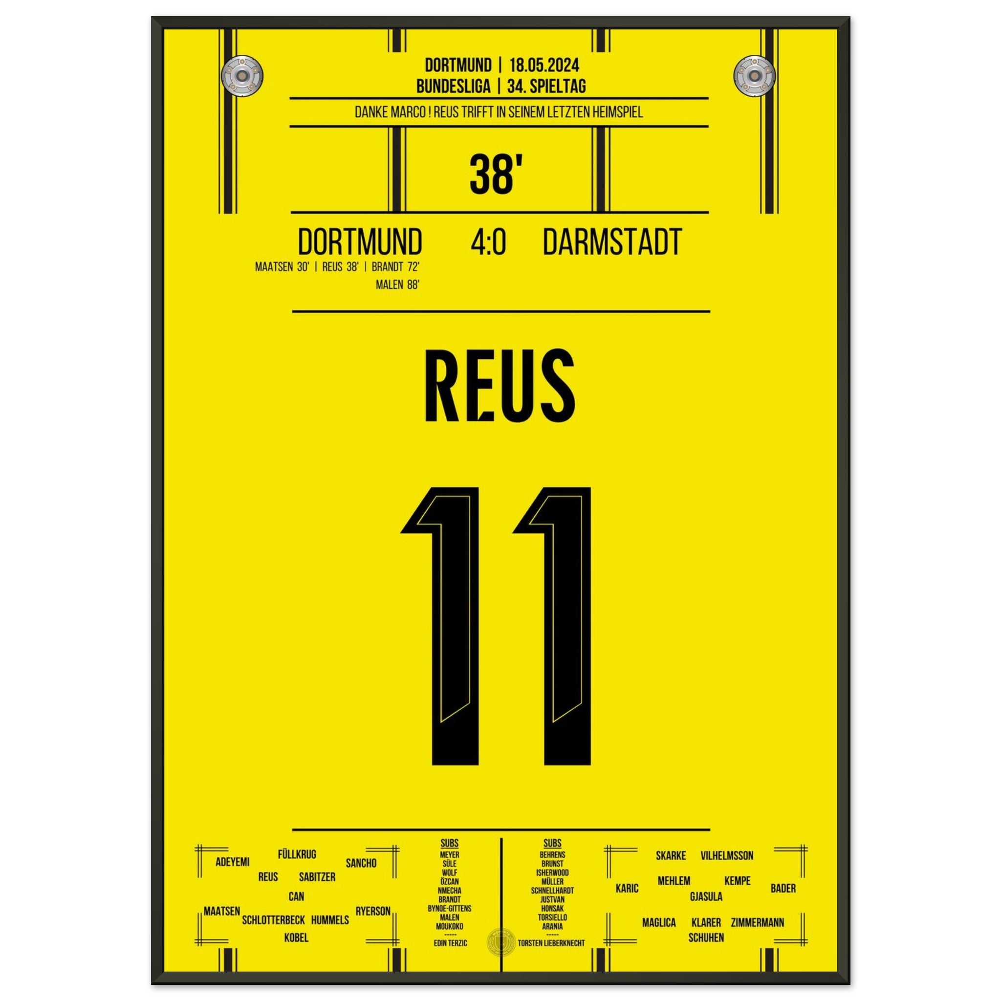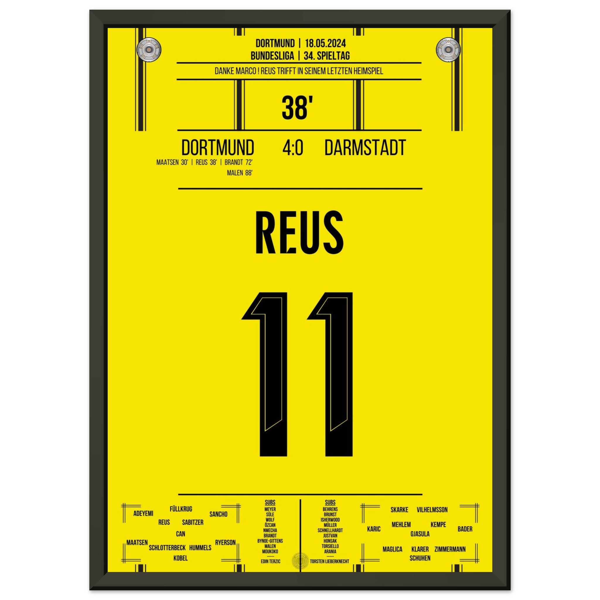 18. Mai 2024 – Dortmund vs. Darmstadt 4:0: In seinem letzten Heimspiel für Schwarz-Gelb trifft Marco Reus in der 38. Minute und lässt das Stadion Kopf stehen. Ein emotionaler Abschied mit Gänsehaut, Tor und Standing Ovations. Unser Poster hält diesen unvergesslichen Reus-Moment für die Ewigkeit fest.