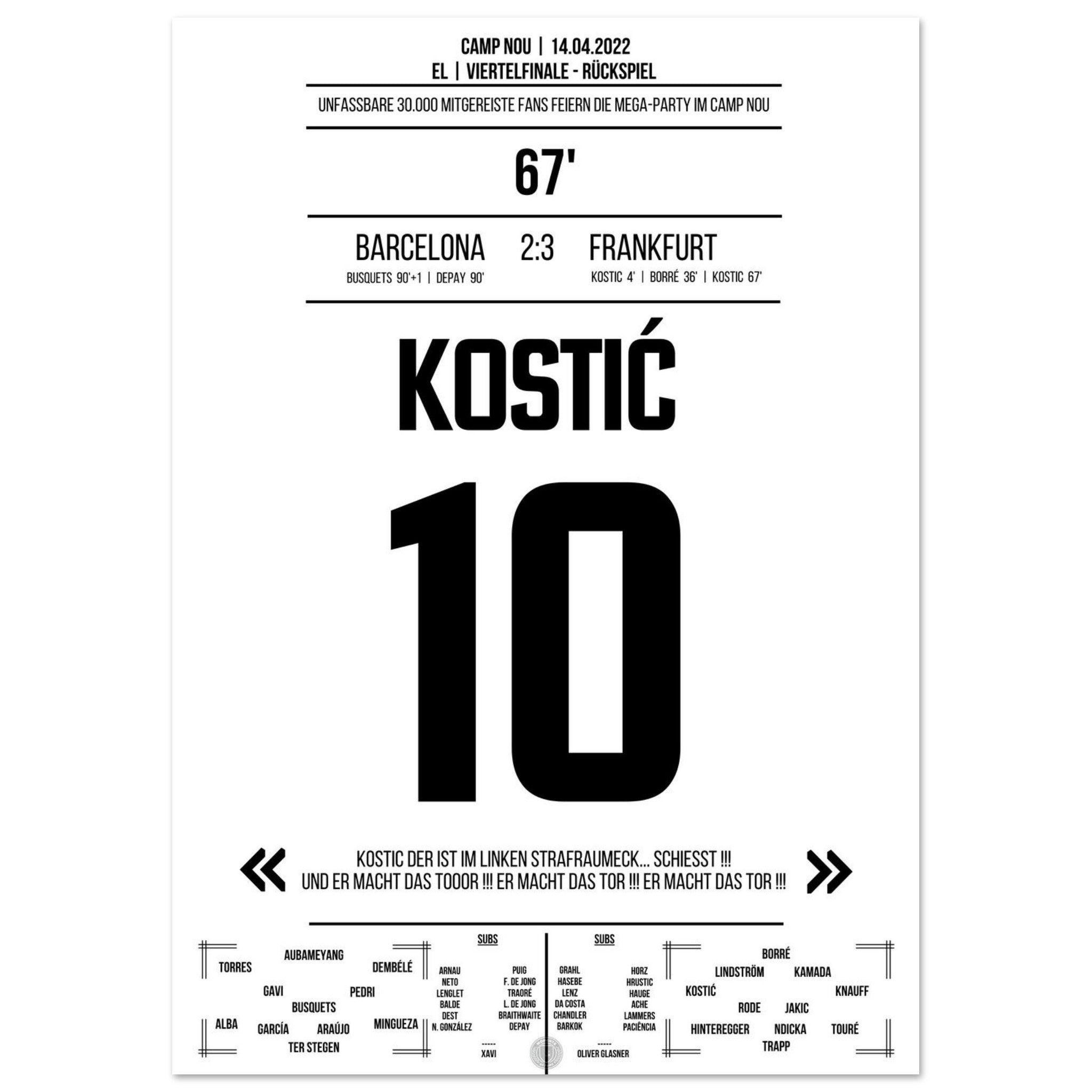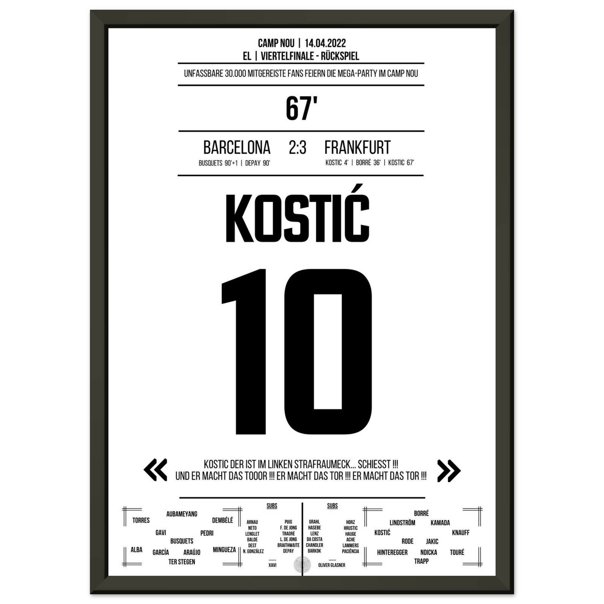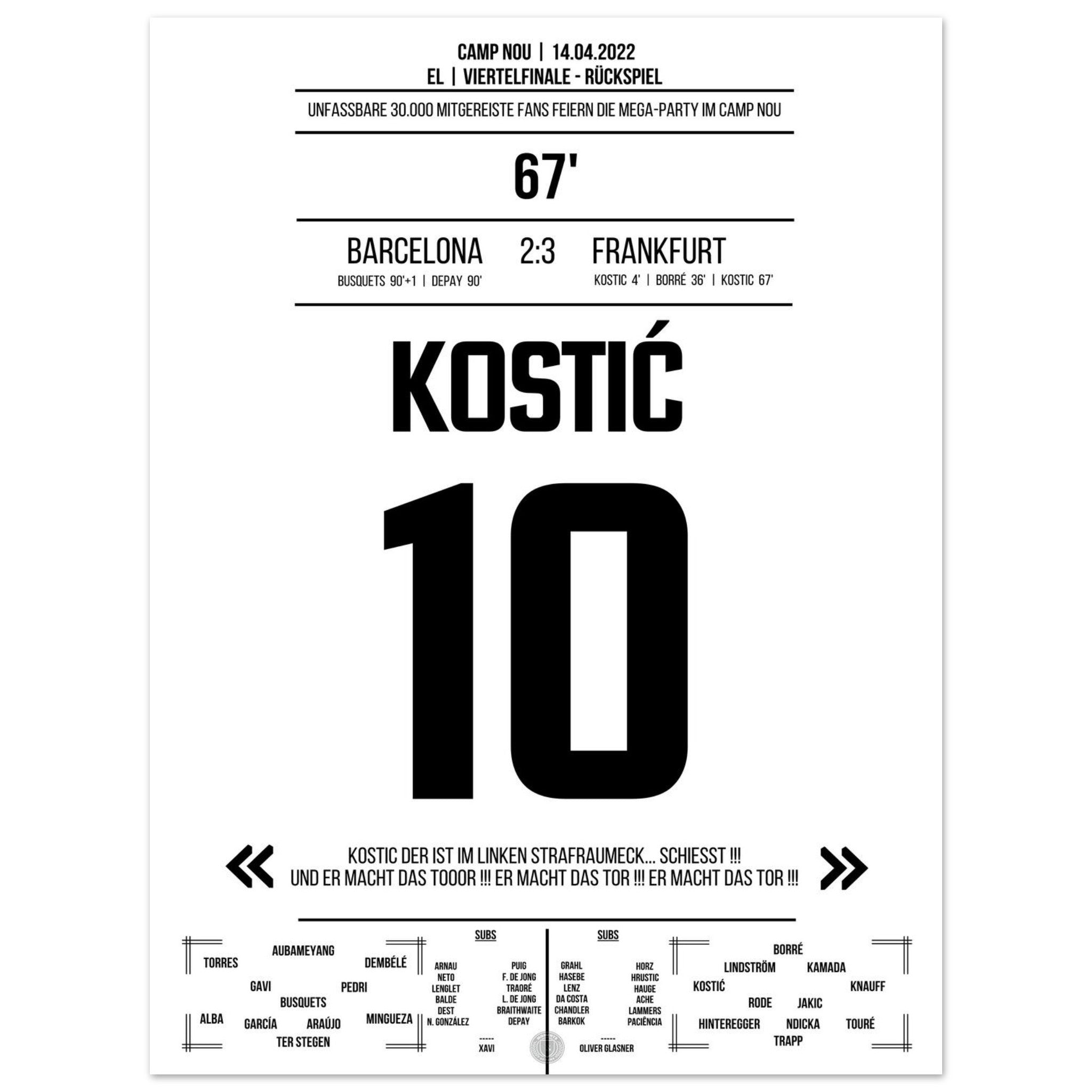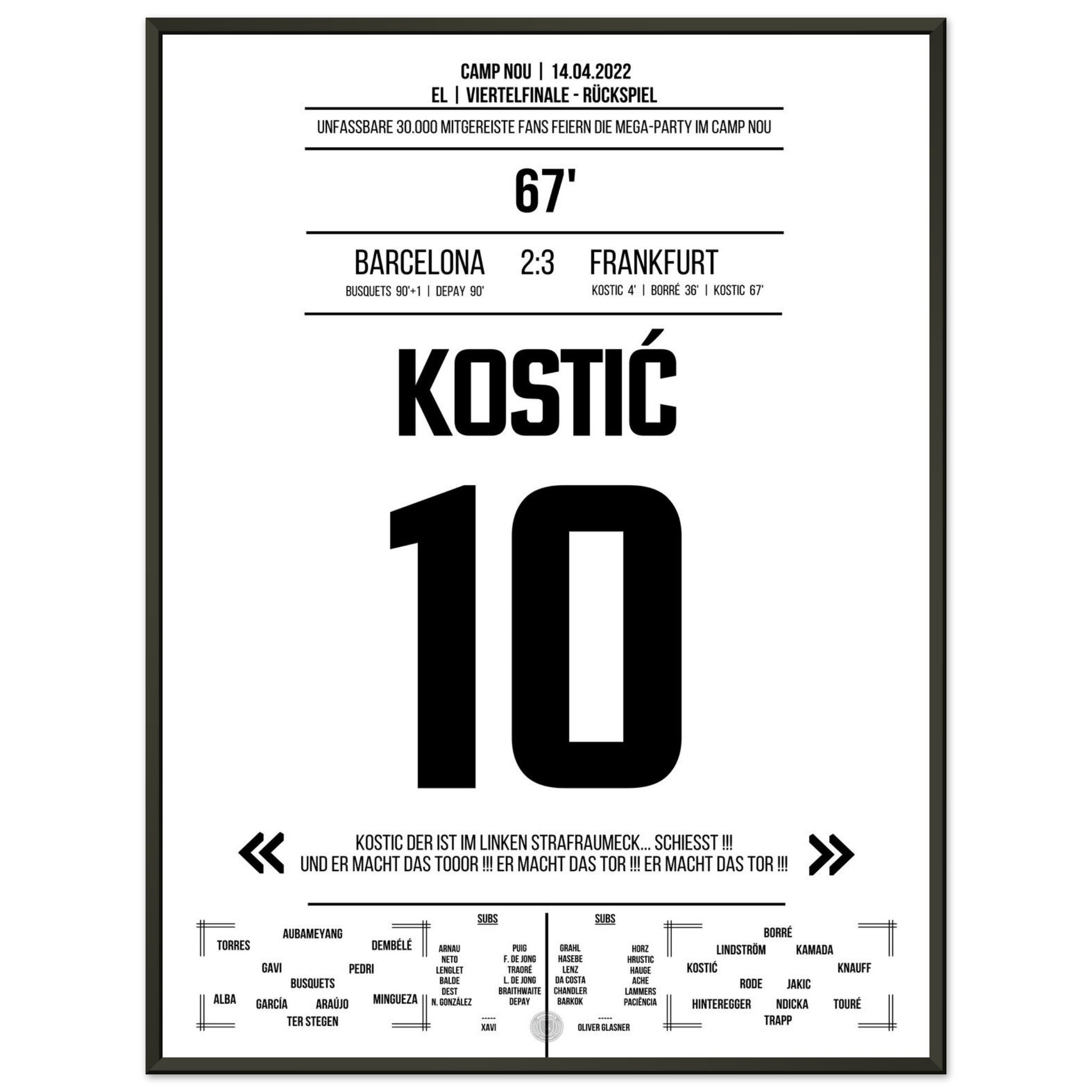 14. April 2022 – Barcelona vs. Frankfurt 2:3: In der 67. Minute trifft Filip Kostić mit einem platzierten Schuss zum 3:0 im Camp Nou und krönt eine der größten Europapokalnächte der Frankfurter Club-Geschichte. 30.000 Auswärtsfans feiern ein magisches Kapitel. Unser Poster hält diesen legendären Moment in Weiß-Schwarz fest.