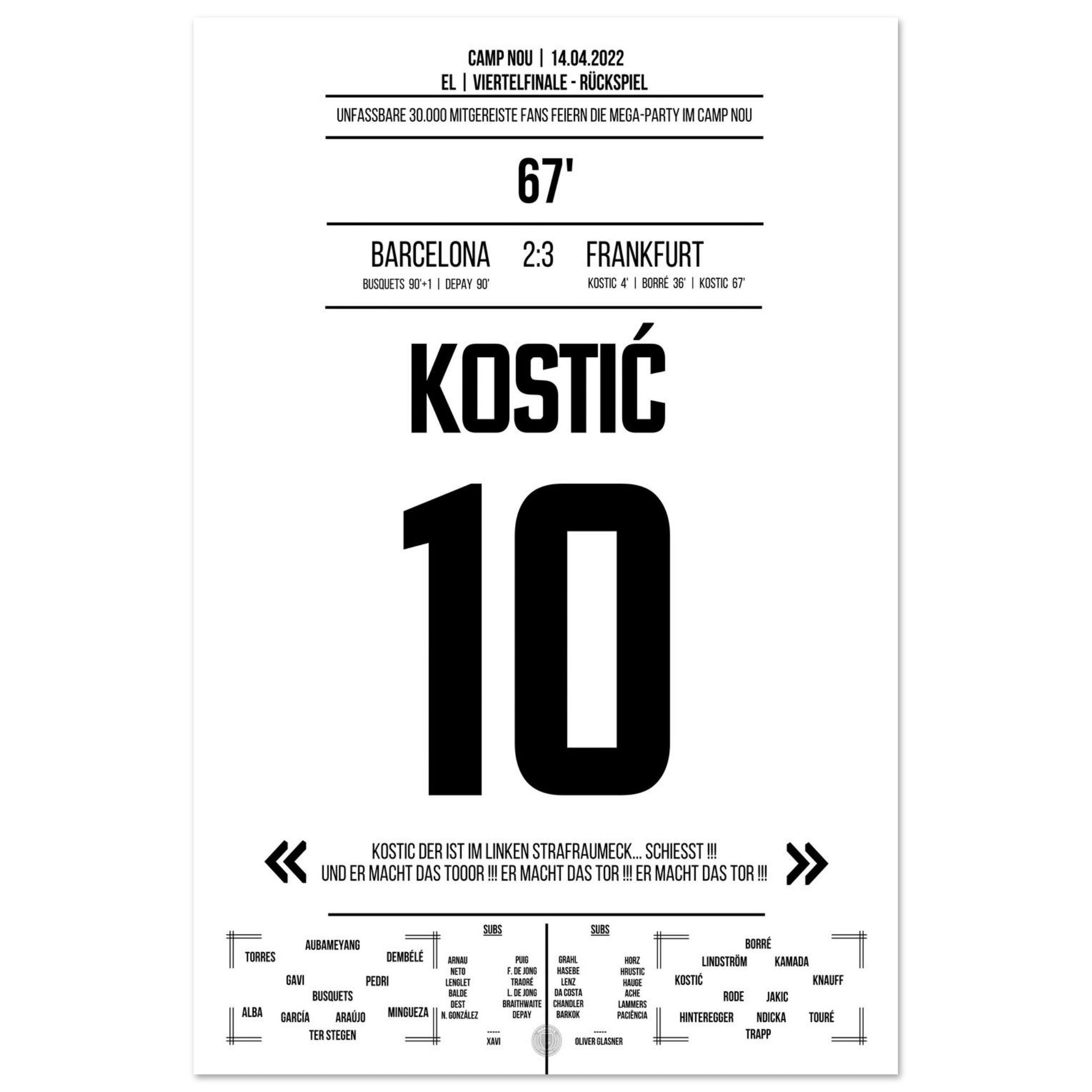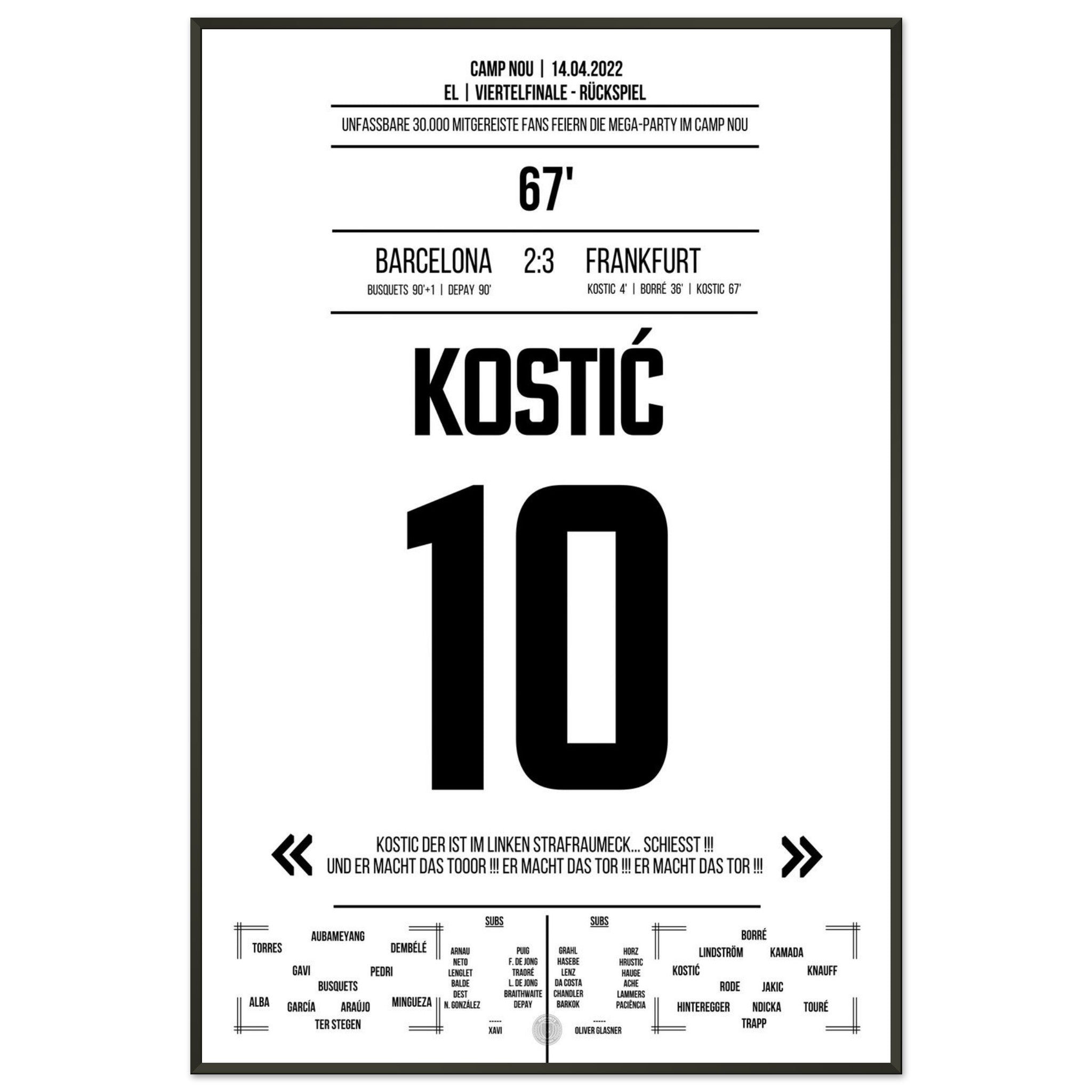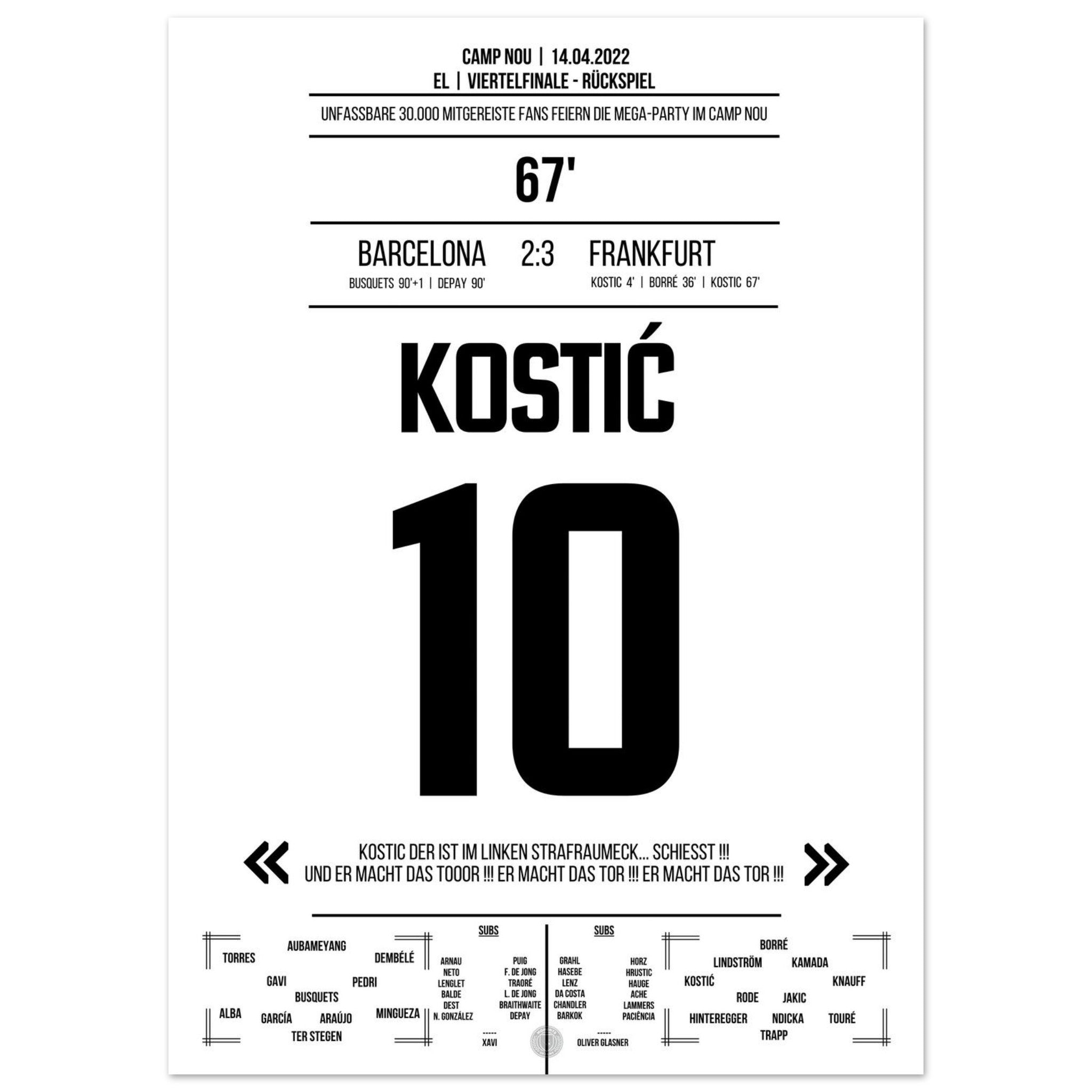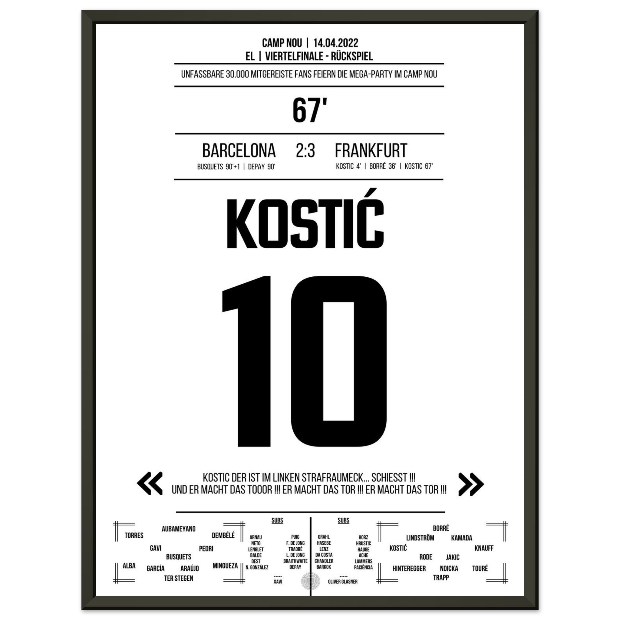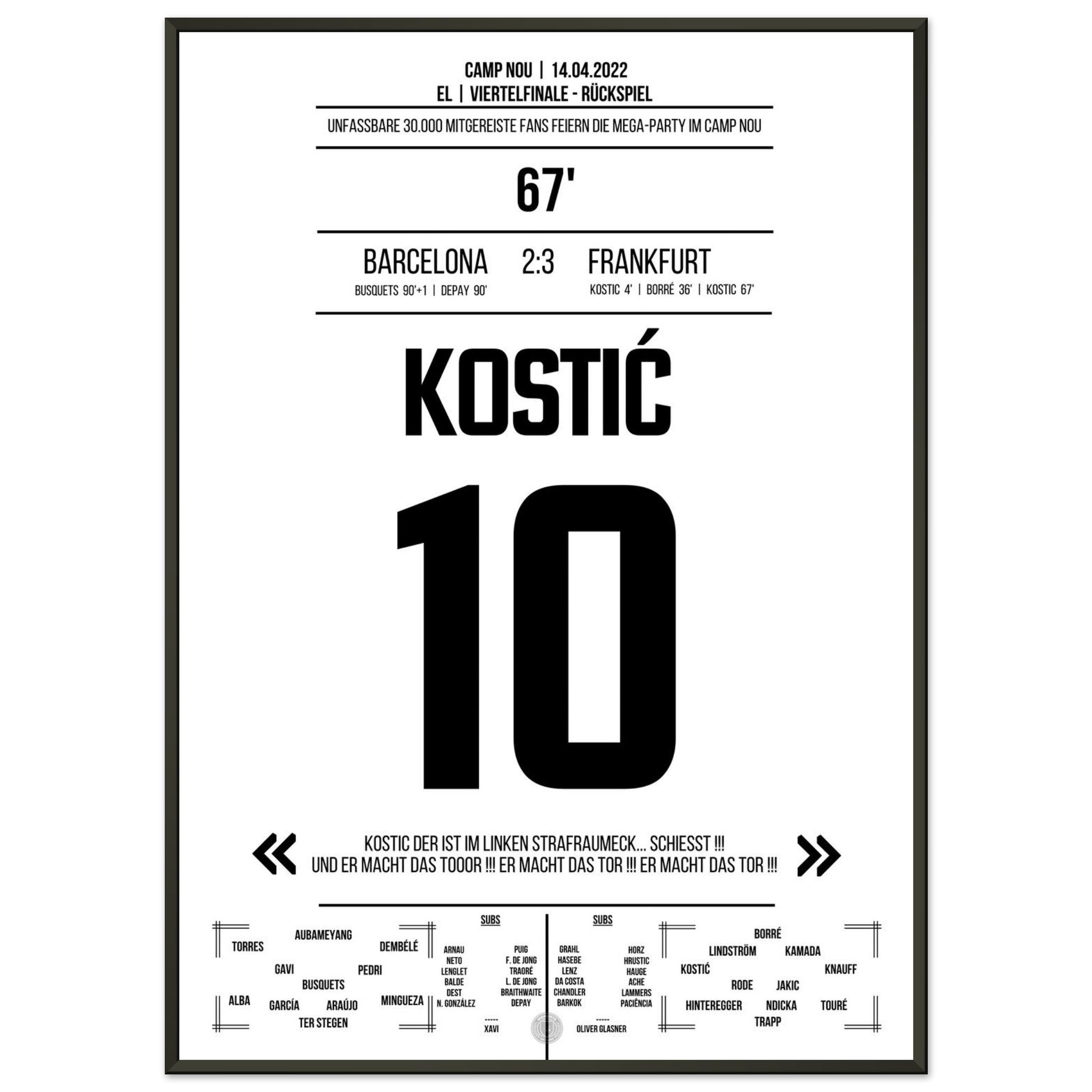 14. April 2022 – Barcelona vs. Frankfurt 2:3: In der 67. Minute trifft Filip Kostić mit einem platzierten Schuss zum 3:0 im Camp Nou und krönt eine der größten Europapokalnächte der Frankfurter Club-Geschichte. 30.000 Auswärtsfans feiern ein magisches Kapitel. Unser Poster hält diesen legendären Moment in Weiß-Schwarz fest.