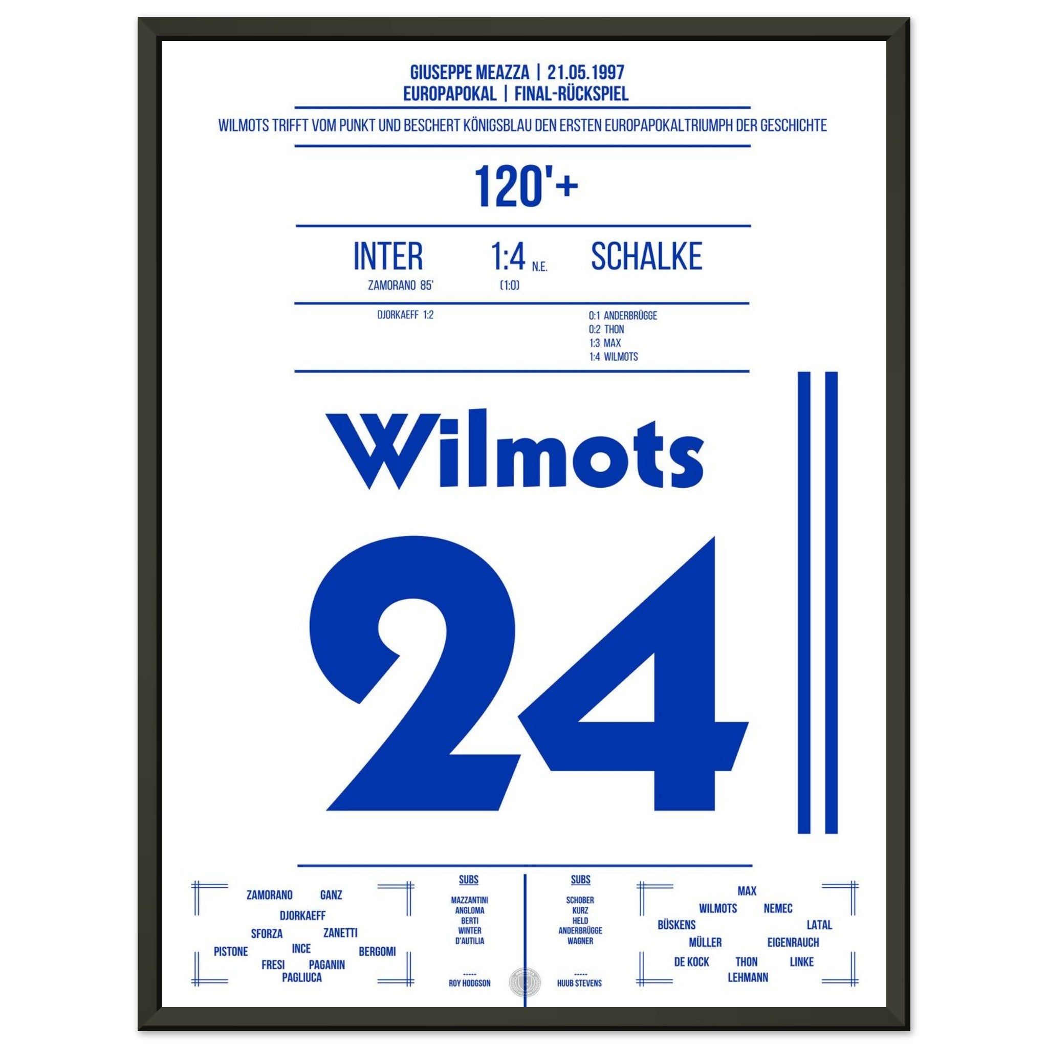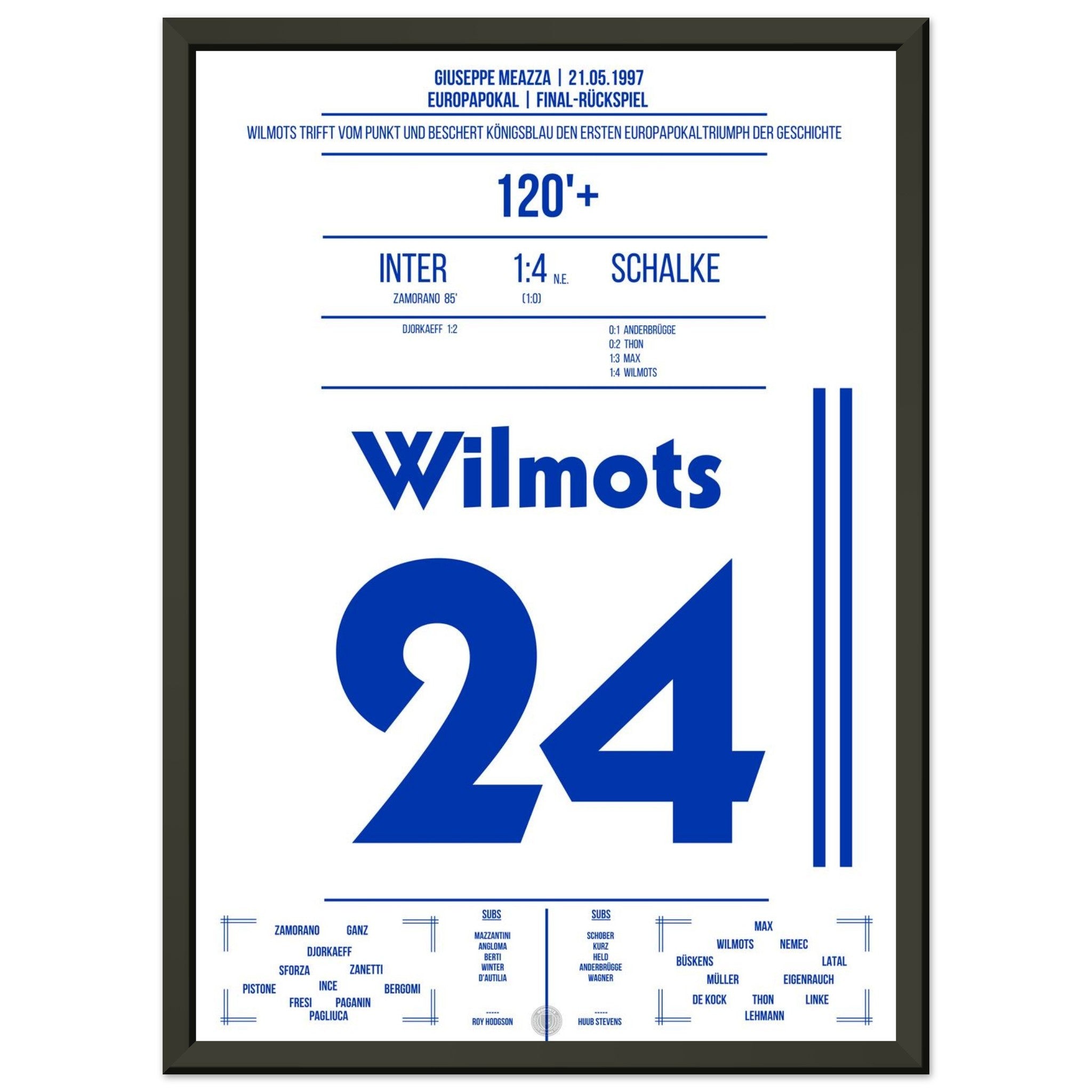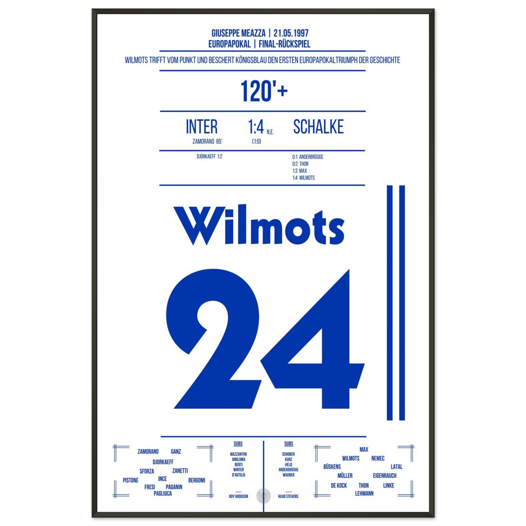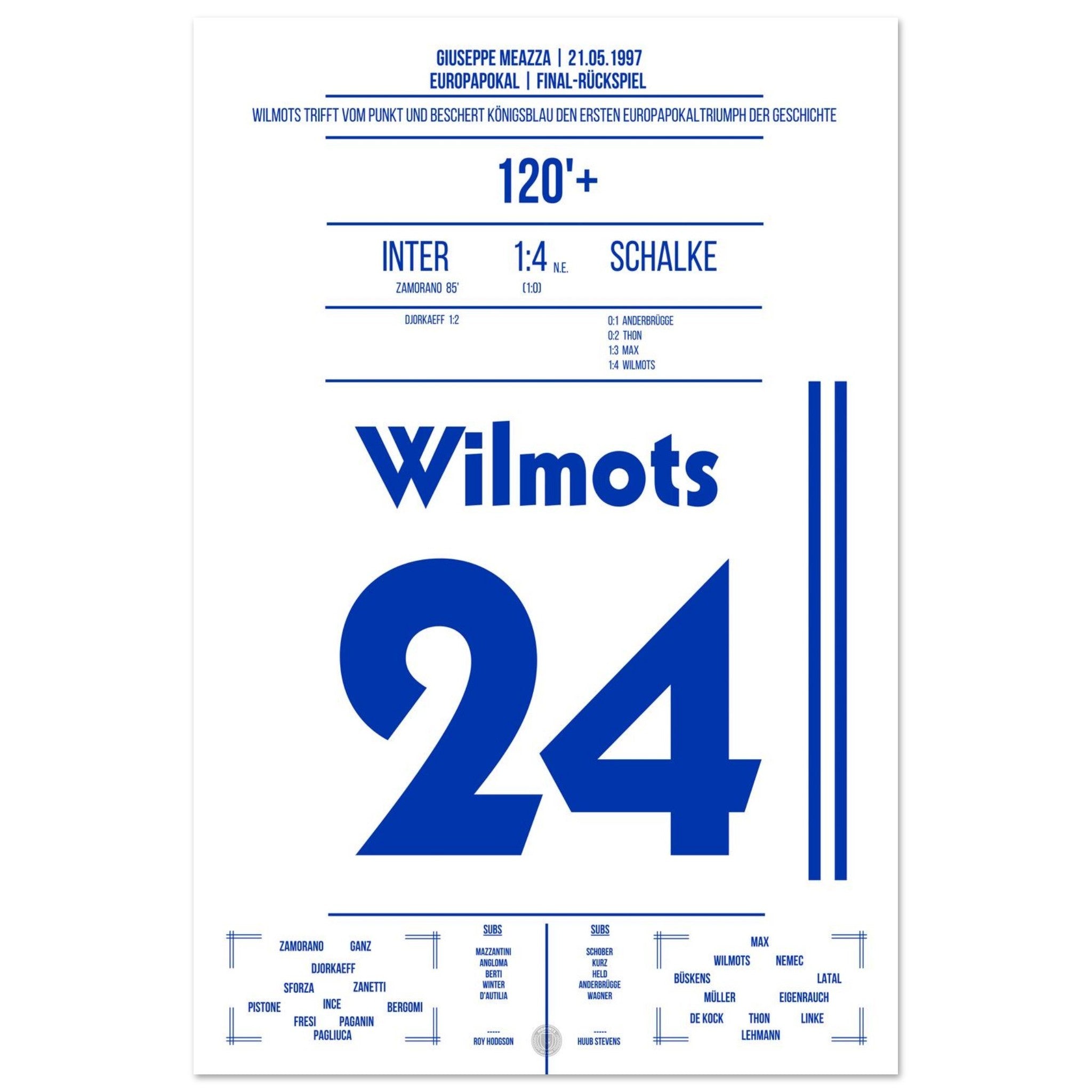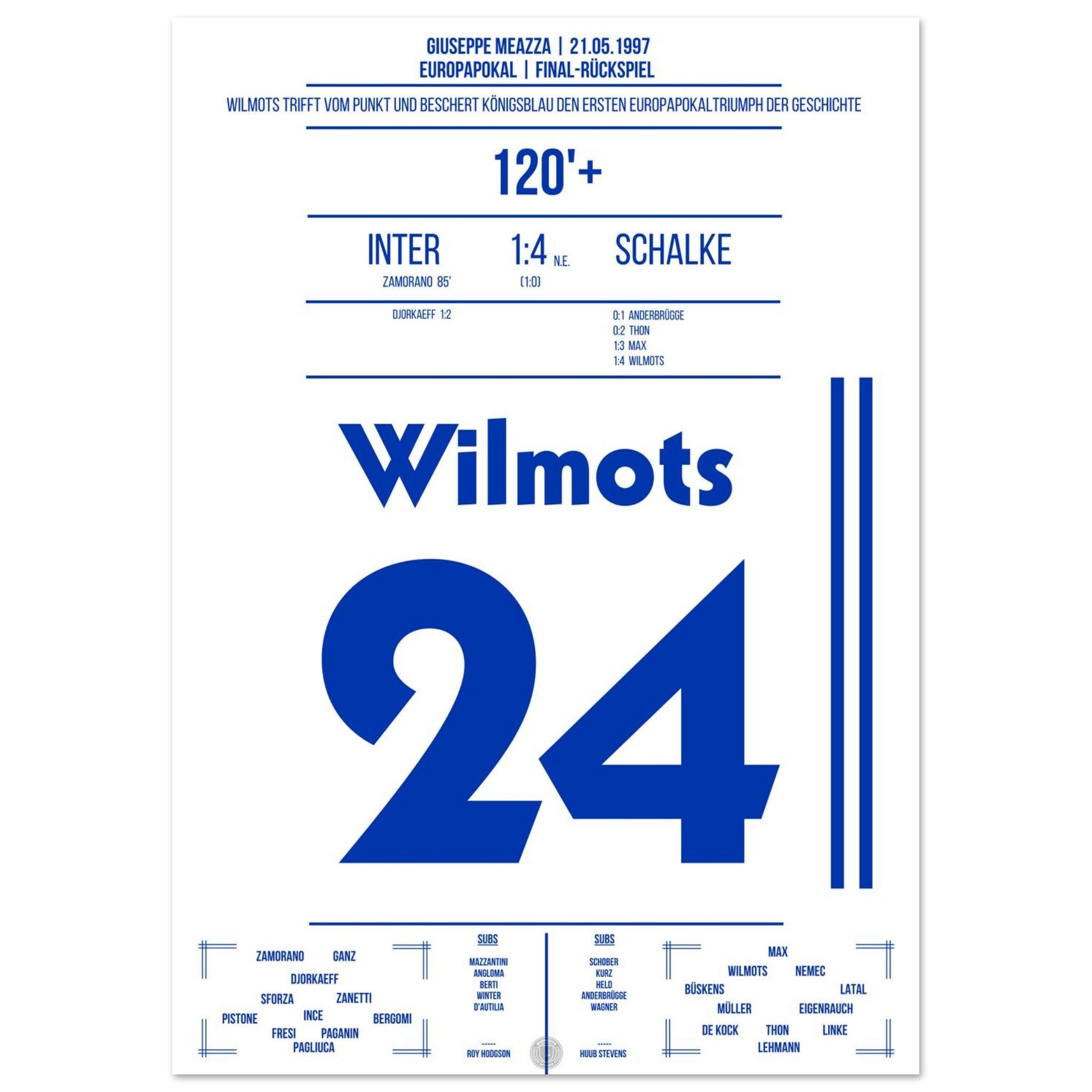 21. Mai 1997 – Inter vs. Schalke 0:1 n. E.: Marc Wilmots trifft im Elfmeterschießen des Europapokal-Finales gegen Inter und verwandelt sich zur Schalker Legende. Ein Moment für die Ewigkeit – König Wilmots krönt den Eurofighter-Traum. Unser Poster hält diesen historischen Augenblick in Königsblau fest.