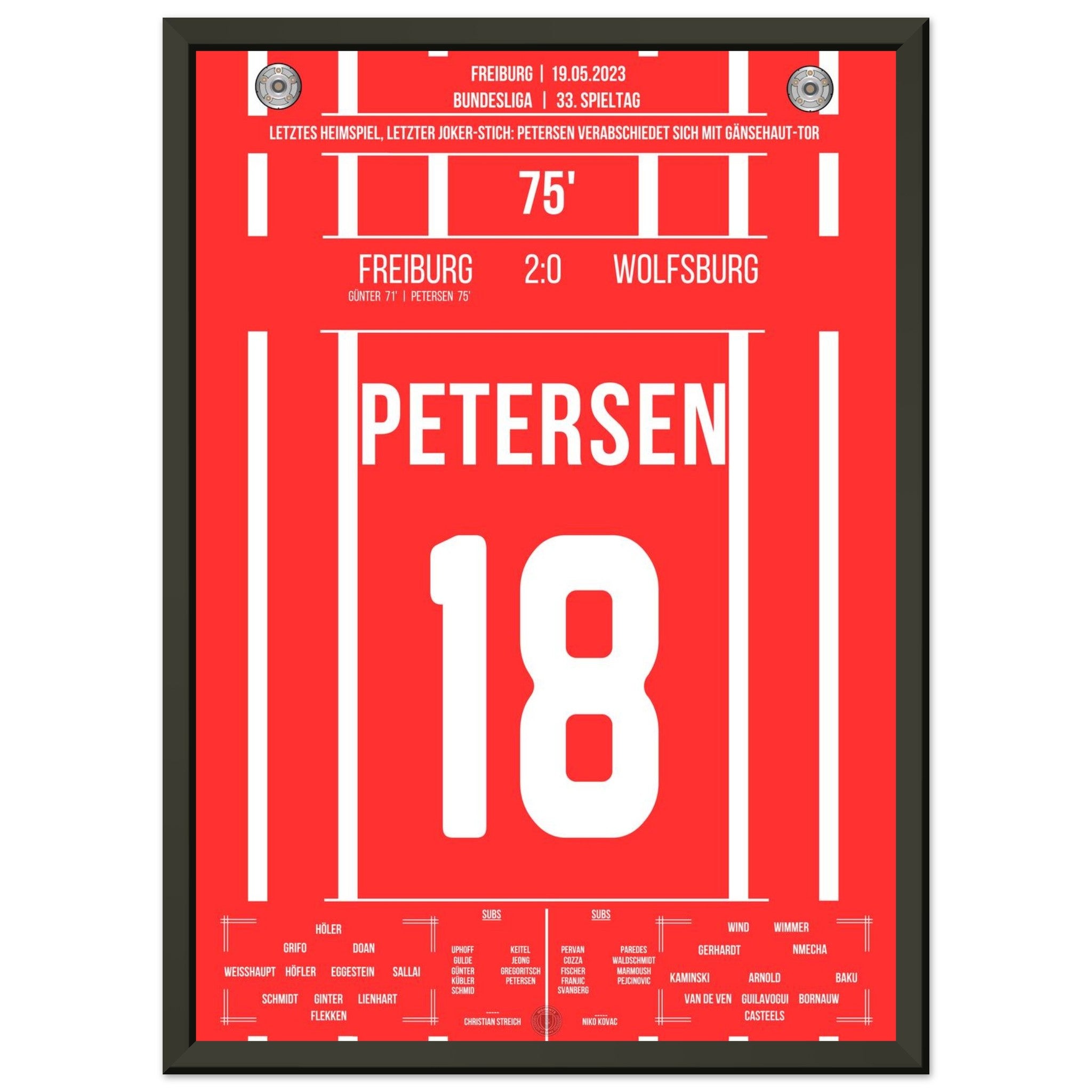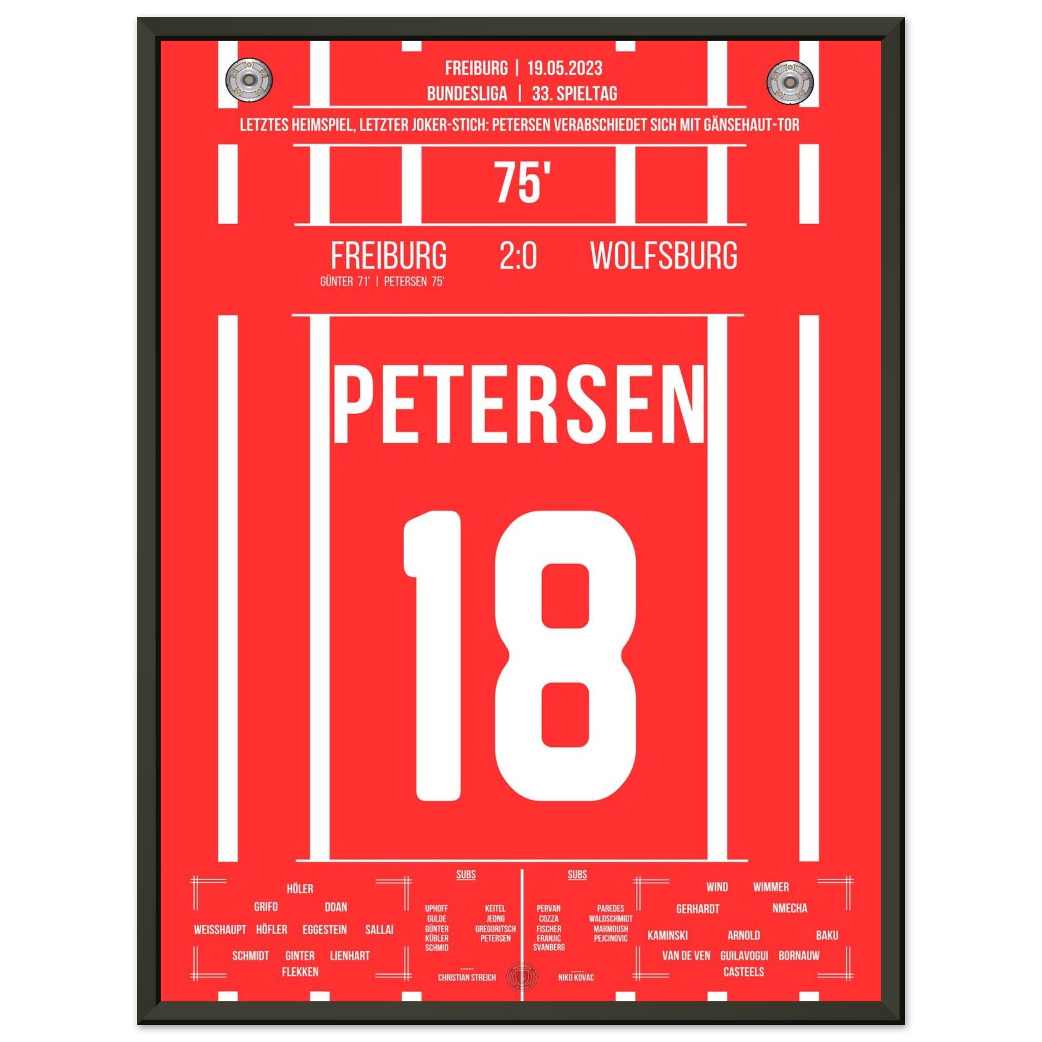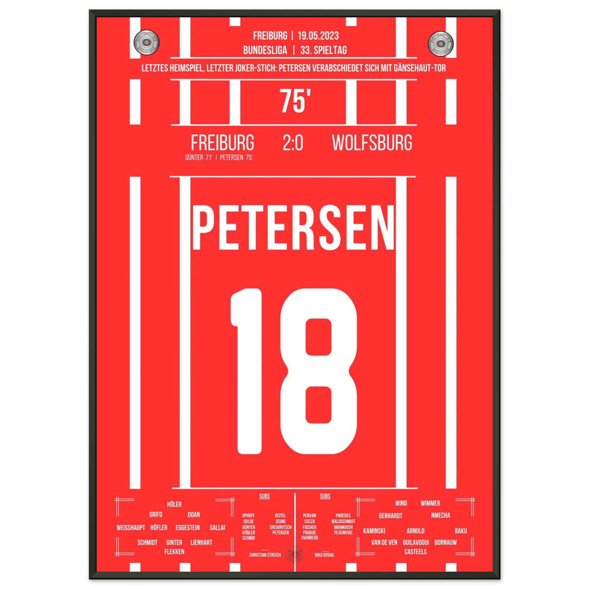 19. Mai 2023 – Freiburg vs. Wolfsburg 2:0: In seinem letzten Heimspiel trifft Nils Petersen in der Nachspielzeit und verabschiedet sich mit einem emotionalen Tor aus dem Profifußball. Standing Ovations iin Freiburg – ein Gänsehautmoment für die Ewigkeit. Unser Poster hält diesen würdevollen Abschied des Freiburger Publikumslieblings fest.