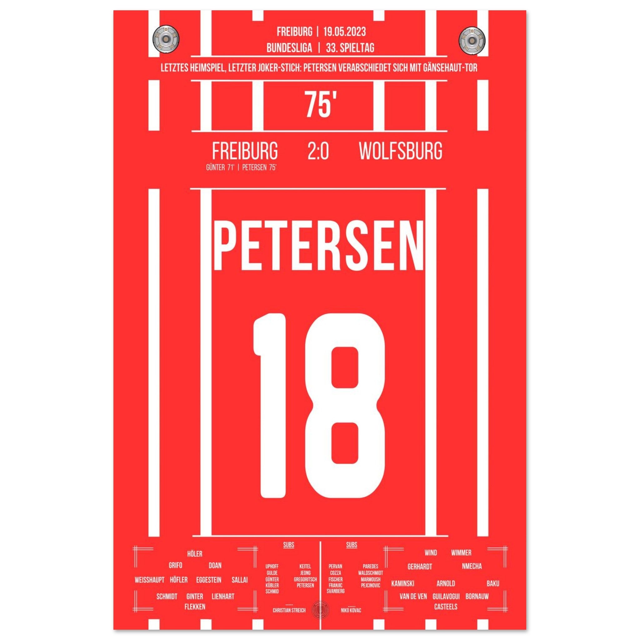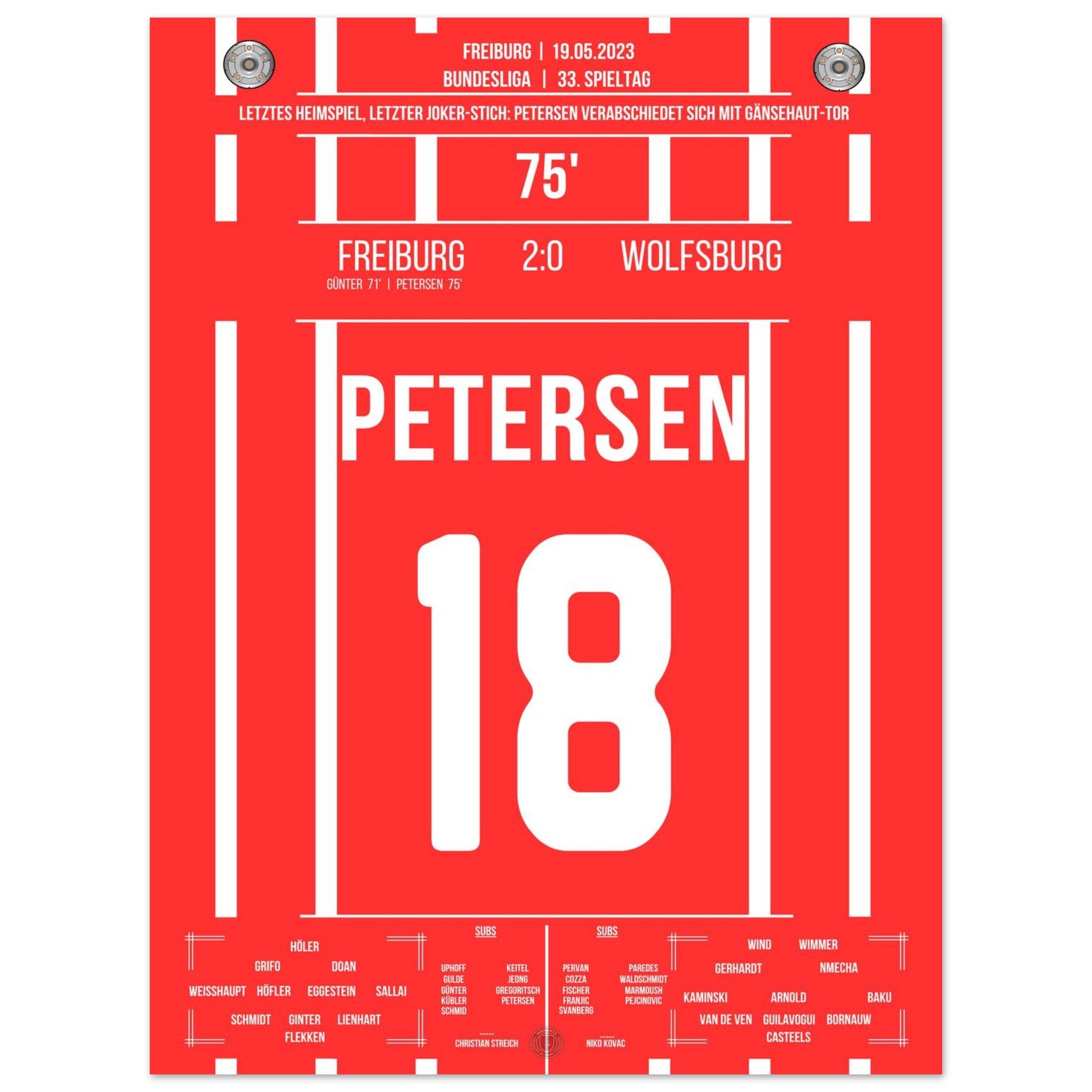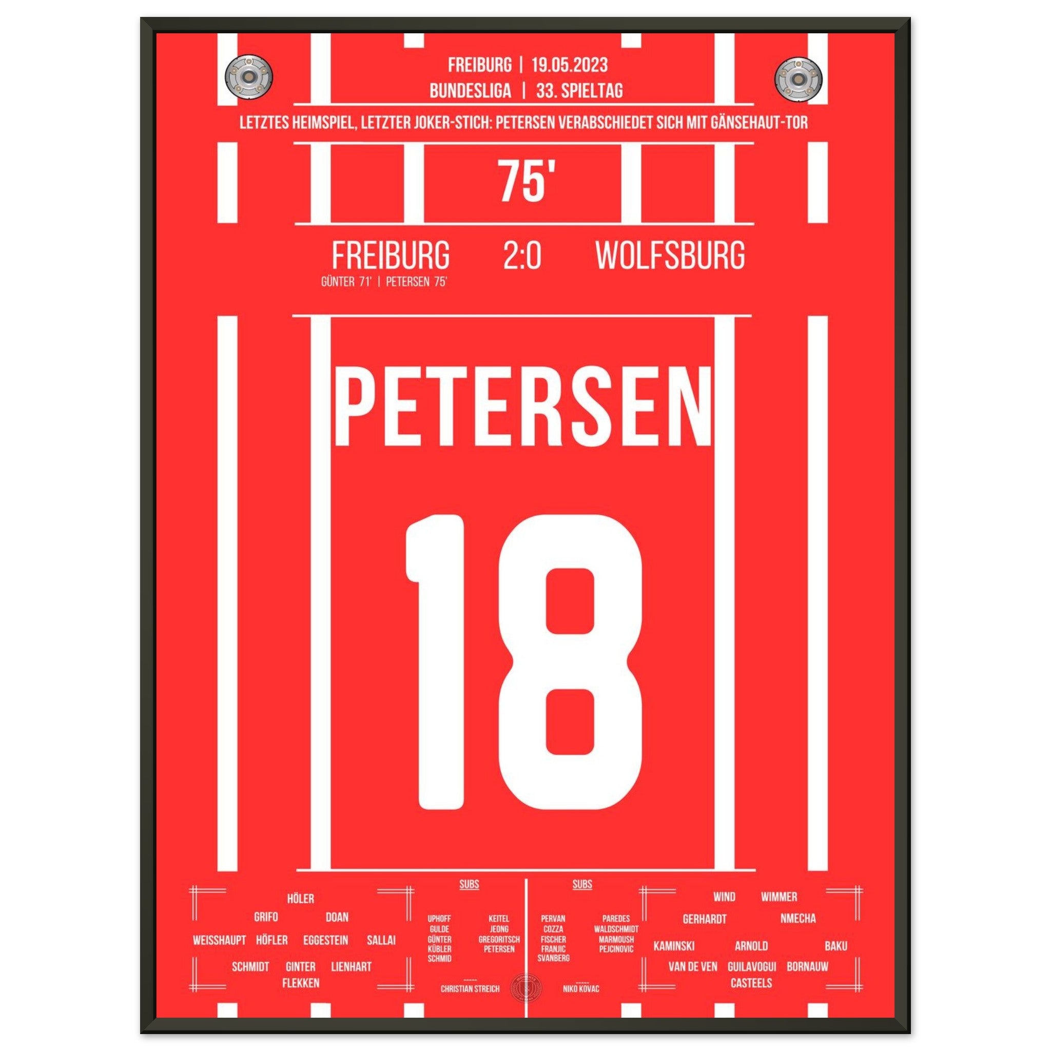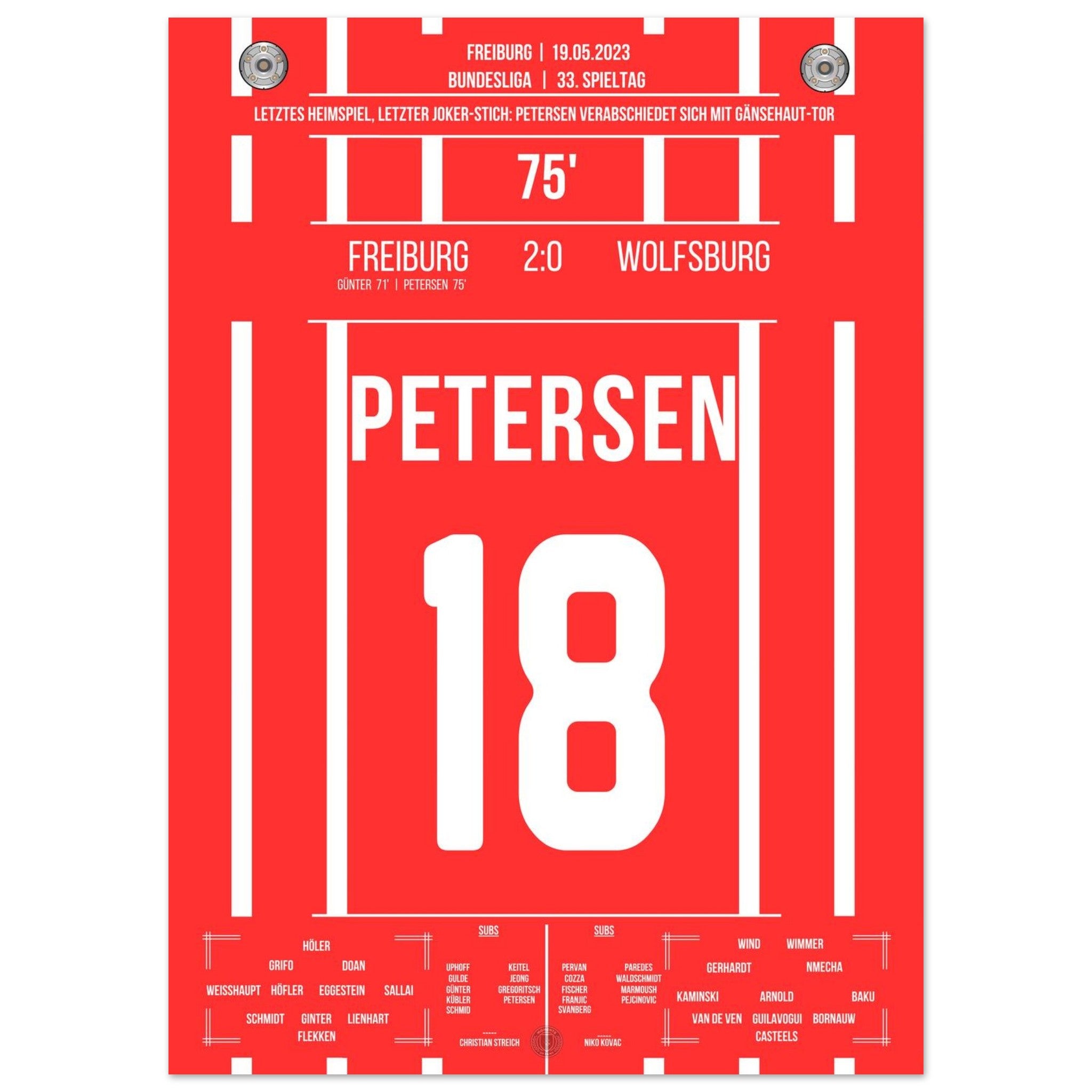 19. Mai 2023 – Freiburg vs. Wolfsburg 2:0: In seinem letzten Heimspiel trifft Nils Petersen in der Nachspielzeit und verabschiedet sich mit einem emotionalen Tor aus dem Profifußball. Standing Ovations iin Freiburg – ein Gänsehautmoment für die Ewigkeit. Unser Poster hält diesen würdevollen Abschied des Freiburger Publikumslieblings fest.