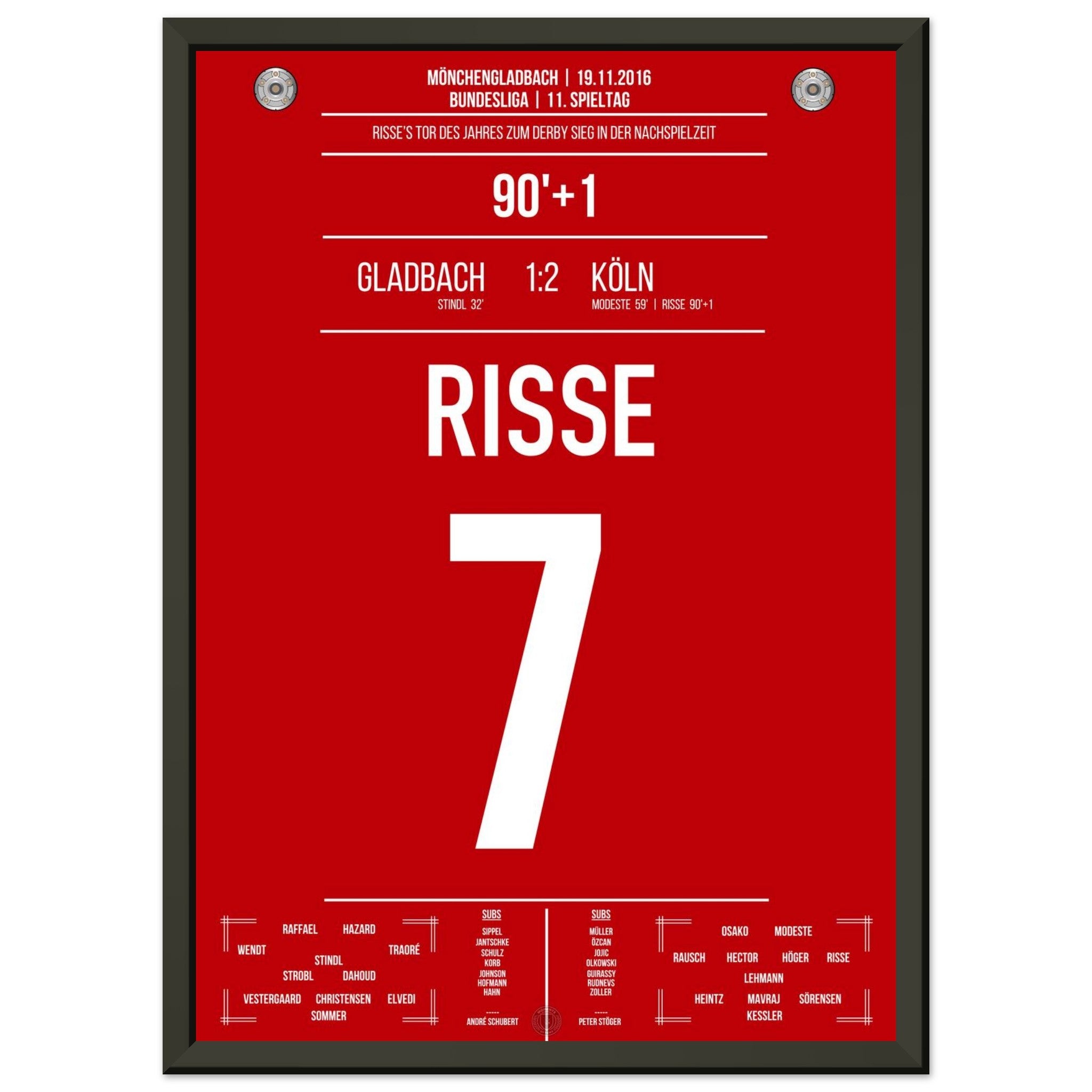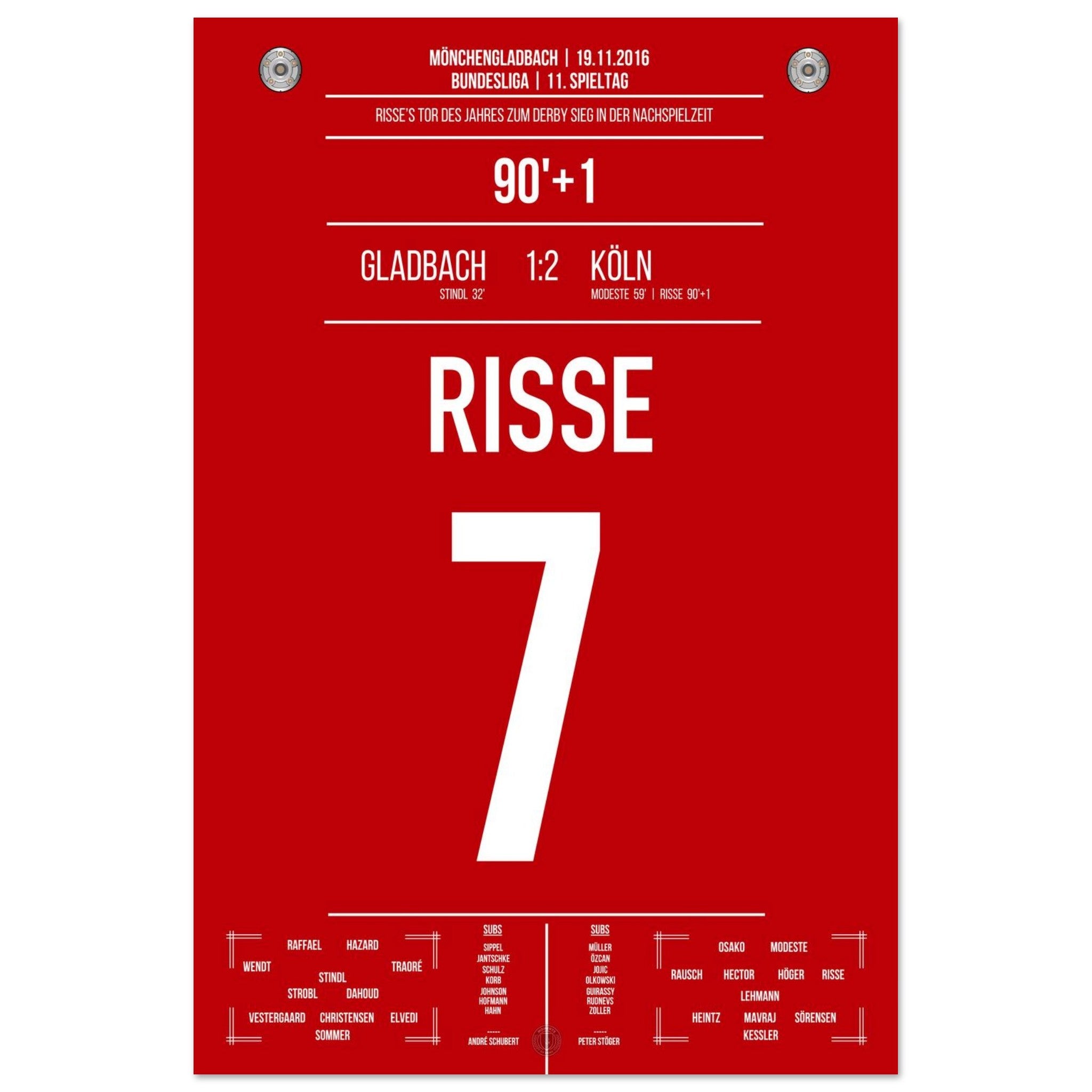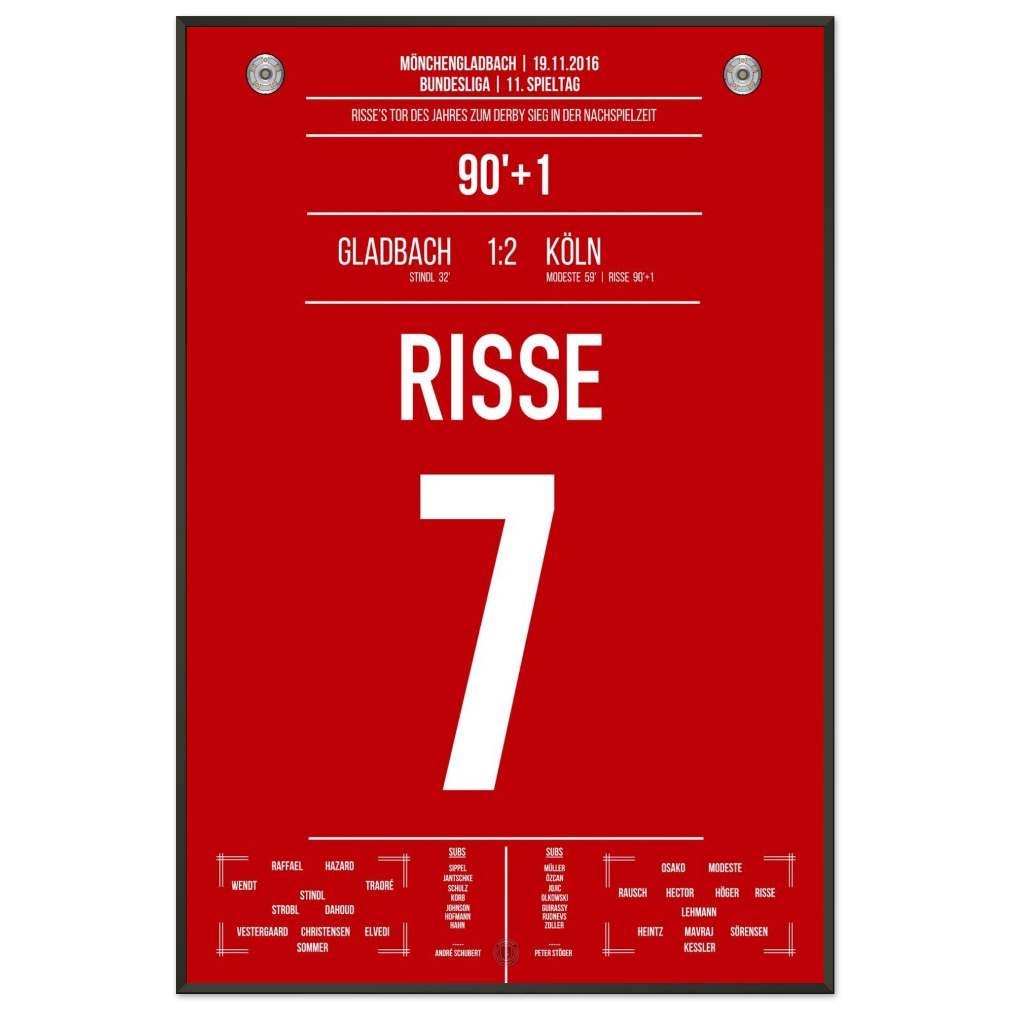 19. November 2016 – Mönchengladbach vs. Köln 1:2: In der 91. Minute hämmert Marcel Risse den Ball aus der Distanz in den Winkel und entscheidet das Derby in allerletzter Sekunde. Ein Tor für die Ewigkeit, ein Gänsehautmoment für ganz Köln. Unser Poster verewigt diesen magischen Derby-Sieg in Rot-Weiß.