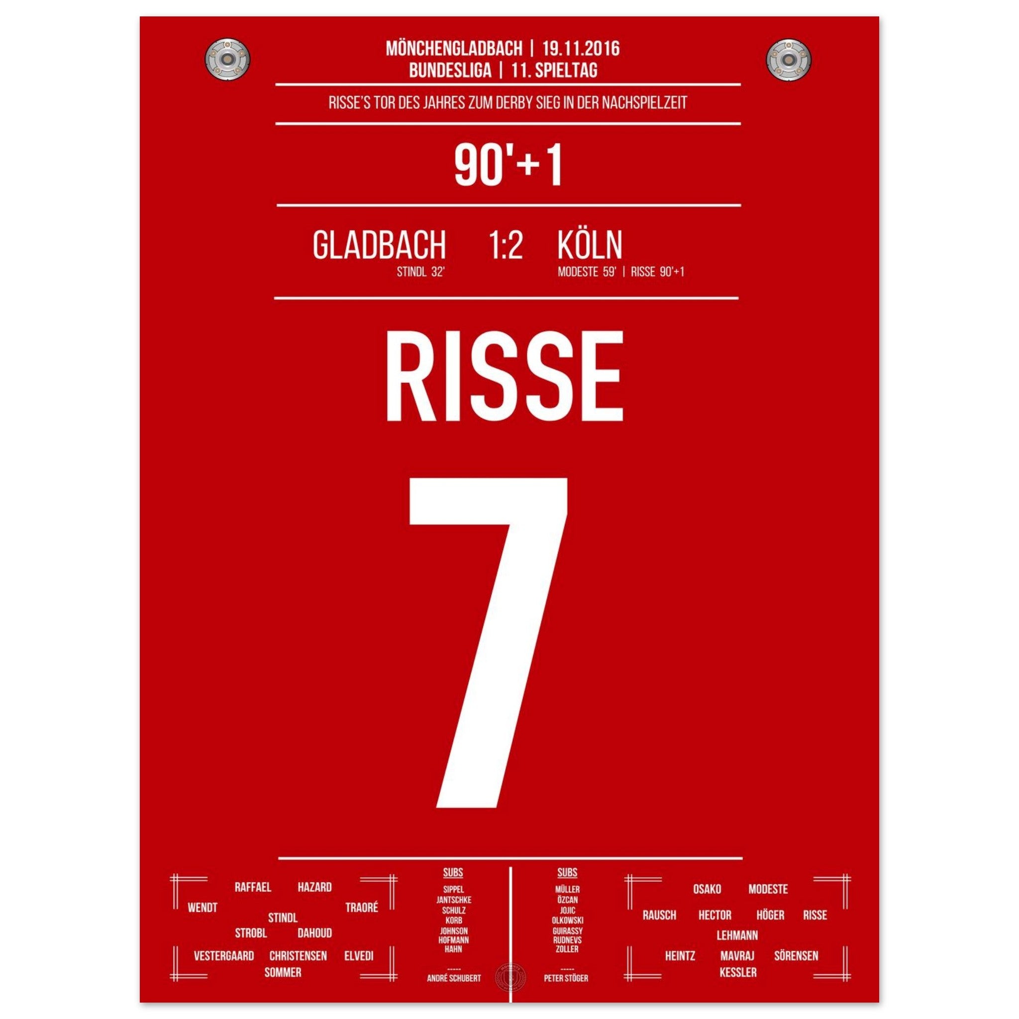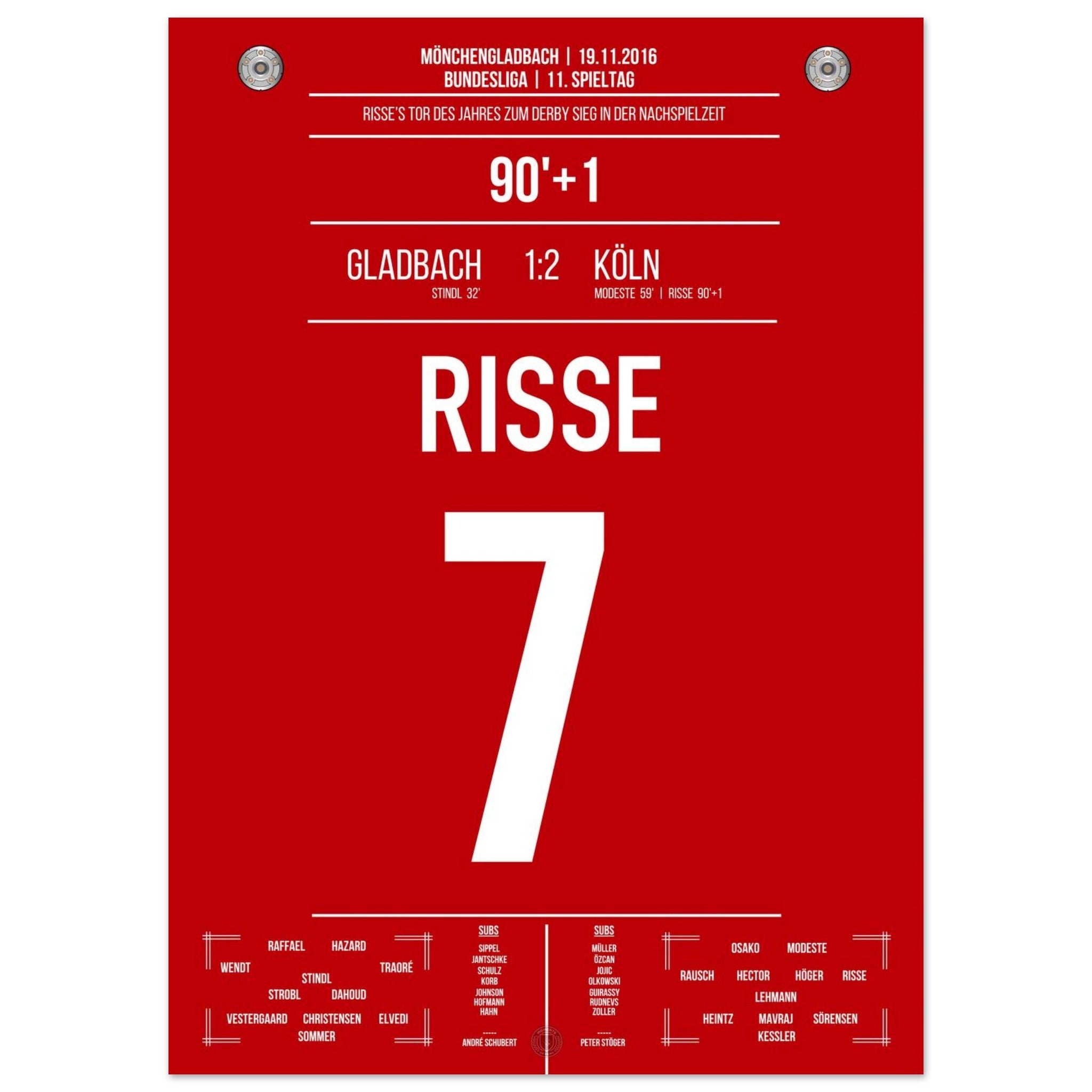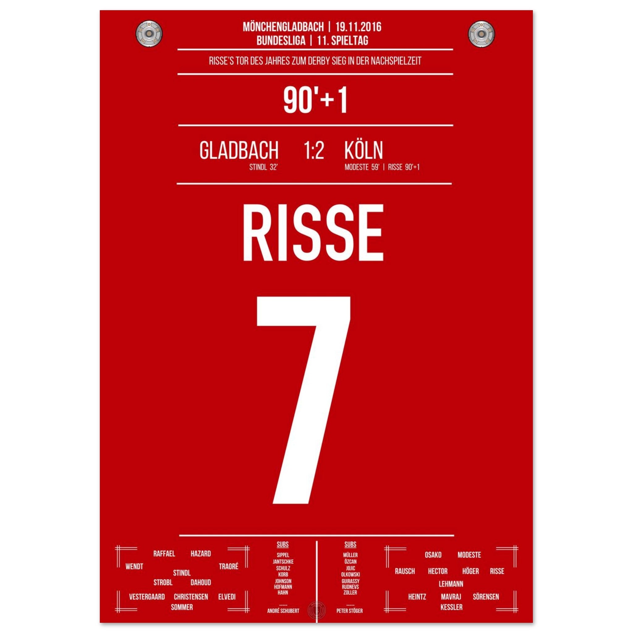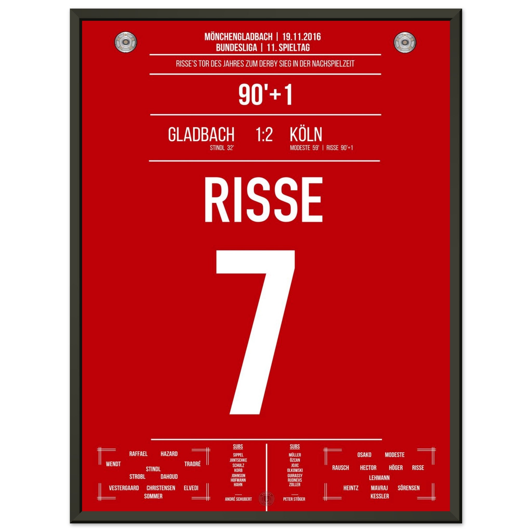 19. November 2016 – Mönchengladbach vs. Köln 1:2: In der 91. Minute hämmert Marcel Risse den Ball aus der Distanz in den Winkel und entscheidet das Derby in allerletzter Sekunde. Ein Tor für die Ewigkeit, ein Gänsehautmoment für ganz Köln. Unser Poster verewigt diesen magischen Derby-Sieg in Rot-Weiß.