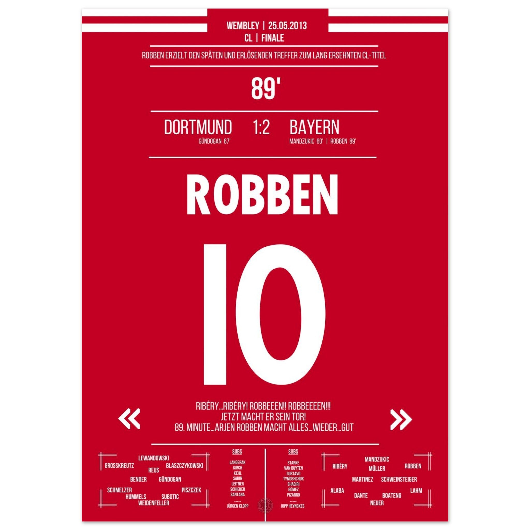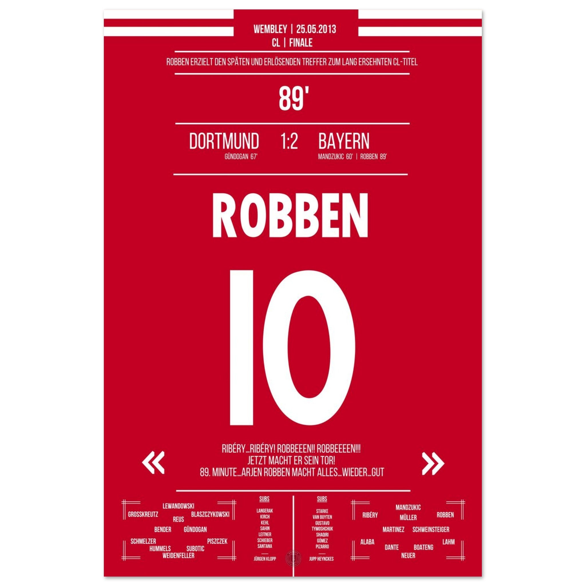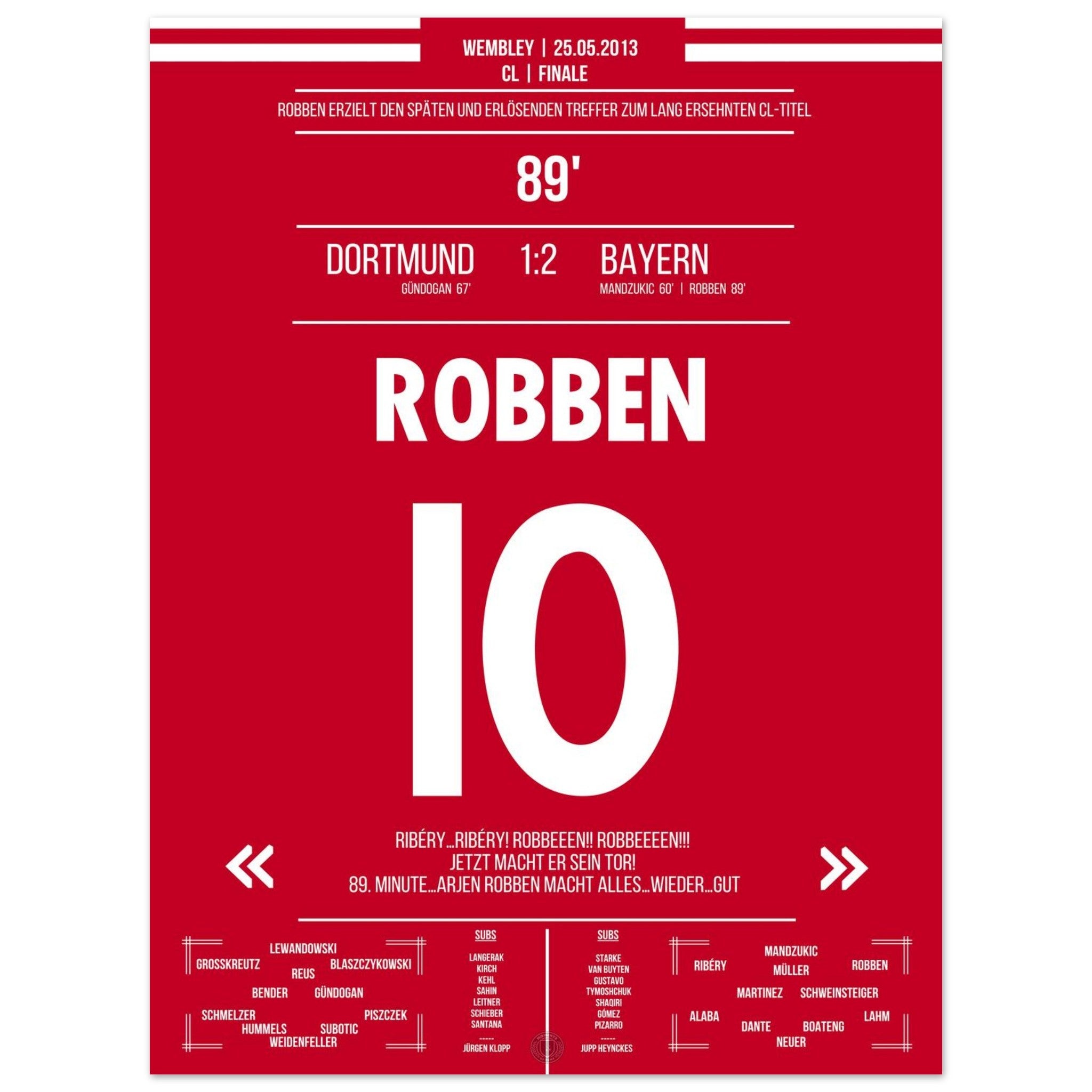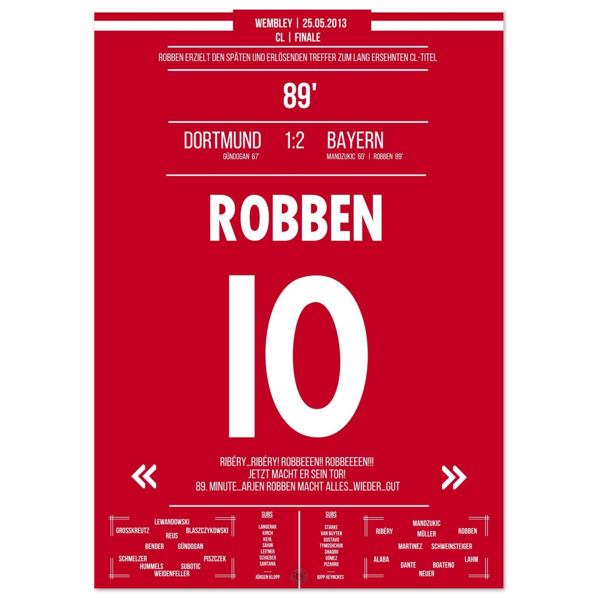 Robben tanzt in der 89. Minute durch die Abwehr und schiebt eiskalt zum Sieg ein. Mit diesem späten Treffer entscheidet er das CL-Finale – Ekstase bei München, bittere Enttäuschung bei Dortmund.