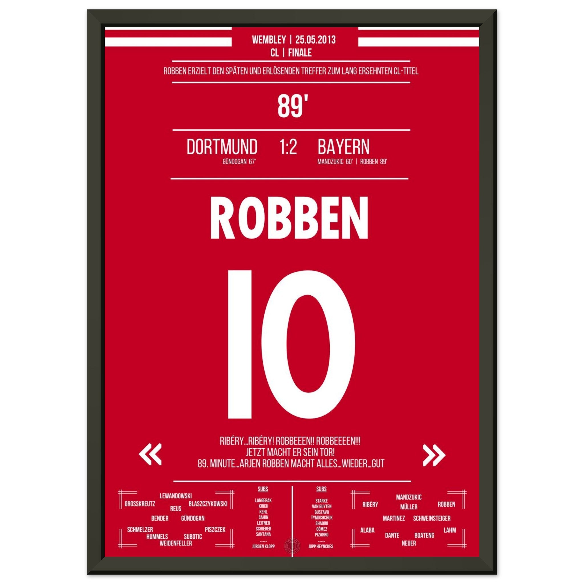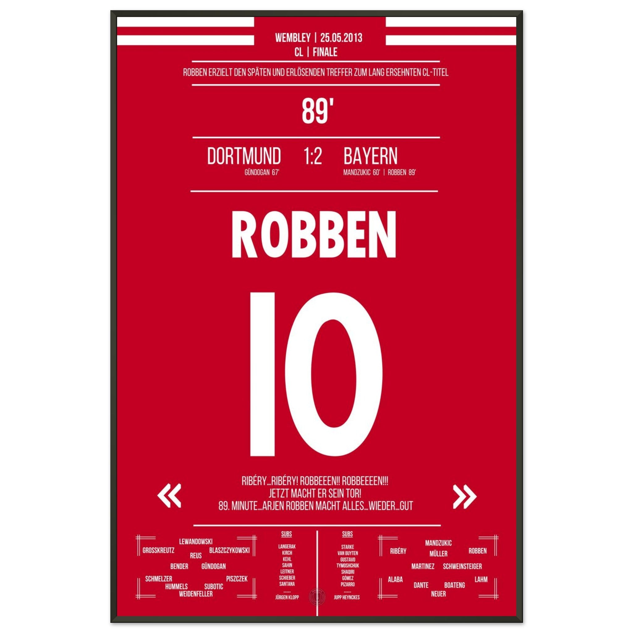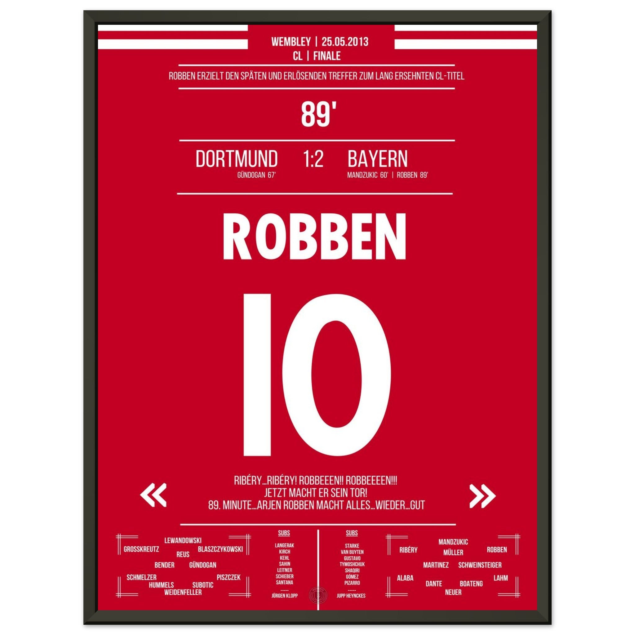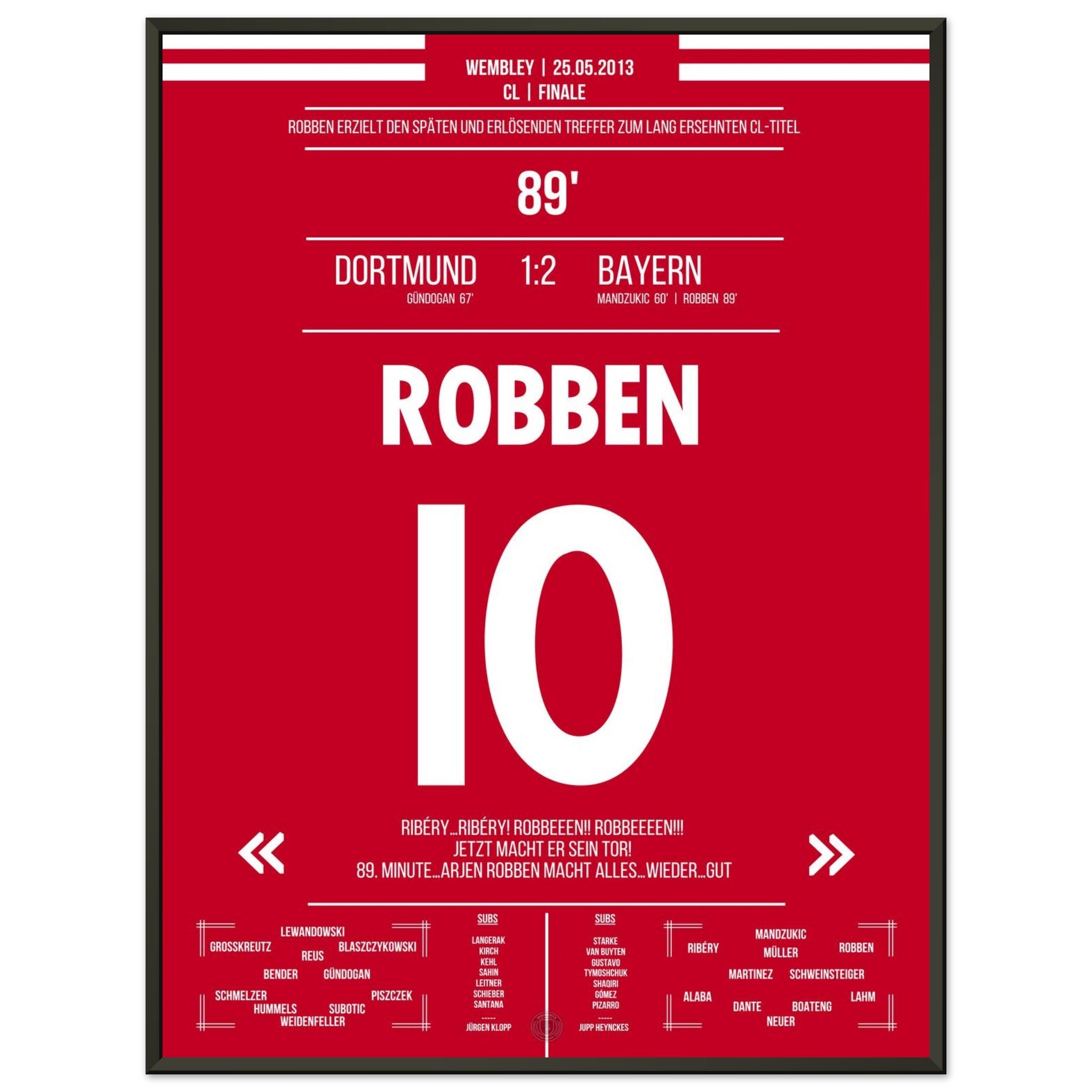 Robben tanzt in der 89. Minute durch die Abwehr und schiebt eiskalt zum Sieg ein. Mit diesem späten Treffer entscheidet er das CL-Finale – Ekstase bei München, bittere Enttäuschung bei Dortmund.