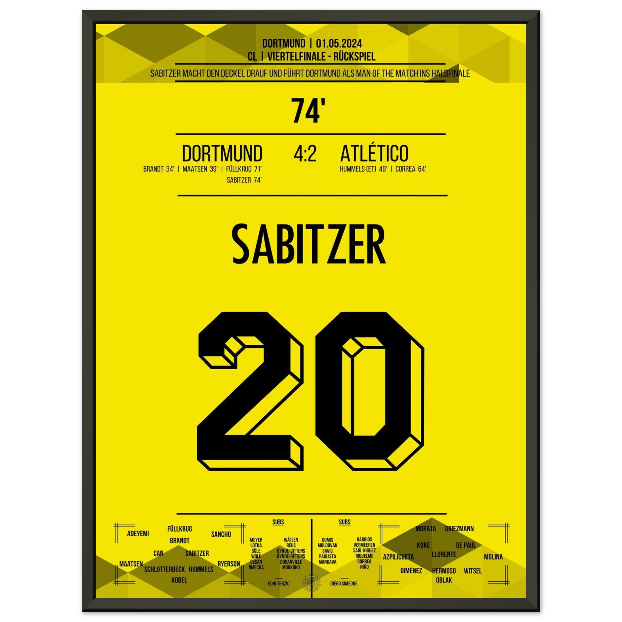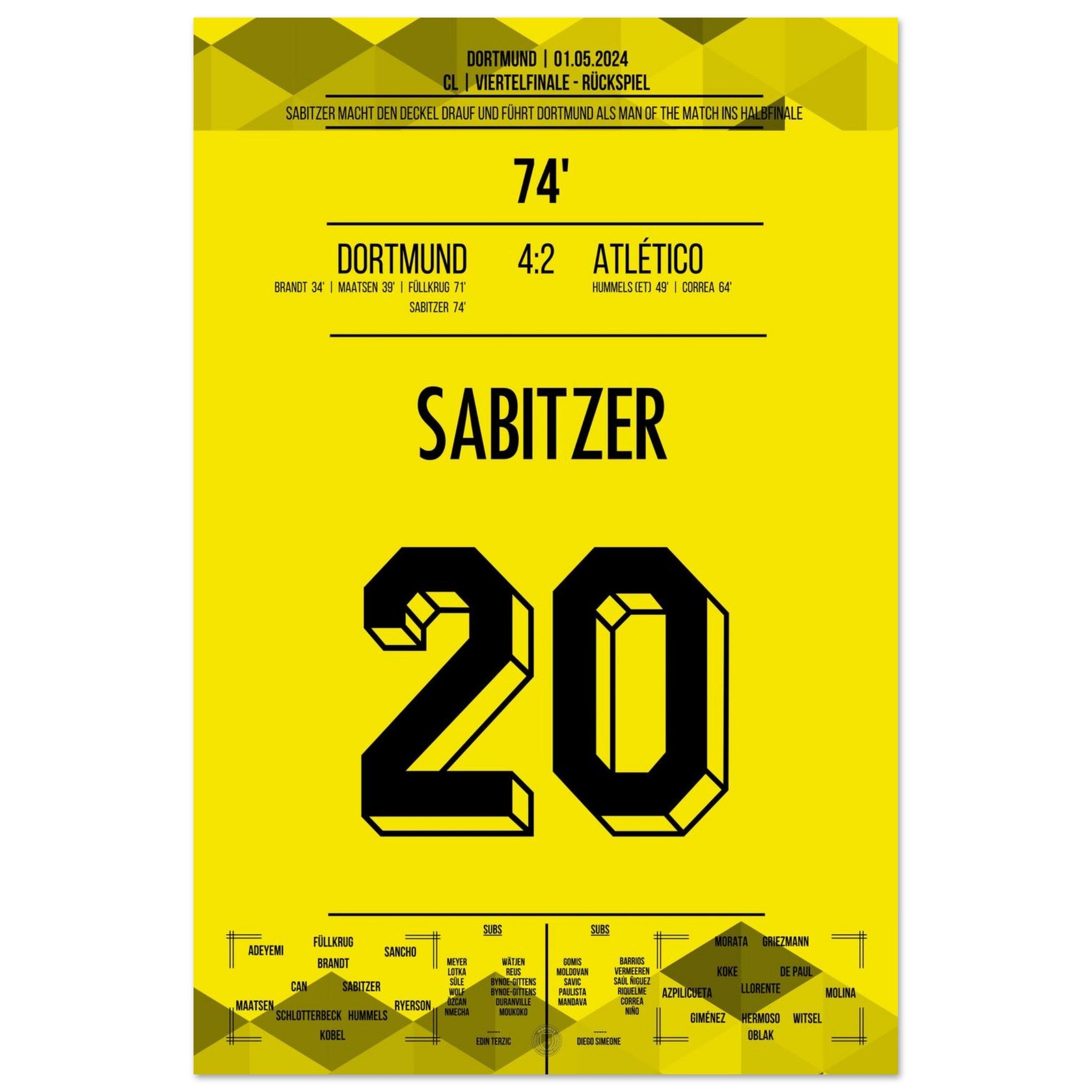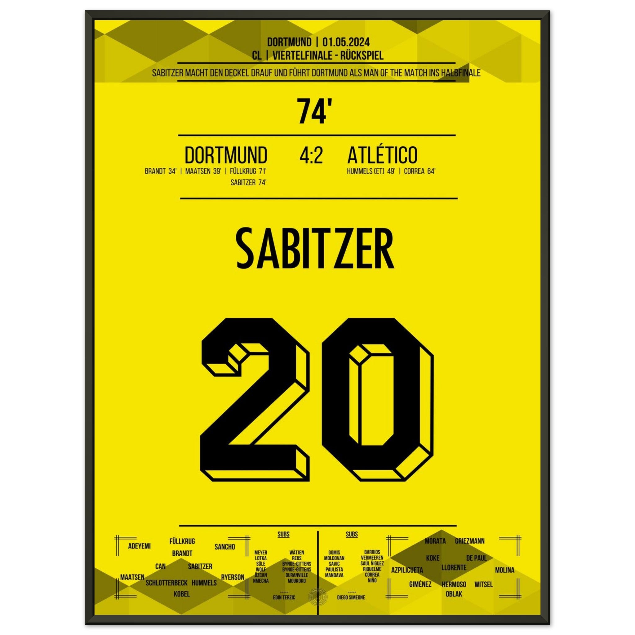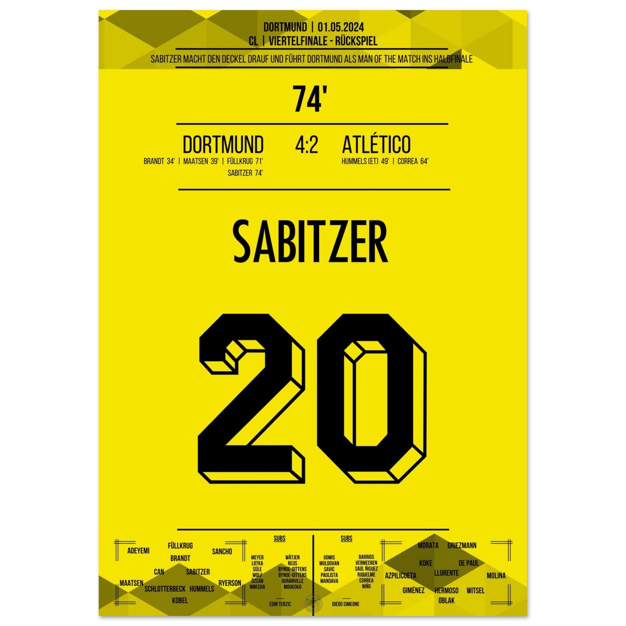 1. Mai 2024 – Dortmund vs. Madrid 4:2: In der 74. Minute trifft Marcel Sabitzer zum 4:2 und krönt Dortmunds furiose Aufholjagd gegen Atlético im Viertelfinal-Rückspiel. Ein Tor für das Halbfinale – und für die Geschichtsbücher. Unser Poster hält diesen magischen Europapokal-Moment fest.