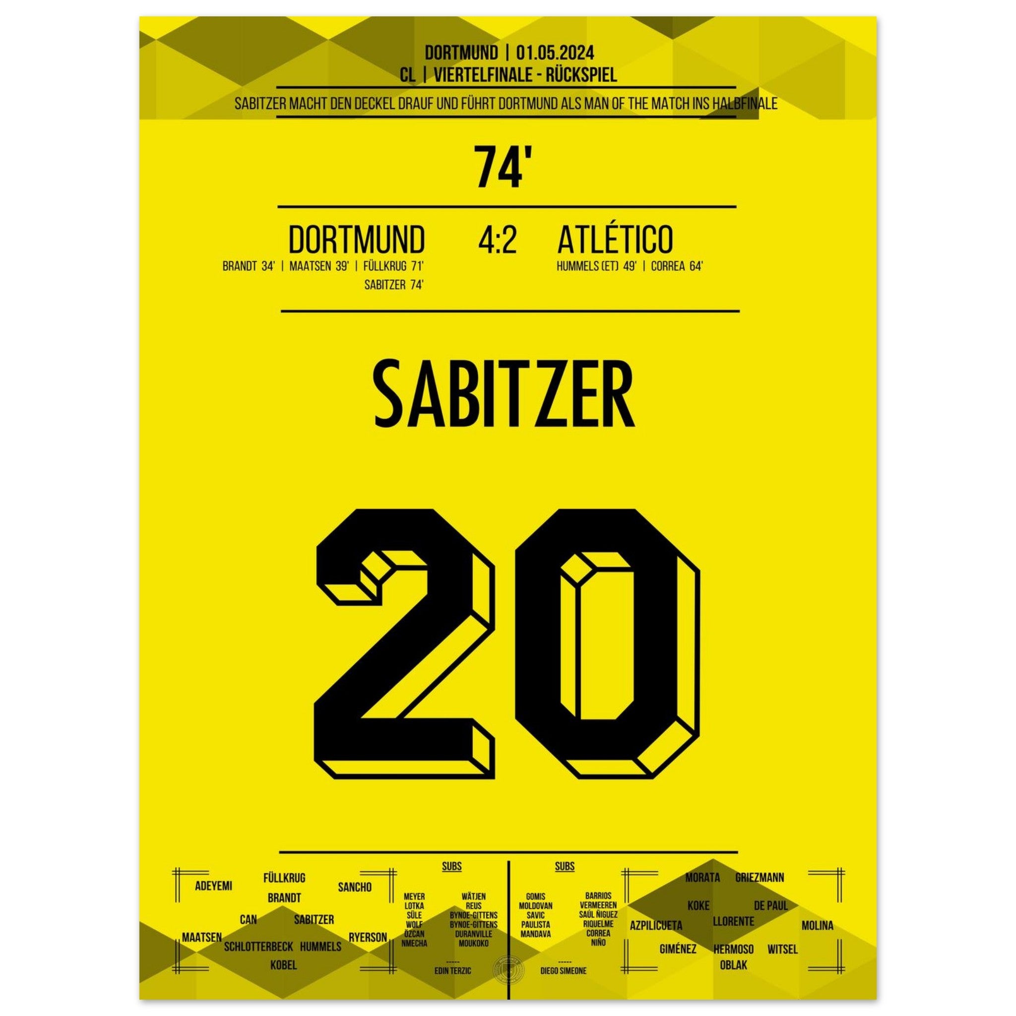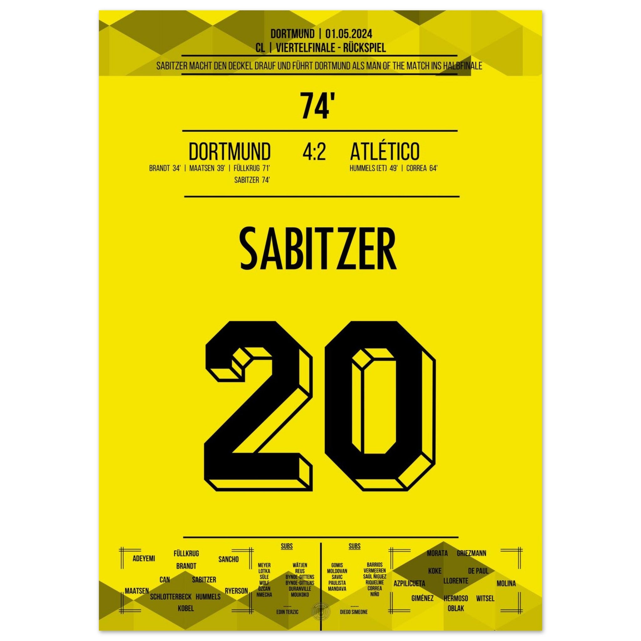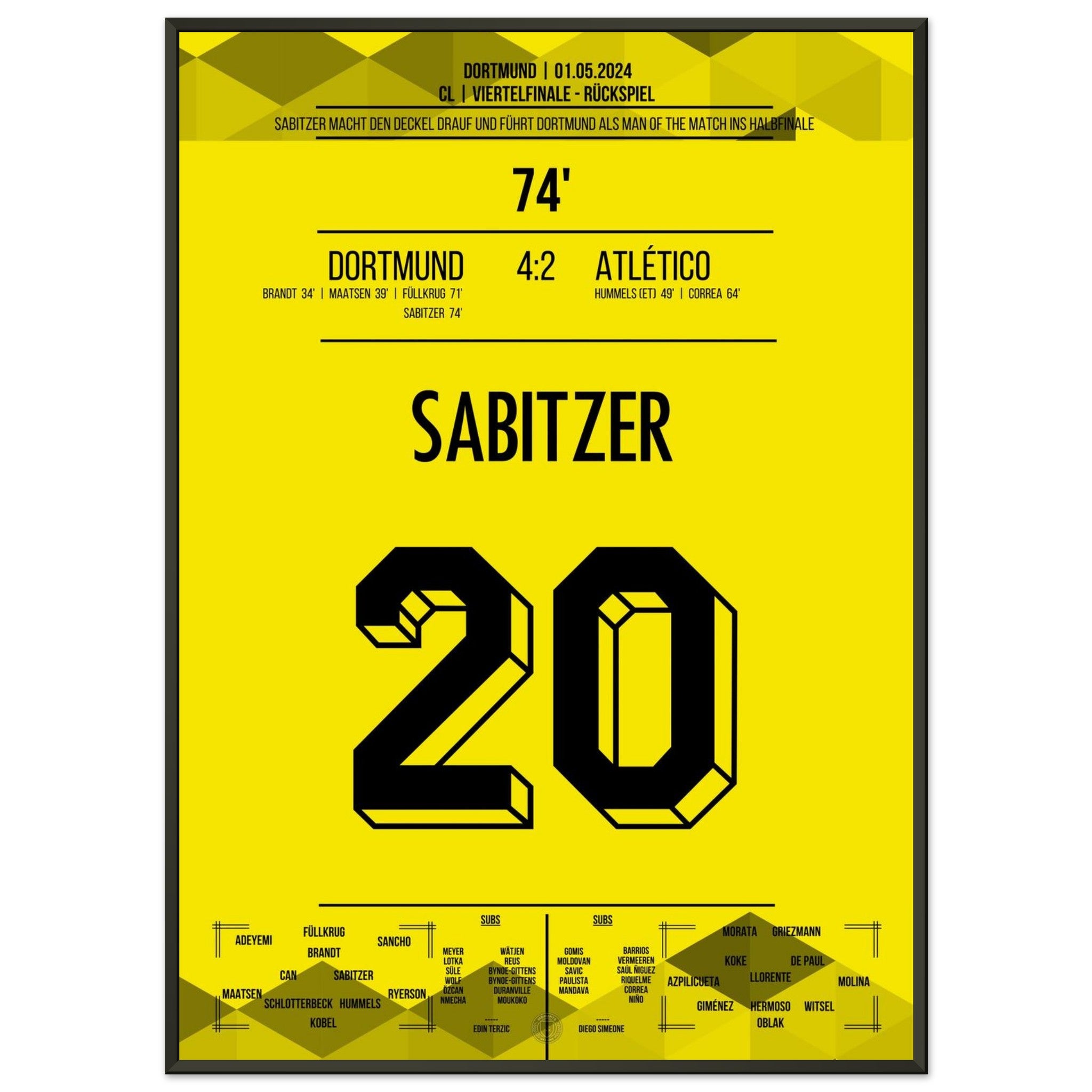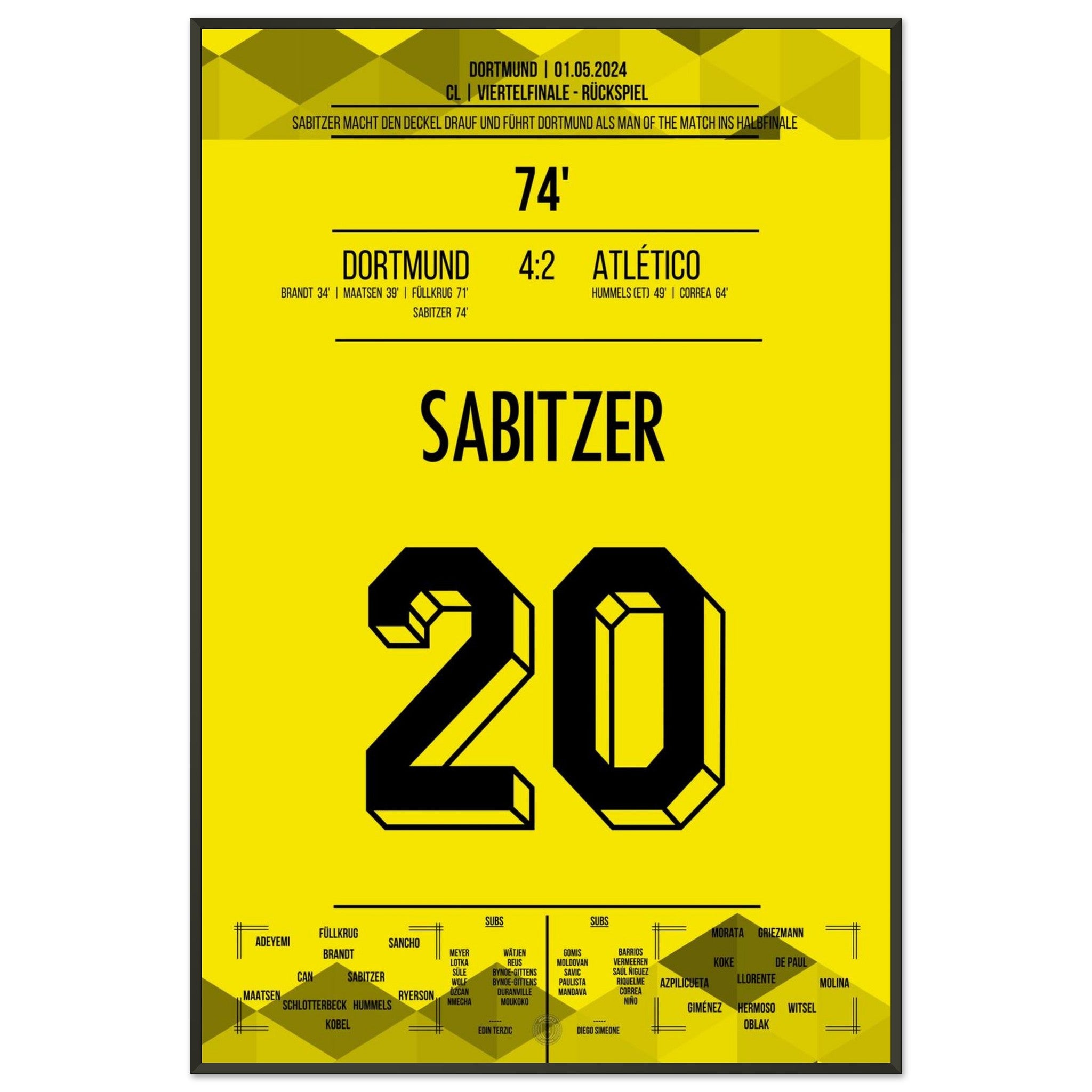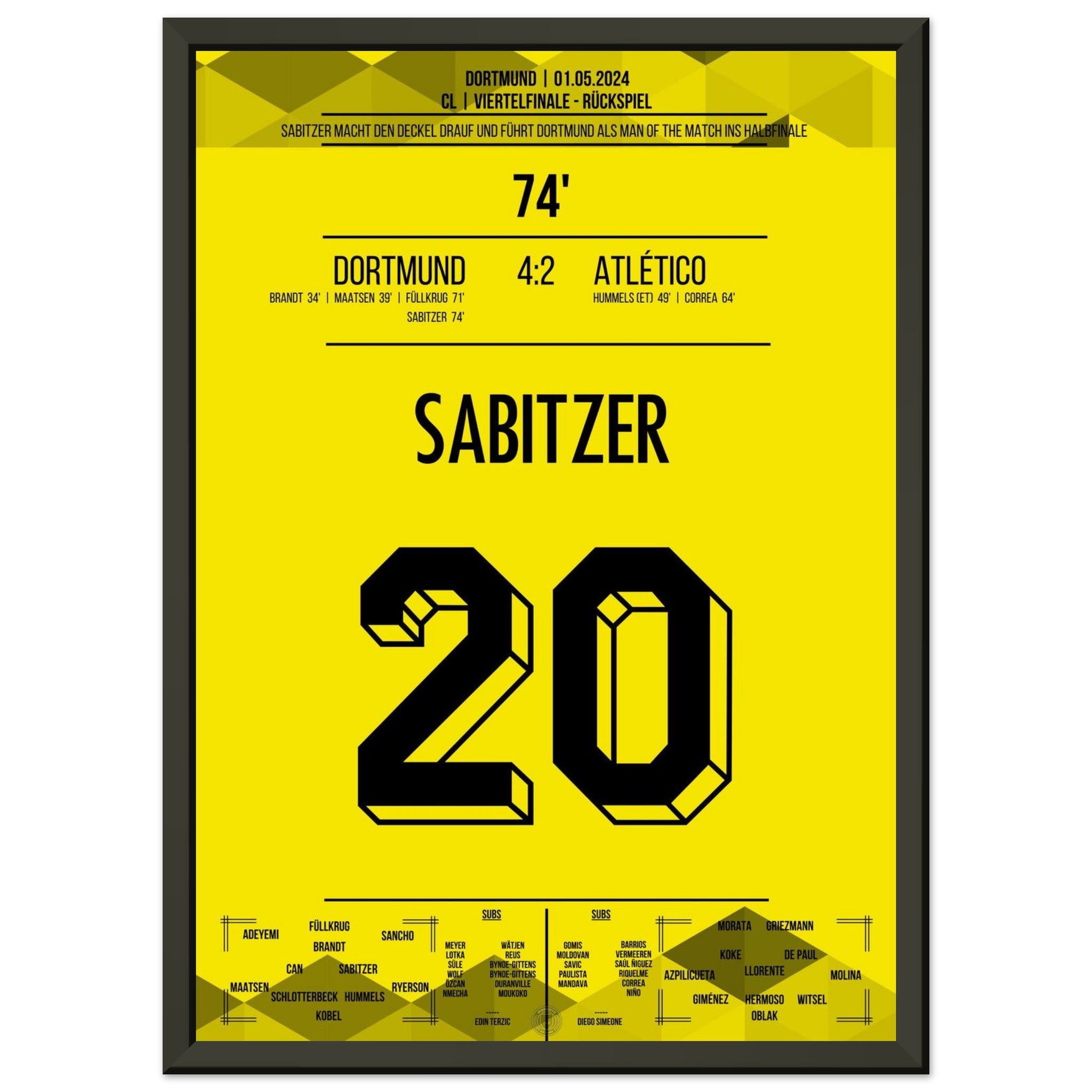 1. Mai 2024 – Dortmund vs. Madrid 4:2: In der 74. Minute trifft Marcel Sabitzer zum 4:2 und krönt Dortmunds furiose Aufholjagd gegen Atlético im Viertelfinal-Rückspiel. Ein Tor für das Halbfinale – und für die Geschichtsbücher. Unser Poster hält diesen magischen Europapokal-Moment fest.