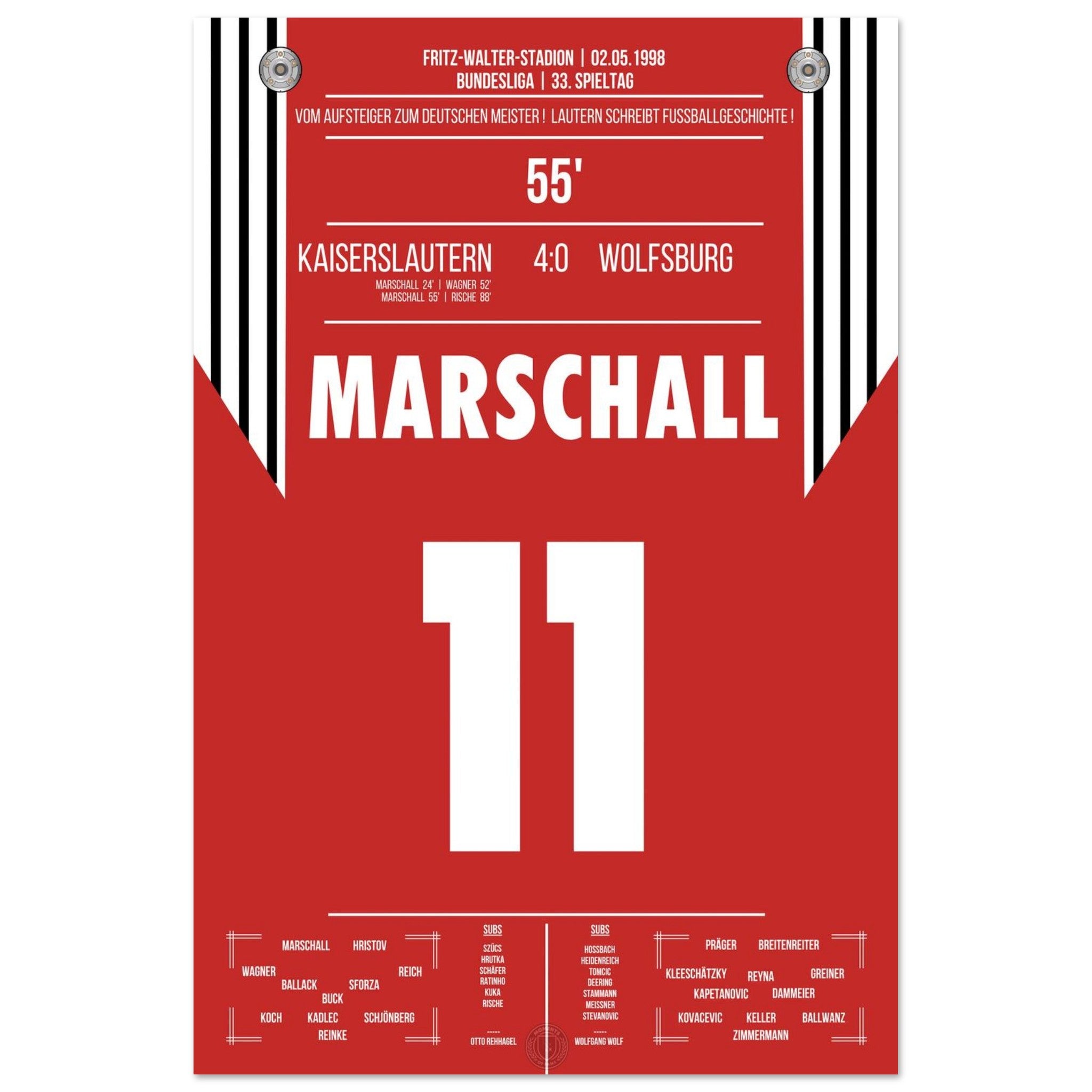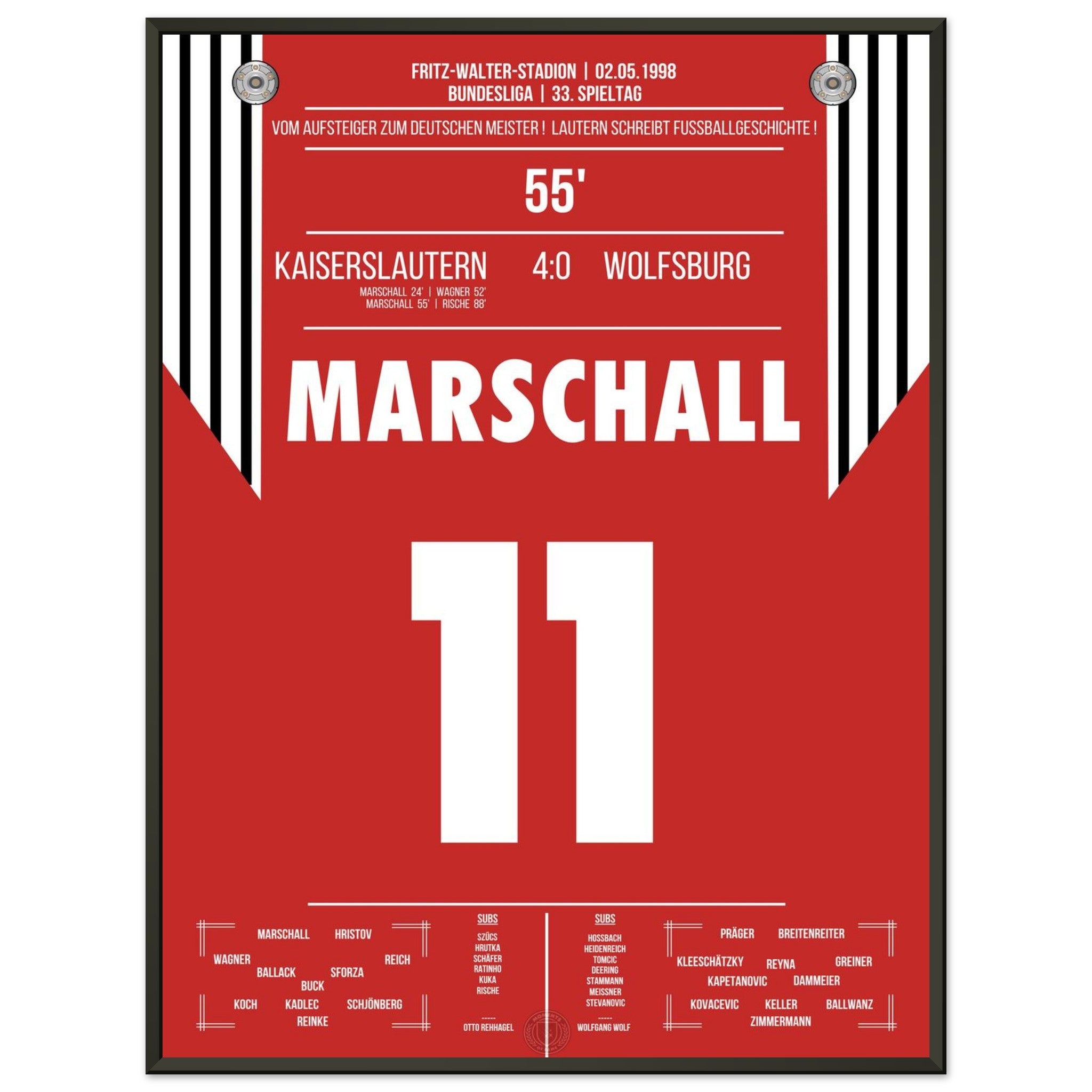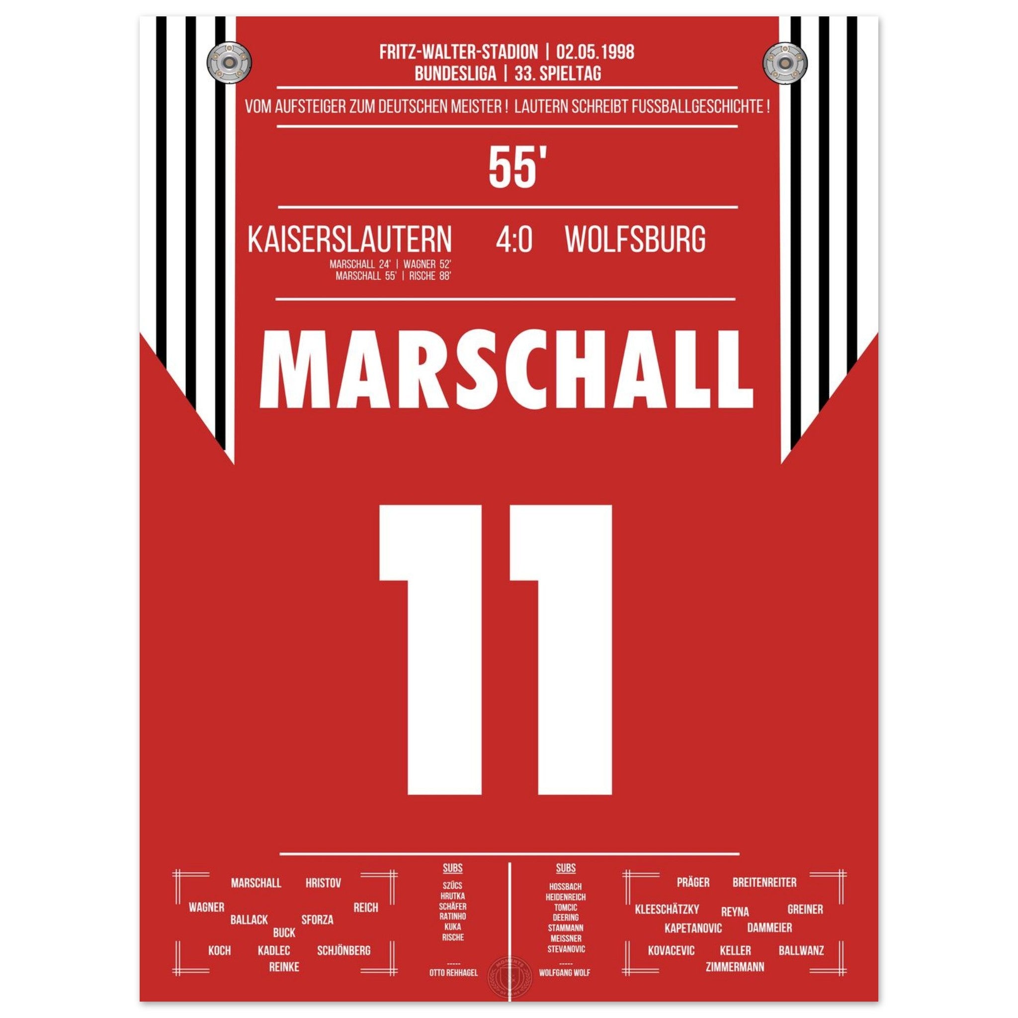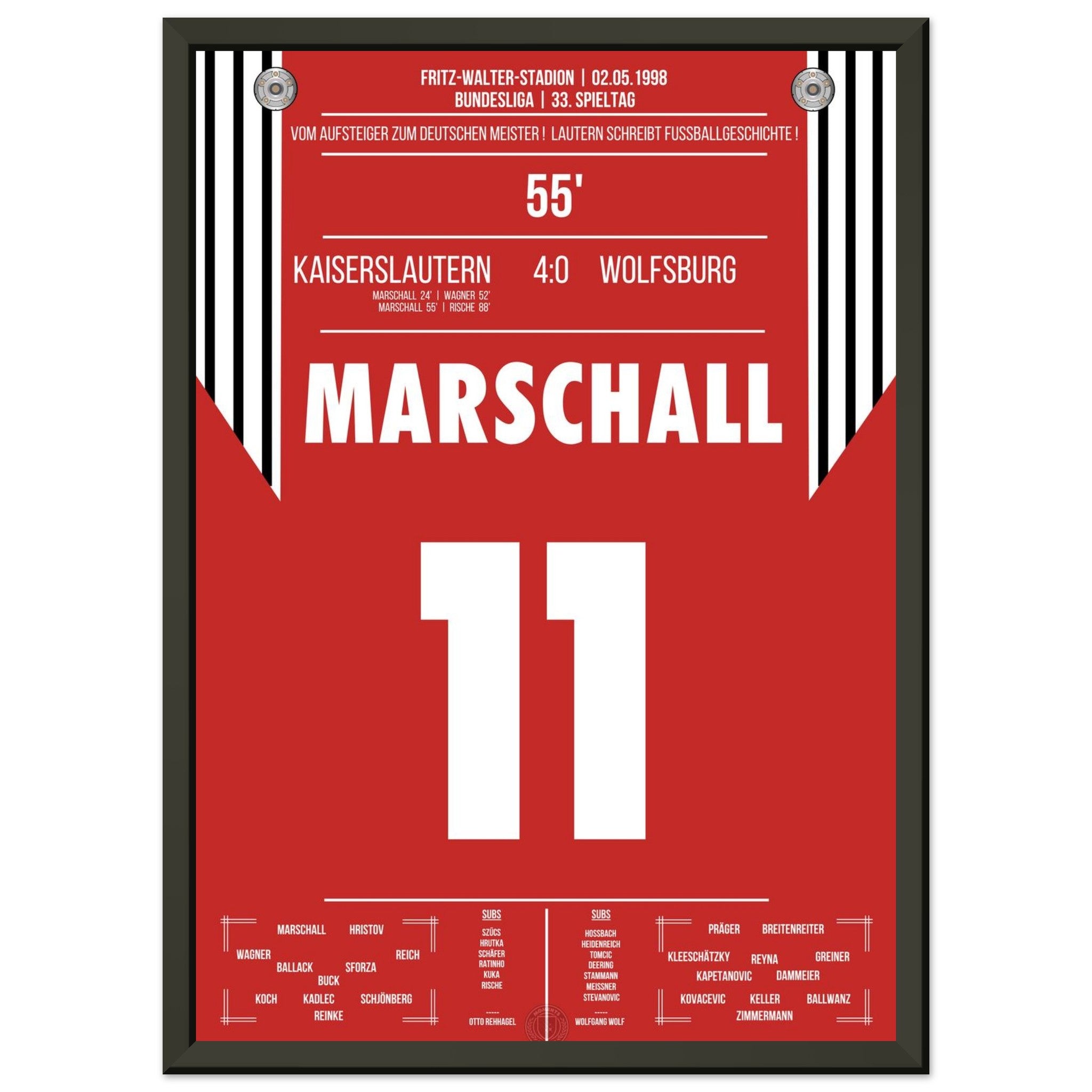 2. Mai 1998 – Kaiserslautern vs. Wolfsburg 4:0: In der 55. Minute trifft Olaf Marschall zum 3:0 und bringt den Betzenberg zum Beben – Lautern steht kurz vor dem sensationellen Meistertitel als Aufsteiger. Ein Tor für die Geschichtsbücher. Unser Poster verewigt diesen magischen Moment in Rot-Weiß.