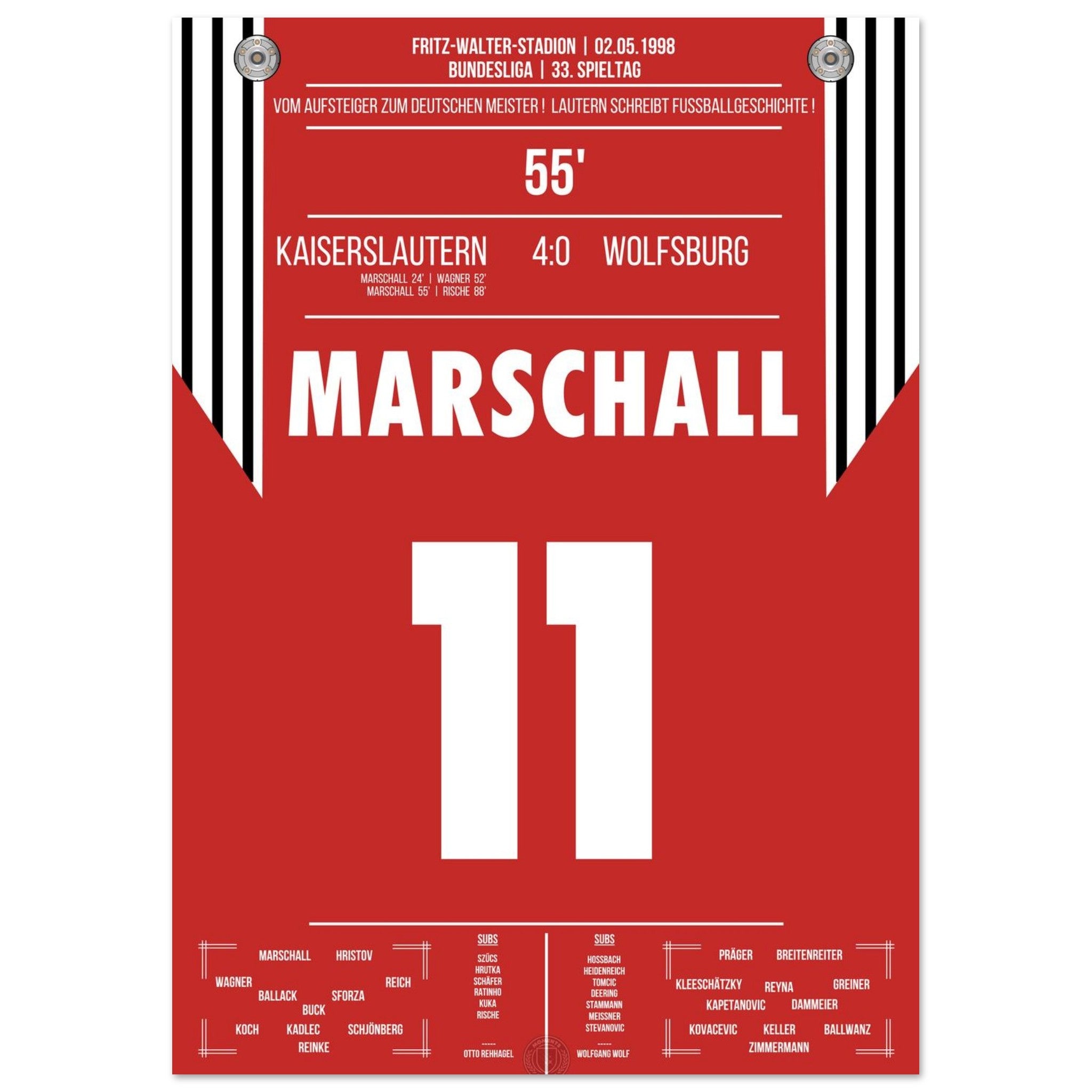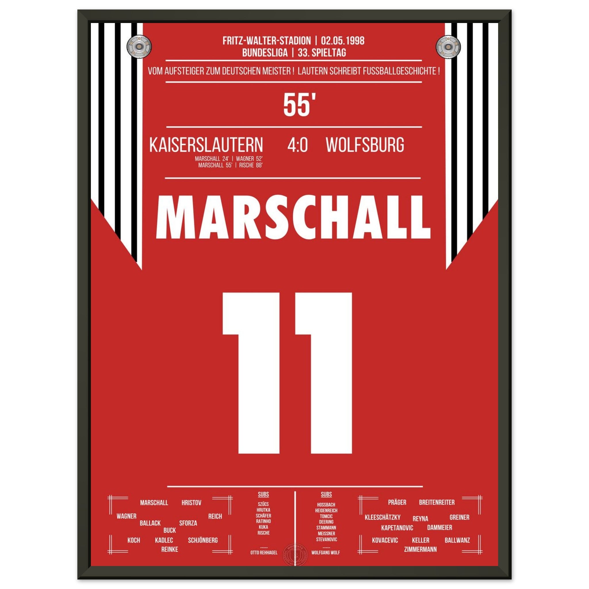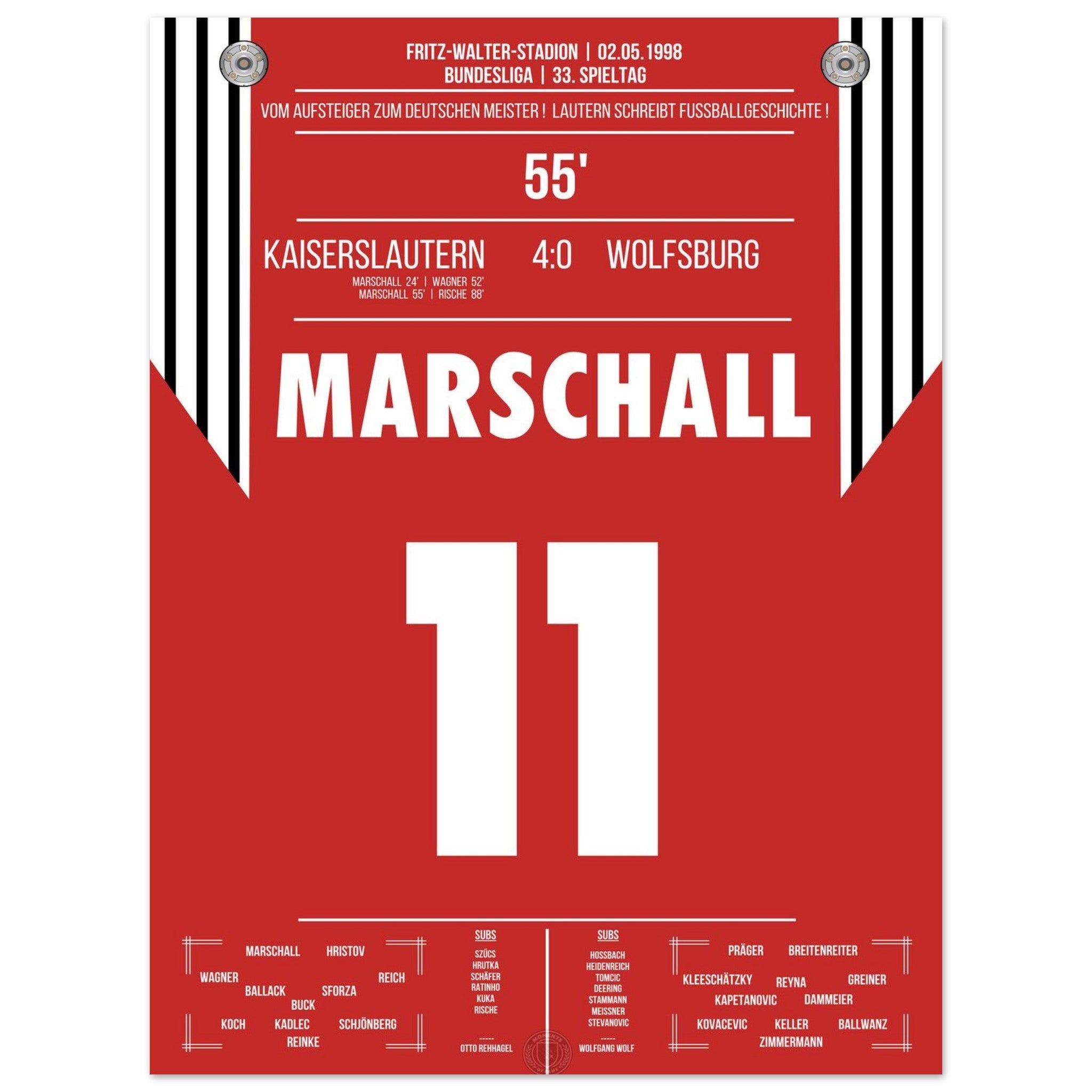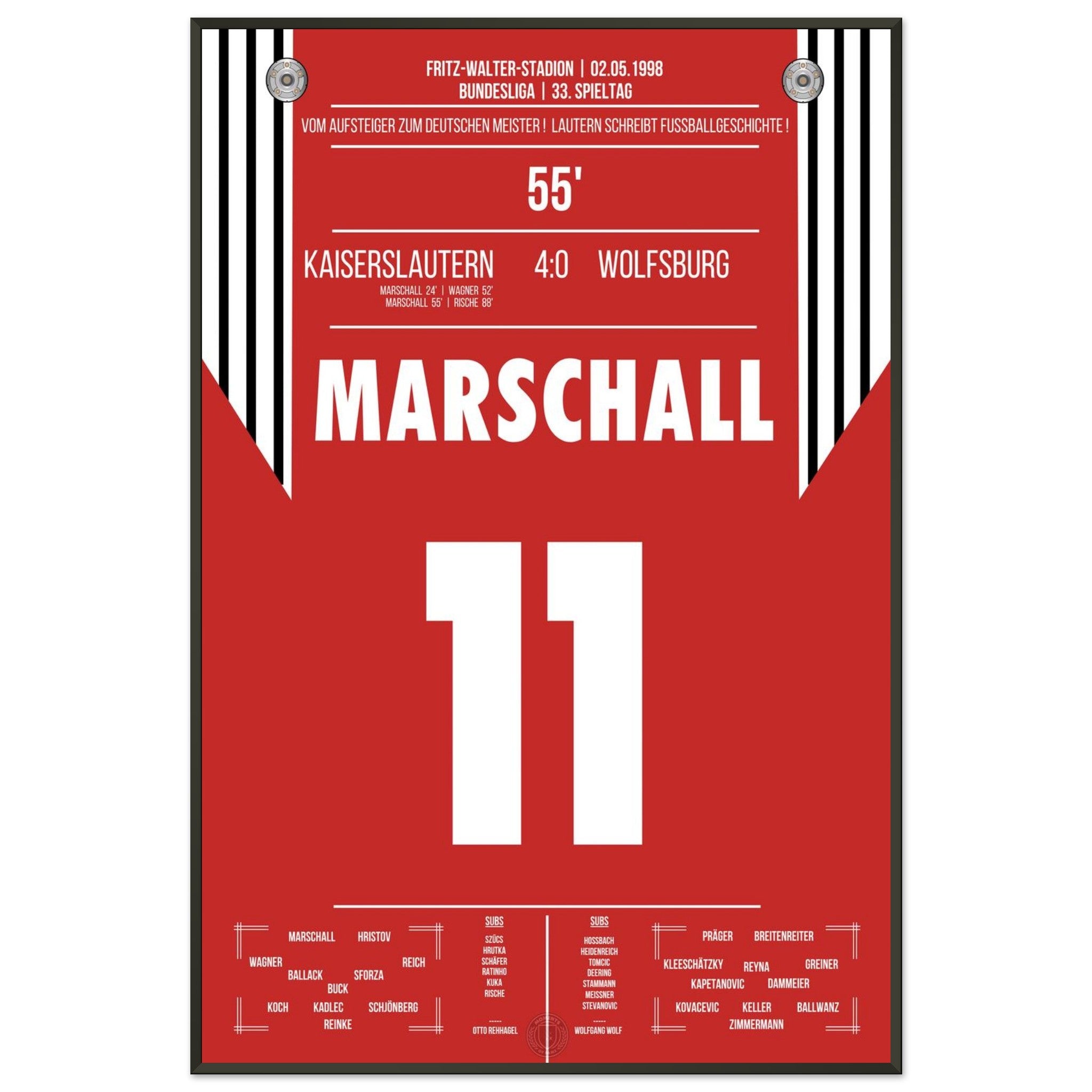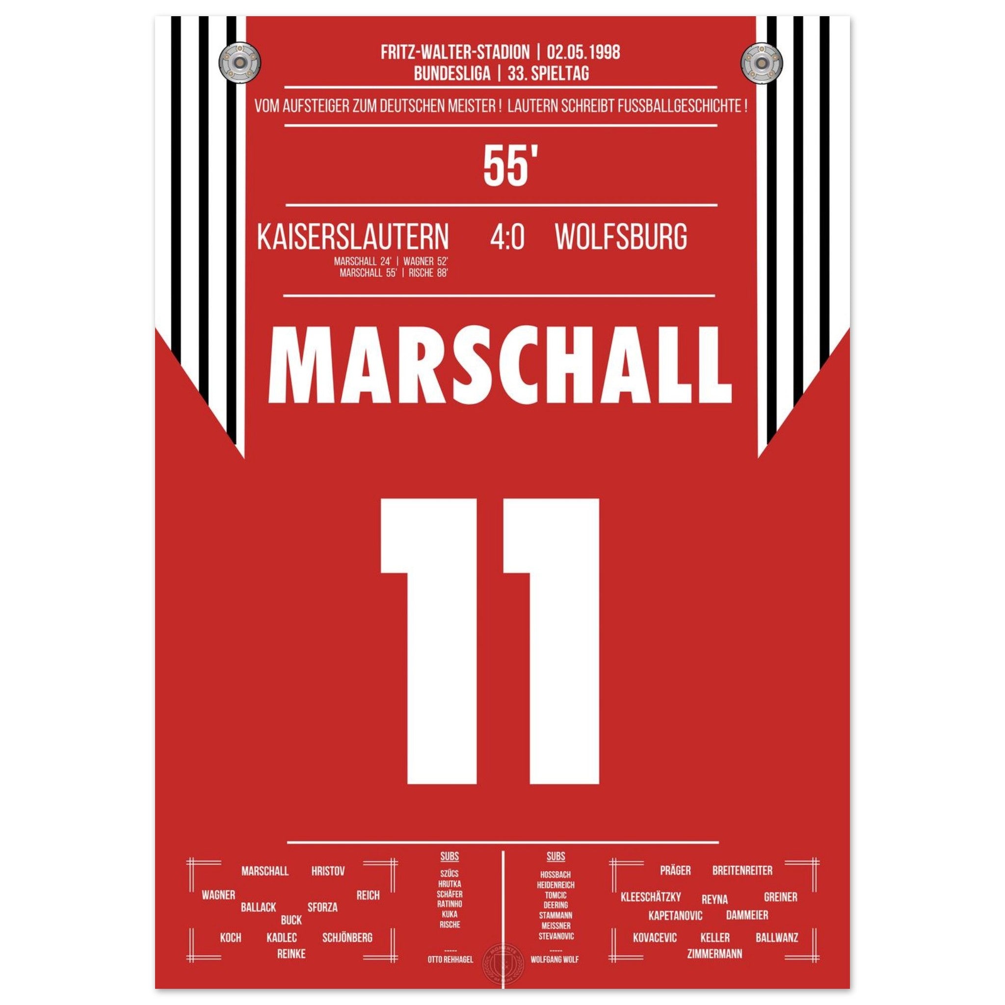 2. Mai 1998 – Kaiserslautern vs. Wolfsburg 4:0: In der 55. Minute trifft Olaf Marschall zum 3:0 und bringt den Betzenberg zum Beben – Lautern steht kurz vor dem sensationellen Meistertitel als Aufsteiger. Ein Tor für die Geschichtsbücher. Unser Poster verewigt diesen magischen Moment in Rot-Weiß.