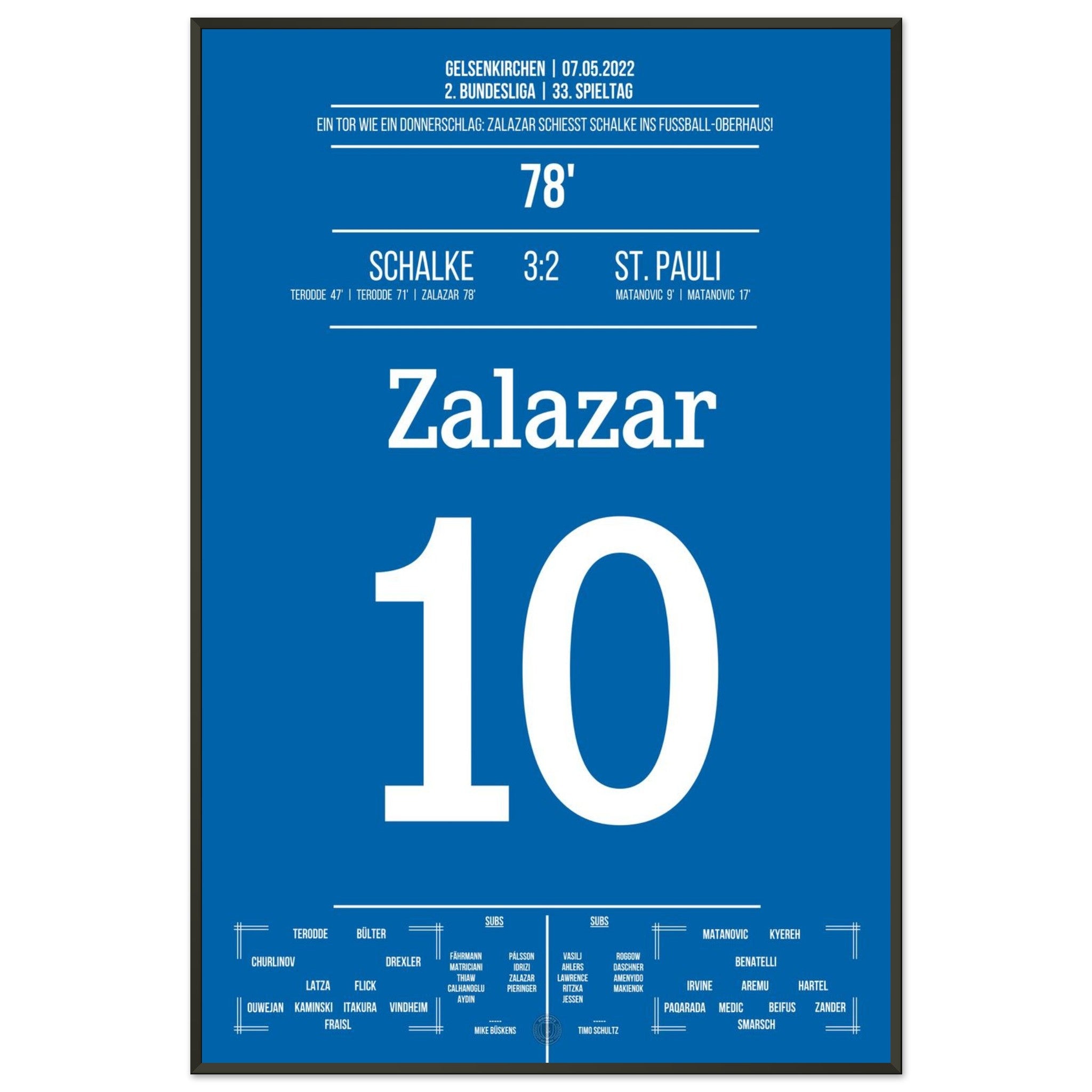 7. Mai 2022 – Schalke vs. St. Pauli 3:2: Rodrigo Zalazar krönt Schalkes Aufstieg mit einem Traumtor zum 3:2 – das Stadion explodiert, der direkte Wiederaufstieg ist perfekt. Emotionen pur auf dem Rasen und den Rängen. Unser Poster hält diesen magischen Moment in Königsblau für die Ewigkeit fest.