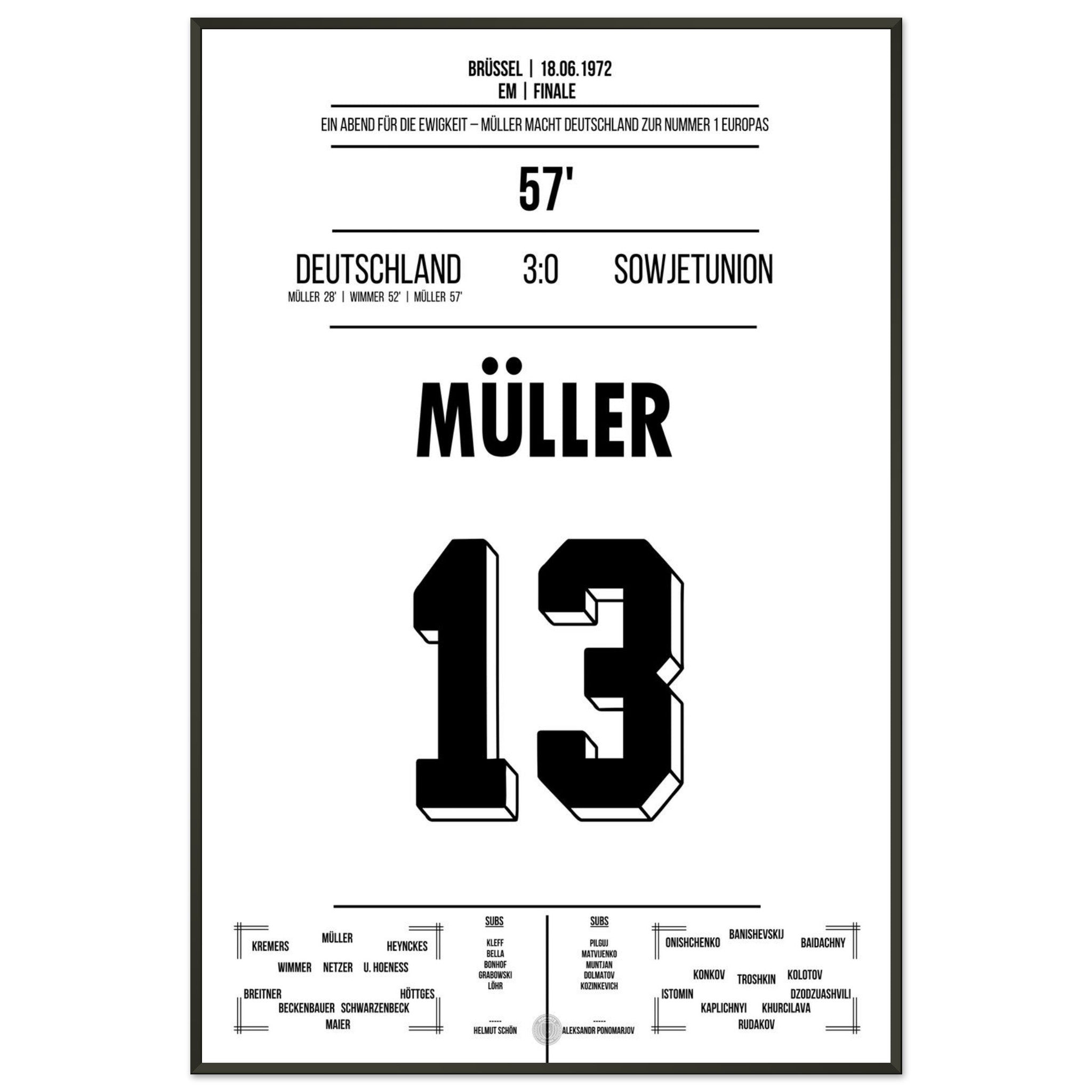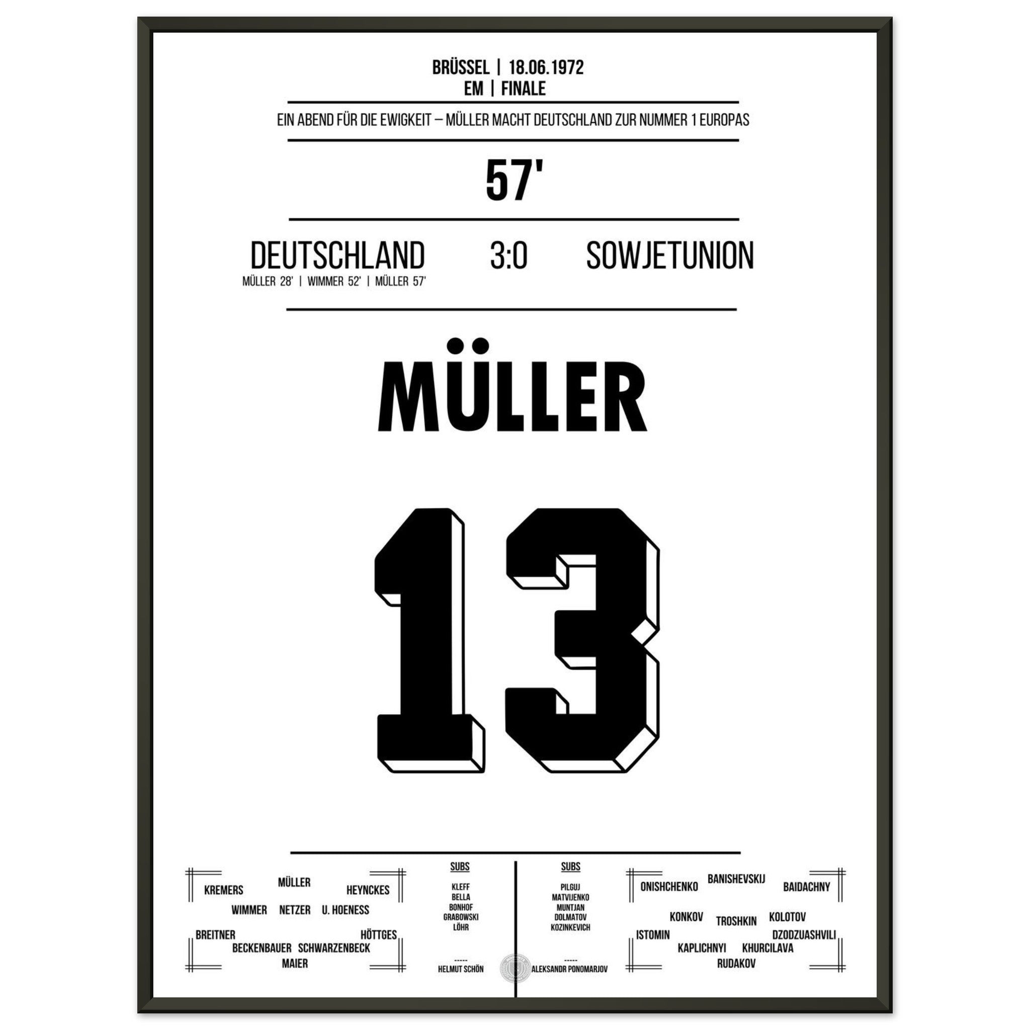 18. Juni 1972 – Deutschland vs. Sowjetunion 3:0: Im EM-Finale zeigt Gerd Müller einmal mehr seinen Torinstinkt und trifft doppelt gegen die Sowjetunion. Deutschland krönt sich zum ersten Mal zum Europameister – angeführt vom „Bomber der Nation“. Unser Poster feiert Müllers Meisterstück in Brüssel.