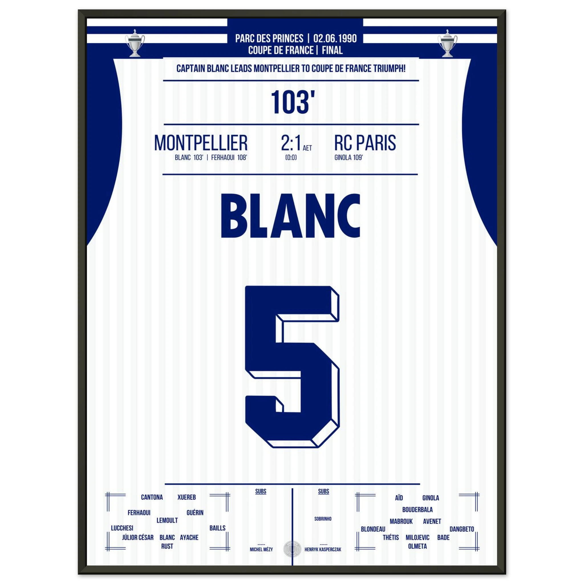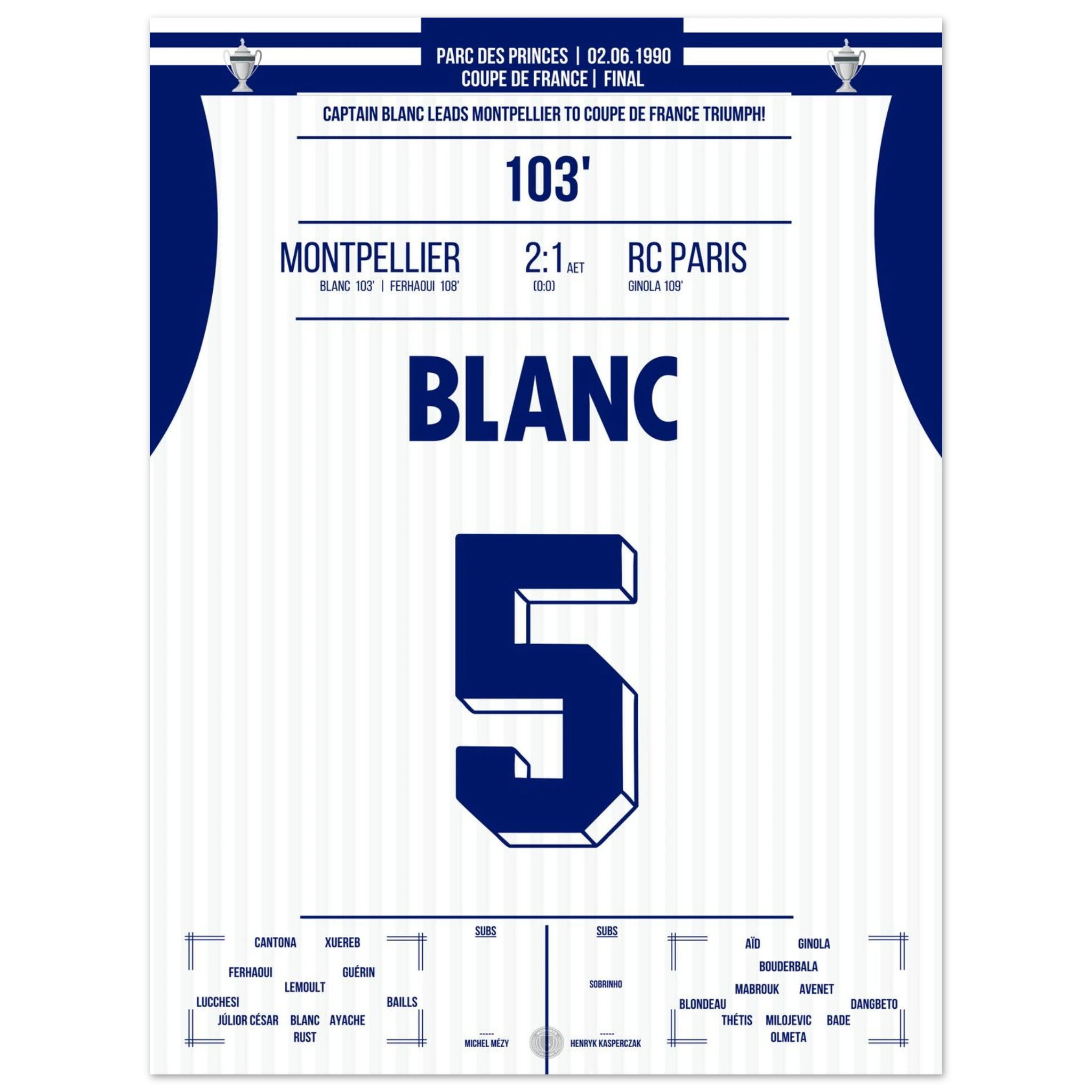 Ein packendes Pokalfinale, das erst in der Verlängerung entschieden wird: Laurent Blanc avanciert zum Helden des Abends, als er den entscheidenden Treffer erzielt und Montpellier den zweiten großen Titel der Vereinsgeschichte schenkt.
