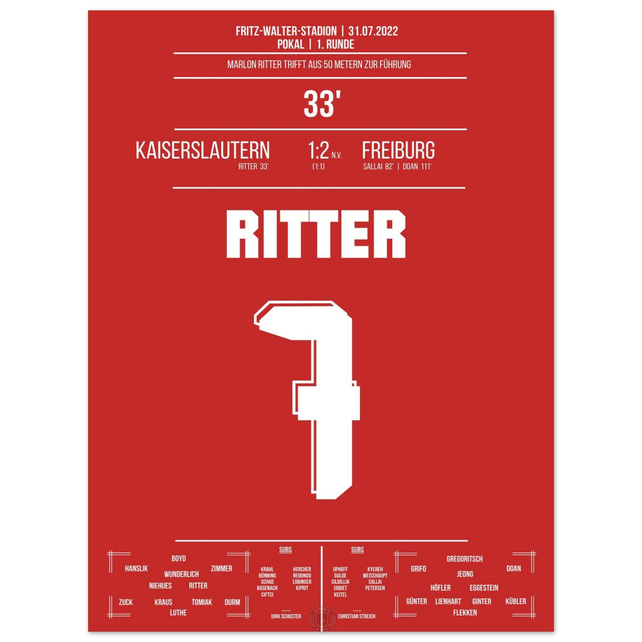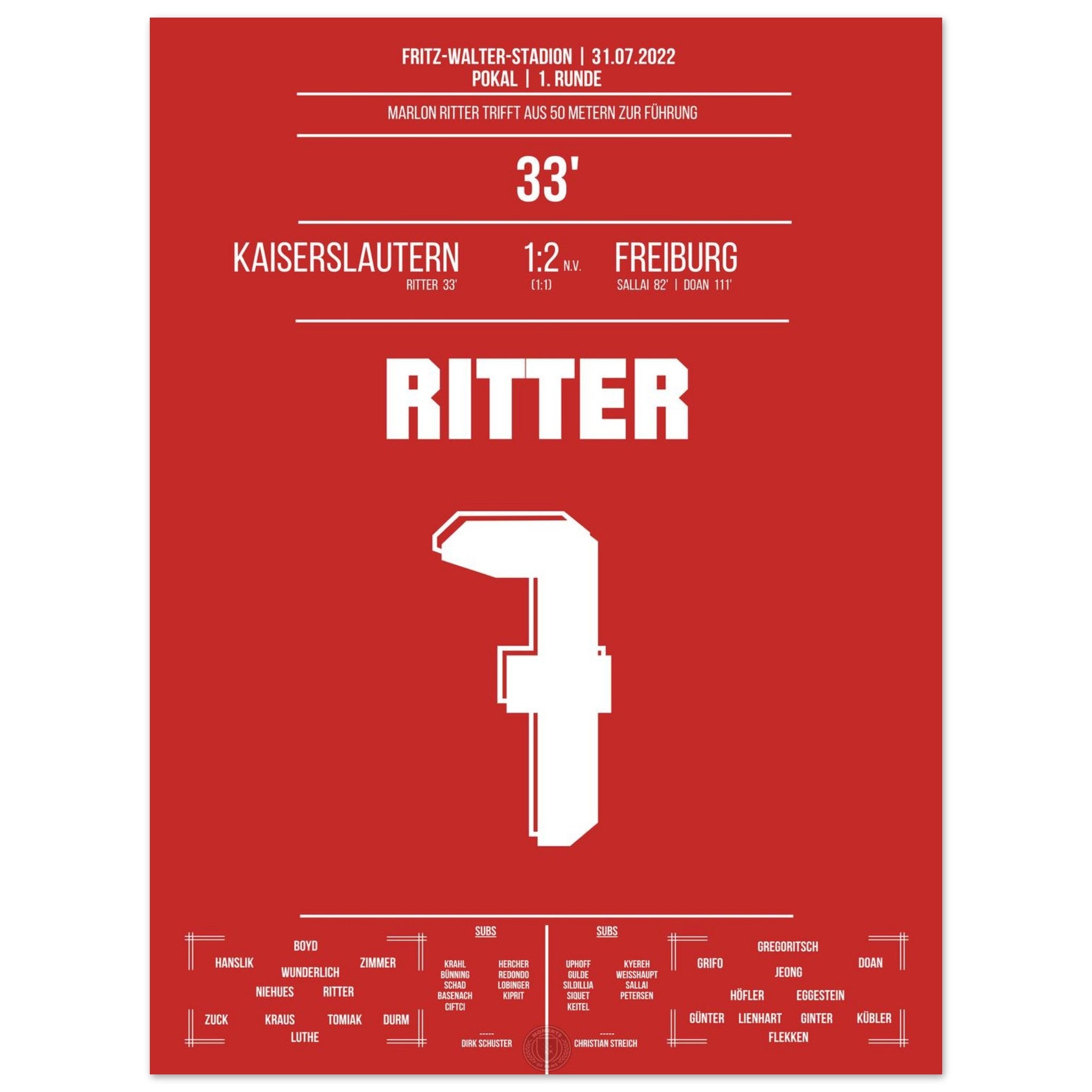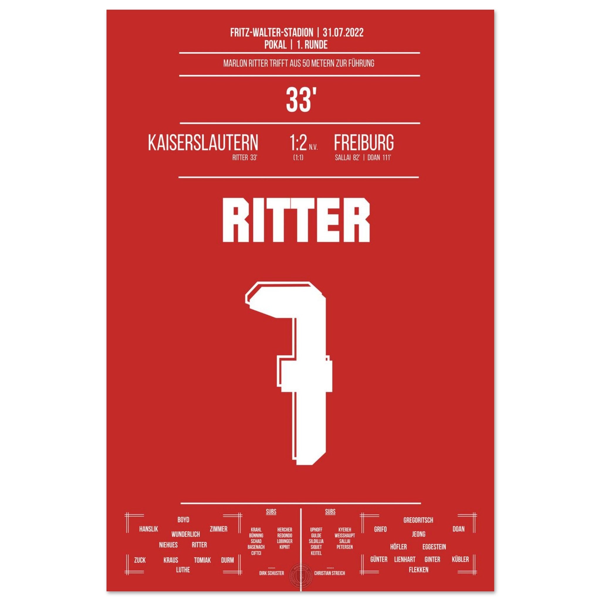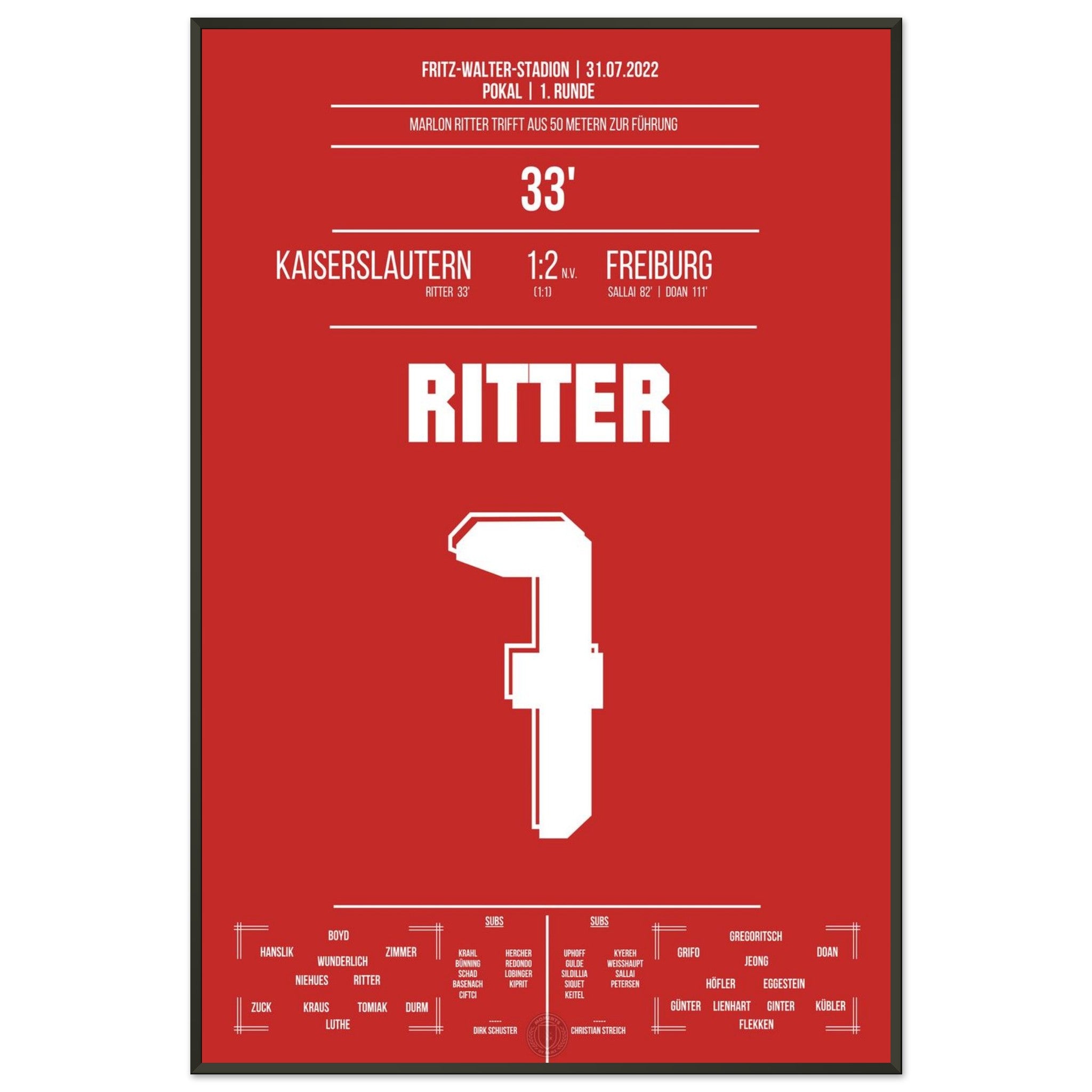 31. Juli 2022 – Kaiserslautern vs. Freiburg 1:2: In der 33. Minute trifft Marlon Ritter mit einem satten Schuss zur Führung im Pokal gegen den Bundesligisten – der Betzenberg bebt. Auch wenn es am Ende nicht zum Weiterkommen reicht, bleibt dieser Moment unvergessen. Unser Poster hält diesen Pokalmoment in Rot-Weiß fest.