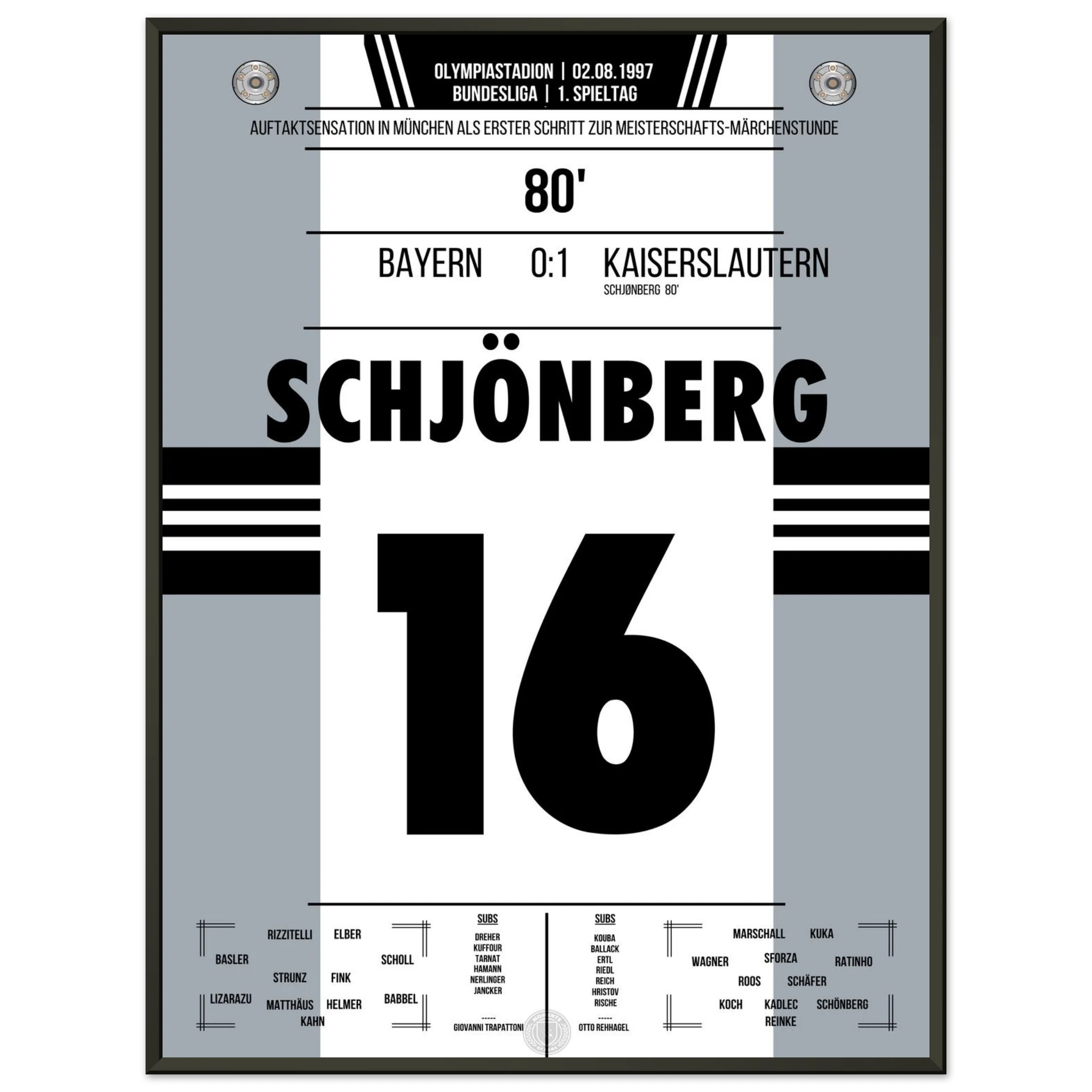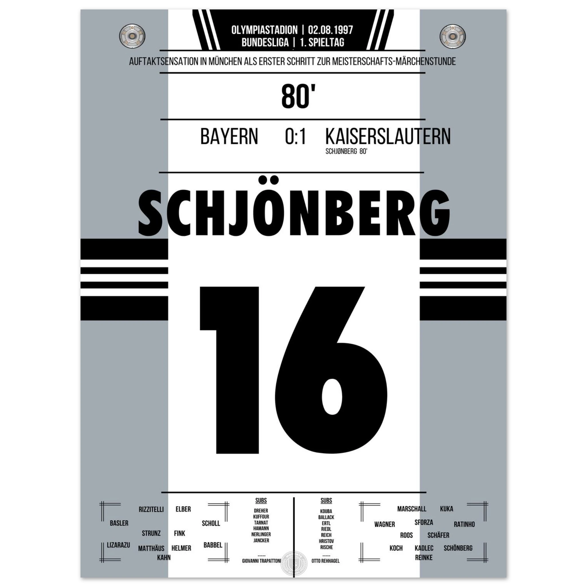 2. August 1997 – München vs. Kaiserslautern 0:1: In der 80. Minute trifft Michael Schjønberg nach einer Ecke zum 1:0 und sorgt für eine der größten Überraschungen der Bundesliga-Geschichte – Aufsteiger Kaiserslautern schlägt den Titelverteidiger Bayern am ersten Spieltag. Der Start in eine sensationelle Meisterschaftssaison. Unser Poster verewigt diesen historischen Moment.