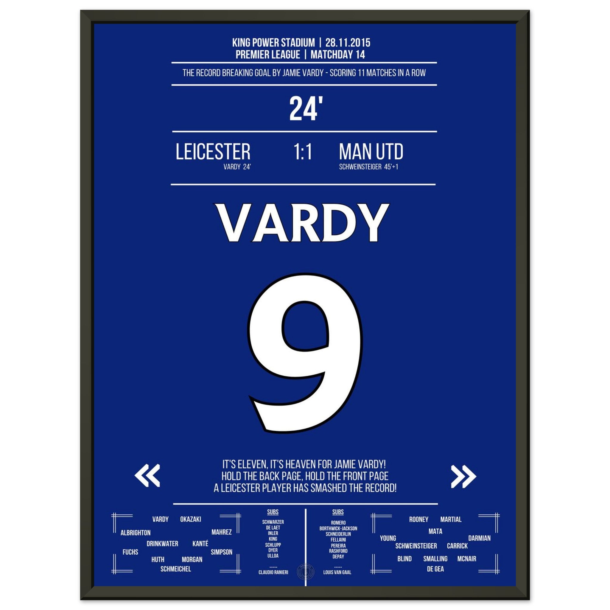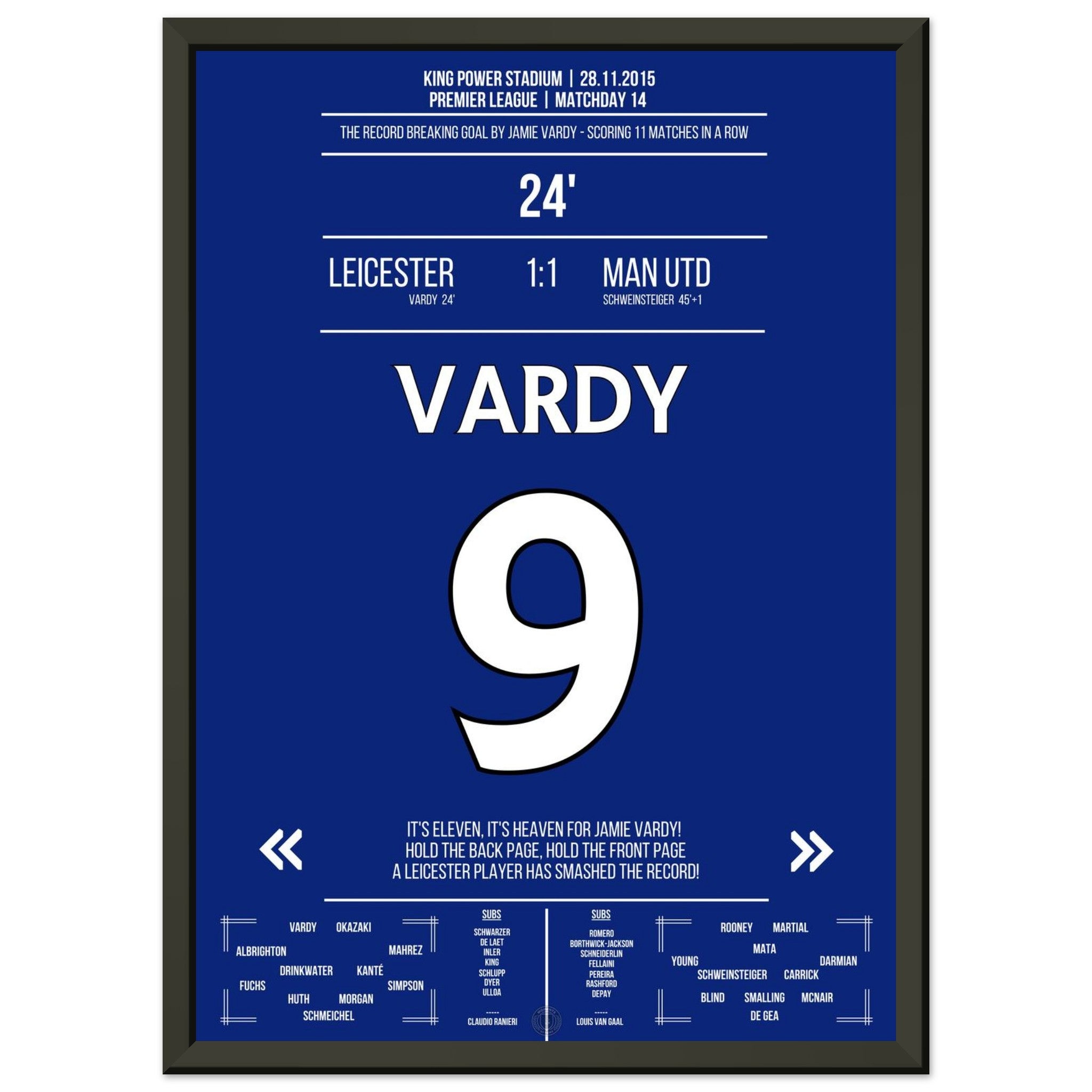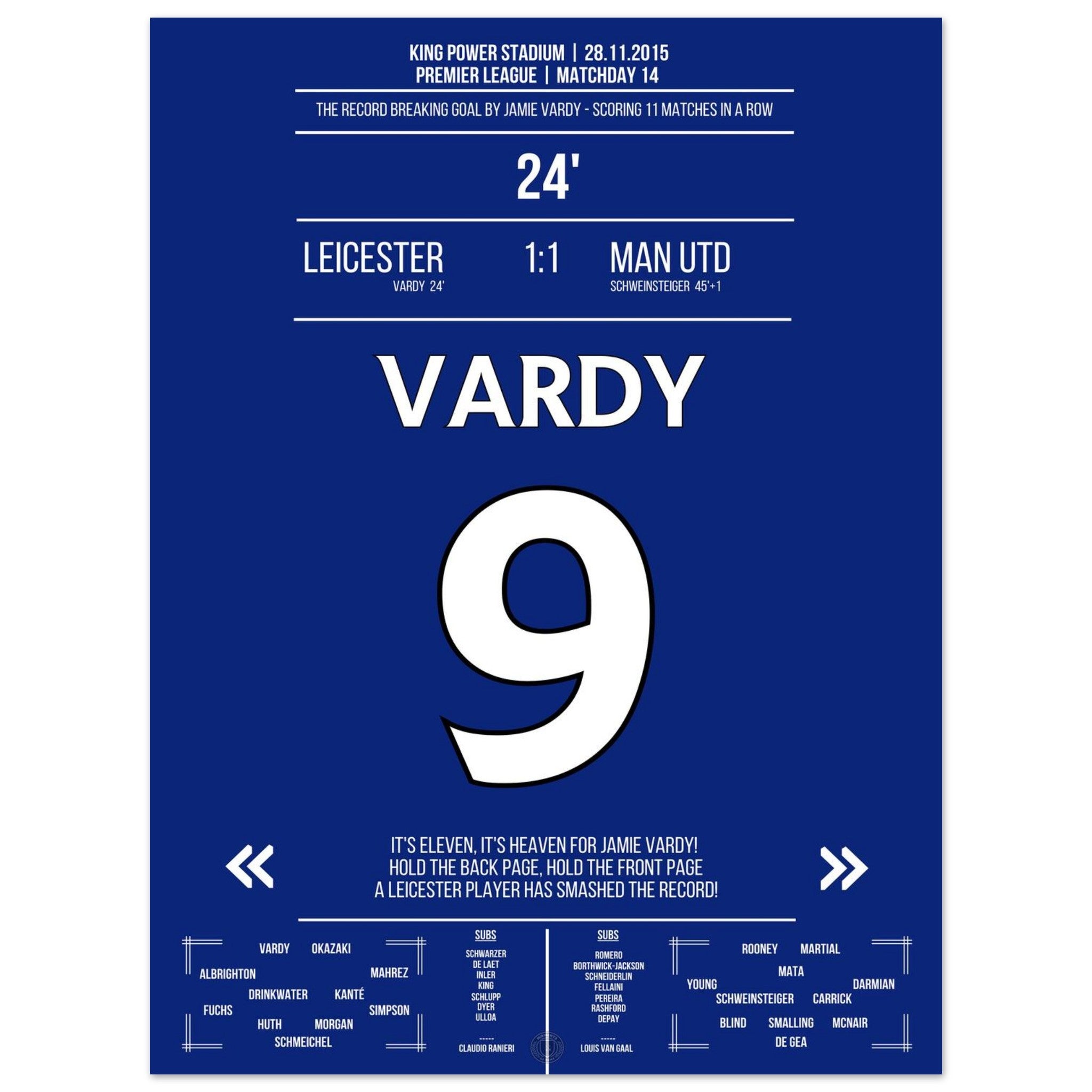 Jamie Vardy schreibt Premier-League-Geschichte: In der 24. Minute trifft er zum elften Mal in Folge – nie zuvor gelang einem Spieler eine solche Torserie. Ein eiskalter Abschluss gegen De Gea, ein Rekord für die Ewigkeit.