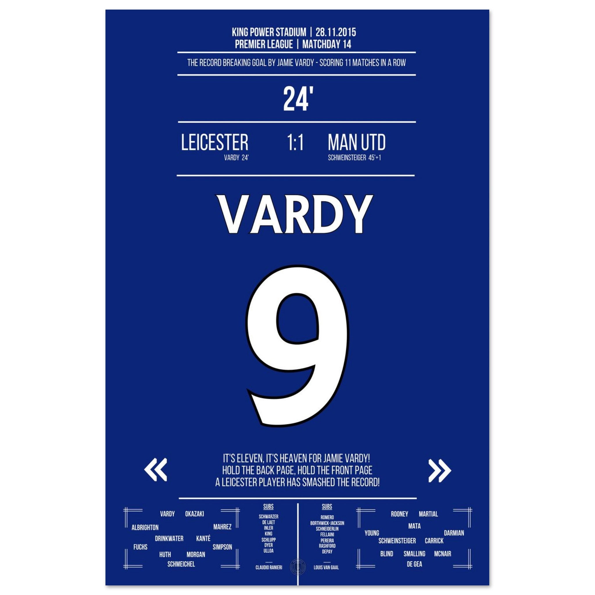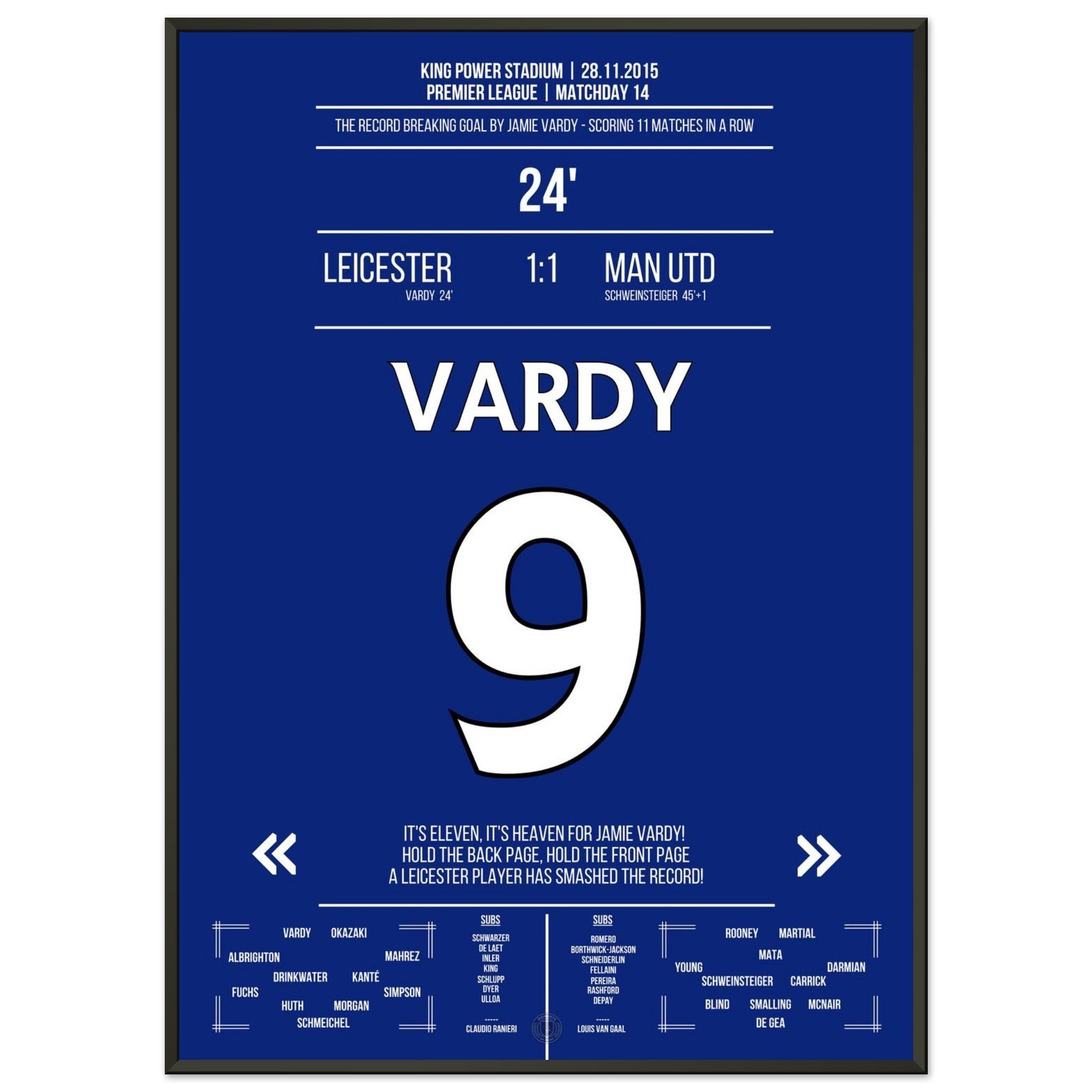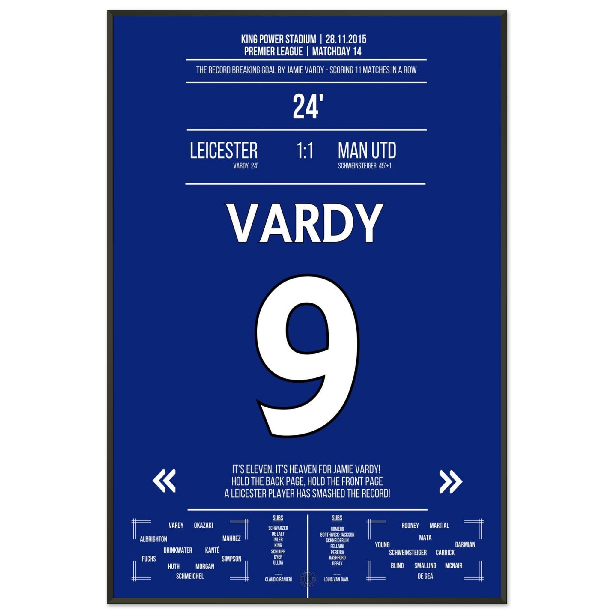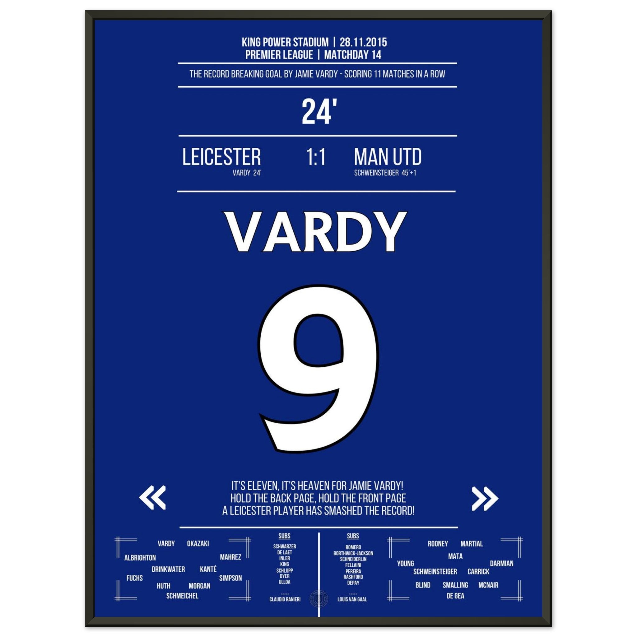 Jamie Vardy schreibt Premier-League-Geschichte: In der 24. Minute trifft er zum elften Mal in Folge – nie zuvor gelang einem Spieler eine solche Torserie. Ein eiskalter Abschluss gegen De Gea, ein Rekord für die Ewigkeit.