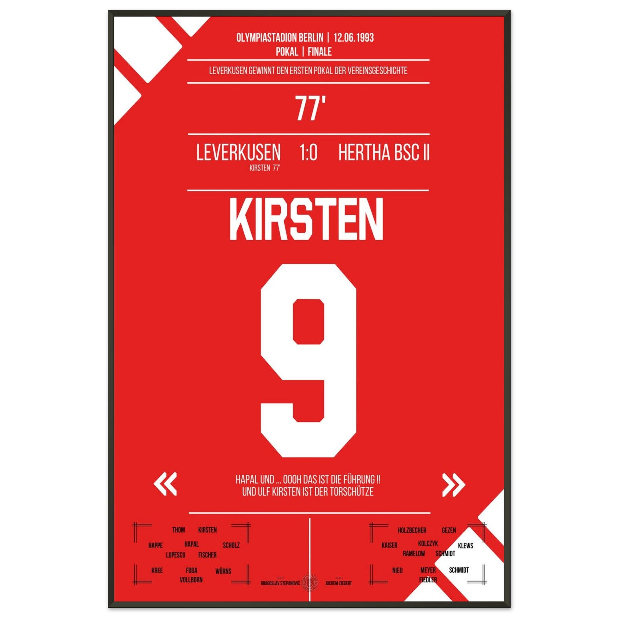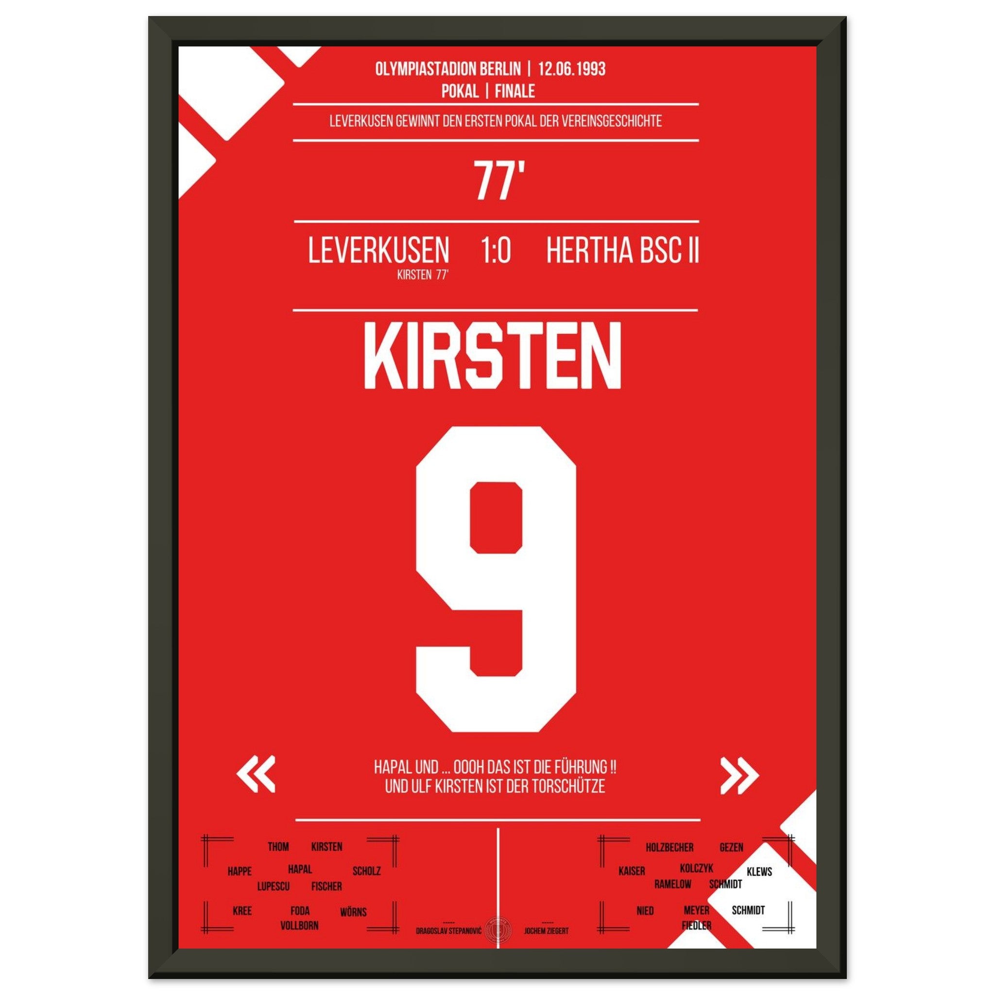 12. Juni 1993 – Leverkusen vs. Hertha BSC II 1:0: In der 77. Minute erlöst Ulf Kirsten Leverkusen im Pokalfinale mit seinem Treffer zum 1:0 – und sichert dem Verein den ersten großen nationalen Titel der Klubgeschichte. Ein historischer Moment im Berliner Olympiastadion. Unser Poster hält diesen goldenen Pokalcoup in Schwarz-Rot fest.