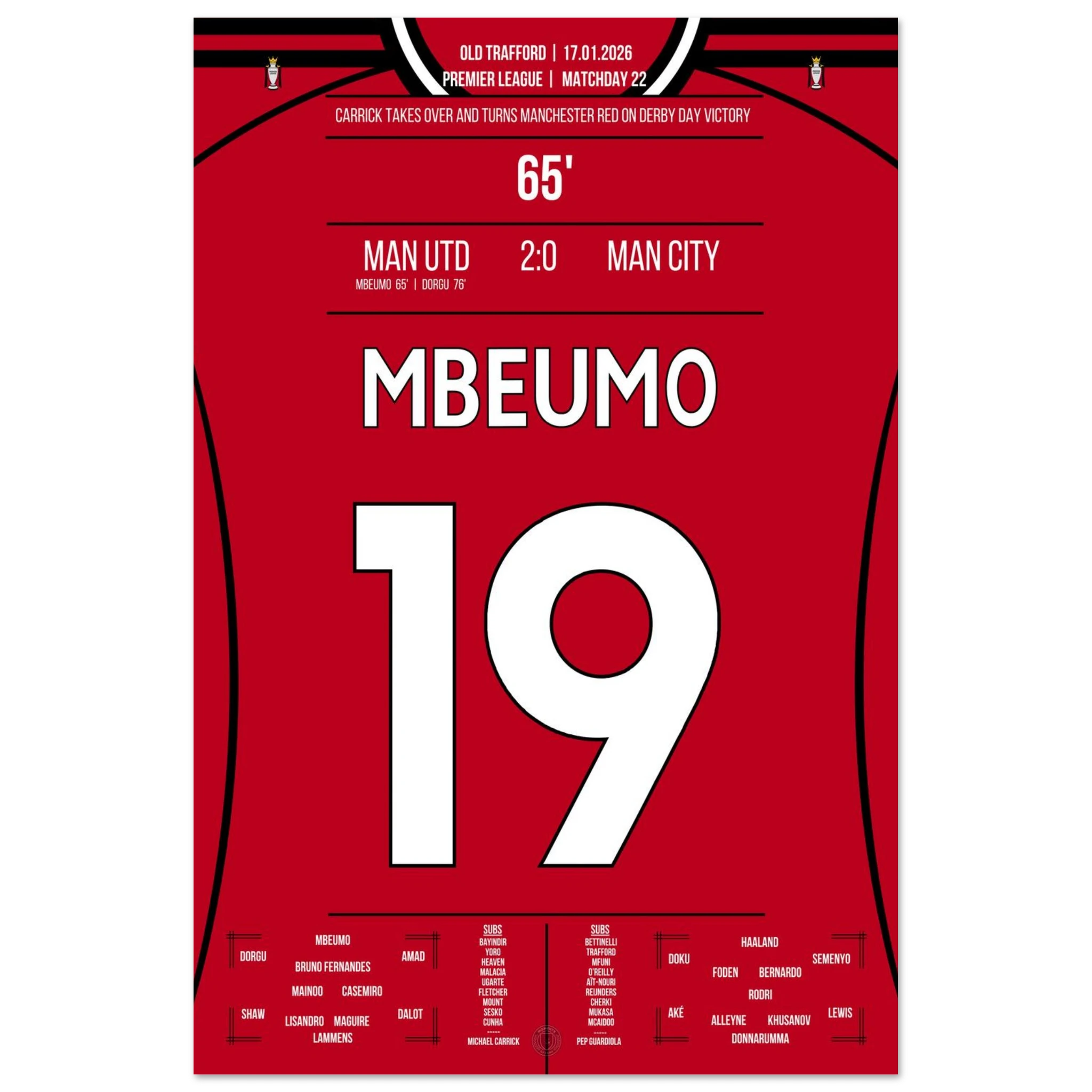 Dieses Poster feiert den Moment, in dem Mbeumo mit einem Schlag das rote Manchester zum Jubeln brachte – Derbyglanz für die Ewigkeit.