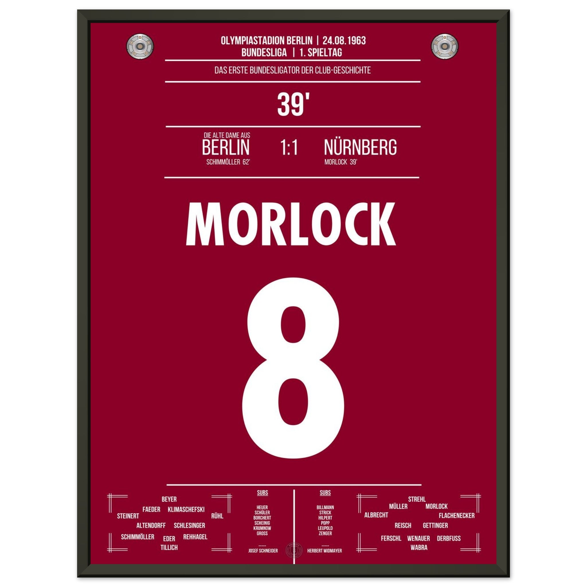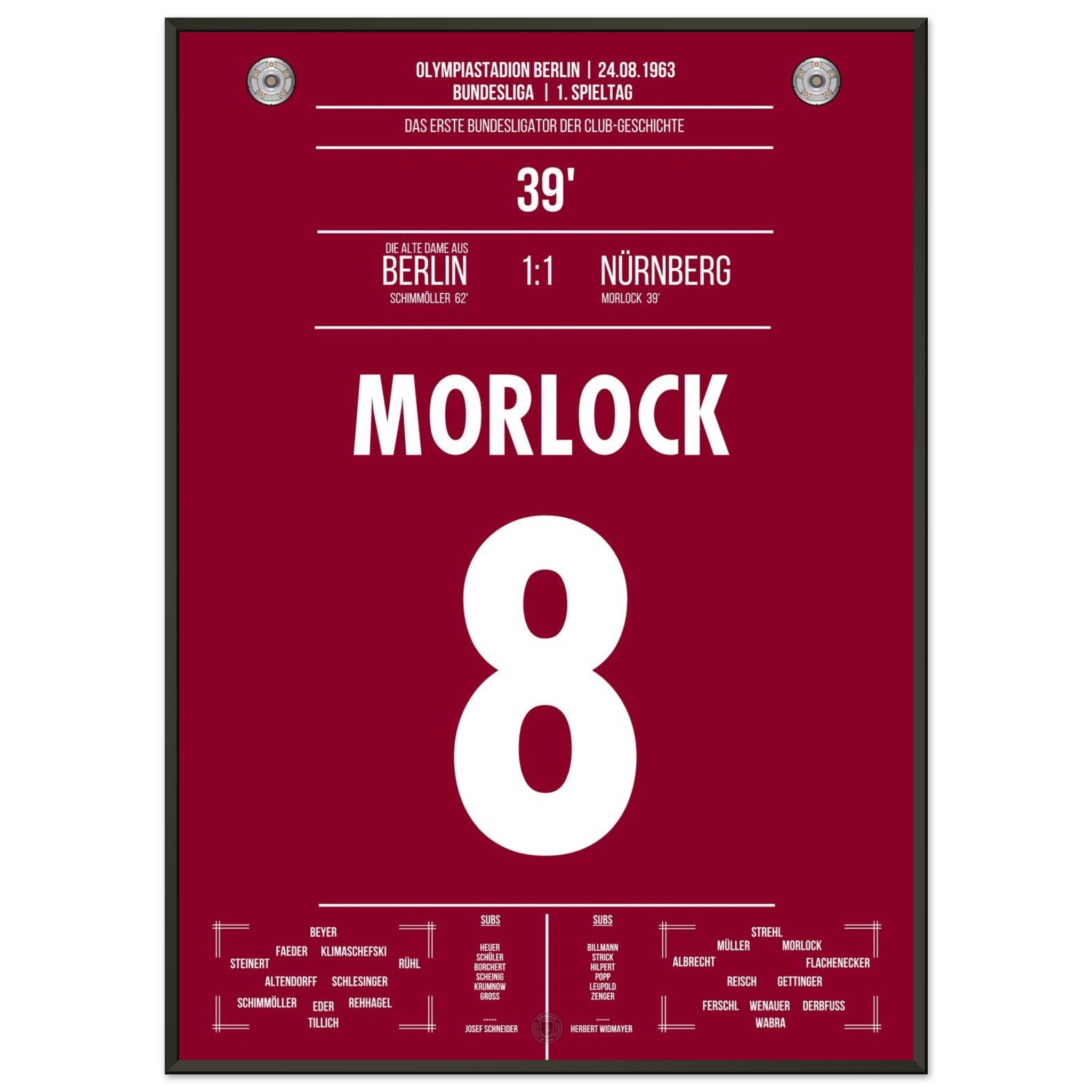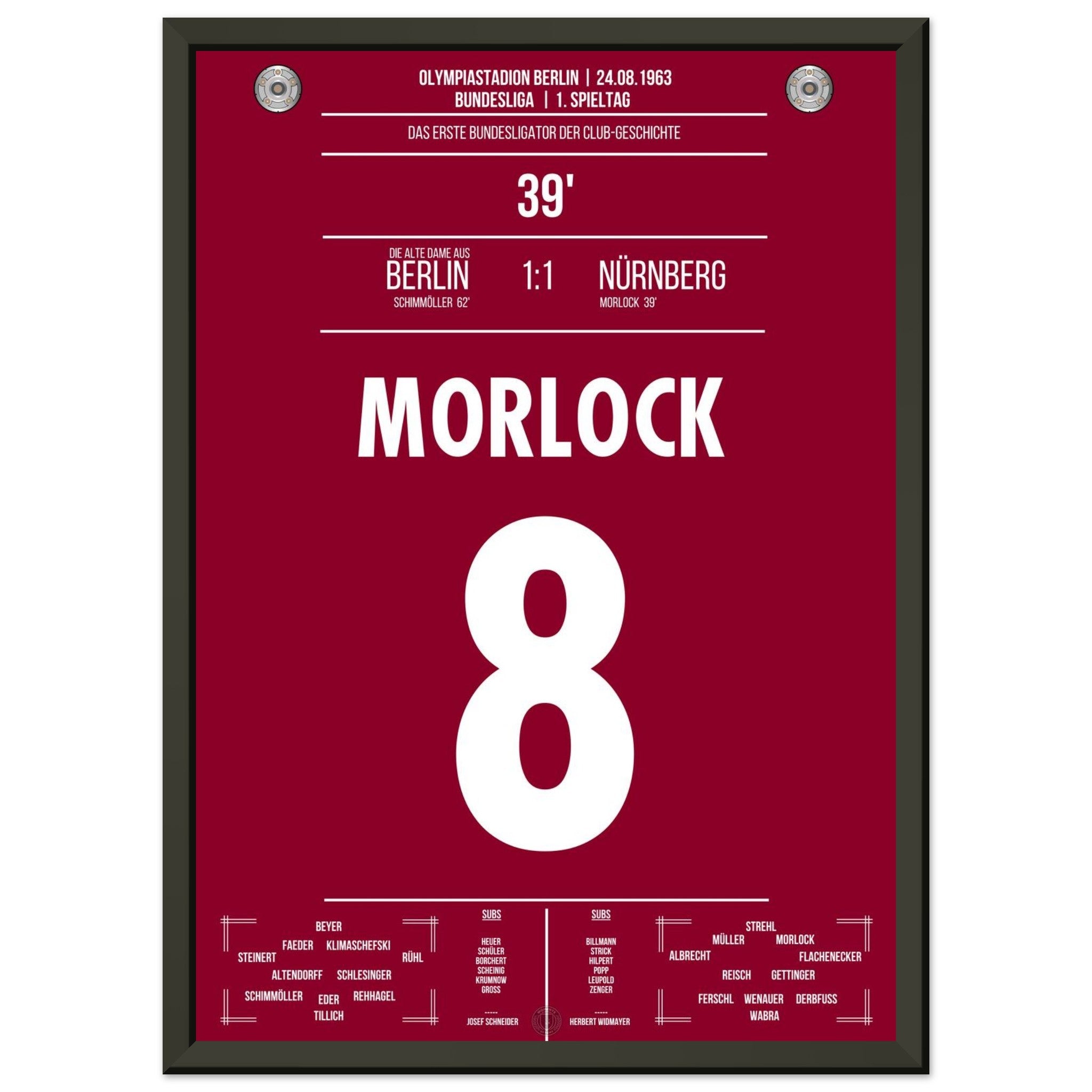 24. August 1963 – Berlin vs. Nürnberg 1:1: In der Premierensaison der Bundesliga erzielt Max Morlock das erste Tor der Klubgeschichte – ein historischer Moment für den „Club“ im Auftaktspiel gegen Karlsruhe. Der Weltmeister von 1954 schreibt damit auch im neuen Fußball-Zeitalter weiter Geschichte. Unser Poster hält diesen legendären Augenblick für die Ewigkeit fest.