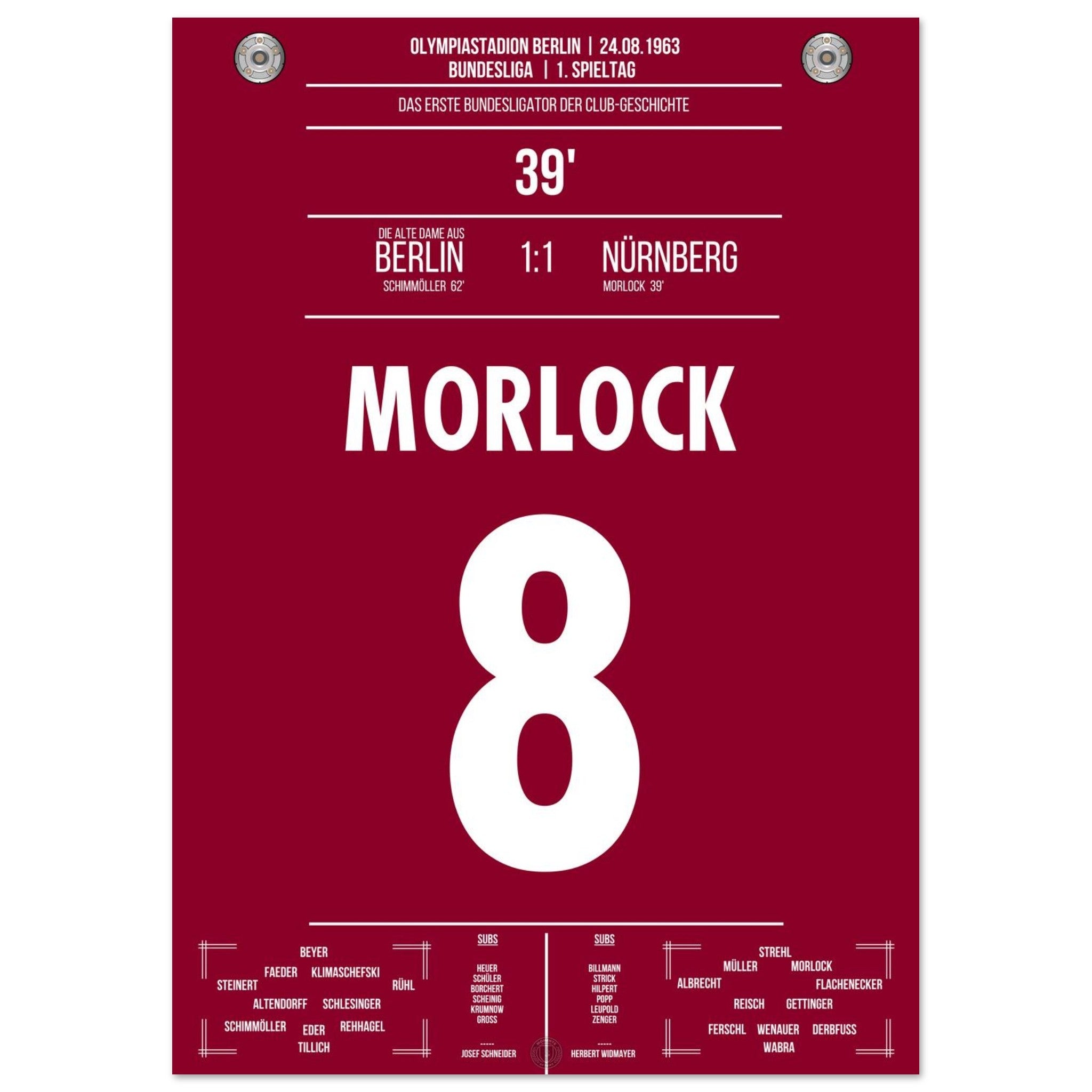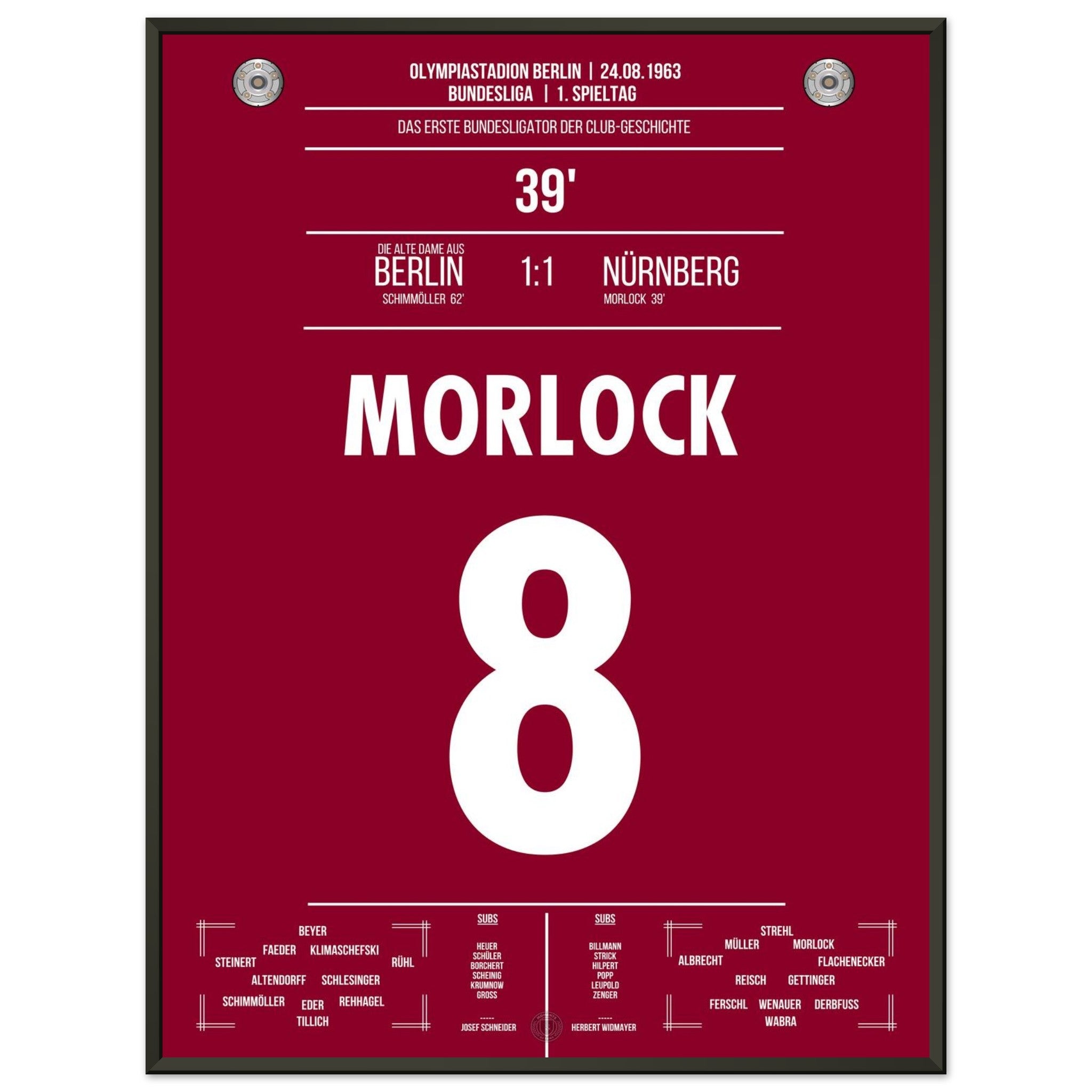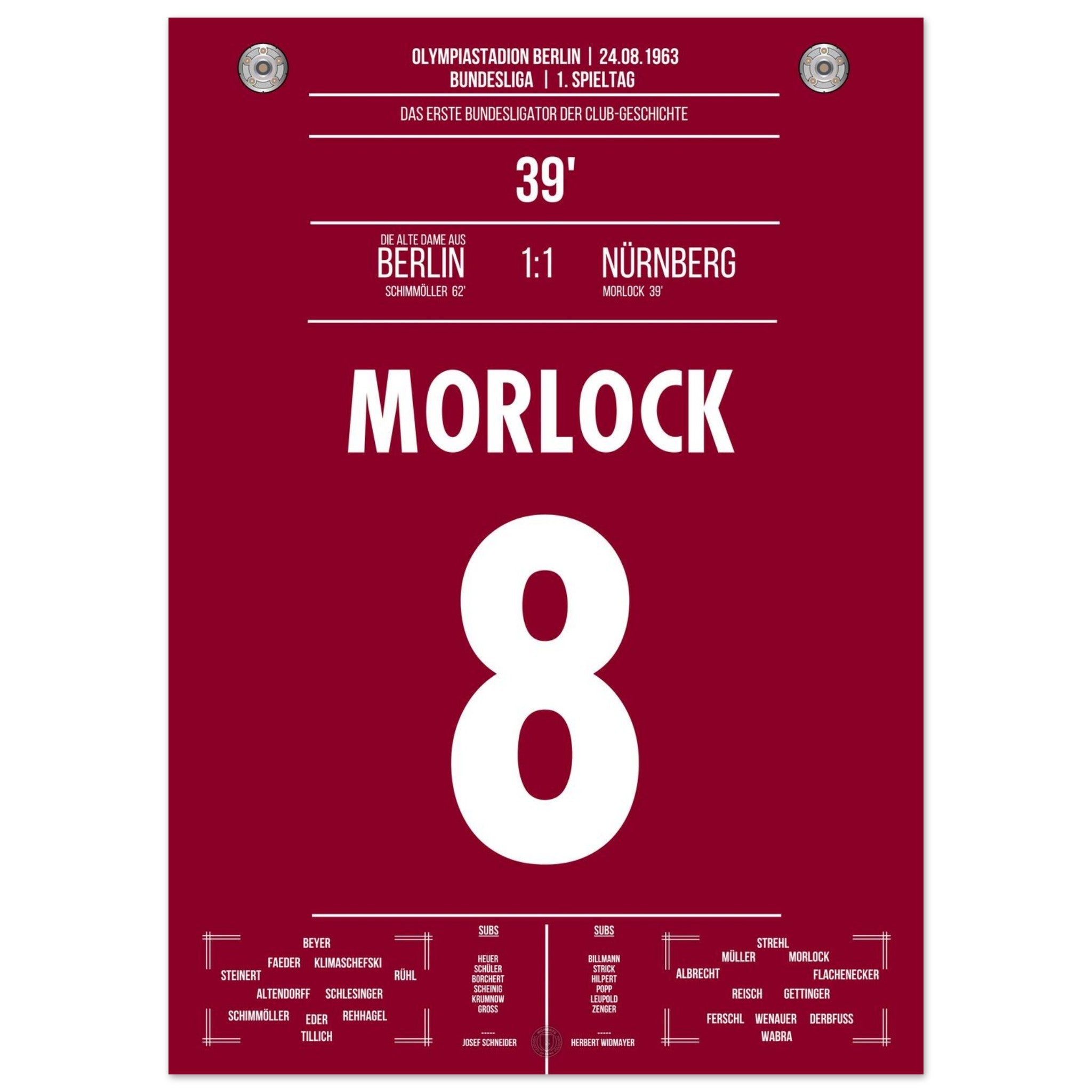 24. August 1963 – Berlin vs. Nürnberg 1:1: In der Premierensaison der Bundesliga erzielt Max Morlock das erste Tor der Klubgeschichte – ein historischer Moment für den „Club“ im Auftaktspiel gegen Karlsruhe. Der Weltmeister von 1954 schreibt damit auch im neuen Fußball-Zeitalter weiter Geschichte. Unser Poster hält diesen legendären Augenblick für die Ewigkeit fest.