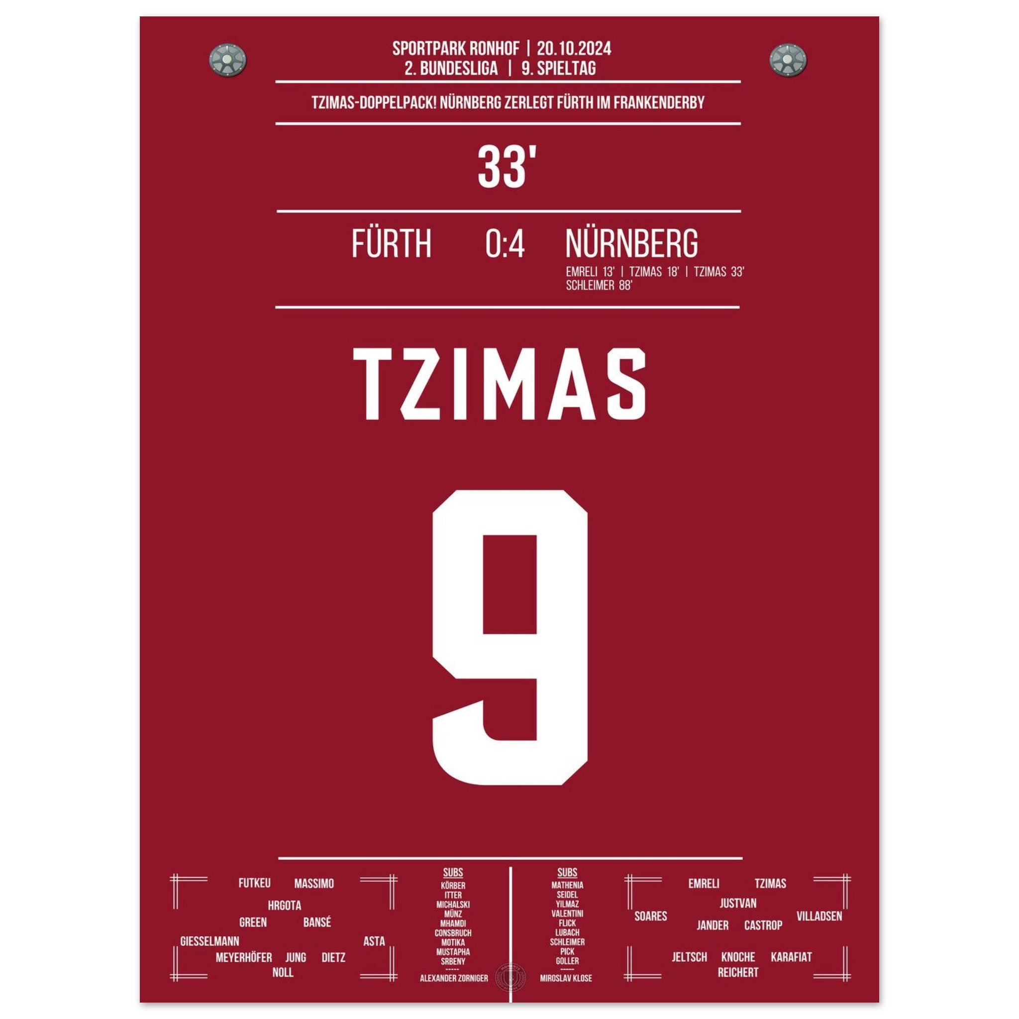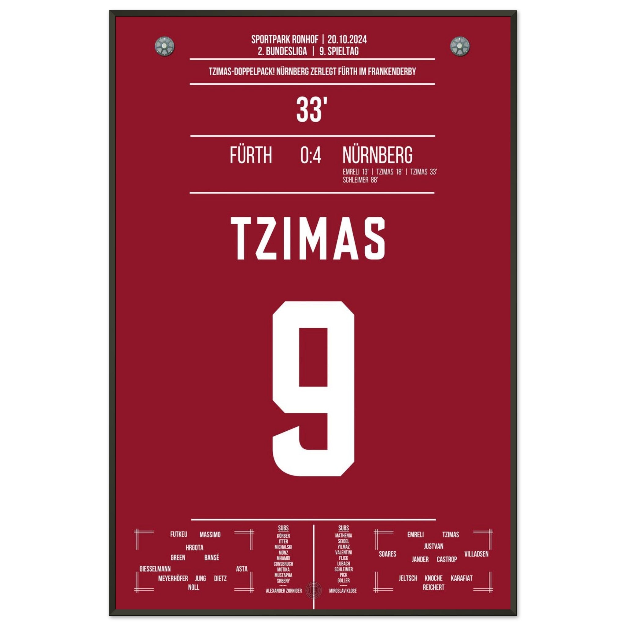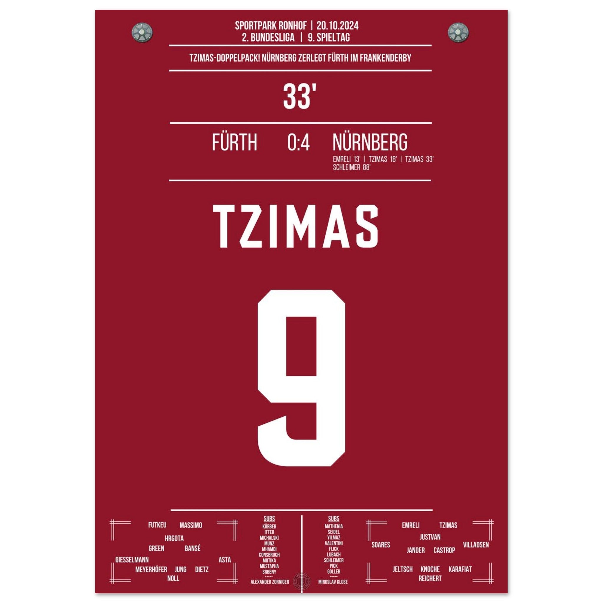 20.Oktober 2024 – Fürth vs. Nürnberg 0:24: Im prestigeträchtigen Frankenderby trifft Tzimas doppelt und entscheidet die Partie fast im Alleingang. Mit seinem Doppelpack sorgt er für grenzenlosen Jubel im Gästeblock und sichert Nürnberg den Derbysieg. Unser Poster hält diesen besonderen Moment im rot-schwarzen Derby-Triumph fest.